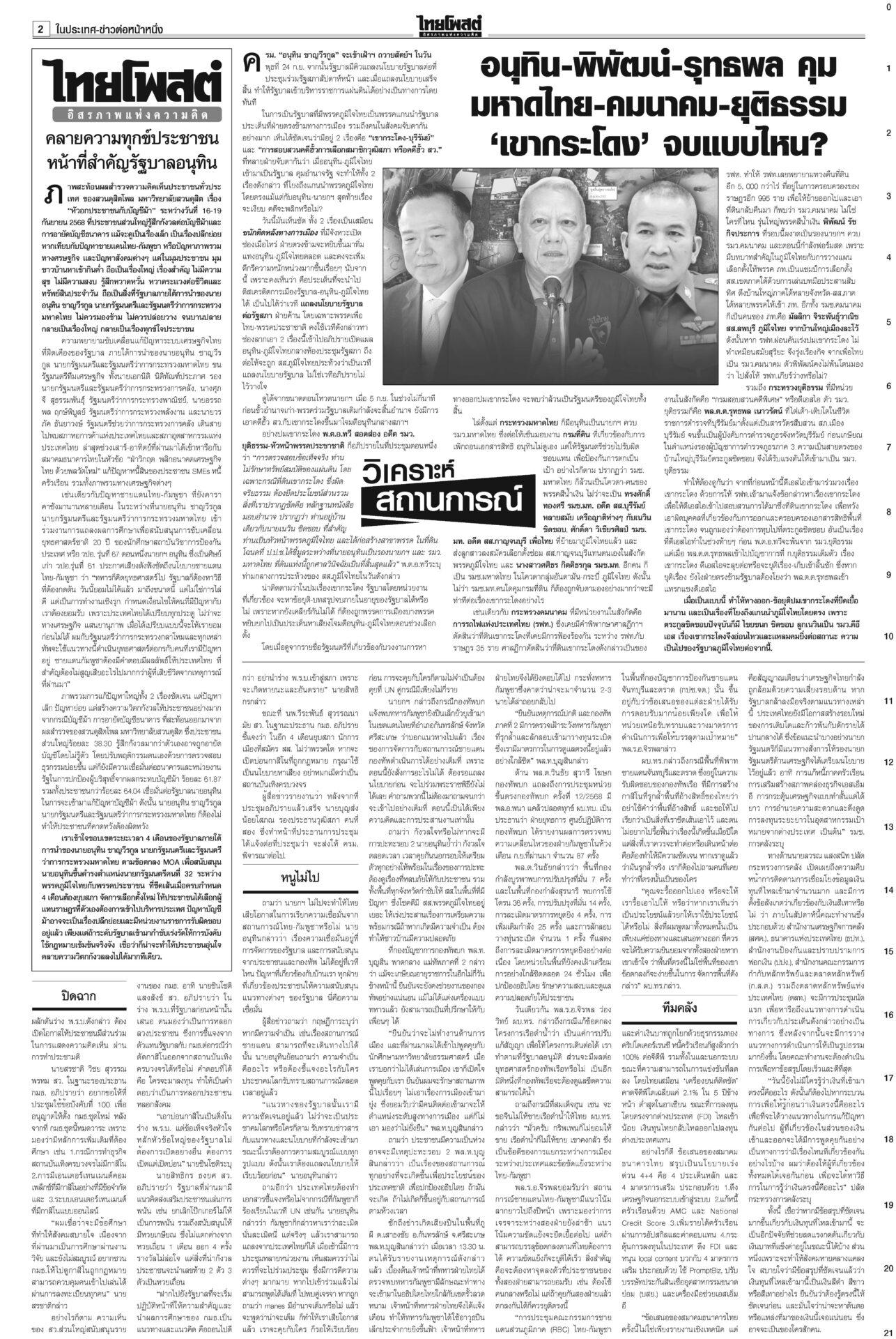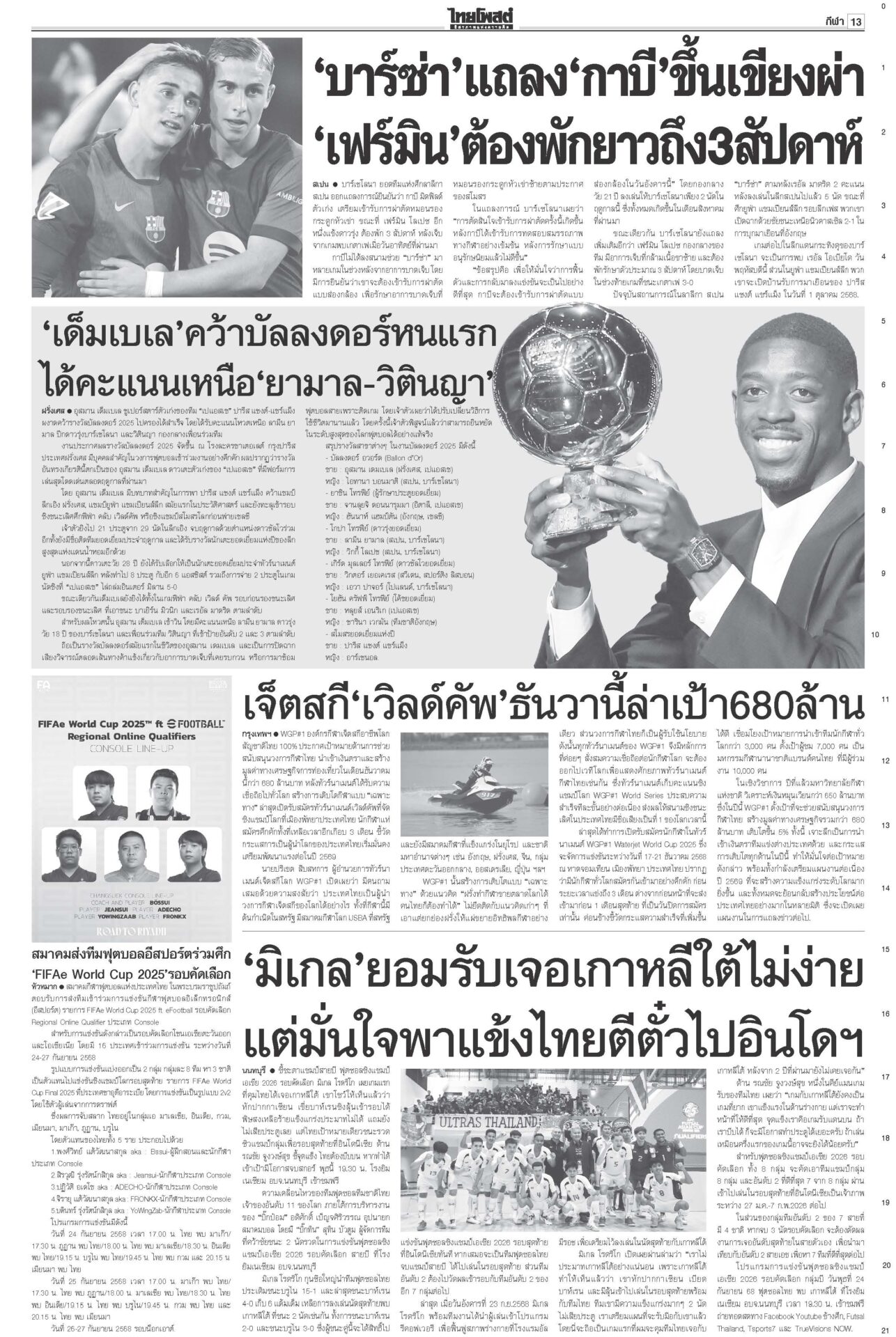 หนังสือพิมพ์ ฉบับวันที่ 24 กันยายน 2568ข่าวหน้าหนึ่งรบ.จ่อแถลง29ก.ย. นโยบายปกน้ำเงินพร้อม100%/พท.เข็นอิ๊งค์ทวงศรีสะเกษ“นายกฯ หนู” ย้ำนโยบายรัฐบาลปกน้ำเงินเสร็จ 100% แล้ว หนูไม่ไปUN/กุ้งปัดเก้าอี้ใหญ่“นายกฯ” ไม่ไปประชุม UNGA ที่สหรัฐแจงปมขัดแย้งไทย-กัมพูชา หวั่นไม่ทันแถลงนโยบายต่อรัฐสภา เชื่อไทยไม่เสียโอกาสเวทีโลก ปิดฉากกาสิโน สภาสูงสรุปชัด ทำลายประเทศ“วุฒิสภา” ตอกฝาโลง “กาสิโน” มีมติส่ง “ร่าง พ.ร.บ.เอนเตอร์เทนเมนต์คอมเพล็กซ์” ให้ ครม.พิจารณา ทีมคลังเร่งถก หาที่มาทุนเทา คลายบาทแข็ง“วรภัค” ฟุ้งคุยสมาคมแบงก์ฉลุย ชง 4 นโยบายเร่งด่วน พร้อม 4 มาตรการเสริมแก้พิษเครื่องยนต์เศรษฐกิจไทยโตติดขัด ผวาภท.กินรวบ‘สสร.’ 2พรรคยื่นร่างแก้รธน.“ไอติม” ติง “ภูมิใจไทย-เพื่อไทย” ควรให้ ปชช.มีส่วนร่วมตั้ง