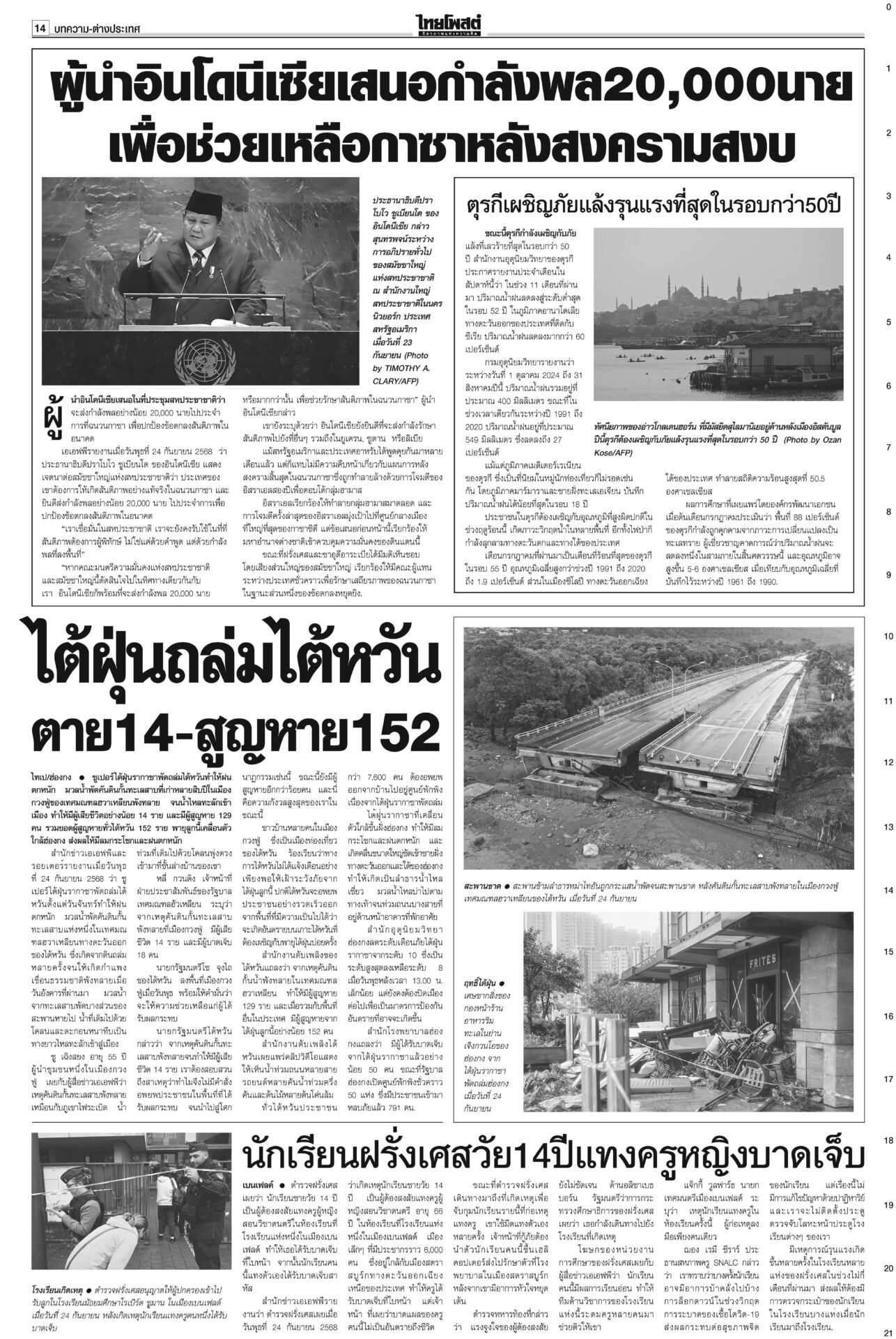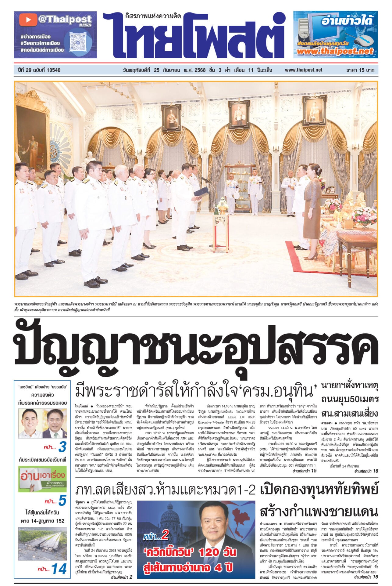 หนังสือพิมพ์ ฉบับวันที่ 25 กันยายน 2568ข่าวหน้าหนึ่งปัญญาชนะอุปสรรค มีพระราชดำรัสให้กำลังใจ‘ครม.อนุทิน’“ในหลวง-พระราชินี” พระราชทานพระบรมราชวโรกาสให้ ครม.ใหม่ เปิดกองทุนหทัยทิพย์ สร้างกำแพงชายแดนกรมพระศรีสวางควัฒนฯ ทรงเปิดกองทุน “หทัยทิพย์” นายกฯสั่งหาเหตุ ถนนยุบ50เมตร สน.สามเสนเสี่ยงถนนทรุด! หน้า รพ.วชิรพยาบาล เกิดหลุมยักษ์ลึก 50 เมตร นายกฯ ลงพื้นที่ตรวจสอบ ภท.ลดเสียงสว.ห้ามแตะหมวด1-2ภูมิใจไทยยื่นร่างแก้รัฐธรรมนูญต่อประธานรัฐสภาตาม MOA แล้ว