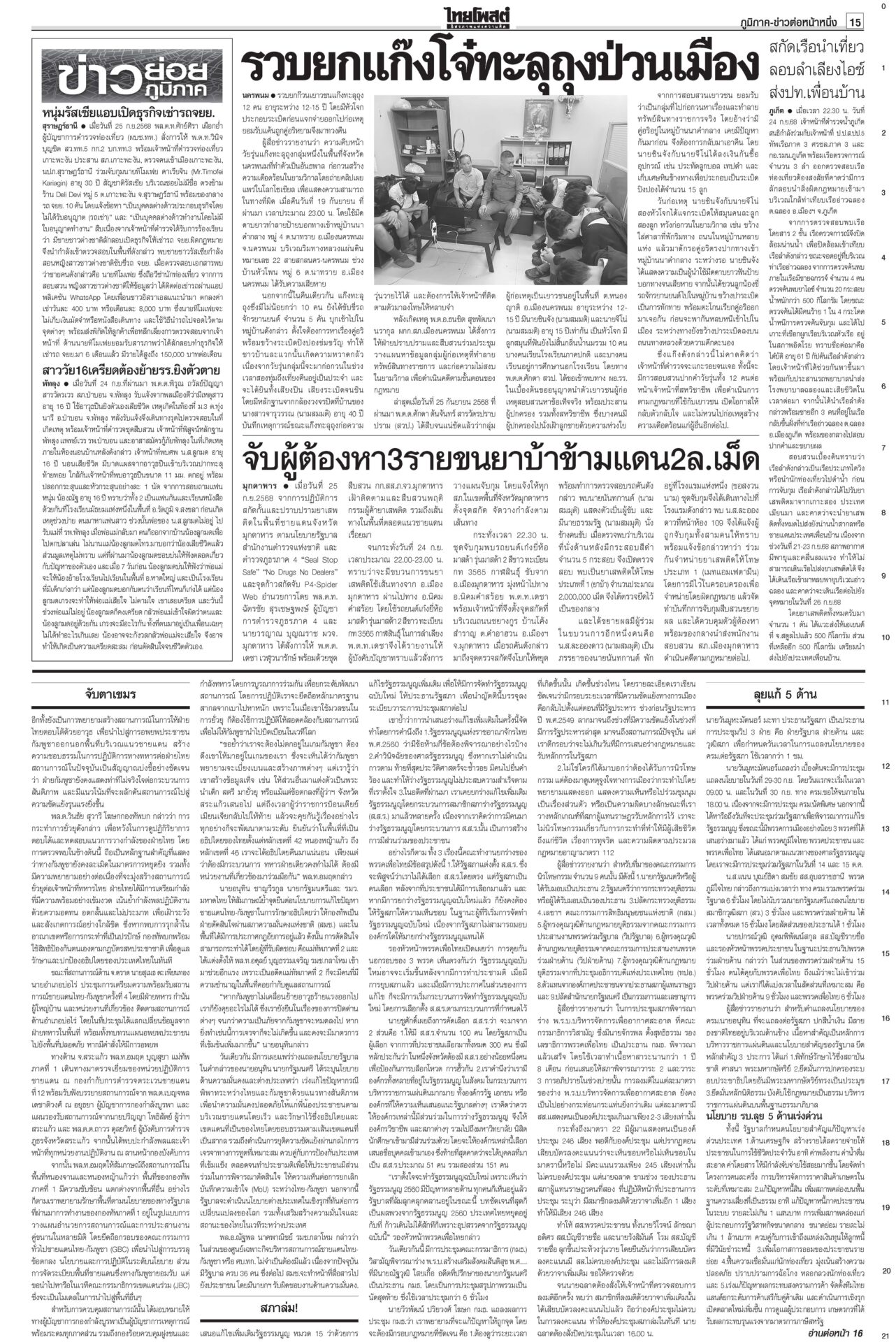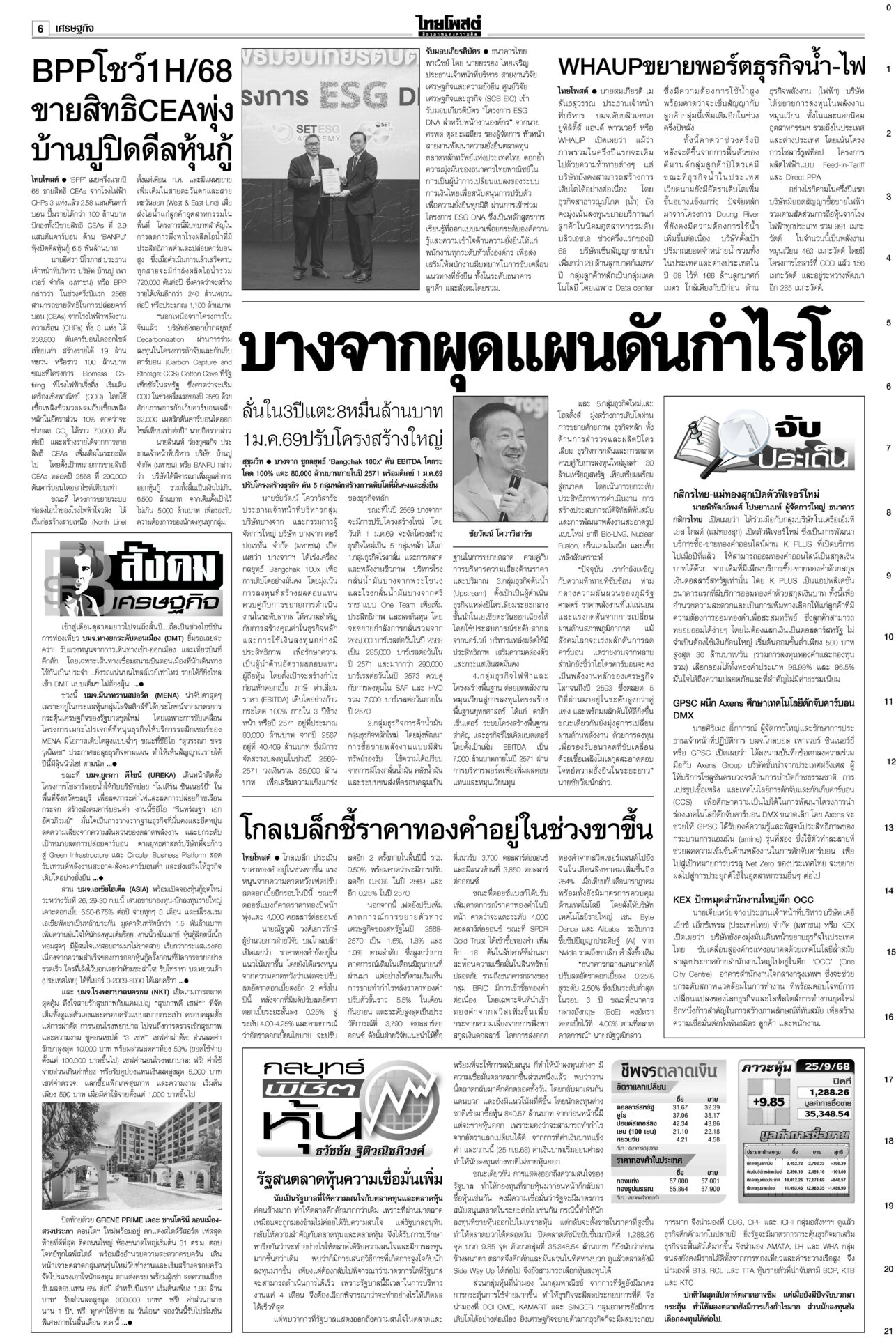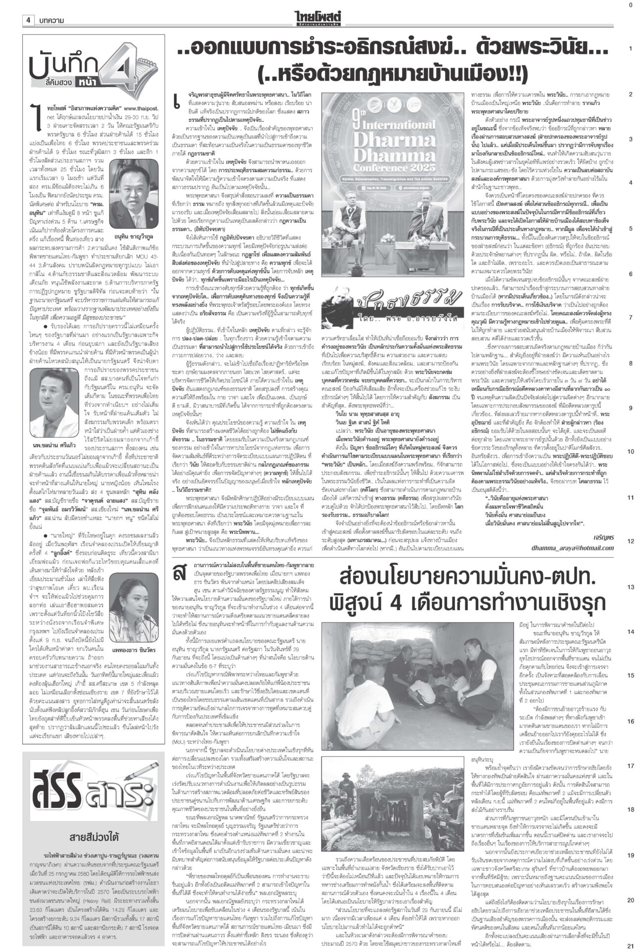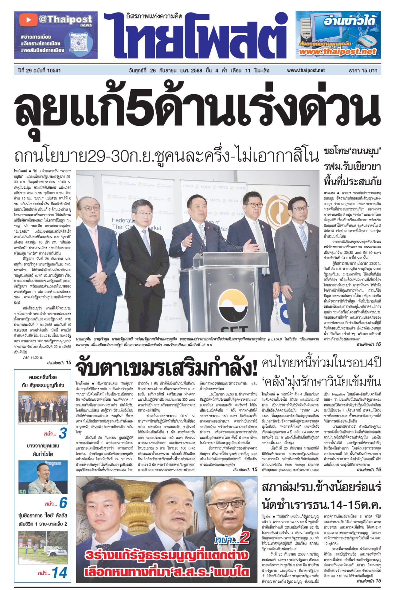 หนังสือพิมพ์ ฉบับวันที่ 26 กันยายน 2568ข่าวหน้าหนึ่งลุยแก้5ด้านเร่งด่วน ถกนโยบาย29-30ก.ย.ชูคนละครึ่ง-ไม่เอากาสิโนวิป 3 ฝ่ายเคาะวัน “นายกฯ อนุทิน” แถลงนโยบายรัฐบาลต่อรัฐสภา 29-30 ก.ย. จับตาเขมรเสริมกำลัง!จับตาชายแดน! “กัมพูชา” ส่งอาวุธยิงวิถีตรง-รถถัง 1 คันประจำจุดยิง สภาล่ม!รบ.ข้างน้อยร่อแร่ นัดชำเรารธน.14-15ต.ค.“วันนอร์” เผยยื่นแก้รัฐธรรมนูญแล้ว 3 พรรค จ่อถก 14-15 ต.ค.นี้ ขอโทษ‘ถนนยุบ’ รฟม.รับเยียวยา พื้นที่ประสบภัยนายกฯ ขออภัยประชาชนเหตุถนนยุบ ชี้ความรับผิดชอบทั้งสัญญา-แพ่ง-อาญา คนไทยหนี้ท่วมในรอบ4ปี ‘คลัง’มุ่งรักษาวินัยเข้มข้น“เอกนิติ” ลั่น 4 เดือนเร่งยกระดับความโปร่งใส มีวินัย และมีธรรมาภิบาล
