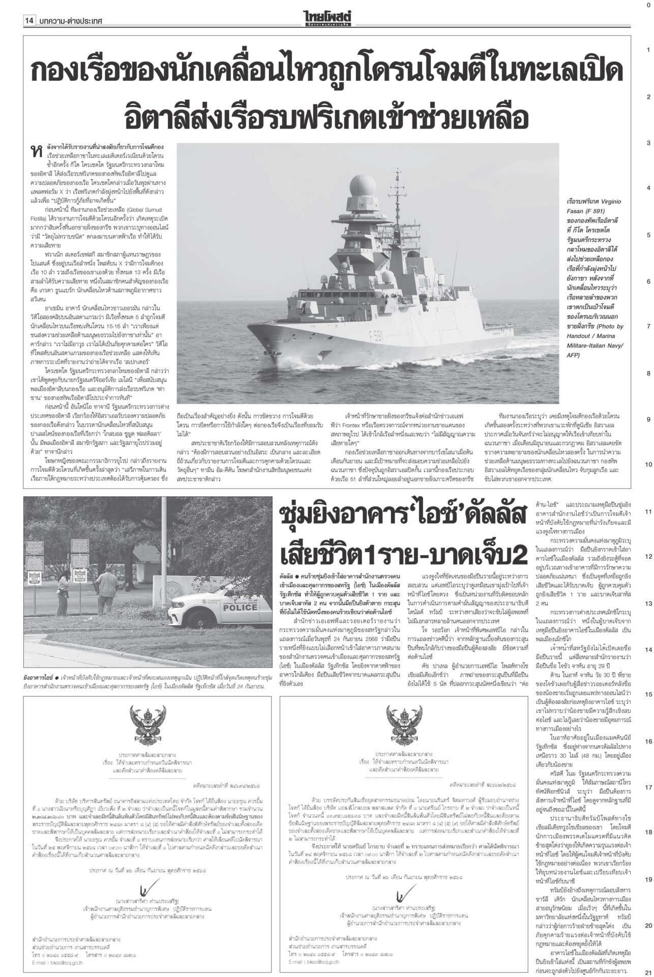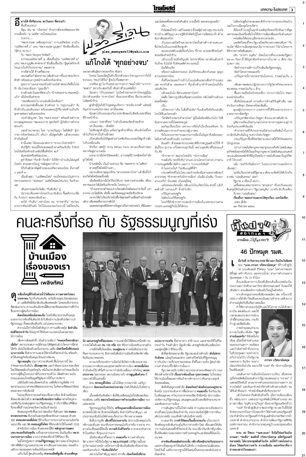 ฉบับวันที่ 26 กันยายน 2568 26 กันยายน 2568 เวลา 0:01 น. หนังสือพิมพ์ ฉบับวันที่ 26 กันยายน 2568ข่าวหน้าหนึ่งลุยแก้5ด้านเร่งด่วน ถกนโยบาย29-30ก.ย.ชูคนละครึ่ง-ไม่เอากาสิโนวิป 3 ฝ่ายเคาะวัน “นายกฯ อนุทิน” แถลงนโยบายรัฐบาลต่อรัฐสภา 29-30 ก.ย. จับตาเขมรเสริมกำลัง!จับตาชายแดน! “กัมพูชา” ส่งอาวุธยิงวิถีตรง-รถถัง 1 คันประจำจุดยิง สภาล่ม!รบ.ข้างน้อยร่อแร่ นัดชำเรารธน.14-15ต.ค.“วันนอร์” เผยยื่นแก้รัฐธรรมนูญแล้ว 3 พรรค จ่อถก 14-15 ต.ค.นี้ ขอโทษ‘ถนนยุบ’ รฟม.รับเยียวยา พื้นที่ประสบภัยนายกฯ ขออภัยประชาชนเหตุถนนยุบ ชี้ความรับผิดชอบทั้งสัญญา-แพ่ง-อาญา คนไทยหนี้ท่วมในรอบ4ปี ‘คลัง’มุ่งรักษาวินัยเข้มข้น“เอกนิติ” ลั่น 4 เดือนเร่งยกระดับความโปร่งใส มีวินัย และมีธรรมาภิบาล Tagsรายวันหนังสือพิมพ์ ข่าวที่เกี่ยวข้อง ฉบับวันที่ 5 ธันวาคม 2568 ฉบับวันที่ 4 ธันวาคม 2568 ฉบับวันที่ 3 ธันวาคม 2568 ฉบับวันที่ 2 ธันวาคม 2568 ฉบับวันที่ 1 ธันวาคม 2568 ฉบับวันที่ 30 พฤศจิกายน 2568 NEWS UPDATE 14:32 น. ดอกไม้นานาพรรณบานสะพรั่งทั่วสวนหลวง ร.๙ สัมผัสรับลมหนาวถึง 10 ธ.ค. นี้ 14:31 น. พิพิธภัณฑ์มิตร ชัยบัญชา จัดแสดงนิทรรศการพระบรมฉายาลักษณ์ รำลึกในหลวง ร.9 14:07 น. 🛑LIVE ร้องข้ามกำแพงคุก!! | ห้องข่าวไทยโพสต์ 14:03 น. 'ซัมซุง' เดินหน้าช่วยเหลือผู้ประสบภัยน้ำท่วมภาคใต้ ส่งมอบความช่วยเหลือและบริการฟื้นฟูในพื้นที่ครบวงจร 13:46 น. เดือด 'สส.พรรคส้ม' ซัดสว.เกียจคร้าน แตะถ่วง พรบ.อากาศสะอาด ขณะที่ปชช.กำลังสูดฝุ่นพิษ