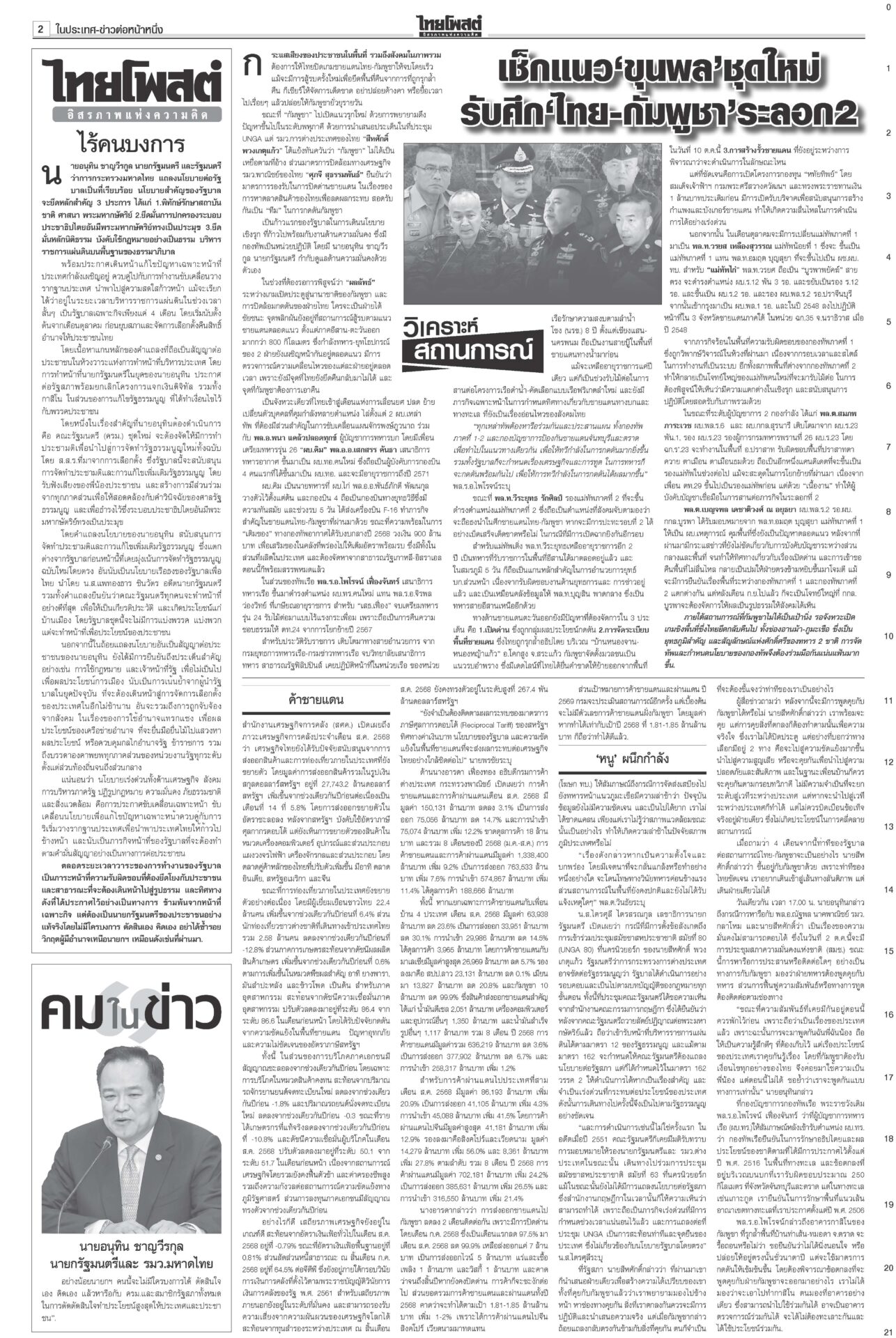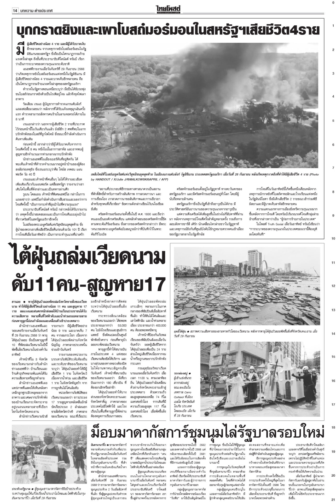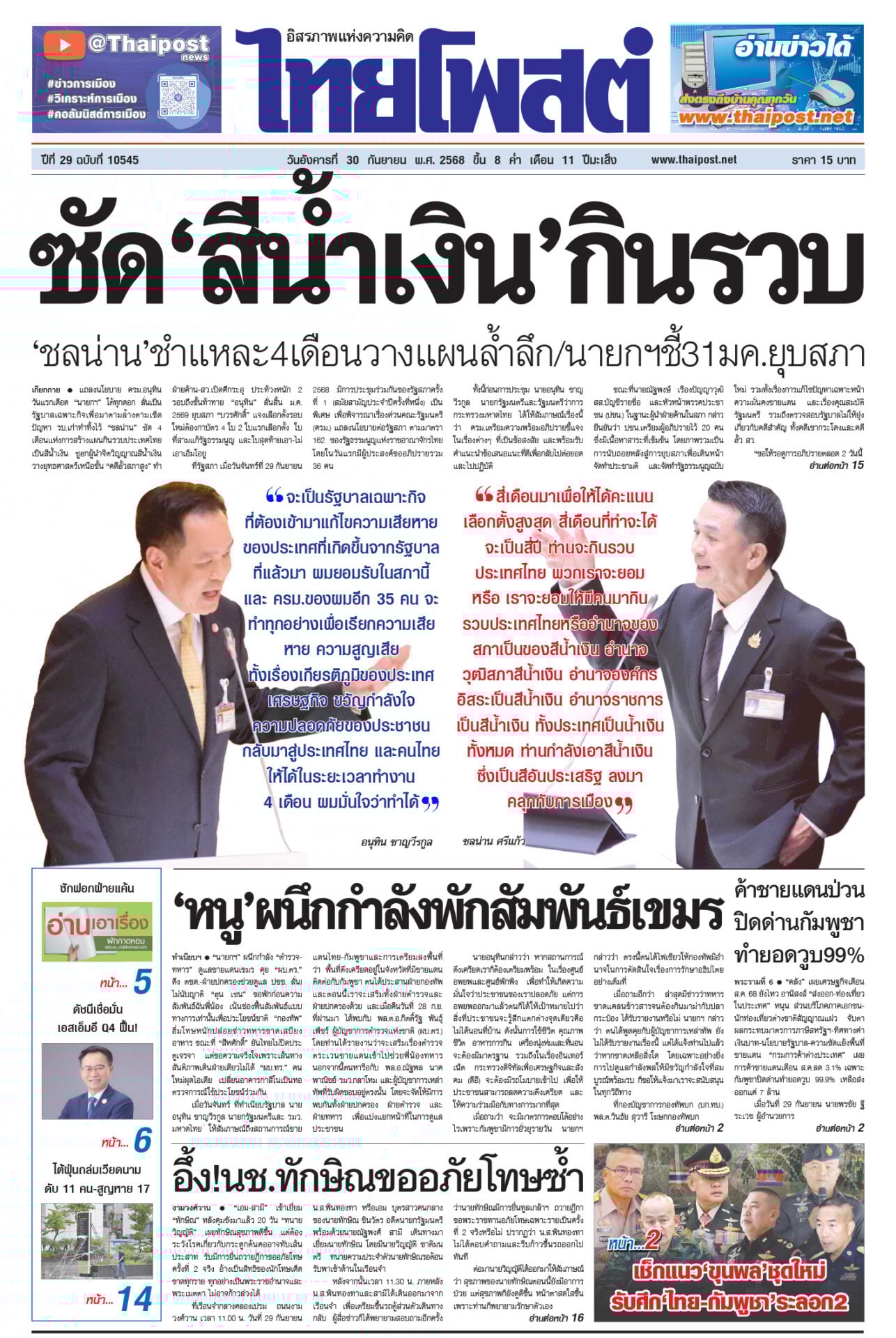หนังสือพิมพ์ ฉบับวันที่ 30 กันยายน 2568ข่าวหน้าหนึ่งซัด‘สีน้ำเงิน’กินรวบ ‘ชลน่าน’ชำแหละ4เดือนวางแผนล้ำลึก/นายกฯชี้31มค.ยุบสภาแถลงนโยบาย ครม.อนุทินวันแรกเดือด “นายกฯ” โต้ทุกดอก ‘หนู’ผนึกกำลังพักสัมพันธ์เขมร“นายกฯ” ผนึกกำลัง “ตำรวจ-ทหาร” ดูแลชายแดนเขมร คุย “ผบ.ตร.” ดึง ตชด.-ฝ่ายปกครองช่วยดูแล อึ้ง!นช.ทักษิณขออภัยโทษซ้ำ“เอม-สามี” เข้าเยี่ยม “ทักษิณ” หลังคุมขังมาแล้ว 20 วัน “ทนายวิญญัติ” ค้าชายแดนป่วน ปิดด่านกัมพูชา ทำยอดวูบ99%“คลัง” เผยเศรษฐกิจเดือน ส.ค. 68 ยังไหว อานิสงส์ “ส่งออก-ท่องเที่ยวในประเทศ”