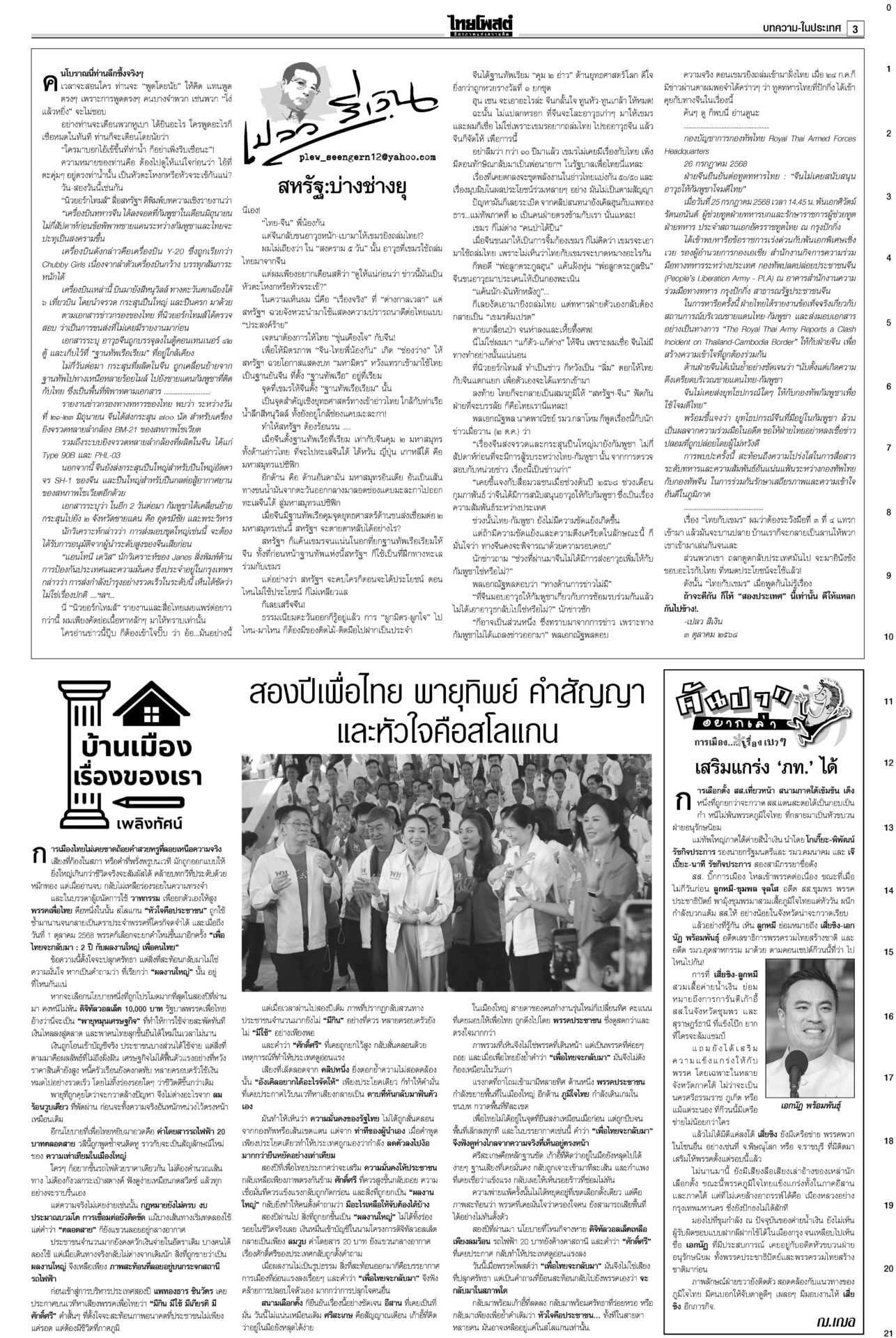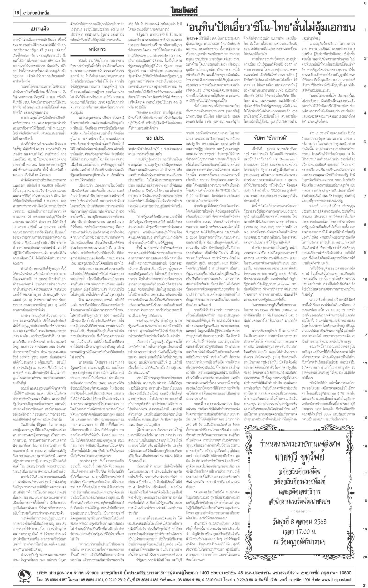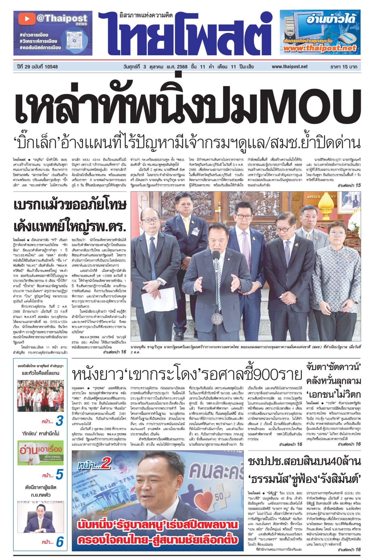 หนังสือพิมพ์ ฉบับวันที่ 3 ตุลาคม 2568ข่าวหน้าหนึ่งเหล่าทัพนิ่งปมMOU ‘บิ๊กเล็ก’อ้างแผนที่ไร้ปัญหามีเจ้ากรมฯดูแล/สมช.ย้ำปิดด่าน“อนุทิน” นั่งหัวโต๊ะ สมช. เคาะสร้างรั้วชายแดน ระบุผลักดันกัมพูชาหนองจานในเวลาที่เหมาะสม ขึงมาตรการปิดด่านกดดัน เบรกแม้วขออภัยโทษ เด้งแพทย์ใหญ่รพ.ตร.เปิดเอกสารลับ “ทวี” เซ็นยกฎีกาตีตกคำขอพระราชทานอภัยโทษ จับตา‘ชัตดาวน์’ คลังหวั่นลุกลาม ‘เอกชน’ไม่วิตก“วรภัค” จับตาปมสหรัฐชัตดาวน์ หวั่นสถานการณ์ยืดเยื้อบานปลายลุกลามกระทบไทย ชงปปช.สอบสินบน40ล้าน ‘ธรรมนัส’ขู่ฟ้อง‘รังสิมันต์’“นิพิฏฐ์” ร้อง ป.ป.ช. สอบ “รมว.ดีอี” ปมปูดสินบน 40 ล้าน เจ้าตัวยันข้อมูลจริง หนังยาว‘เขากระโดง’รอศาลชี้900ราย“รุทธพล” เผยคดีสืบสวนเขากระโดง ขอรอดูคำพิพากษาศาล หลัง “รฟท.” ดำเนินคดีผู้ครอบครองที่ดินเขากระโดงกว่า 900 ราย