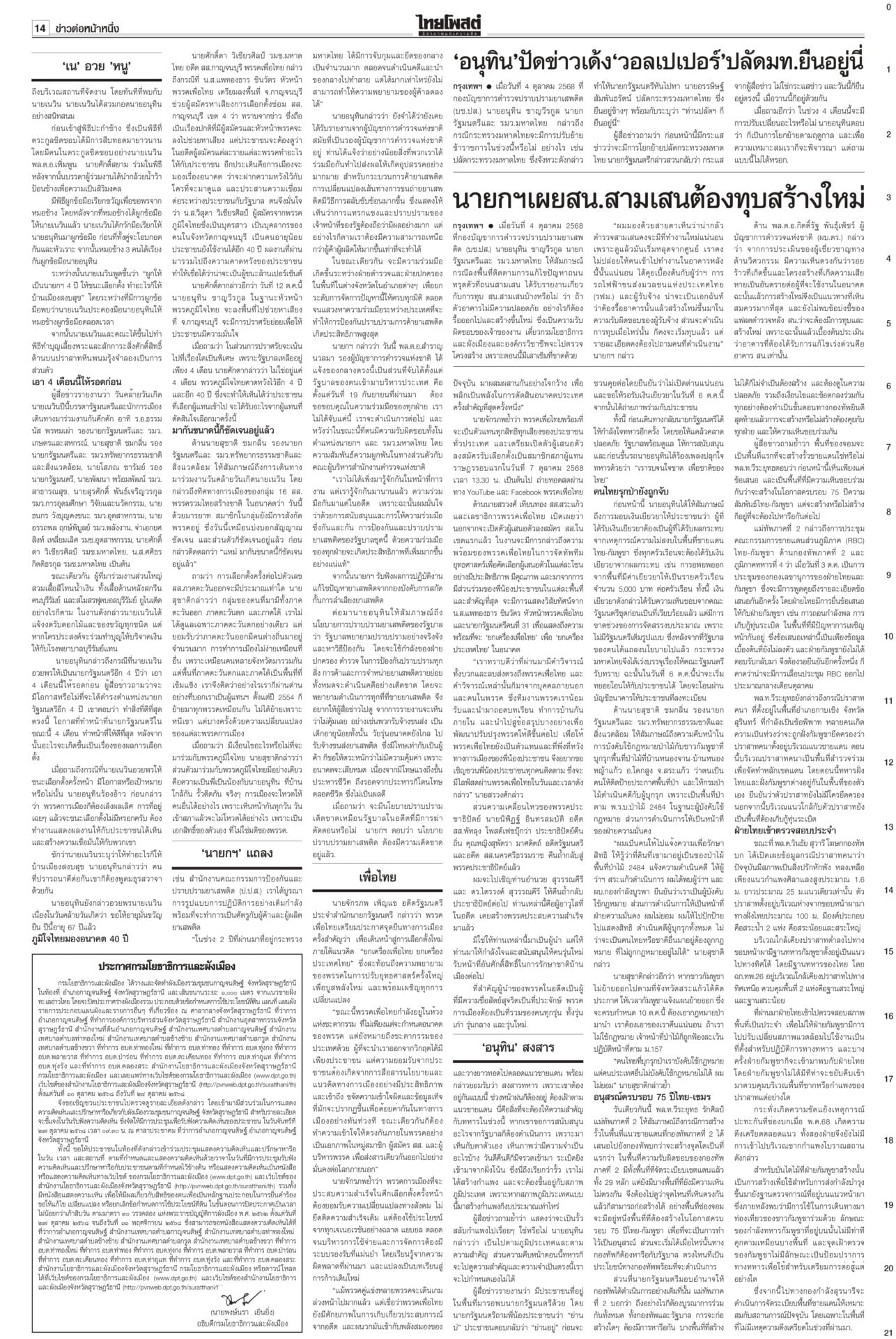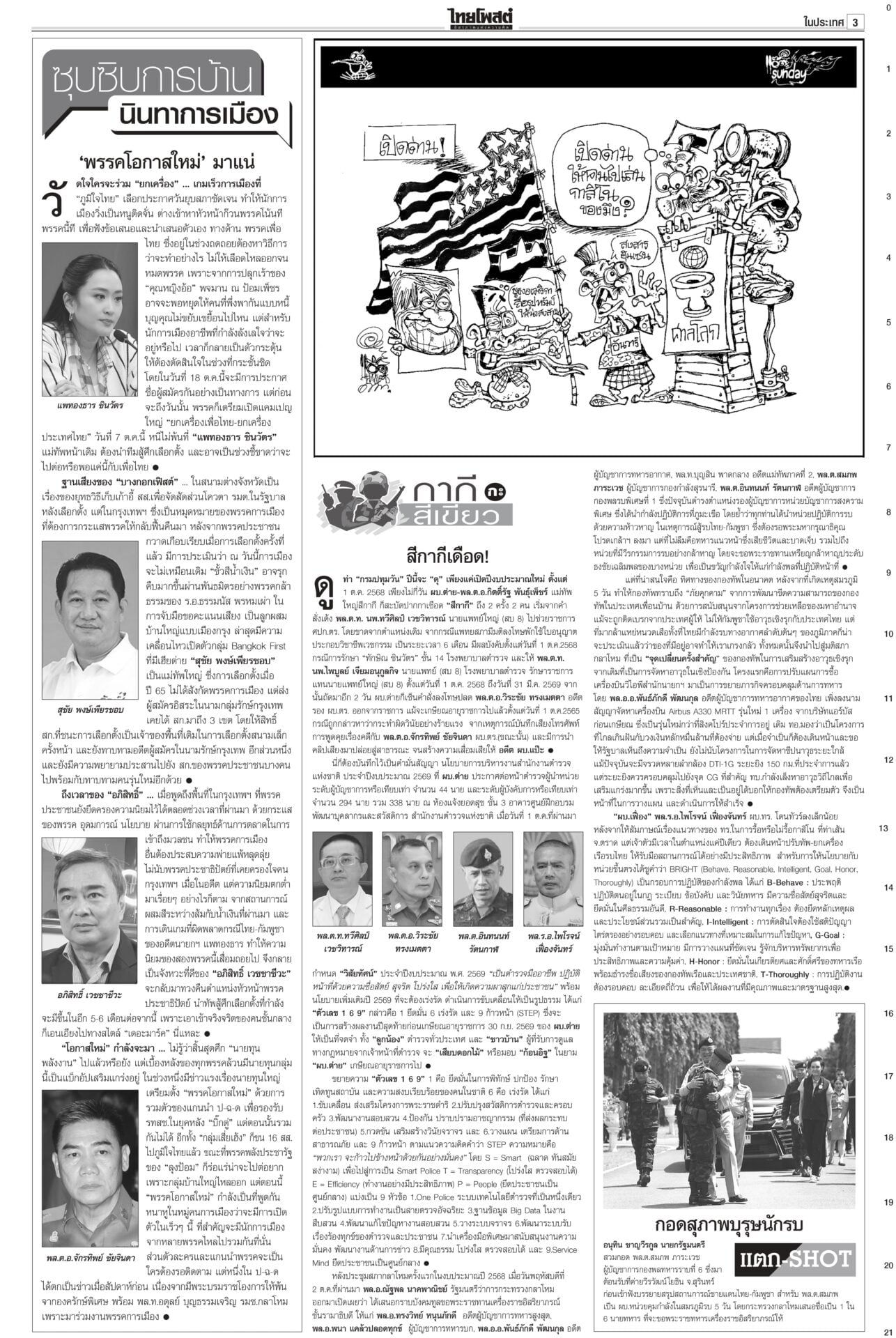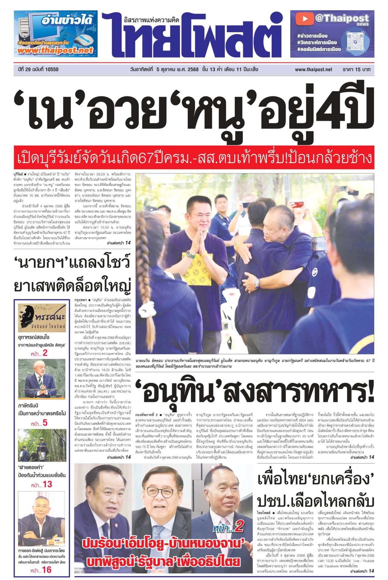 หนังสือพิมพ์ฉบับวันที่ 5 ตุลาคม 2568ข่าวหน้าหนึ่ง‘เน’อวย‘หนู’อยู่4ปี เปิดบุรีรัมย์จัดวันเกิด67ปีครม.-สส.ตบเท้าพรึ่บ!ป้อนกล้วยช้างงานใหญ่! เบิร์ธเดย์ 67 ปี “เนวิน” คึกคัก “อนุทิน” นำทีมรัฐมนตรี สส. ตบเท้าอวยพร แจกกล้วยช้าง “เน-หนู” กอดกันกลม ผูกข้อมือให้นั่งเก้าอี้นายกฯ ‘นายกฯ’แถลงโชว์ ยาเสพติดล็อตใหญ่“อนุทิน” นำแถลงจับยาเสพติดล็อตใหญ่ ประกาศเป็นศัตรูกับผู้ค้า-ผู้ผลิต ลั่นด้วยความร่วมมือของรัฐบาลชุดนี้ปราบได้แน่ ต้องมีความสามารถเหนือกว่ เพื่อไทย‘ยกเครื่อง’ ปชป.เลือดไหลกลับเพื่อไทยเล่นใหญ่ ยกเครื่องบูสพลังใหม่ และพร้อมเผชิญทุกการเปลี่ยนแปลง ให้ประเทศไทยต้องเดินหน้าพ้นทุกวิกฤต “จักรภพ” เผยกำลังอยู่ในห้วงแห่งชะตากรรมของพรรคและประเทศ ‘อนุทิน’สงสารทหาร!“อนุทิน” ดูจุดวางรั้วลวดหนามชายแดนบุรีรัมย์ เผยทำรั้วสลับสร้างกำแพงตามภูมิประเทศ สงสารทหารเฝ้าชายแดน เป็นเหตุต้องให้ความสำคัญ ขณะที่แม่ทัพภาคที่ 2