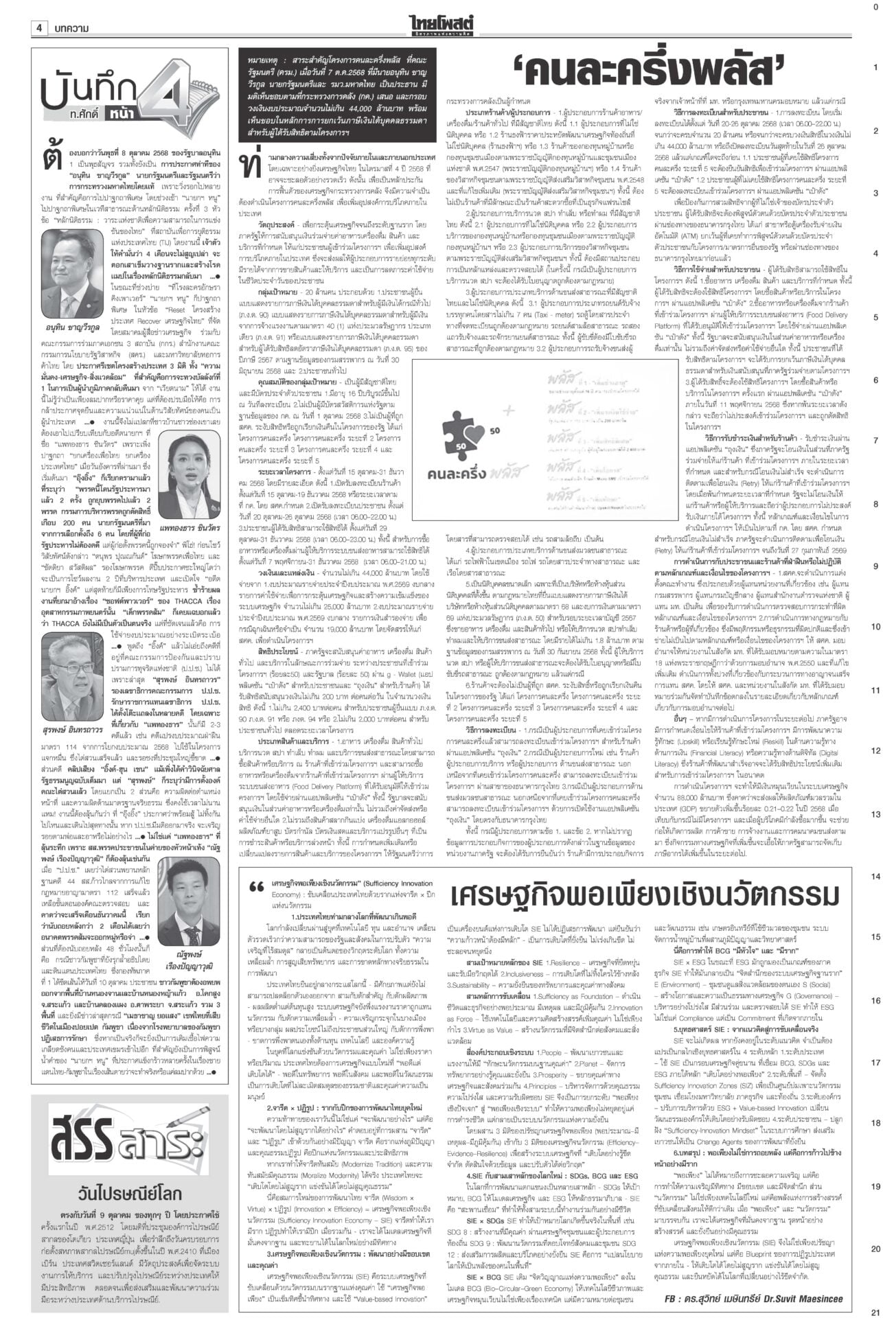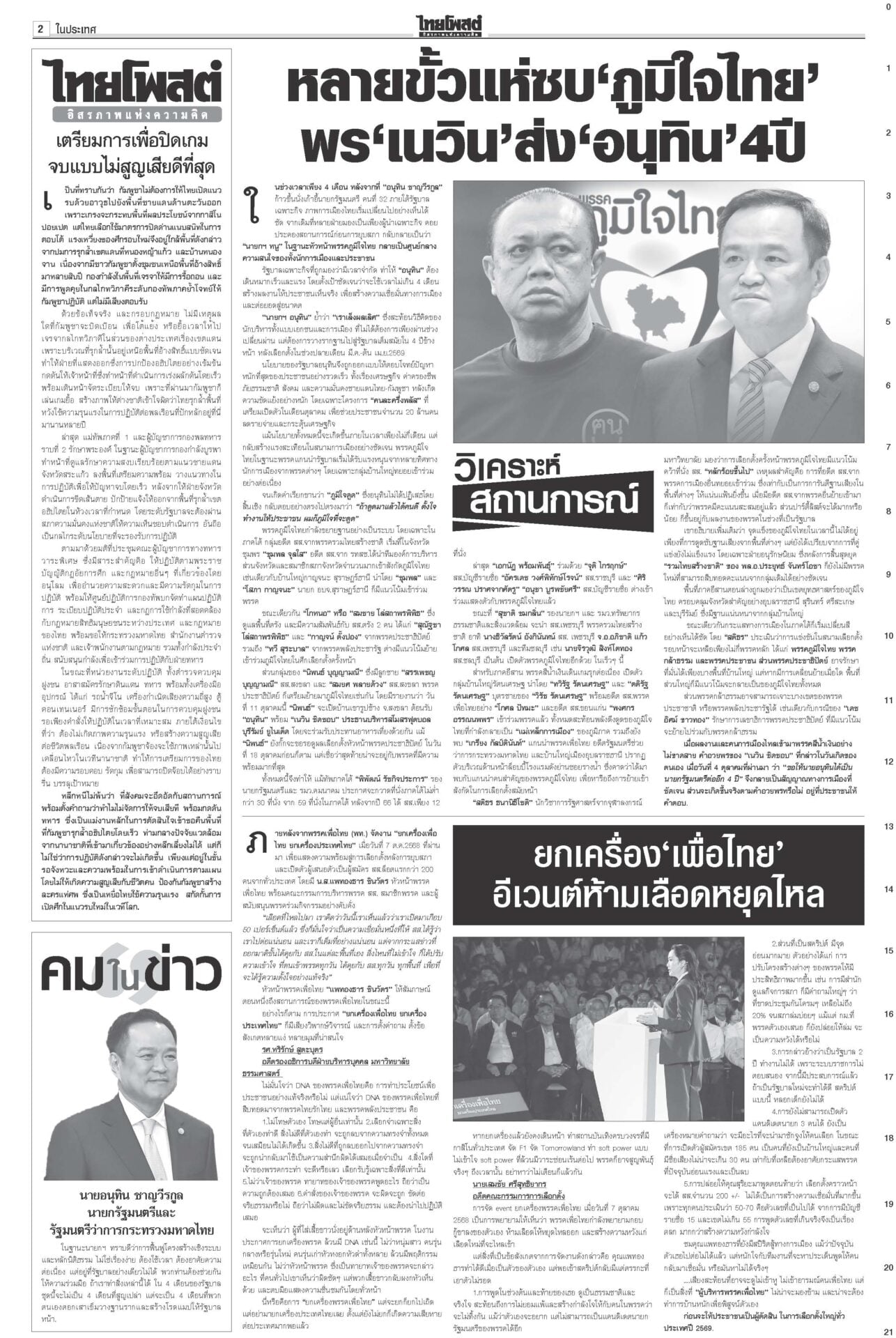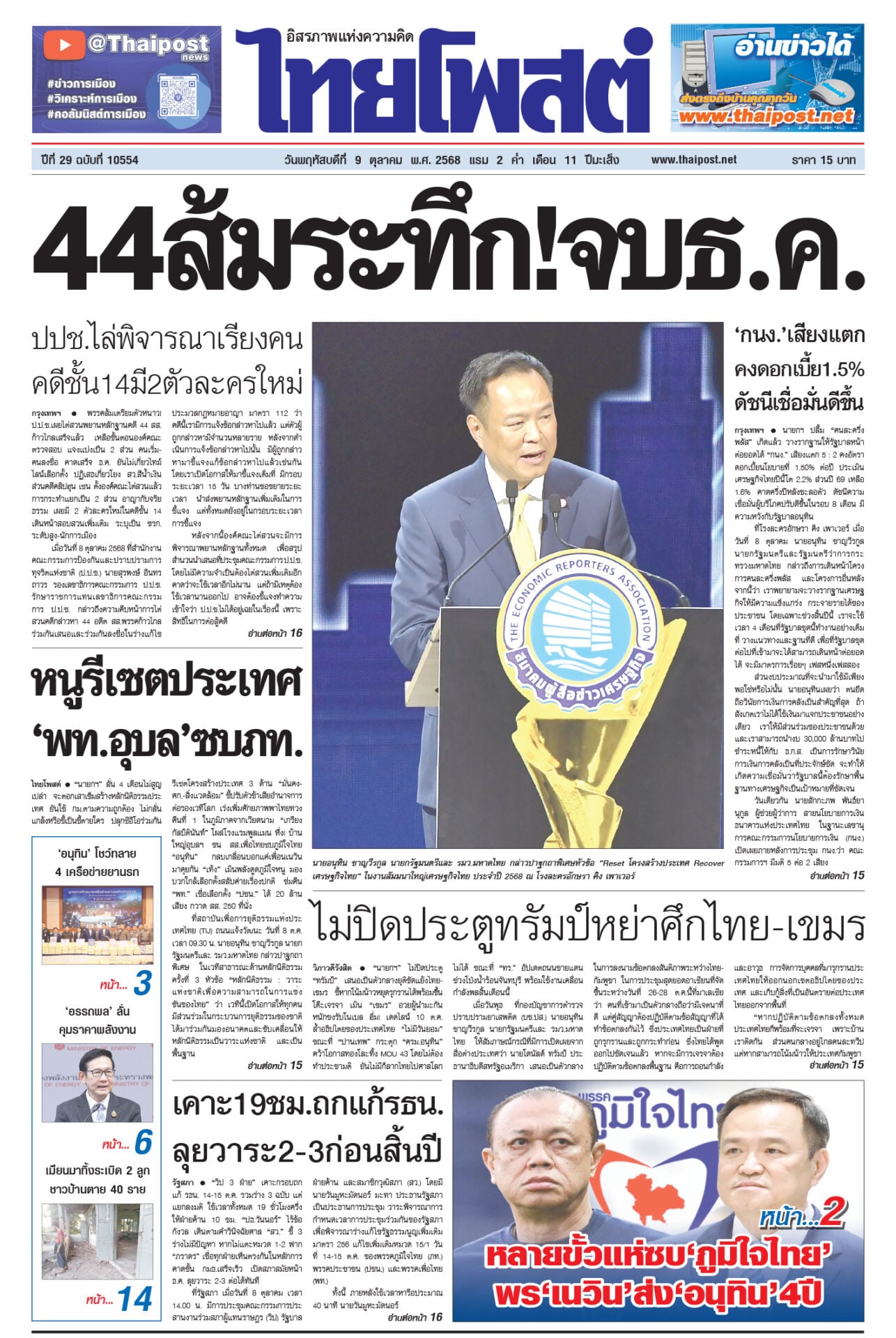 หนังสือพิมพ์ ฉบับวันที่ 9 ตุลาคม 2568ข่าวหน้าหนึ่ง44ส้มระทึก!จบธ.ค. ปปช.ไล่พิจารณาเรียงคน คดีชั้น14มี2ตัวละครใหม่พรรคส้มเตรียมตัวหนาว! ป.ป.ช.เผยไต่สวนพยานหลักฐานคดี 44 สส.ก้าวไกลเสร็จแล้ว เคาะ19ชม.ถกแก้รธน. ลุยวาระ2-3ก่อนสิ้นปี“วิป 3 ฝ่าย” เคาะกรอบถกแก้ รธน. 14-15 ต.ค. รวมร่าง 3 ฉบับ แต่แยกลงมติ ใช้เวลาทั้งหมด 19 ชั่วโมง หนูรีเซตประเทศ ‘พท.อุบล’ซบภท.“นายกฯ” ลั่น 4 เดือนไม่สูญเปล่า จะตอกเสาเข็มสร้างหลักนิติธรรมประเทศ ‘กนง.’เสียงแตก คงดอกเบี้ย1.5% ดัชนีเชื่อมั่นดีขึ้นนายกฯ ปลื้ม “คนละครึ่งพลัส” เกิดแล้ว วางรากฐานให้รัฐบาลหน้าต่อยอดได้ “กนง.” เสียงแตก 5 : 2 คงอัตราดอกเบี้ยนโยบายที่ 1.50% ต่อปี ไม่ปิดประตูทรัมป์หย่าศึกไทย-เขมร“นายกฯ” ไม่ปิดประตู “ทรัมป์” เสนอเป็นตัวกลางยุติขัดแย้งไทย-เขมร
