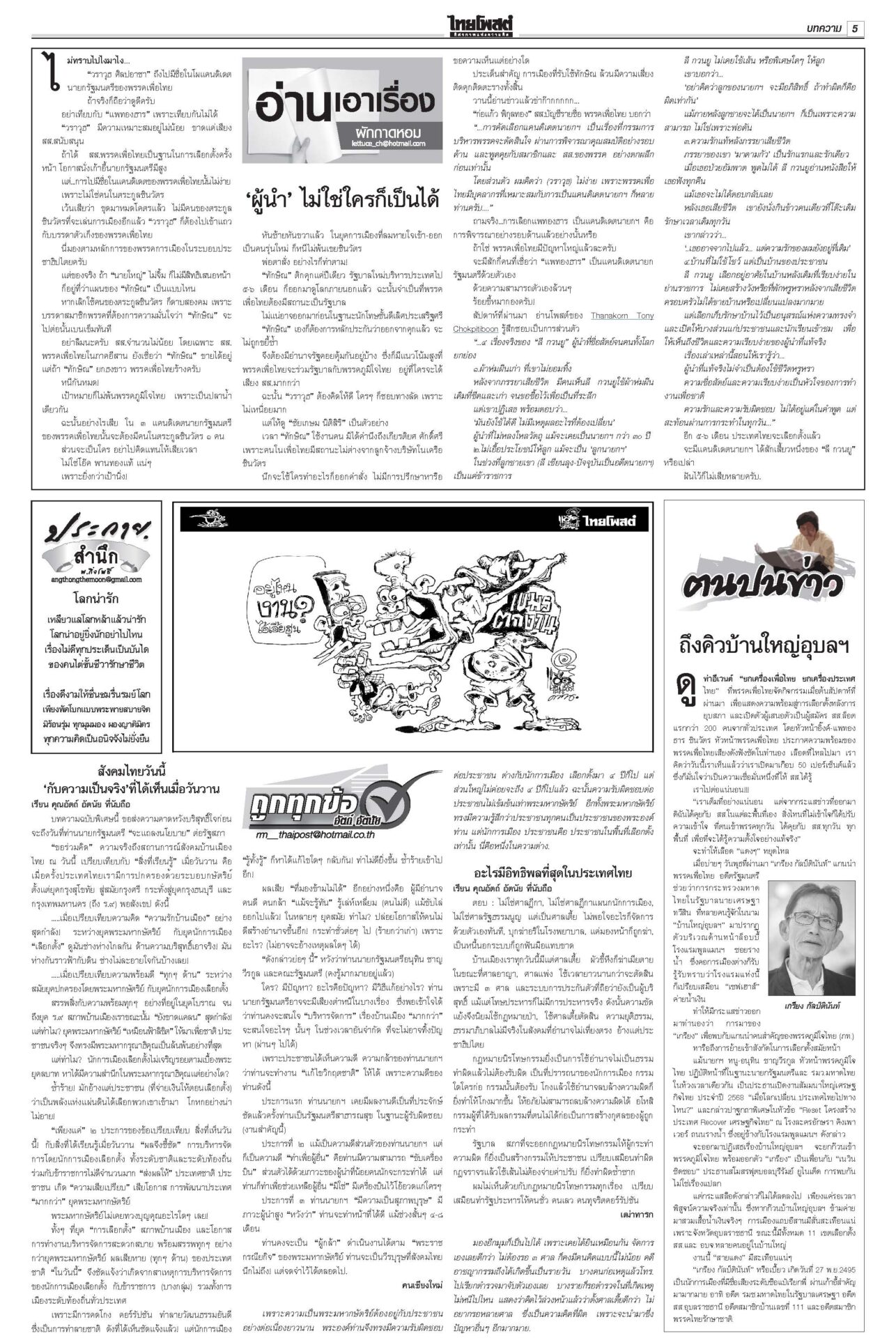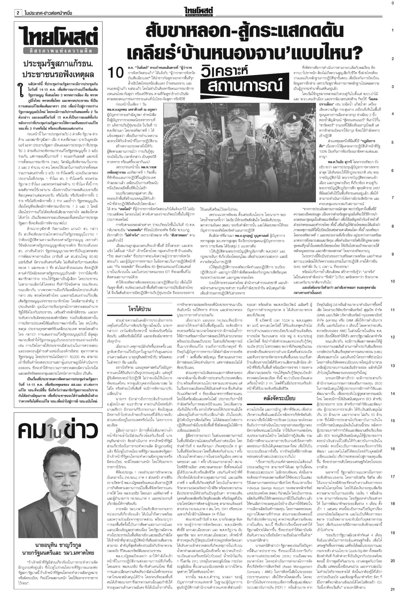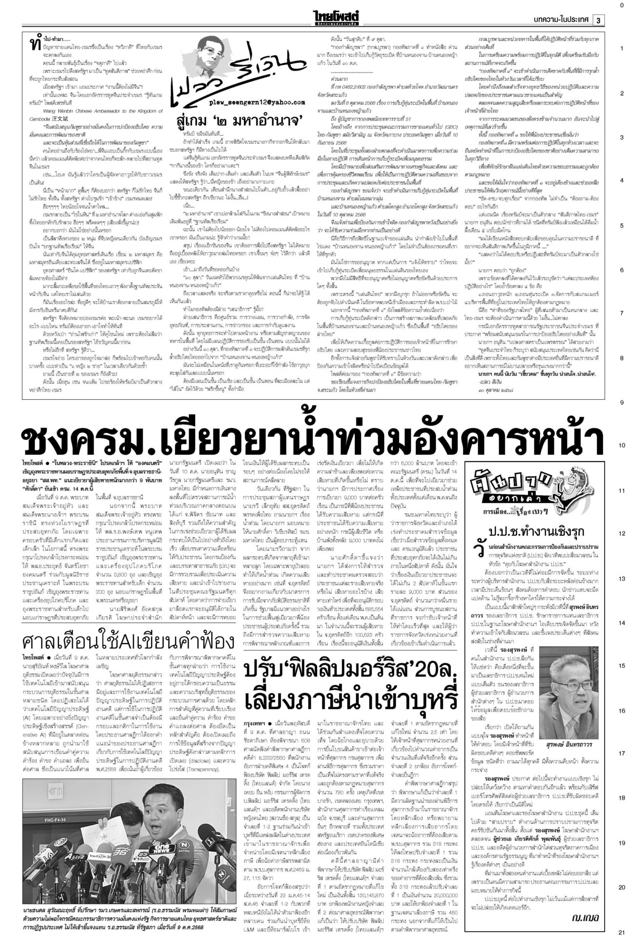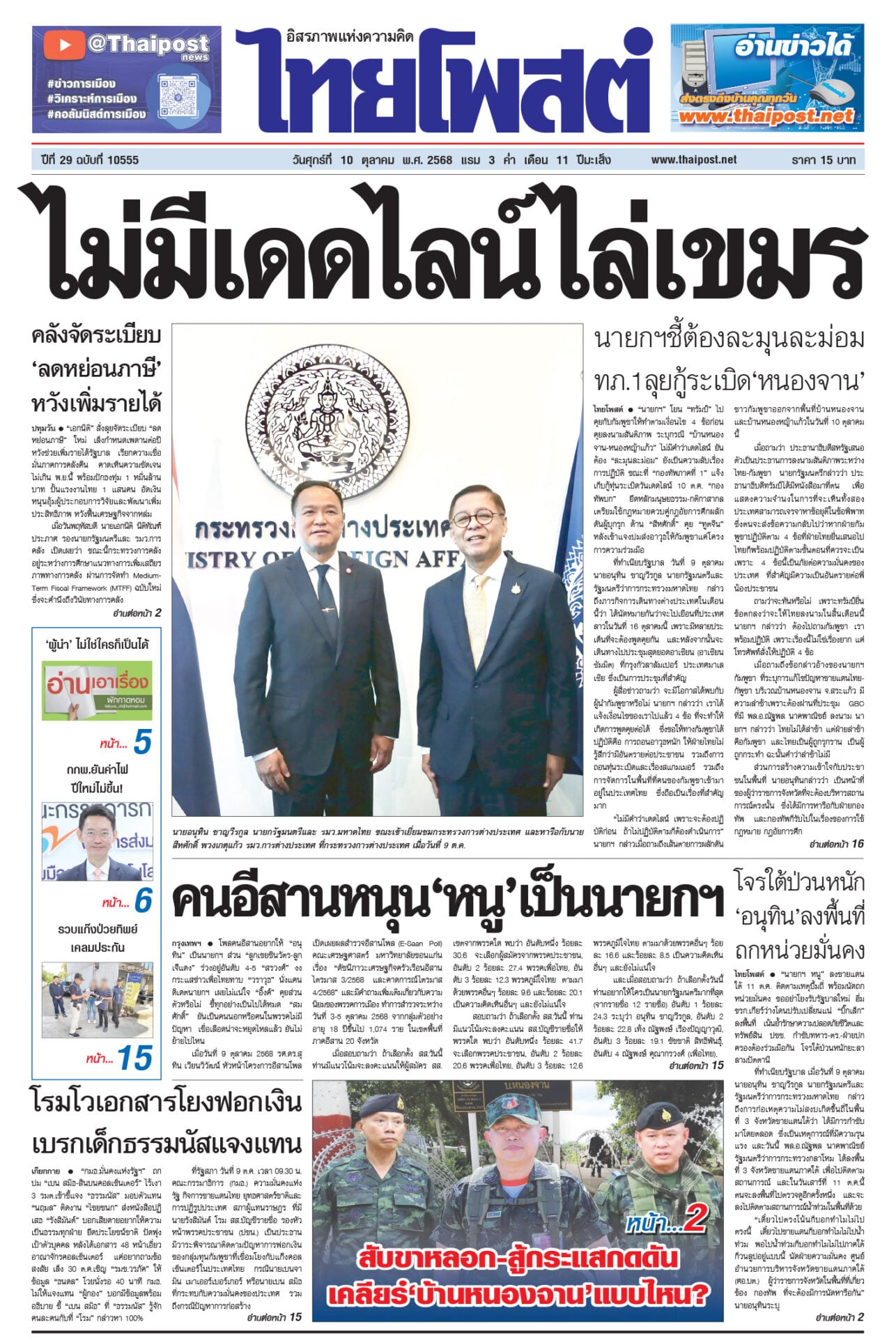 หนังสือพิมพ์ ฉบับวันที่ 10 ตุลาคม 2568ข่าวหน้าหนึ่งไม่มีเดดไลน์ไล่เขมร นายกฯชี้ต้องละมุนละม่อม ทภ.1ลุยกู้ระเบิด‘หนองจาน’“นายกฯ” โยน “ทรัมป์” ไปคุยกับกัมพูชาให้ทำตามเงื่อนไข 4 ข้อก่อน คนอีสานหนุน‘หนู’เป็นนายกฯโพลคนอีสานอยากให้ “อนุทิน” เป็นนายกฯ ส่วน “ลูกเขยชินวัตร-ลูกเจ๊แดง” ร่วงอยู่อันดับ 4-5 “สรวงศ์” โรมโวเอกสารโยงฟอกเงิน เบรกเด็กธรรมนัสแจงแทน“กมธ.มั่นคงแห่งรัฐฯ” ถกปม “เบน สมิธ-สินบนคอลเซ็นเตอร์” ไร้เงา 3 รมต.เข้าชี้แจง “ธรรมนัส” มอบตัวแทน คลังจัดระเบียบ ‘ลดหย่อนภาษี’ หวังเพิ่มรายได้“เอกนิติ” สั่งลุยจัดระเบียบ “ลดหย่อนภาษี” ใหม่ เล็งกำหนดเพดานต่อปี โจรใต้ป่วนหนัก ‘อนุทิน’ลงพื้นที่ ถกหน่วยมั่นคง“นายกฯ หนู” ลงชายแดนใต้ 11 ต.ค. ติดตามเหตุบึ้มถี่ พร้อมนัดถกหน่วยมั่นคง