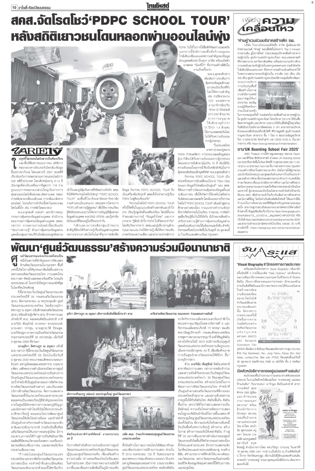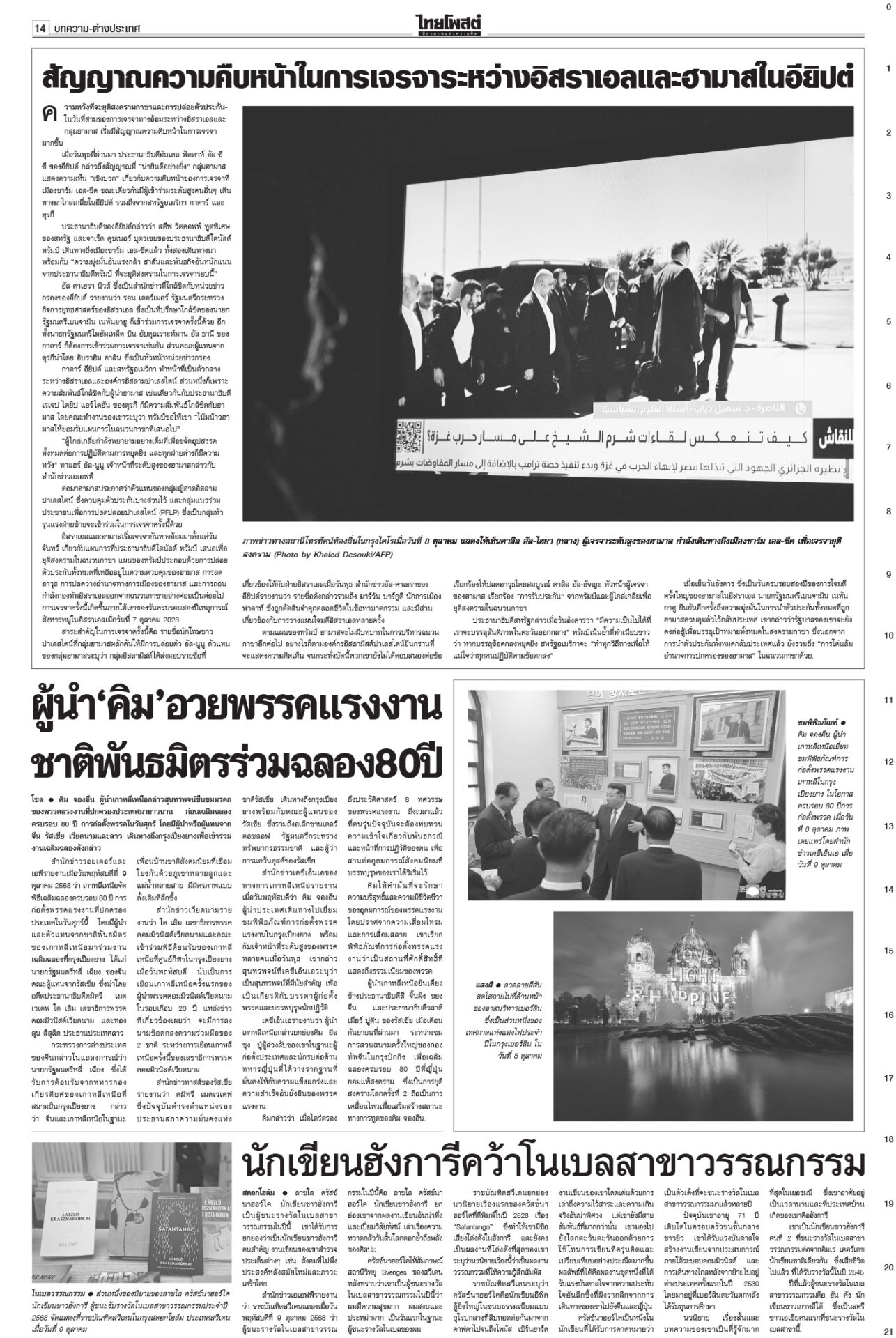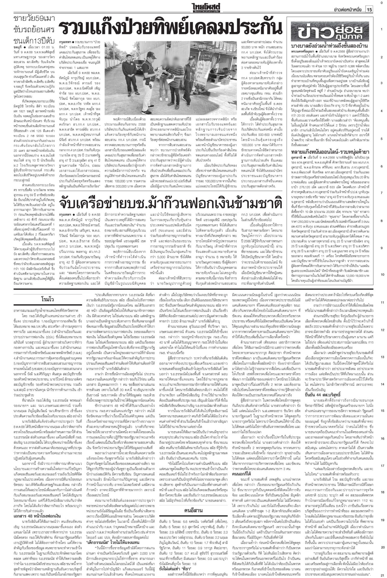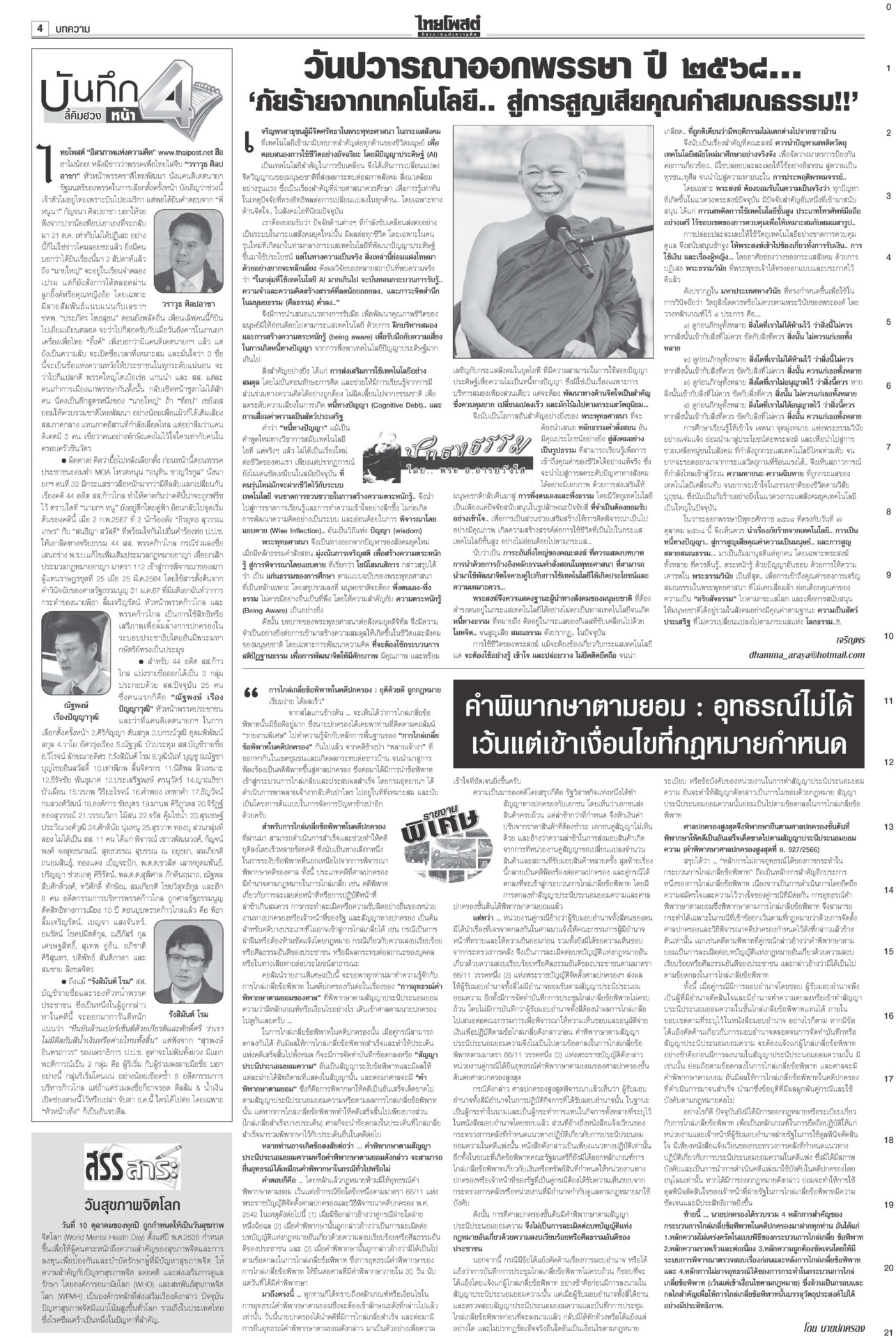 หนังสือพิมพ์ ฉบับวันที่ 10 ตุลาคม 2568ข่าวหน้าหนึ่งไม่มีเดดไลน์ไล่เขมร นายกฯชี้ต้องละมุนละม่อม ทภ.1ลุยกู้ระเบิด‘หนองจาน’“นายกฯ” โยน “ทรัมป์” ไปคุยกับกัมพูชาให้ทำตามเงื่อนไข 4 ข้อก่อน คนอีสานหนุน‘หนู’เป็นนายกฯโพลคนอีสานอยากให้ “อนุทิน” เป็นนายกฯ ส่วน “ลูกเขยชินวัตร-ลูกเจ๊แดง” ร่วงอยู่อันดับ 4-5 “สรวงศ์” โรมโวเอกสารโยงฟอกเงิน เบรกเด็กธรรมนัสแจงแทน“กมธ.มั่นคงแห่งรัฐฯ” ถกปม “เบน สมิธ-สินบนคอลเซ็นเตอร์” ไร้เงา 3 รมต.เข้าชี้แจง “ธรรมนัส” มอบตัวแทน คลังจัดระเบียบ ‘ลดหย่อนภาษี’ หวังเพิ่มรายได้“เอกนิติ” สั่งลุยจัดระเบียบ “ลดหย่อนภาษี” ใหม่ เล็งกำหนดเพดานต่อปี โจรใต้ป่วนหนัก ‘อนุทิน’ลงพื้นที่ ถกหน่วยมั่นคง“นายกฯ หนู” ลงชายแดนใต้ 11 ต.ค. ติดตามเหตุบึ้มถี่ พร้อมนัดถกหน่วยมั่นคง