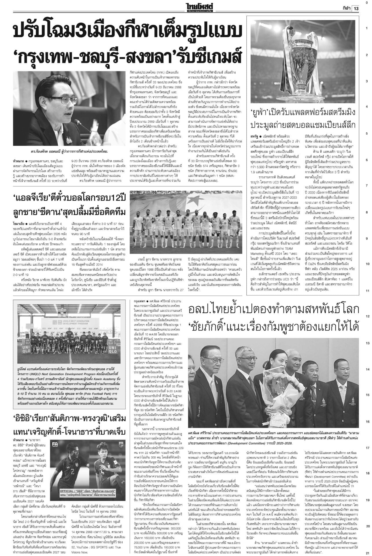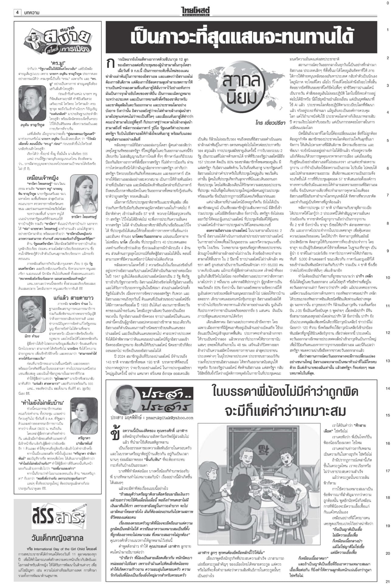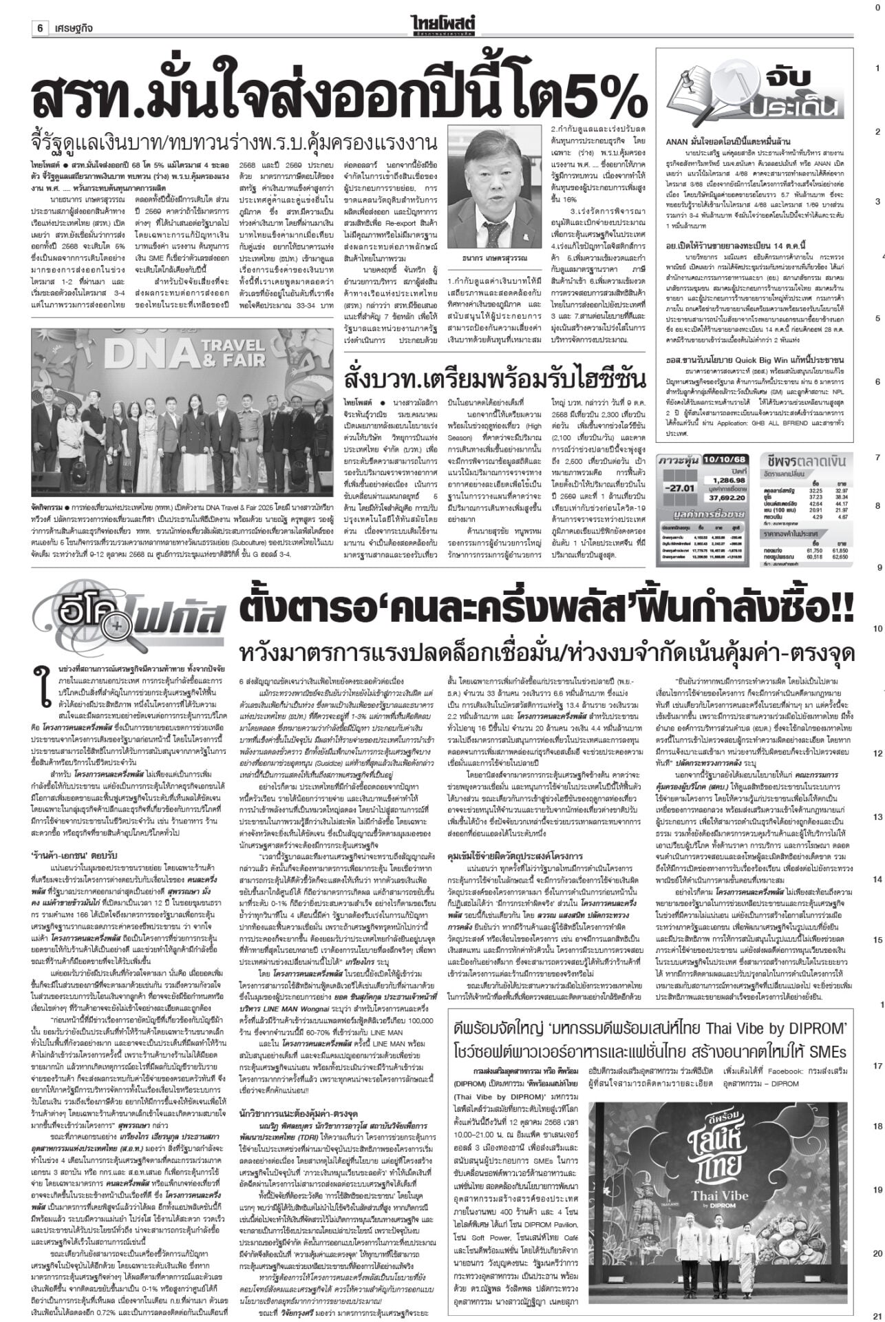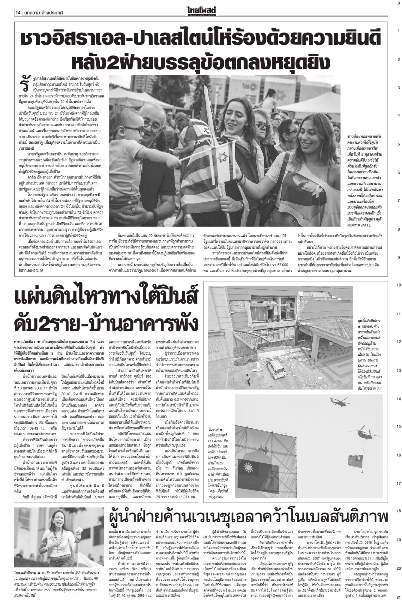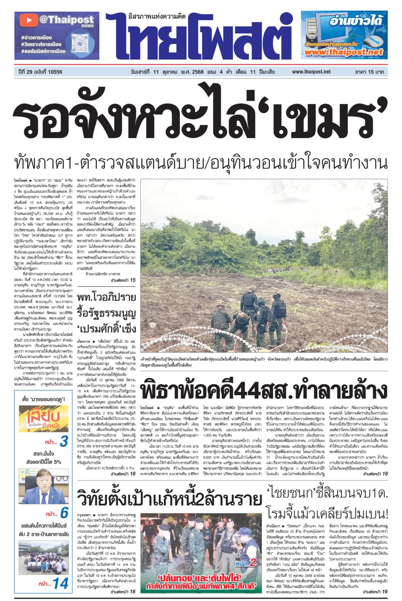 หนังสือพิมพ์ ฉบับวันที่ 11 ตุลาคม 2568ข่าวหน้าหนึ่งรอจังหวะไล่‘เขมร’ ทัพภาค1-ตำรวจสแตนด์บาย/อนุทินวอนเข้าใจคนทำงาน“นายกฯ” ถก “สมช.” หารือสถานการณ์ชายแดนไทย-กัมพูชา ย้ำจุดยืน 4 ข้อ อุบแย้มแผนบอกเรื่องลับสุดยอด ย้ำไทยพร้อมทุกอย่าง พิธาพ้อคดี44สส.ทำลายล้าง“อนุทิน” ลงพื้นที่น้ำท่วมพิจิตร-ชัยนาท ลั่นไม่เอาความเดือดร้อนมาสร้างคะแนนนิยม ‘ไชยชนก’ชี้สินบนจบ1ด. โรมจี้แม้วเคลียร์ปมเบน!“ไชยชนก” เบี้ยวแจง กมธ.ไอซีที ปมสินบน 40 ล้าน อ้างเหตุไม่อยากเปิดเผยข้อมูล วิทัยตั้งเป้าแก้หนี้2ล้านรายนายกฯ สั่งกระทรวงเศรษฐกิจเร่งนโยบายควิกวินให้เป็นรูปธรรมใน 4 เดือน พท.โวอภิปราย รื้อรัฐธรรมนูญ ‘เปรมศักดิ์’เซ็ง“เพื่อไทย” ตีปี๊บมี 30 สส.เตรียมอภิปรายเรื่องแก้ไขรัฐธรรมนูญ ยังกั๊กท่าทีหนุนทั้ง 3 ฉบับหรือแค่ของตัวเอง “เปรมศักดิ์”