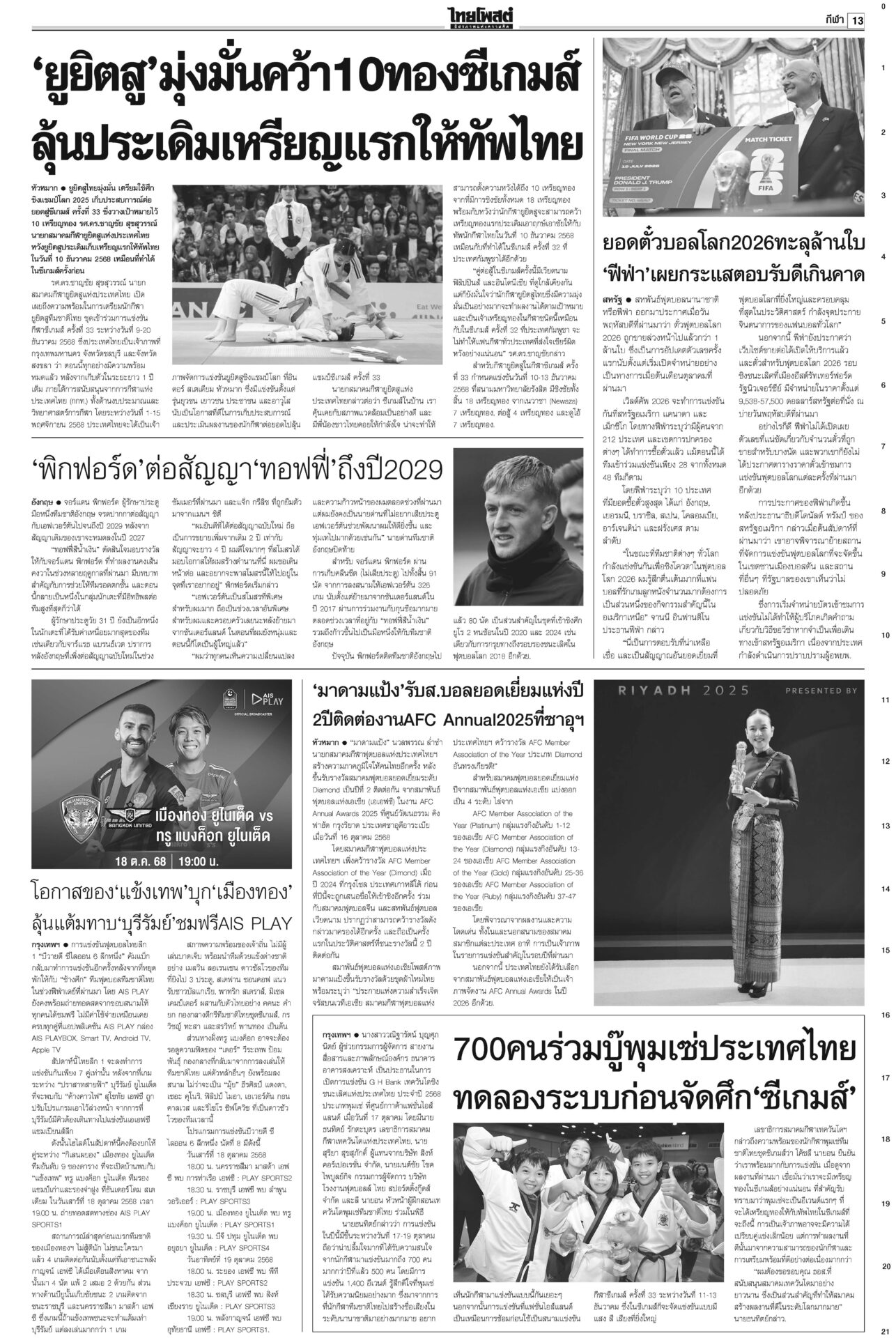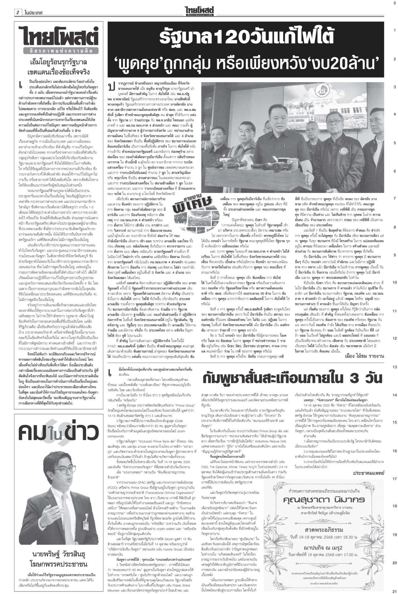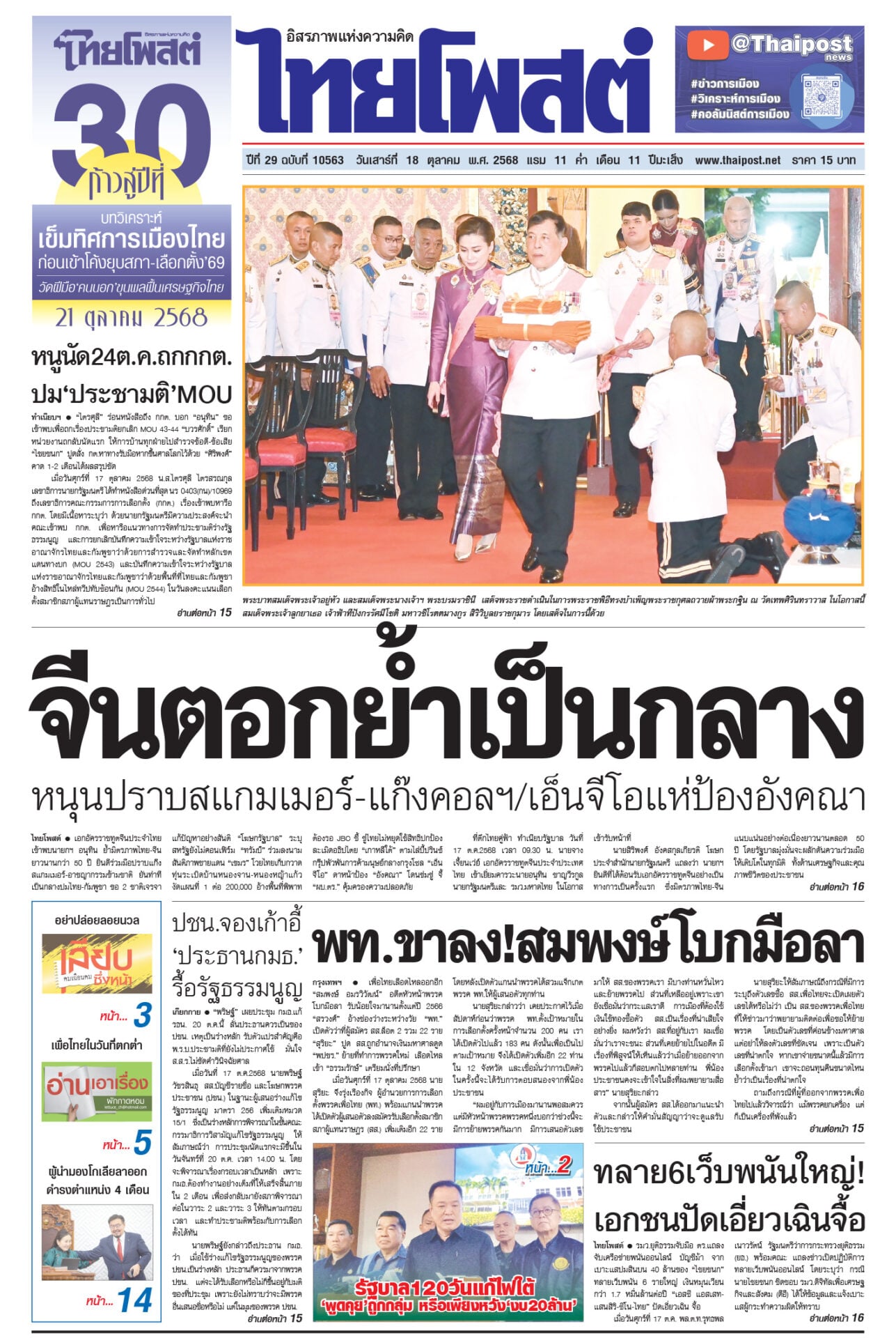 หนังสือพิมพ์ ฉบับวันที่ 18 ตุลาคม 2568ข่าวหน้าหนึ่งจีนตอกยํ้าเป็นกลาง หนุนปราบสแกมเมอร์-แก๊งคอลฯ/เอ็นจีโอแห่ป้องอังคณาเอกอัครราชทูตจีนประจำไทยเข้าพบนายกฯ อนุทิน ย้ำมิตรภาพไทย-จีนยาวนานกว่า 50 ปี พท.ขาลง!สมพงษ์โบกมือลาเพื่อไทยเลือดไหลออกอีก “สมพงษ์ อมรวิวัฒน์” อดีตหัวหน้าพรรคโบกมือลา หนูนัด24ต.ค.ถกกกต. ปม‘ประชามติ’MOU“ไตรศุลี” ร่อนหนังสือถึง กกต. บอก “อนุทิน” ขอเข้าพบเพื่อถกเรื่องประชามติยกเลิก MOU 43-44 ทลาย6เว็บพนันใหญ่! เอกชนปัดเอี่ยวเฉินจื้อรมว.ยุติธรรมจับมือ ตร.แถลงจับเครือข่ายพนันออนไลน์ บัญชีม้า จากเบาะแสปมสินบน 40 ล้าน ปชน.จองเก้าอี้ ‘ประธานกมธ.’ รื้อรัฐธรรมนูญ“พริษฐ์” เผยประชุม กมธ.แก้ รธน. 20 ต.ค.นี้ ลั่นประธานควรเป็นของ ปชน.