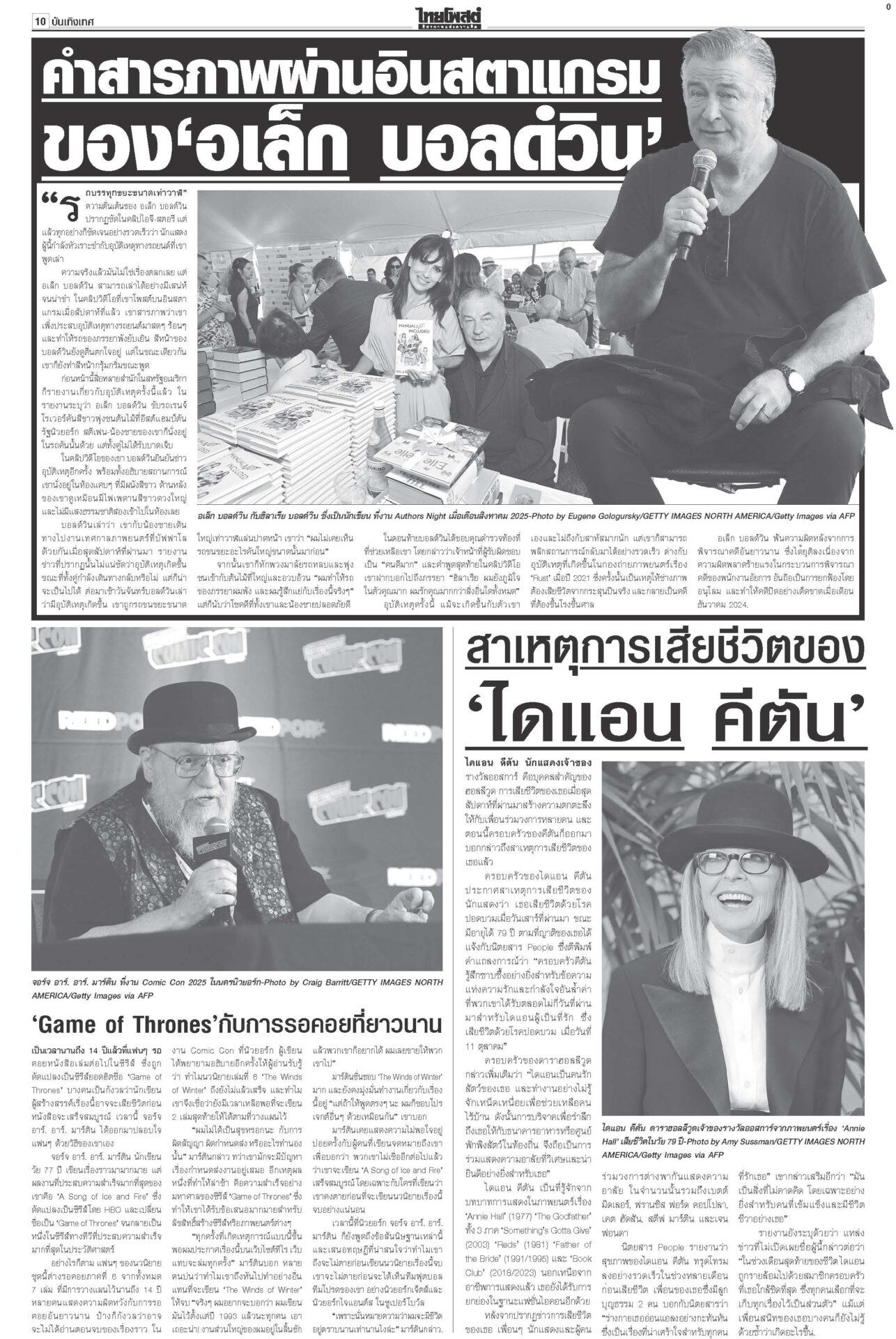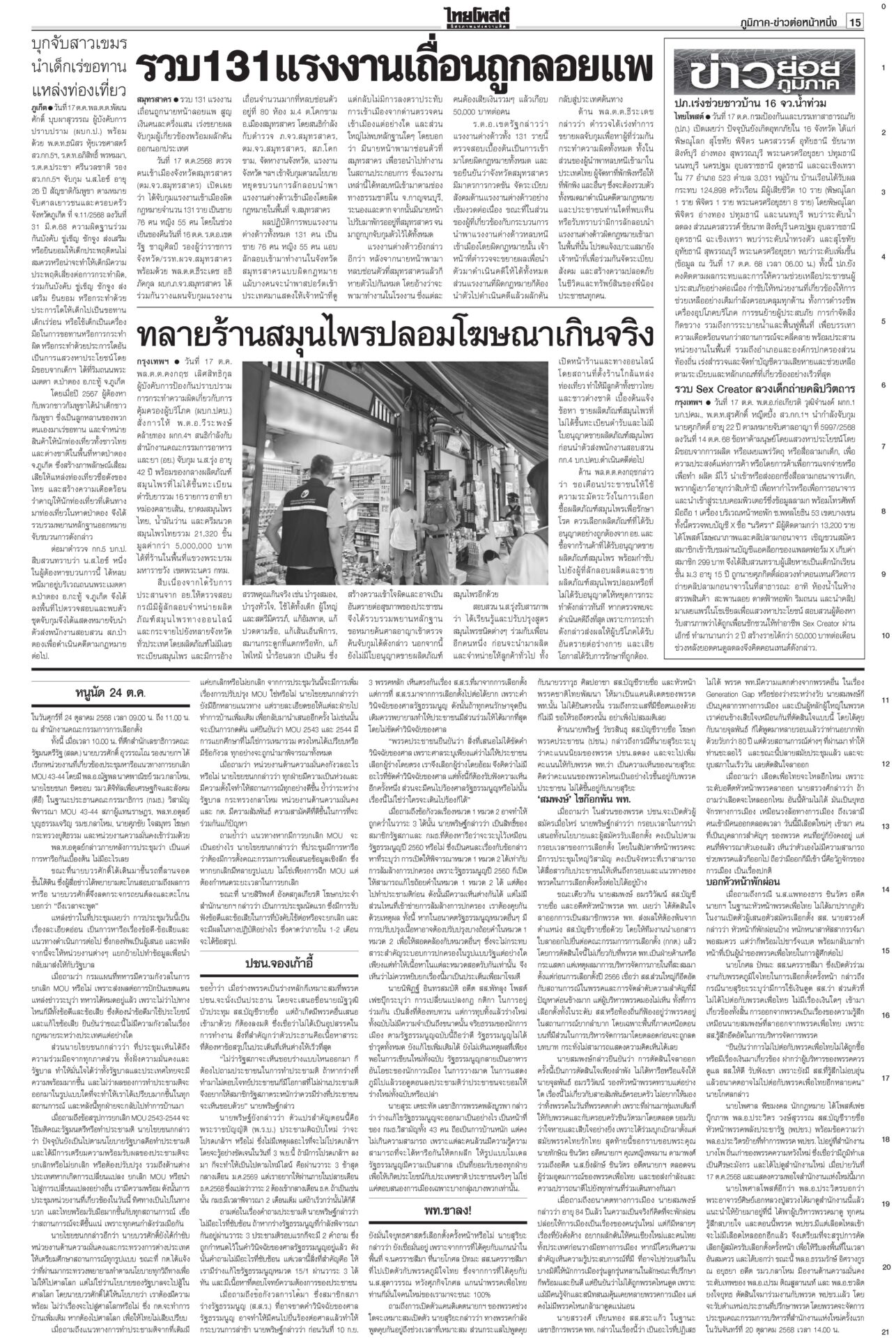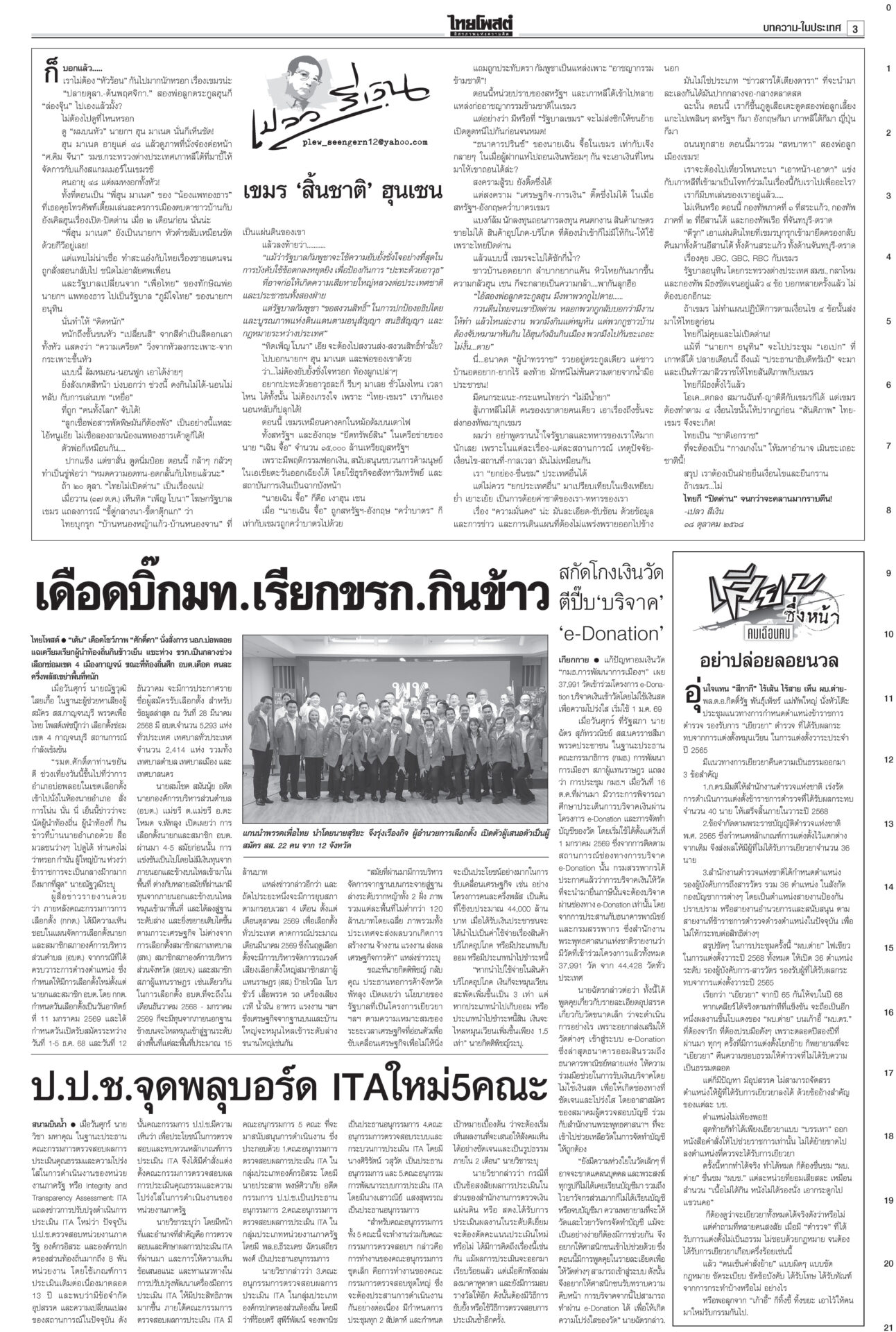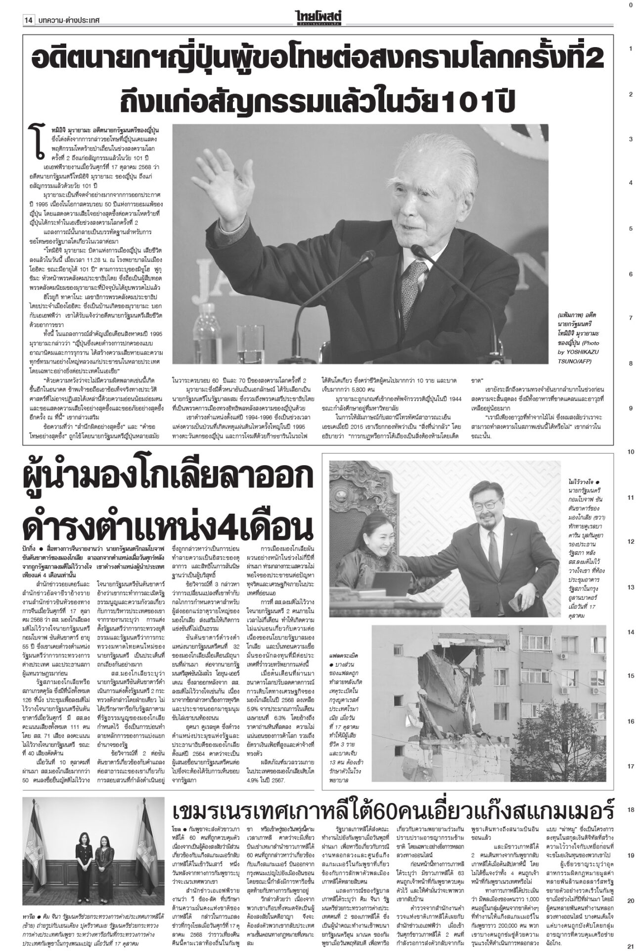 หนังสือพิมพ์ ฉบับวันที่ 18 ตุลาคม 2568ข่าวหน้าหนึ่งจีนตอกยํ้าเป็นกลาง หนุนปราบสแกมเมอร์-แก๊งคอลฯ/เอ็นจีโอแห่ป้องอังคณาเอกอัครราชทูตจีนประจำไทยเข้าพบนายกฯ อนุทิน ย้ำมิตรภาพไทย-จีนยาวนานกว่า 50 ปี พท.ขาลง!สมพงษ์โบกมือลาเพื่อไทยเลือดไหลออกอีก “สมพงษ์ อมรวิวัฒน์” อดีตหัวหน้าพรรคโบกมือลา หนูนัด24ต.ค.ถกกกต. ปม‘ประชามติ’MOU“ไตรศุลี” ร่อนหนังสือถึง กกต. บอก “อนุทิน” ขอเข้าพบเพื่อถกเรื่องประชามติยกเลิก MOU 43-44 ทลาย6เว็บพนันใหญ่! เอกชนปัดเอี่ยวเฉินจื้อรมว.ยุติธรรมจับมือ ตร.แถลงจับเครือข่ายพนันออนไลน์ บัญชีม้า จากเบาะแสปมสินบน 40 ล้าน ปชน.จองเก้าอี้ ‘ประธานกมธ.’ รื้อรัฐธรรมนูญ“พริษฐ์” เผยประชุม กมธ.แก้ รธน. 20 ต.ค.นี้ ลั่นประธานควรเป็นของ ปชน.