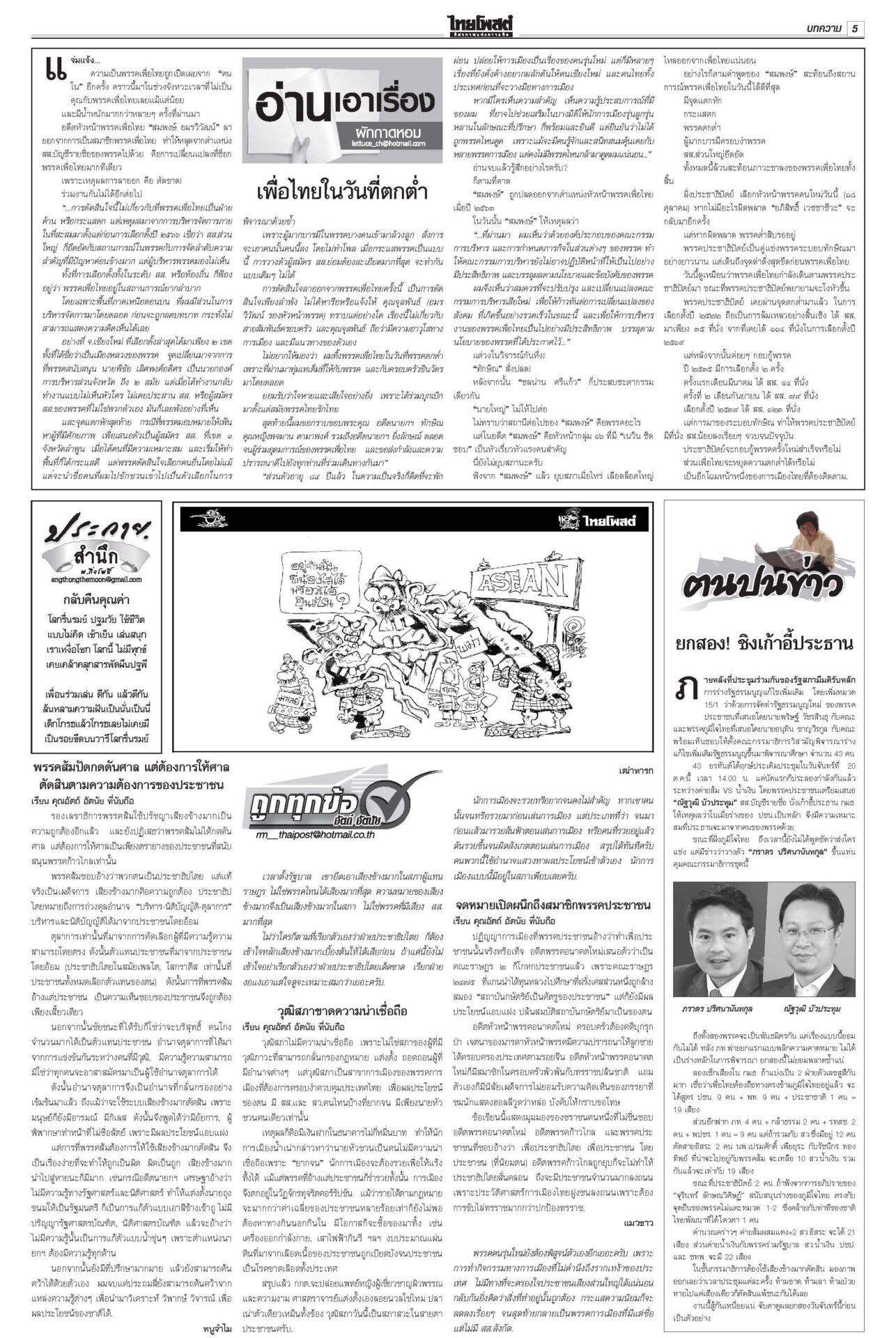 ฉบับวันที่ 18 ตุลาคม 2568 18 ตุลาคม 2568 เวลา 0:01 น. หนังสือพิมพ์ ฉบับวันที่ 18 ตุลาคม 2568ข่าวหน้าหนึ่งจีนตอกยํ้าเป็นกลาง หนุนปราบสแกมเมอร์-แก๊งคอลฯ/เอ็นจีโอแห่ป้องอังคณาเอกอัครราชทูตจีนประจำไทยเข้าพบนายกฯ อนุทิน ย้ำมิตรภาพไทย-จีนยาวนานกว่า 50 ปี พท.ขาลง!สมพงษ์โบกมือลาเพื่อไทยเลือดไหลออกอีก “สมพงษ์ อมรวิวัฒน์” อดีตหัวหน้าพรรคโบกมือลา หนูนัด24ต.ค.ถกกกต. ปม‘ประชามติ’MOU“ไตรศุลี” ร่อนหนังสือถึง กกต. บอก “อนุทิน” ขอเข้าพบเพื่อถกเรื่องประชามติยกเลิก MOU 43-44 ทลาย6เว็บพนันใหญ่! เอกชนปัดเอี่ยวเฉินจื้อรมว.ยุติธรรมจับมือ ตร.แถลงจับเครือข่ายพนันออนไลน์ บัญชีม้า จากเบาะแสปมสินบน 40 ล้าน ปชน.จองเก้าอี้ ‘ประธานกมธ.’ รื้อรัฐธรรมนูญ“พริษฐ์” เผยประชุม กมธ.แก้ รธน. 20 ต.ค.นี้ ลั่นประธานควรเป็นของ ปชน. Tagsรายวันหนังสือพิมพ์ ข่าวที่เกี่ยวข้อง ฉบับวันที่ 5 ธันวาคม 2568 ฉบับวันที่ 4 ธันวาคม 2568 ฉบับวันที่ 3 ธันวาคม 2568 ฉบับวันที่ 2 ธันวาคม 2568 ฉบับวันที่ 1 ธันวาคม 2568 ฉบับวันที่ 30 พฤศจิกายน 2568 NEWS UPDATE 15:18 น. ปชน. ค้านนัดโหวตแก้ รธน. วาระ 3 หลังปีใหม่ หวั่นกระทบไทม์ไลน์ทำประชามติ 15:04 น. 'แม่ทัพกุ้ง' ลงใต้ ให้กำลังใจชาวหาดใหญ่ เยี่ยมเจ้าหน้าที่จิตอาสาเร่งฟื้นฟูเมือง 14:47 น. ปิดด่าน 5 เดือน การค้าชายแดนคลองใหญ่เสียหาย 5 พันล้าน สินค้าเถื่อนทะลัก วอนรัฐบาลเยียวยา 14:44 น. ‘โรม’ เปิดคำฟ้องธรรมนัส ชี้ใช้กฎหมายปิดปากฝ่ายตรวจสอบ-ถามปกป้องชาติหรือทุนเทา 14:32 น. ดอกไม้นานาพรรณบานสะพรั่งทั่วสวนหลวง ร.๙ สัมผัสรับลมหนาวถึง 10 ธ.ค. นี้