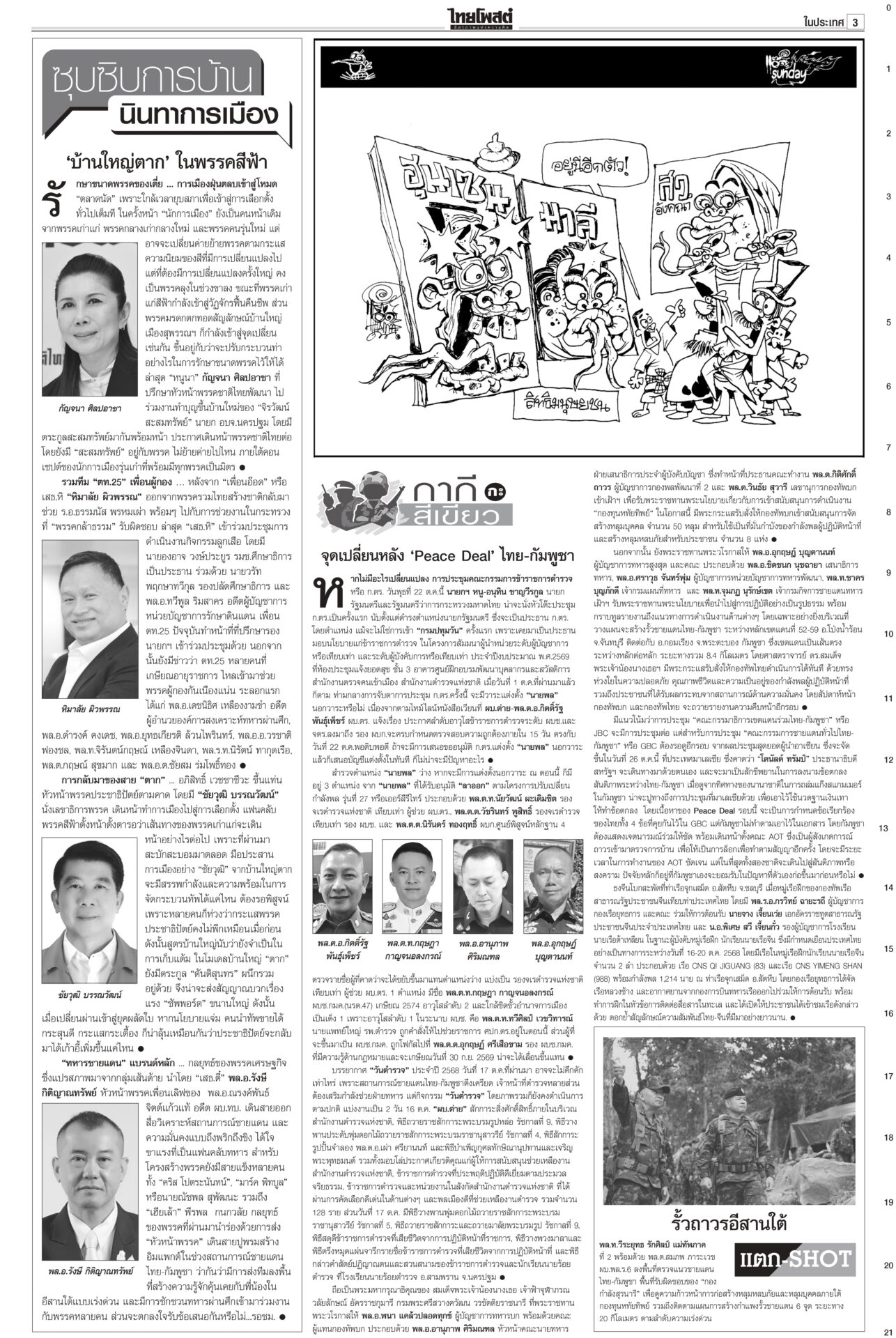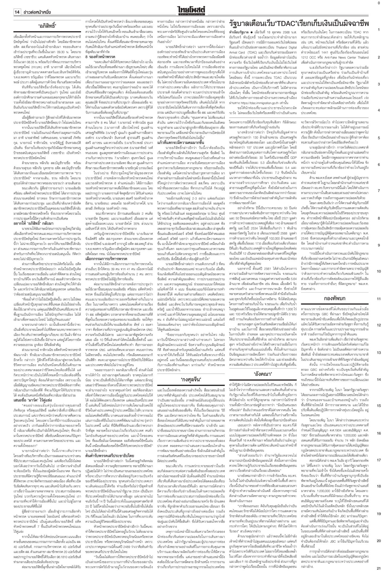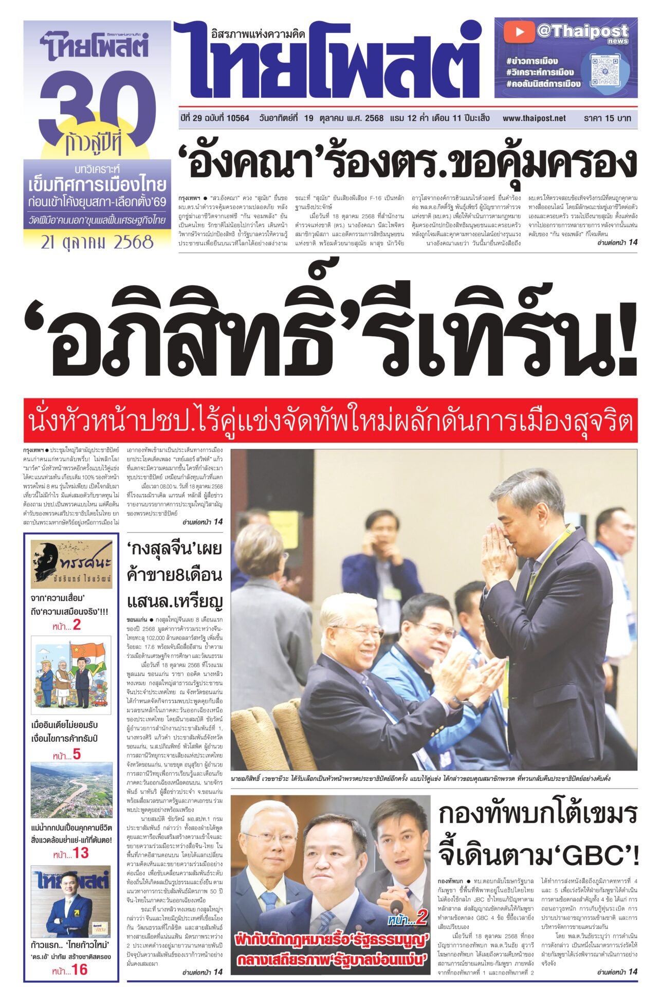 หนังสือพิมพ์ฉบับวันที่ 19 ตุลาคม 2568ข่าวหน้าหนึ่ง‘อังคณา’ร้องตร.ขอคุ้มครอง“สว.อังคณา” ควง “สุณัย” ยื่นขอ ผบ.ตร.นำตำรวจคุ้มครองความปลอดภัย หลังถูกขู่ฆ่าเอาชีวิตจากเอฟซี “กัน จอมพลัง” ยันเป็นคนไทย รักชาติไม่น้อยไปกว่าใคร กองทัพบกโต้เขมร จี้เดินตาม‘GBC’!ทบ.ตอบกลับโฆษกรัฐบาลกัมพูชา ชี้พื้นที่พิพาทอยู่ในอธิปไตยไทย ไม่ต้องใช้กลไก JBC ย้ำไทยแก้ปัญหาตามหลักสากล ส่งสัญญาณชัดกดดันให้กัมพูชาทำตามข้อตกลง ‘อภิสิทธิ์’รีเทิร์น! นั่งหัวหน้าปชป.ไร้คู่แข่งจัดทัพใหม่ผลักดันการเมืองสุจริตประชุมใหญ่วิสามัญประชาธิปัตย์ คนเก่าคนแก่หวนกลับพรึ่บ! ไม่พลิกโผ! “มาร์ค” นั่งหัวหน้าพรรคอีกครั้งแบบไร้คู่แข่ง ได้คะแนนท่วมท้น เกือบเต็ม 100% ‘กงสุลจีน’เผย ค้าขาย8เดือน แสนล.เหรียญกงสุลใหญ่จีนเผย 8 เดือนแรกของปี 2568 มูลค่าการค้ารวมระหว่างจีน-ไทยทะลุ 102,000 ล้านดอลลาร์สหรัฐ เพิ่มขึ้นร้อยละ 17.6 พร้อมจับมือสื่ออีสาน ย้ำความร่วมมือด้านเศรษฐกิจ การศึกษา และวัฒนธรรม