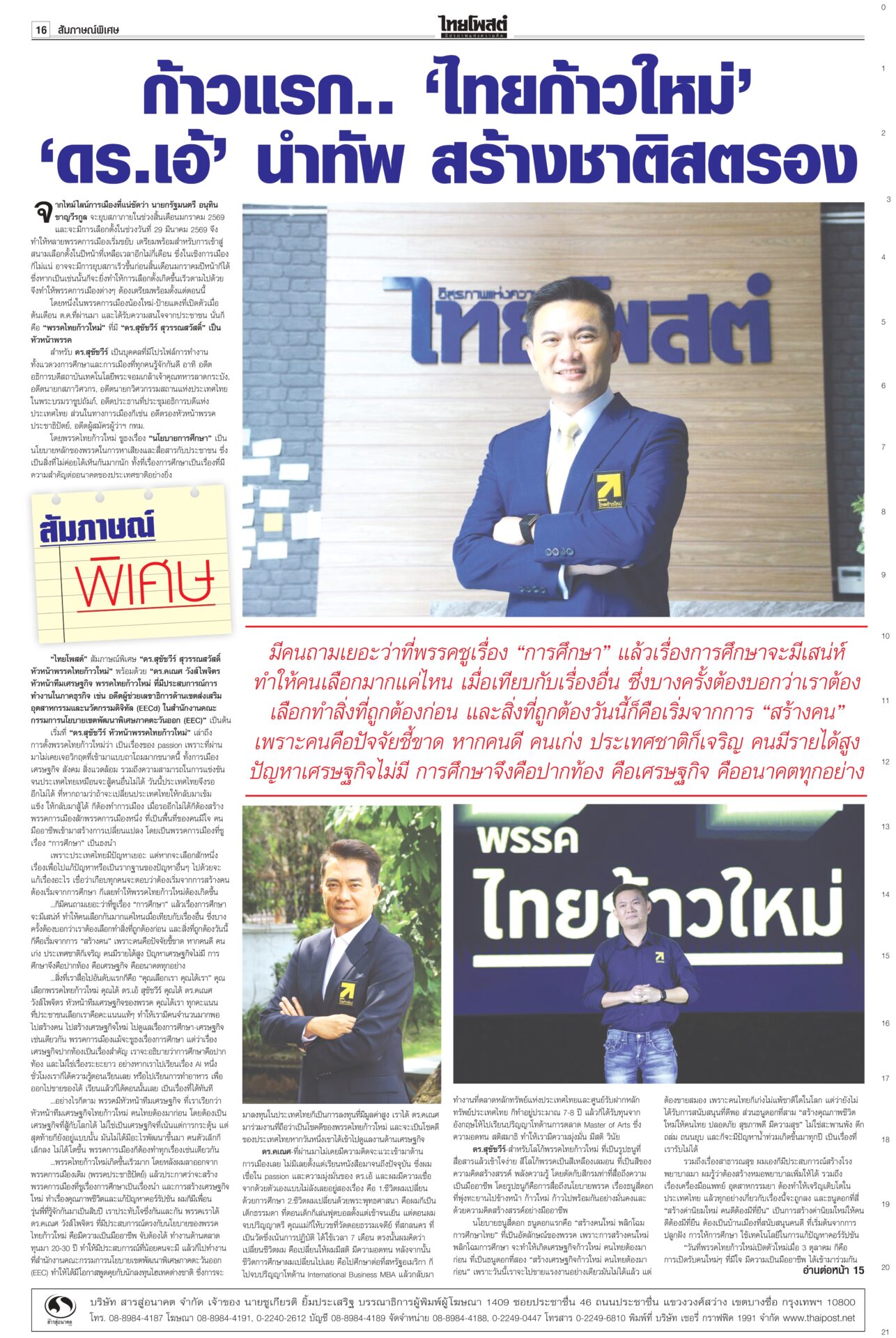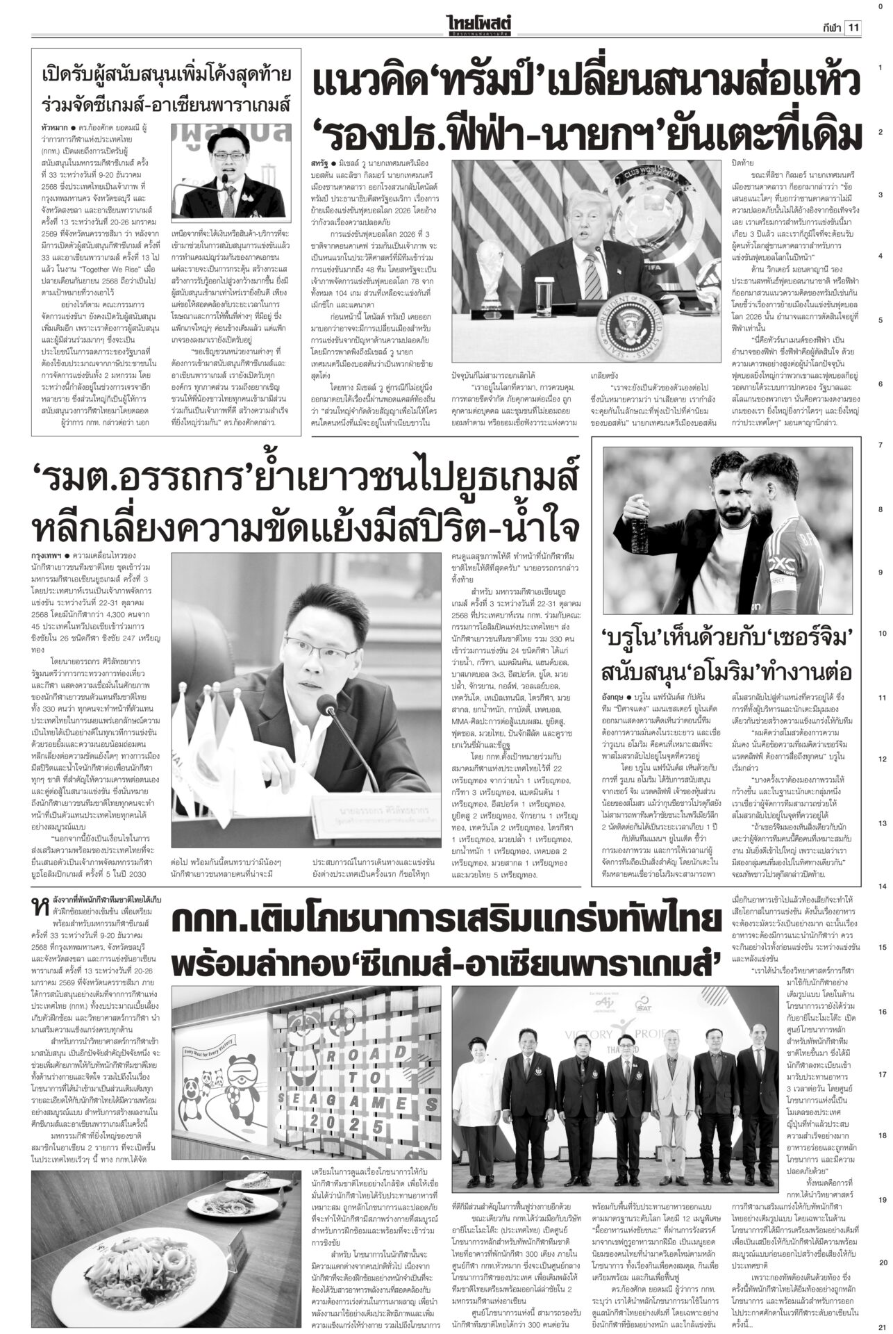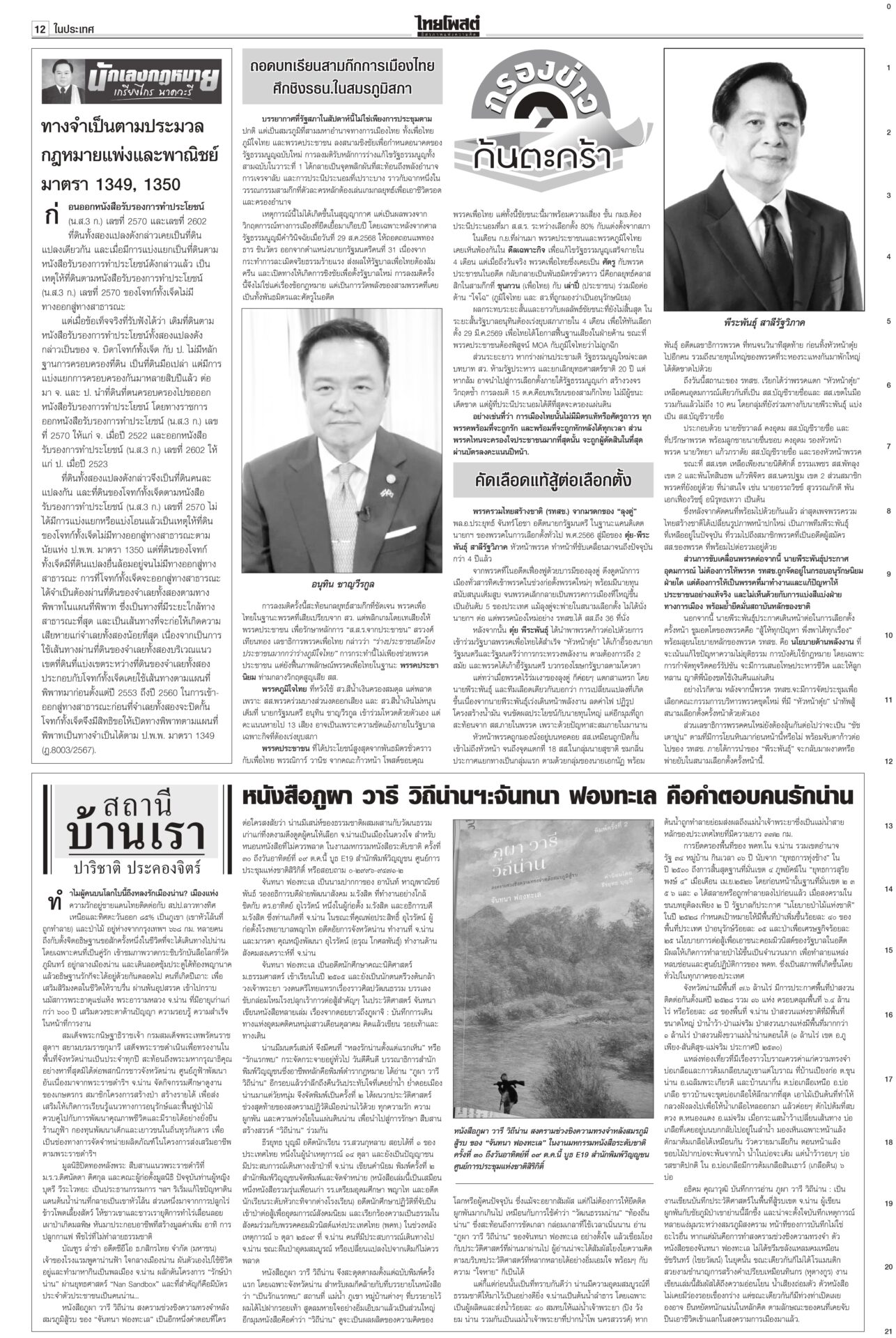 หนังสือพิมพ์ฉบับวันที่ 19 ตุลาคม 2568ข่าวหน้าหนึ่ง‘อังคณา’ร้องตร.ขอคุ้มครอง“สว.อังคณา” ควง “สุณัย” ยื่นขอ ผบ.ตร.นำตำรวจคุ้มครองความปลอดภัย หลังถูกขู่ฆ่าเอาชีวิตจากเอฟซี “กัน จอมพลัง” ยันเป็นคนไทย รักชาติไม่น้อยไปกว่าใคร กองทัพบกโต้เขมร จี้เดินตาม‘GBC’!ทบ.ตอบกลับโฆษกรัฐบาลกัมพูชา ชี้พื้นที่พิพาทอยู่ในอธิปไตยไทย ไม่ต้องใช้กลไก JBC ย้ำไทยแก้ปัญหาตามหลักสากล ส่งสัญญาณชัดกดดันให้กัมพูชาทำตามข้อตกลง ‘อภิสิทธิ์’รีเทิร์น! นั่งหัวหน้าปชป.ไร้คู่แข่งจัดทัพใหม่ผลักดันการเมืองสุจริตประชุมใหญ่วิสามัญประชาธิปัตย์ คนเก่าคนแก่หวนกลับพรึ่บ! ไม่พลิกโผ! “มาร์ค” นั่งหัวหน้าพรรคอีกครั้งแบบไร้คู่แข่ง ได้คะแนนท่วมท้น เกือบเต็ม 100% ‘กงสุลจีน’เผย ค้าขาย8เดือน แสนล.เหรียญกงสุลใหญ่จีนเผย 8 เดือนแรกของปี 2568 มูลค่าการค้ารวมระหว่างจีน-ไทยทะลุ 102,000 ล้านดอลลาร์สหรัฐ เพิ่มขึ้นร้อยละ 17.6 พร้อมจับมือสื่ออีสาน ย้ำความร่วมมือด้านเศรษฐกิจ การศึกษา และวัฒนธรรม