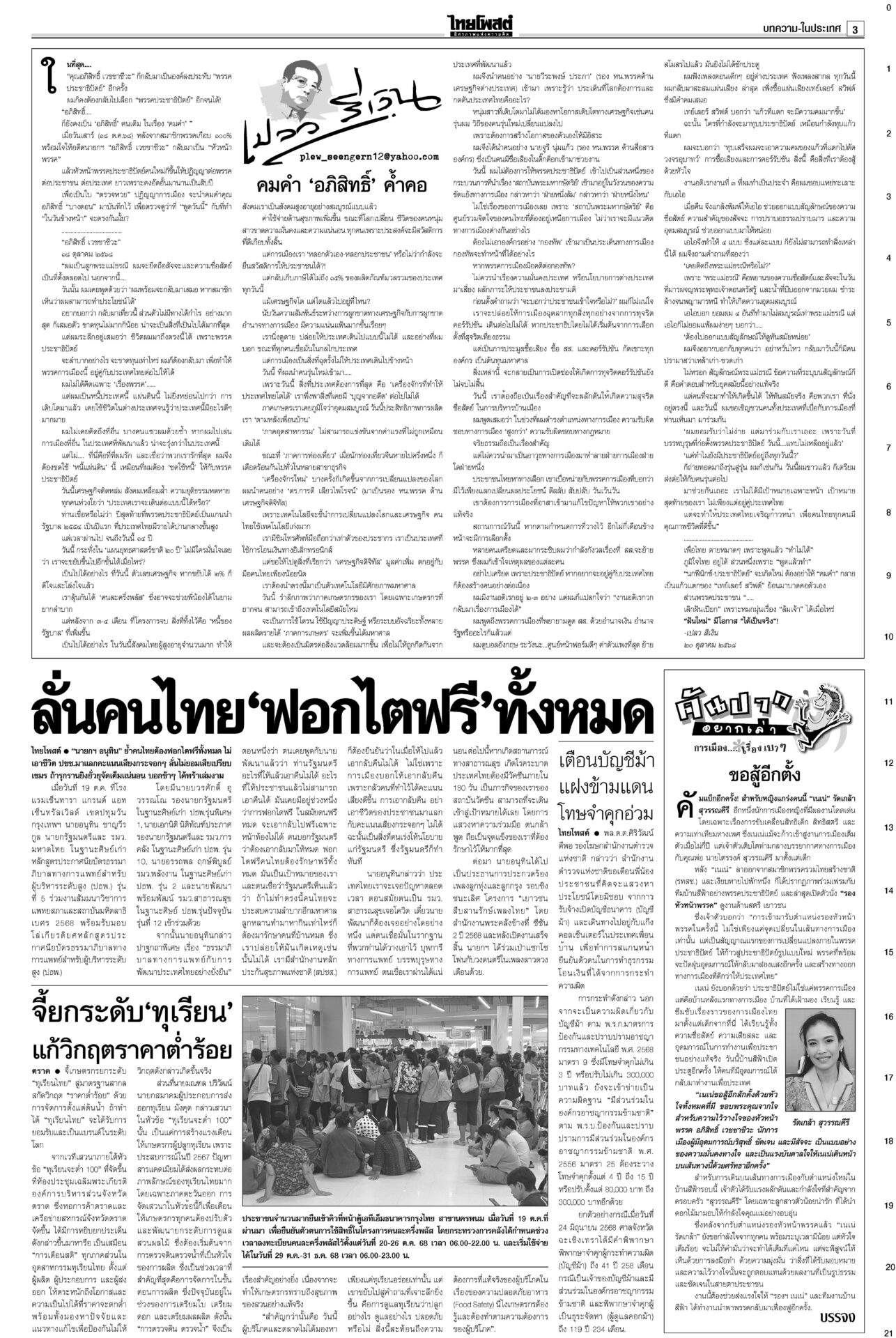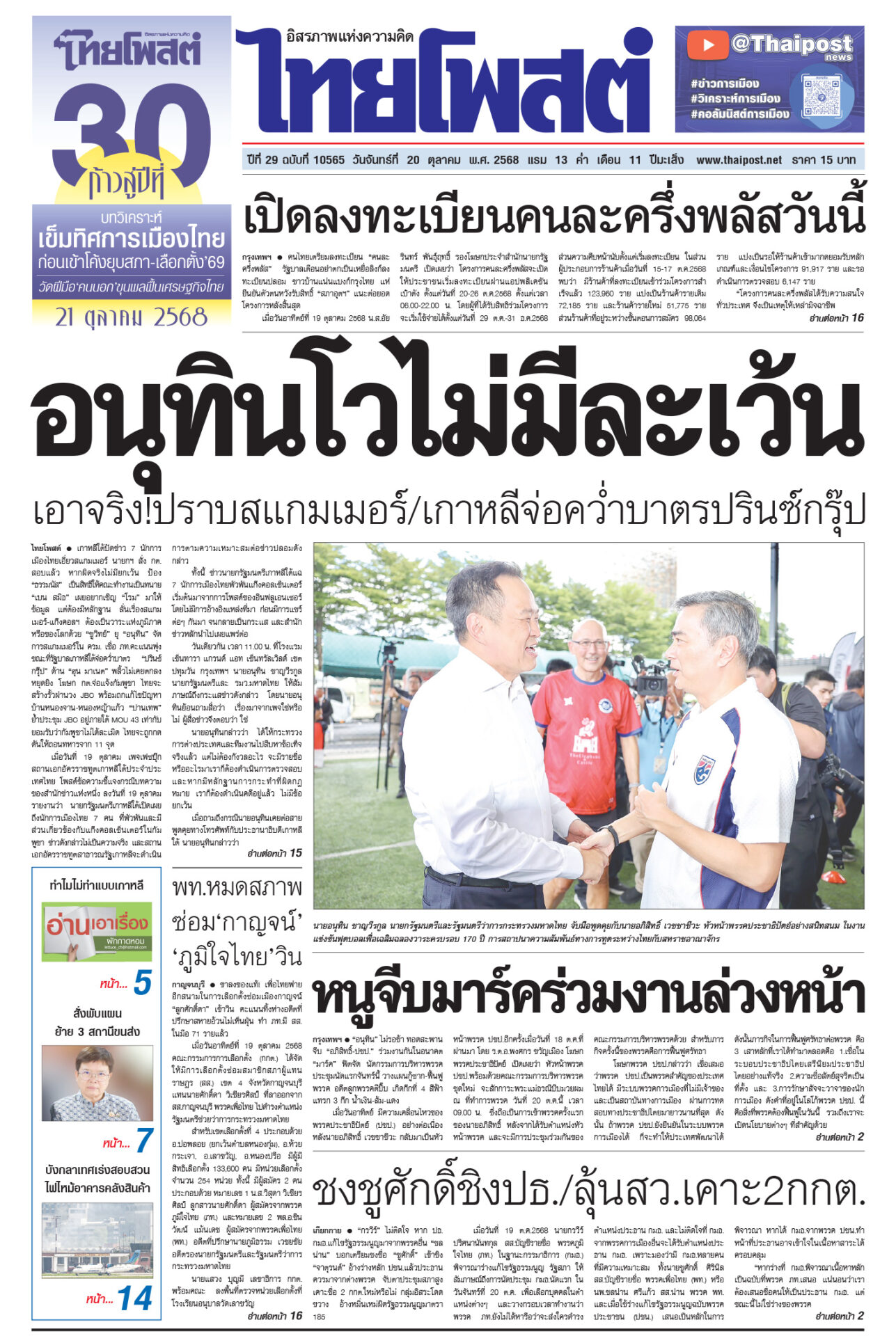 หนังสือพิมพ์ ฉบับวันที่ 20 ตุลาคม 2568ข่าวหน้าหนึ่งอนุทินโวไม่มีละเว้น เอาจริง!ปราบสแกมเมอร์/เกาหลีจ่อควํ่าบาตรปรินซ์กรุ๊ปเกาหลีใต้ปัดข่าว 7 นักการเมืองไทยเอี่ยวสแกมเมอร์ นายกฯ สั่ง กต.สอบแล้ว เปิดลงทะเบียนคนละครึ่งพลัสวันนี้คนไทยเตรียมลงทะเบียน “คนละครึ่งพลัส” รัฐบาลเตือนอย่าตกเป็นเหยื่อลิงก์ลงทะเบียนปลอม ชงชูศักดิ์ชิงปธ./ลุ้นสว.เคาะ2กกต.“กรวีร์” ไม่ติดใจ หาก ปธ.กมธ.แก้ไขรัฐธรรมนูญมาจากพรรคอื่น “ชลน่าน” บอกเตรียมชงชื่อ “ชูศักดิ์” เข้าชิง “จาตุรนต์” หนูจีบมาร์คร่วมงานล่วงหน้า“อนุทิน” ไม่รอช้า ทอดสะพานจีบ “อภิสิทธิ์-ปชป.” ร่วมงานกันในอนาคต “มาร์ค” พท.หมดสภาพ ซ่อม‘กาญจน์’ ‘ภูมิใจไทย’วินขาลงของแท้! เพื่อไทยพ่ายอีกสนามในการเลือกตั้งซ่อมเมืองกาญจน์