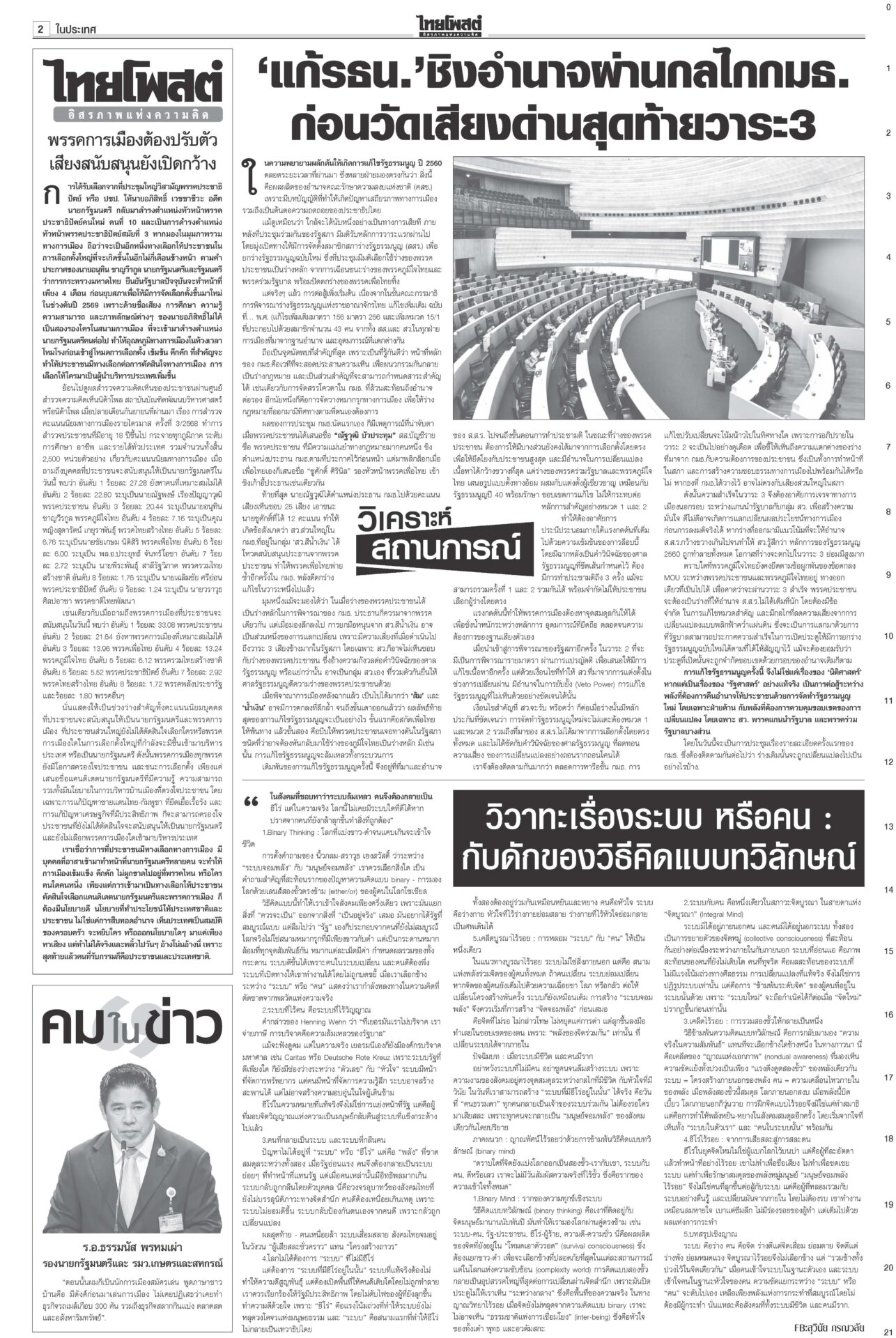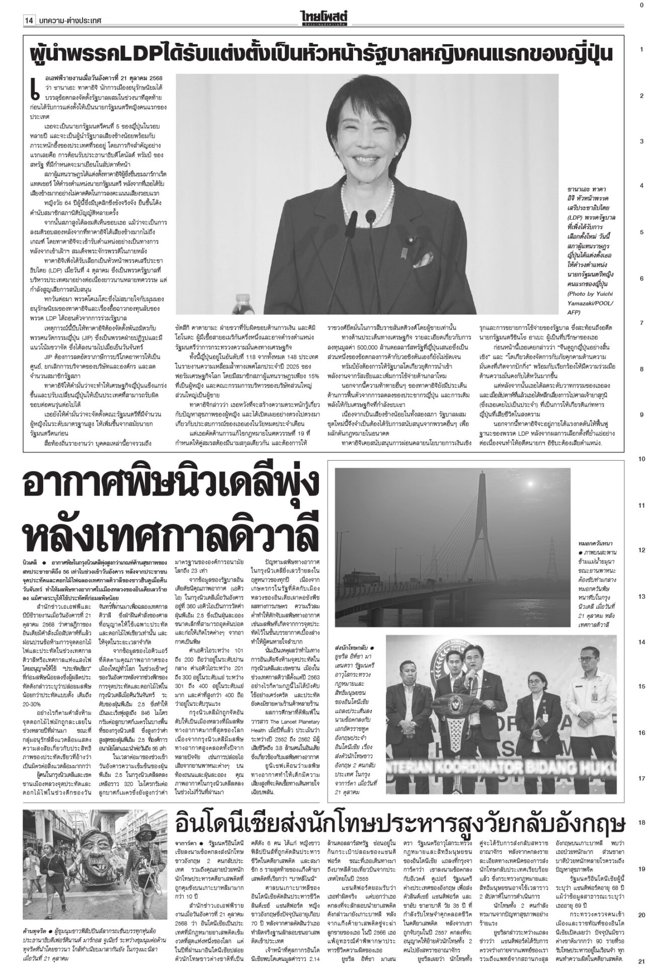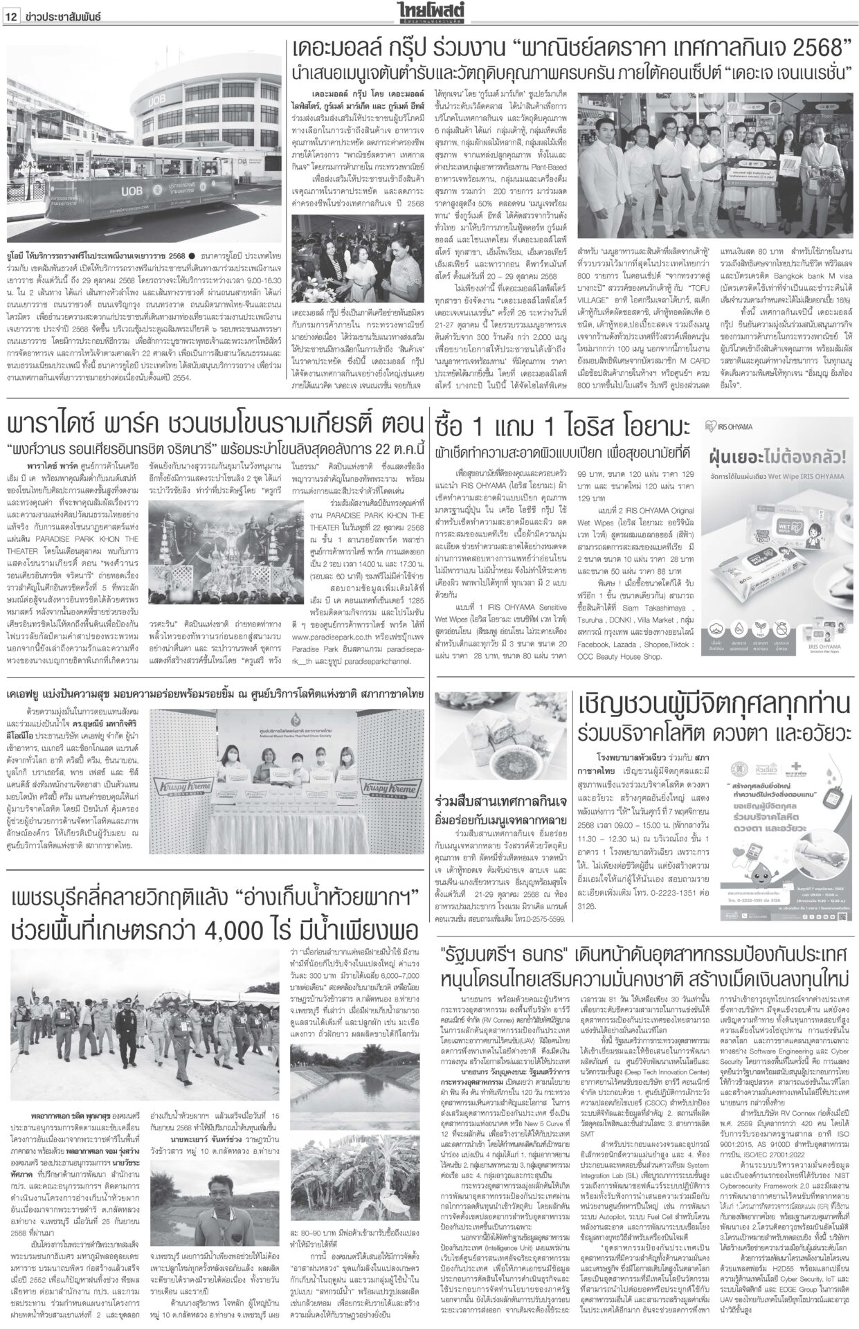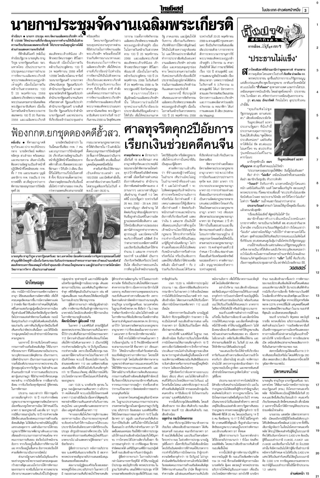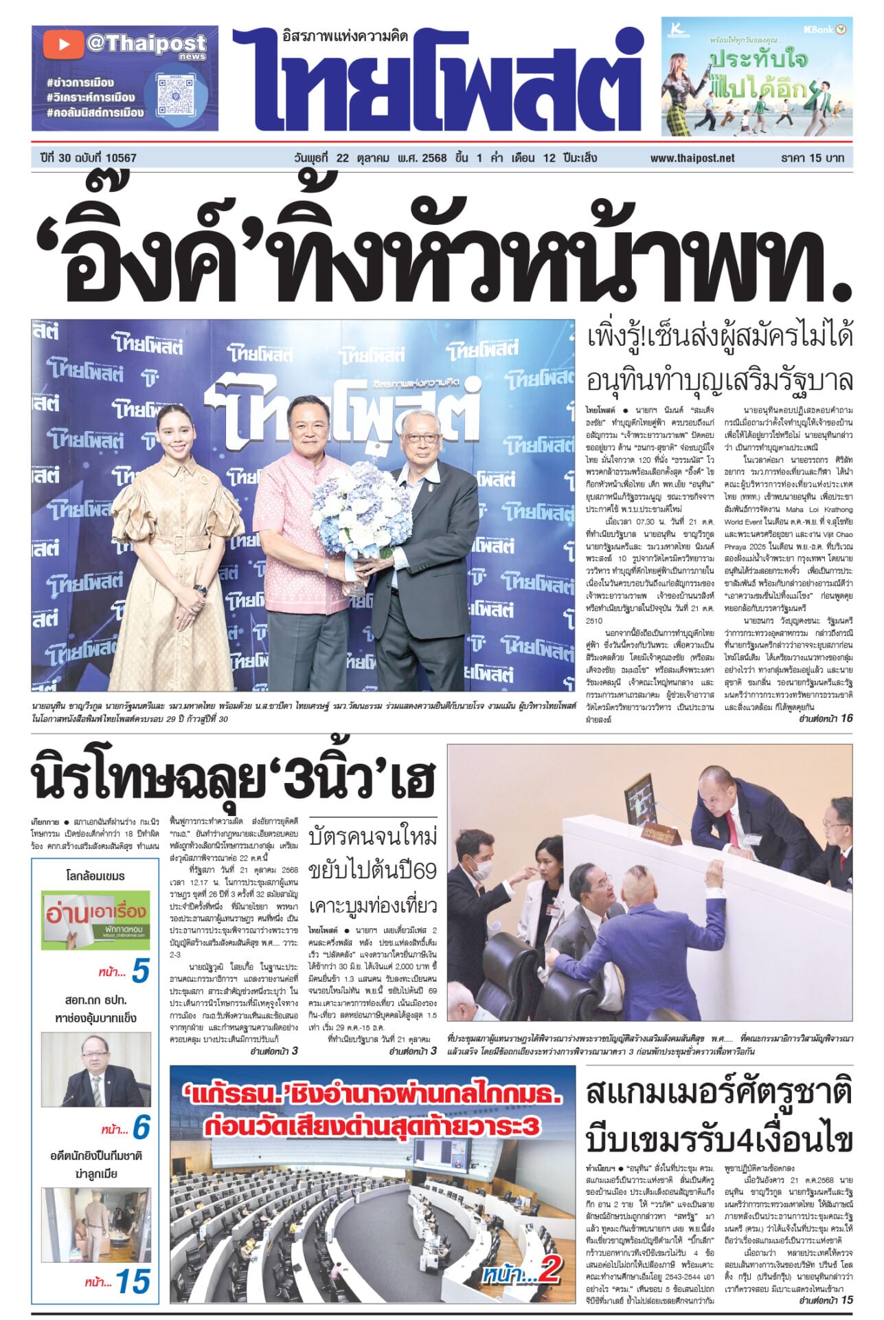 หนังสือพิมพ์ ฉบับวันที่ 22 ตุลาคม 2568ข่าวหน้าหนึ่ง‘อิ๊งค์’ทิ้งหัวหน้าพท. เพิ่งรู้!เซ็นส่งผู้สมัครไม่ได้ อนุทินทำบุญเสริมรัฐบาลนายกฯ นิมนต์ “สมเด็จธงชัย” ทำบุญตึกไทยคู่ฟ้า ครบรอบถึงแก่อสัญกรรม นิรโทษฉลุย‘3นิ้ว’เฮสภาเอกฉันท์ผ่านร่าง กม.นิรโทษกรรม เปิดช่องเด็กต่ำกว่า 18 ปีทำผิด ร้อง คกก.สร้างเสริมสังคมสันติสุข สแกมเมอร์ศัตรูชาติ บีบเขมรรับ4เงื่อนไข“อนุทิน” สั่งในที่ประชุม ครม. สแกมเมอร์เป็นวาระแห่งชาติ ลั่นเป็นศัตรูของบ้านเมือง ประเดิมเล็งถอนสัญชาติแก๊งก๊ก บัตรคนจนใหม่ ขยับไปต้นปี69 เคาะบูมท่องเที่ยวนายกฯ เผยเดี๋ยวมีเฟส 2 คนละครึ่งพลัส หลัง ปชช.แห่ลงสิทธิ์เต็มเร็ว