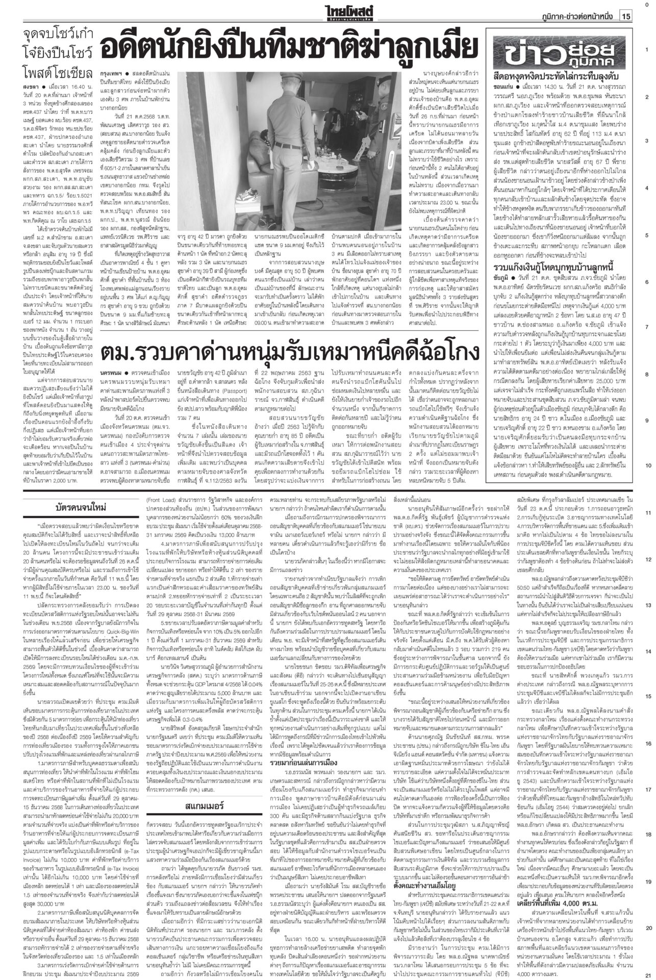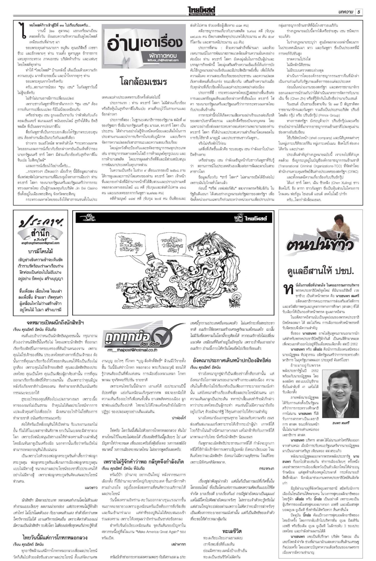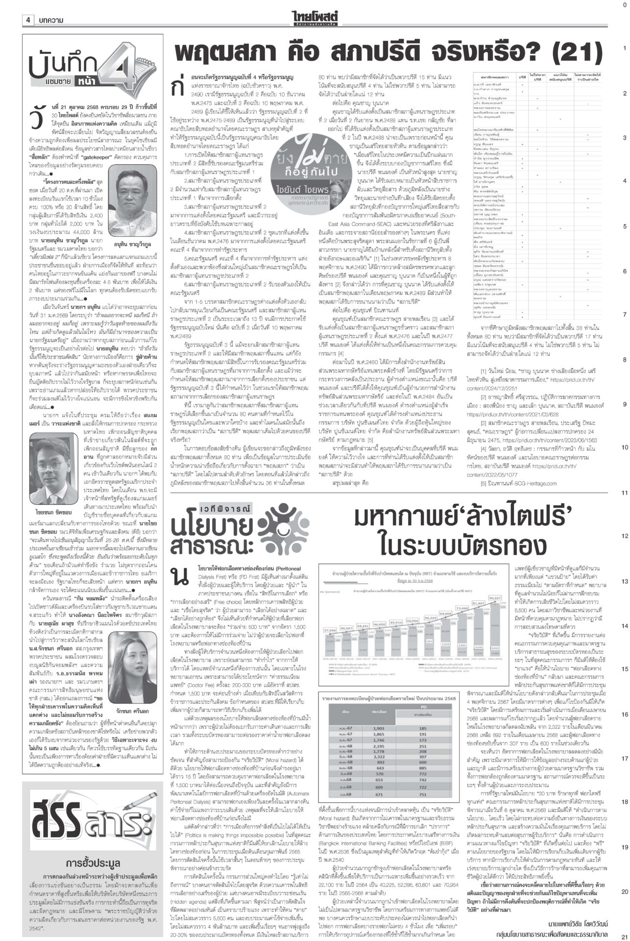 ฉบับวันที่ 22 ตุลาคม 2568 22 ตุลาคม 2568 เวลา 0:01 น. หนังสือพิมพ์ ฉบับวันที่ 22 ตุลาคม 2568ข่าวหน้าหนึ่ง‘อิ๊งค์’ทิ้งหัวหน้าพท. เพิ่งรู้!เซ็นส่งผู้สมัครไม่ได้ อนุทินทำบุญเสริมรัฐบาลนายกฯ นิมนต์ “สมเด็จธงชัย” ทำบุญตึกไทยคู่ฟ้า ครบรอบถึงแก่อสัญกรรม นิรโทษฉลุย‘3นิ้ว’เฮสภาเอกฉันท์ผ่านร่าง กม.นิรโทษกรรม เปิดช่องเด็กต่ำกว่า 18 ปีทำผิด ร้อง คกก.สร้างเสริมสังคมสันติสุข สแกมเมอร์ศัตรูชาติ บีบเขมรรับ4เงื่อนไข“อนุทิน” สั่งในที่ประชุม ครม. สแกมเมอร์เป็นวาระแห่งชาติ ลั่นเป็นศัตรูของบ้านเมือง ประเดิมเล็งถอนสัญชาติแก๊งก๊ก บัตรคนจนใหม่ ขยับไปต้นปี69 เคาะบูมท่องเที่ยวนายกฯ เผยเดี๋ยวมีเฟส 2 คนละครึ่งพลัส หลัง ปชช.แห่ลงสิทธิ์เต็มเร็ว Tagsรายวันหนังสือพิมพ์ ข่าวที่เกี่ยวข้อง ฉบับวันที่ 9 ธันวาคม 2568 ฉบับวันที่ 8 ธันวาคม 2568 ฉบับวันที่ 7 ธันวาคม 2568 ฉบับวันที่ 6 ธันวาคม 2568 ฉบับวันที่ 5 ธันวาคม 2568 ฉบับวันที่ 4 ธันวาคม 2568 NEWS UPDATE 0:01 น. ข้ามเส้นแดง“เผด็จศึกฮุน เซน” “เจ็บต้องจบ”ก่อนถูกห้ามมวย 23:52 น. แผ่นดินไหวขนาด 7.6 นอกชายฝั่งญี่ปุ่น เตือนภัยสึนามิ 21:00 น. ก.พ.ค.ตร. มีมติเอกฉันท์ ยืนไล่ออก ‘บิ๊กโจ๊ก’ กับพวก 21:00 น. 'วิปรัฐบาล' ไฟเขียวประชุมร่วมรัฐสภา ถกแก้ รธน. เพิ่มอีก 1 วัน ให้จบวาระ 2 20:36 น. ในหลวง พระราชินี ทรงบำเพ็ญพระราชกุศลอุทิศถวาย ร.6 และ ร.7