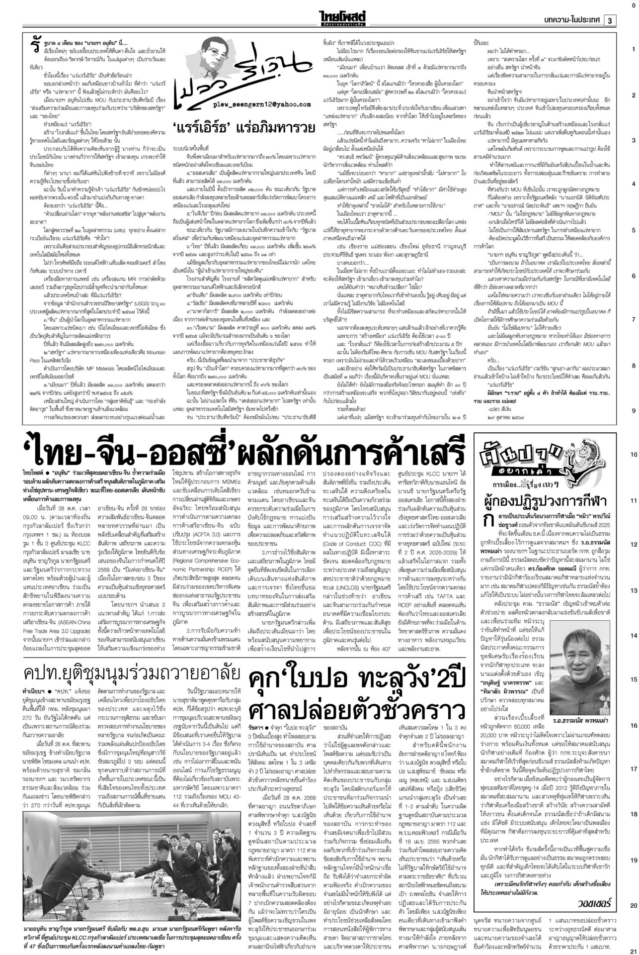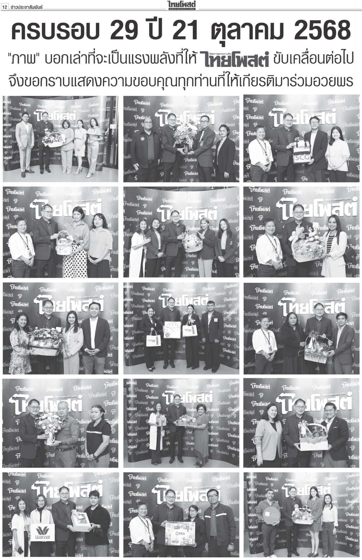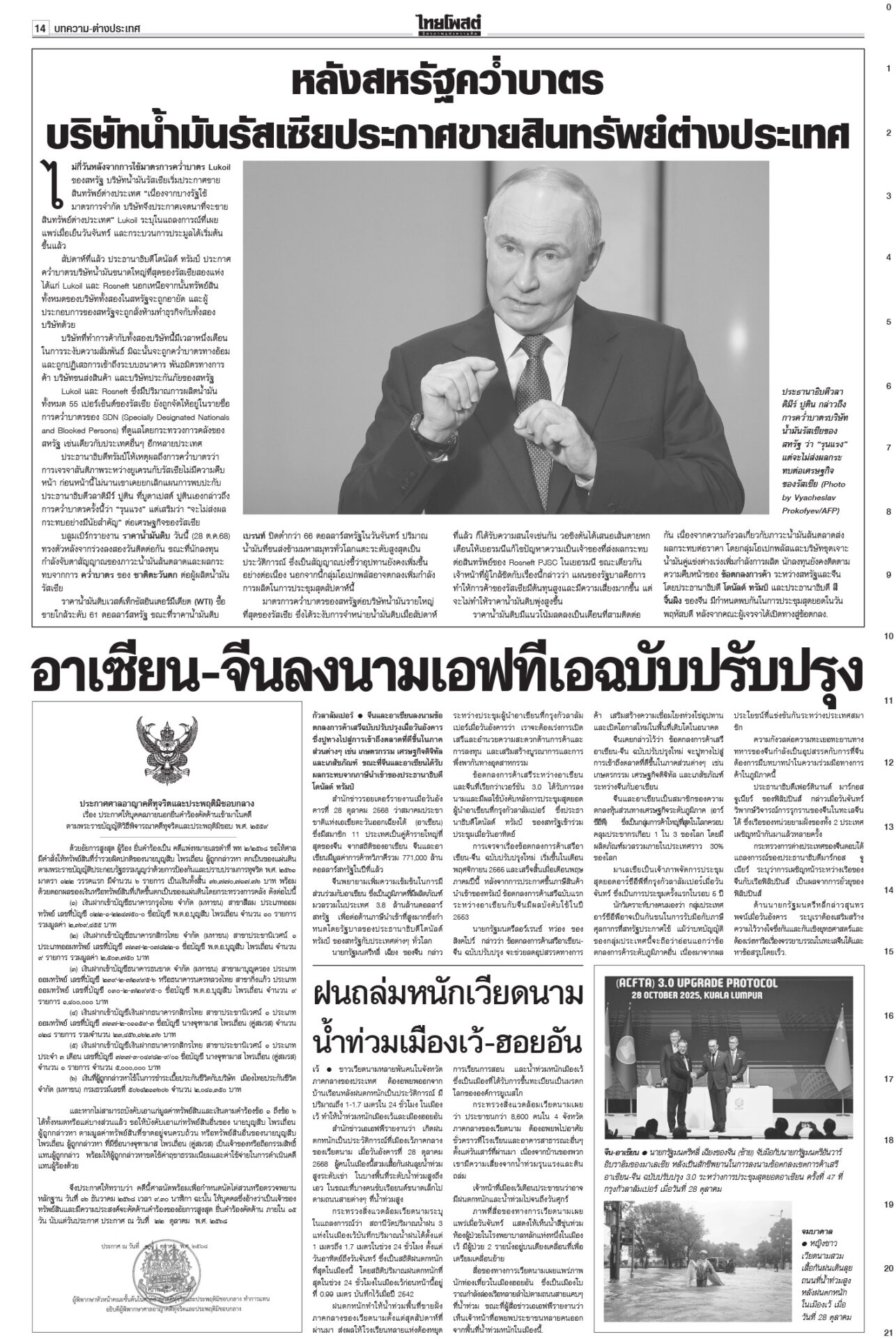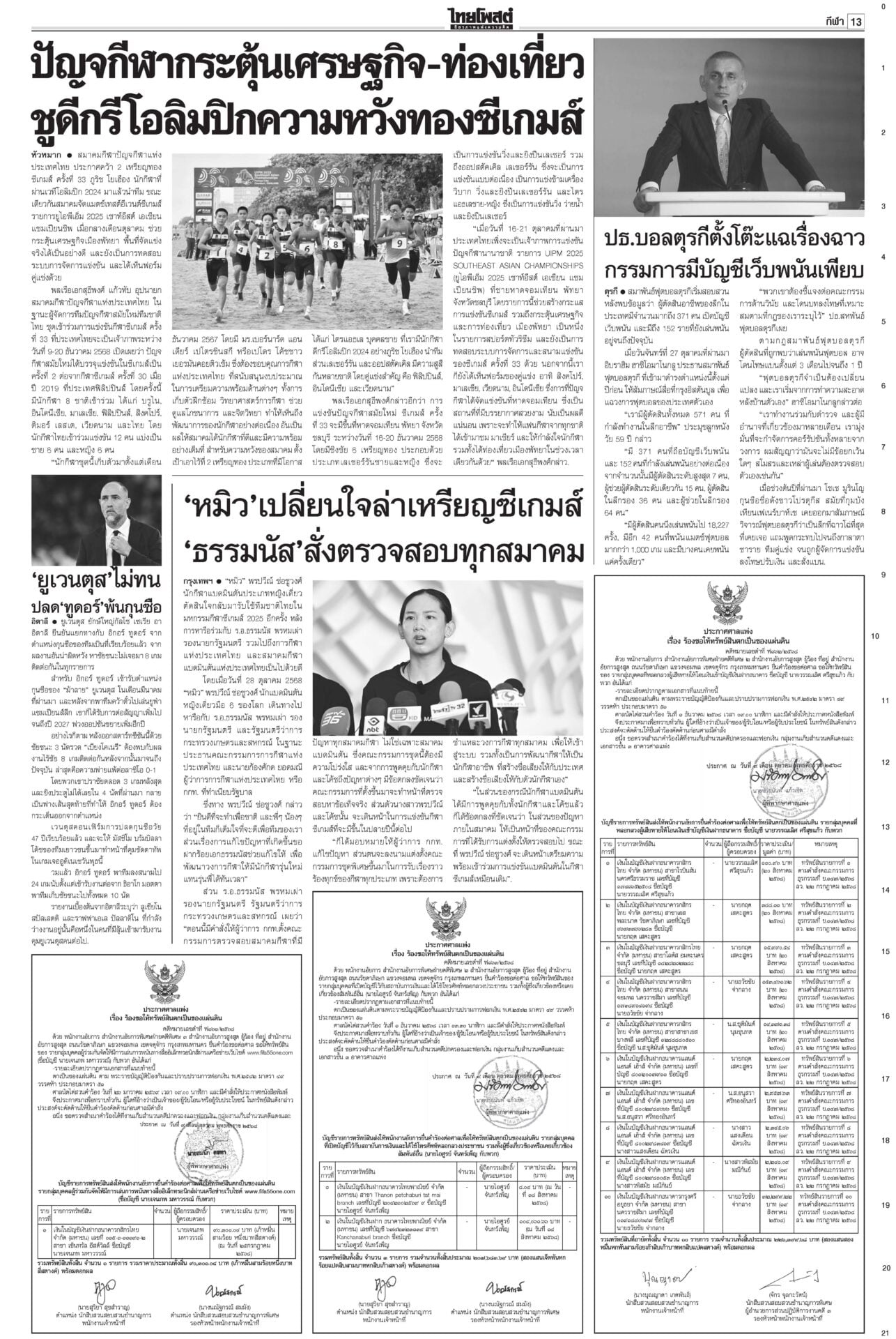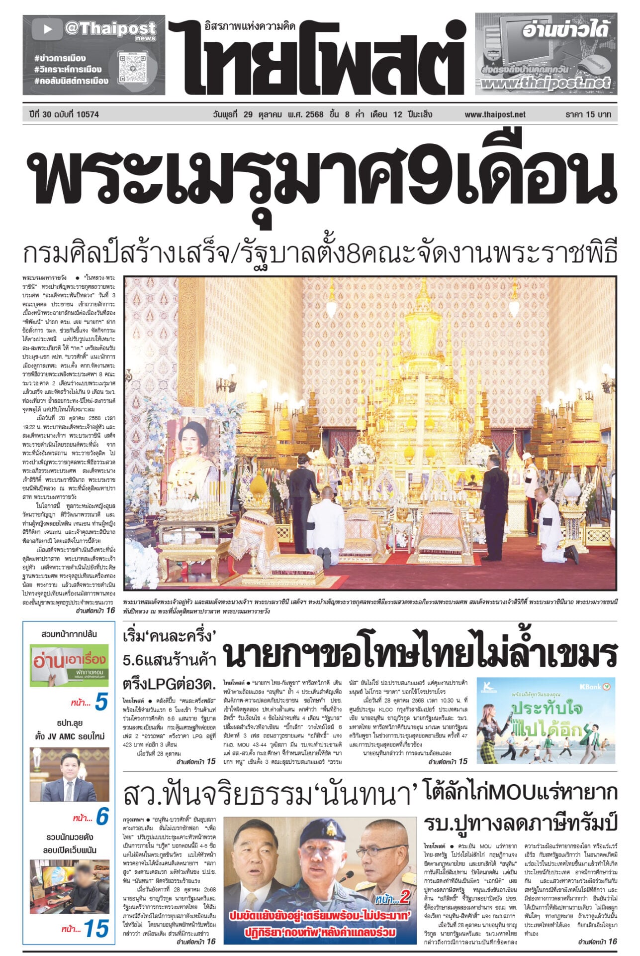 หนังสือพิมพ์ ฉบับวันที่ 29 ตุลาคม 2568ข่าวหน้าหนึ่งพระเมรุมาศ9เดือน กรมศิลป์สร้างเสร็จ/รัฐบาลตั้ง8คณะจัดงานพระราชพิธี“ในหลวง-พระราชินี” ทรงบำเพ็ญพระราชกุศลถวายพระบรมศพ “สมเด็จพระพันปีหลวง” วันที่ 3 โต้ลักไก่MOUแร่หายาก รบ.ปูทางลดภาษีทรัมป์ครม.ยัน MOU แร่หายากไทย-สหรัฐ โปร่งใสไม่ลักไก่ กฤษฎีกาแจงยึดตามกฎหมายไทย นายกฯขอโทษไทยไม่ลํ้าเขมร“นายกฯ ไทย-กัมพูชา” หารือทวิภาคี เดินหน้าตามถ้อยแถลง “ สว.ฟันจริยธรรม‘นันทนา’“อนุทิน-บวรศักดิ์” ยันยุบสภาตามกรอบเดิม ลั่นไม่เบรกซักฟอก “เพื่อไทย” เริ่ม‘คนละครึ่ง’ 5.6แสนร้านค้า ตรึงLPGต่อ3ด.คลังตีปี๊บ “คนละครึ่งพลัส” พร้อมใช้จ่ายวันแรก 6 โมงเช้า ร้านค้าแห่ร่วมโครงการคึกคัก 5.6 แสนราย รัฐบาลชวนลงทะเบียนเพิ่ม