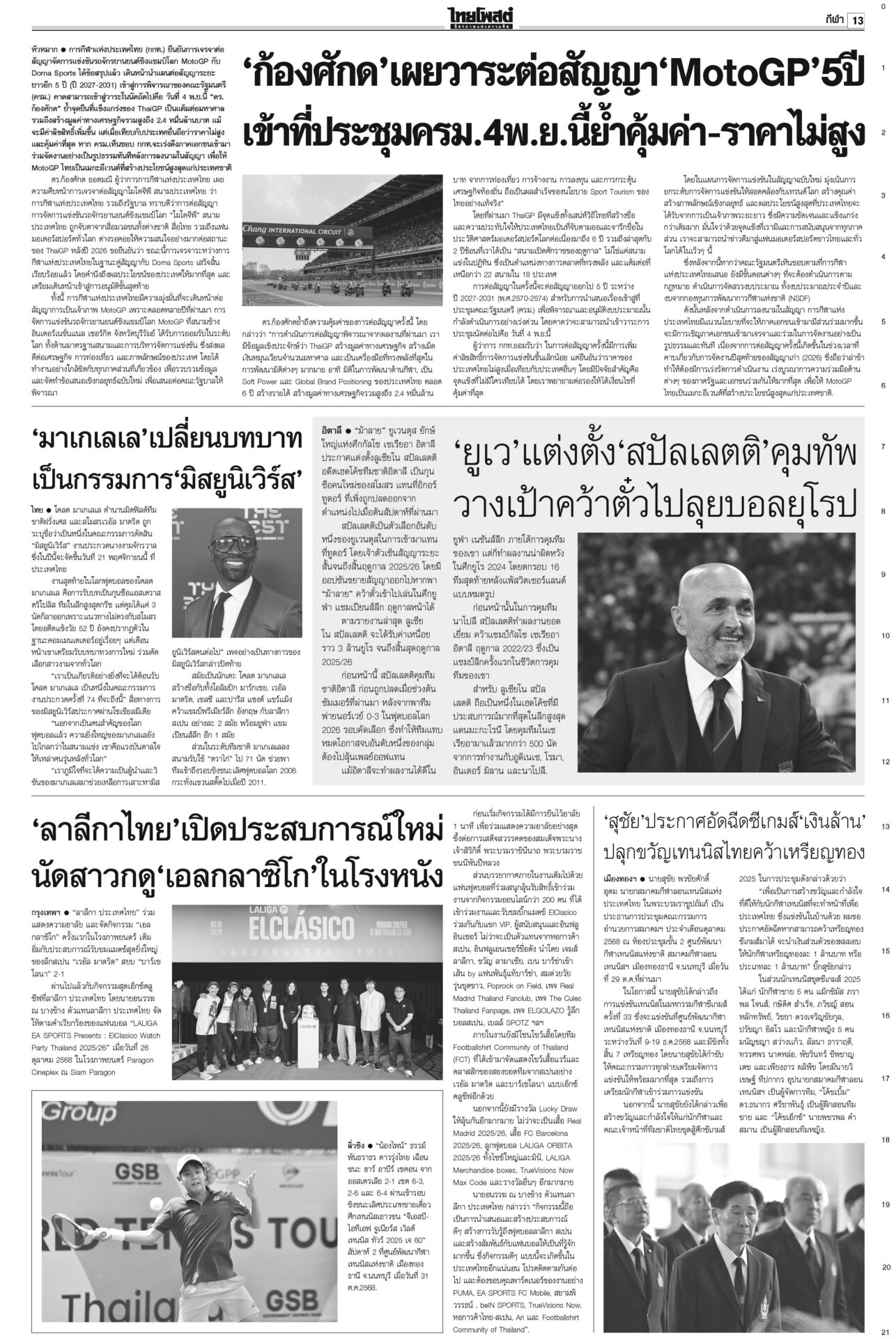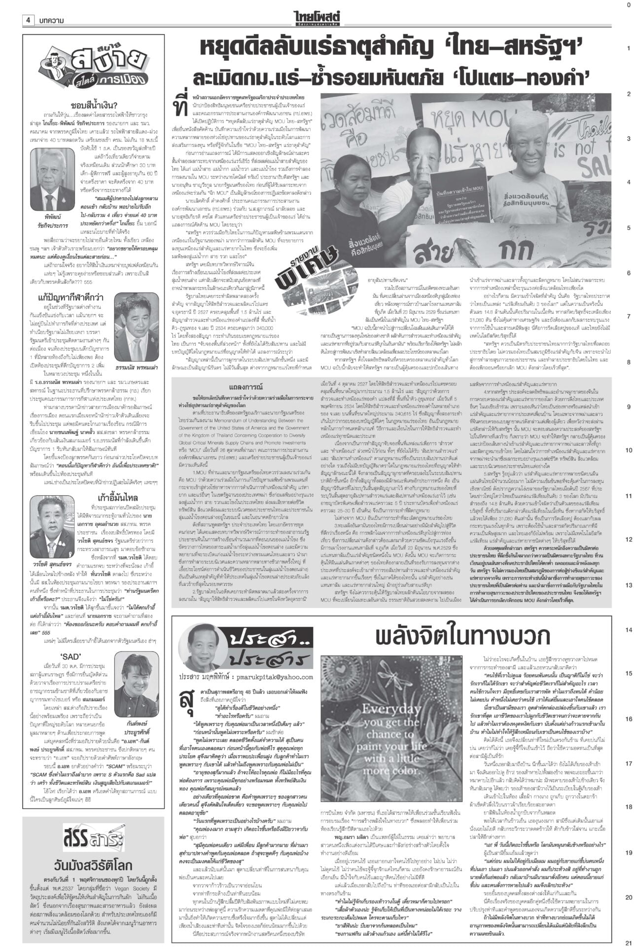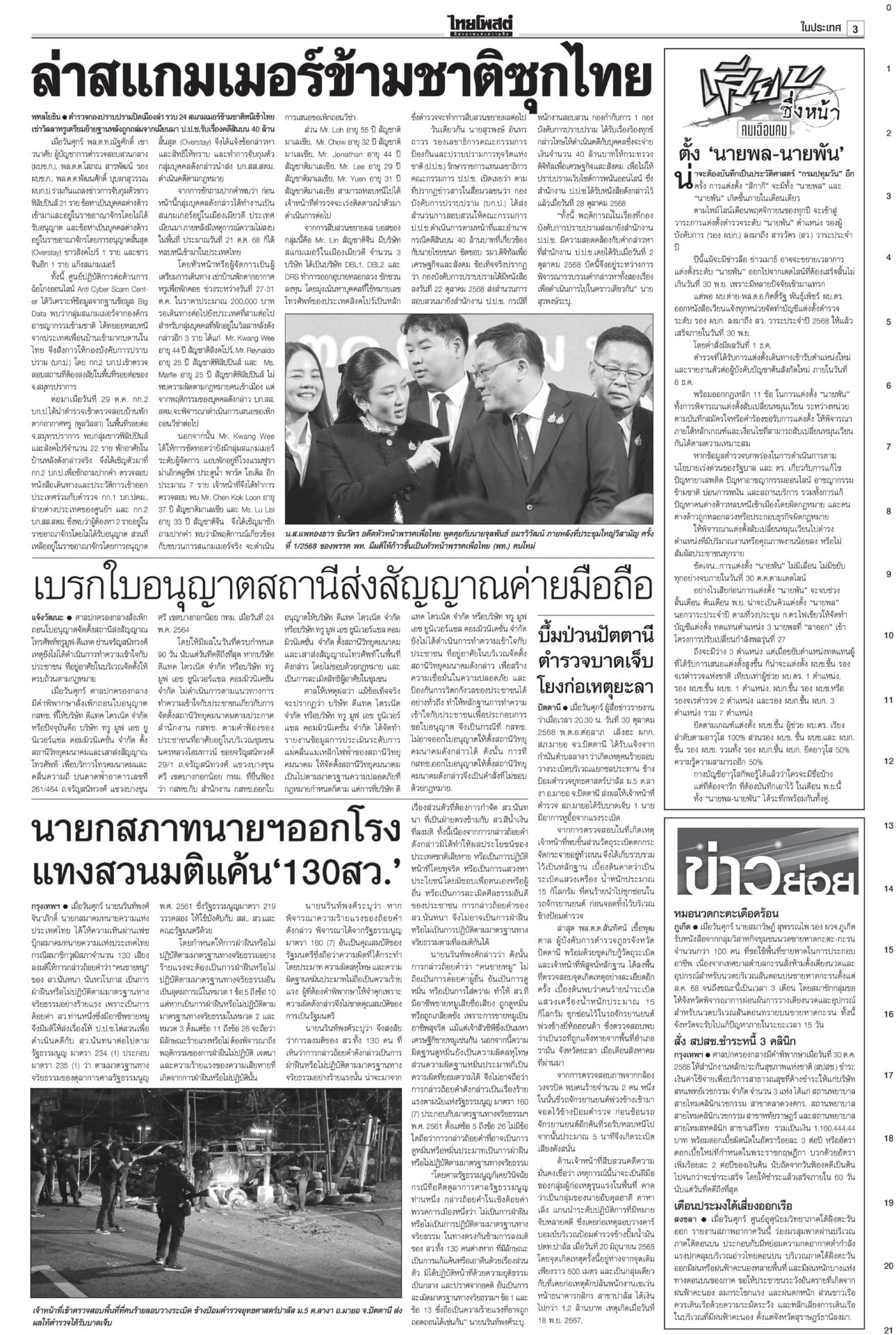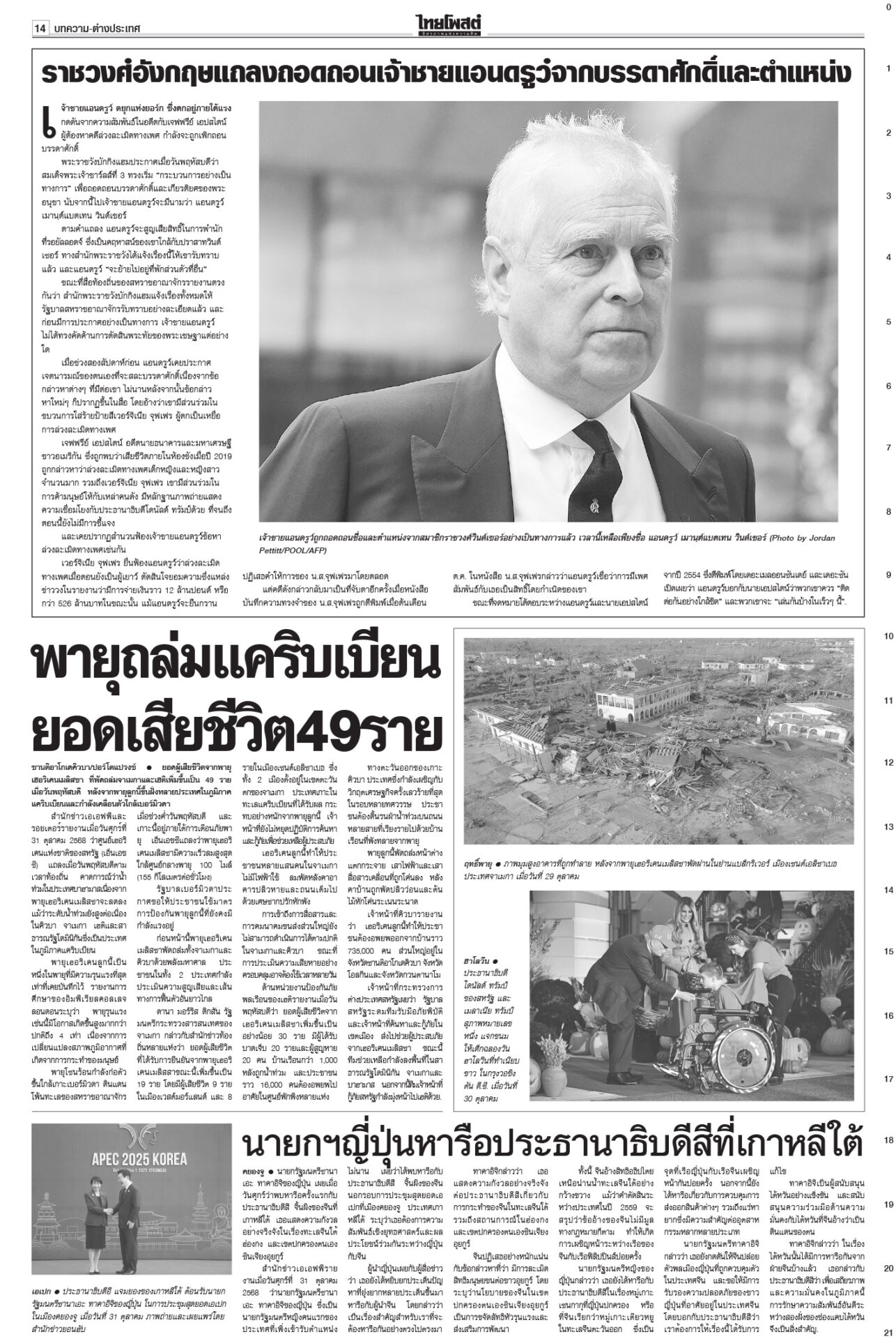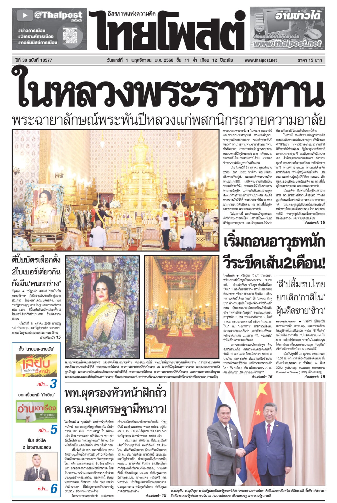 หนังสือพิมพ์ ฉบับวันที่ 1 พฤศจิกายน 2568ข่าวหน้าหนึ่งในหลวงพระราชทาน พระฉายาลักษณ์พระพันปีหลวงแก่พสกนิกรถวายความอาลัยในหลวง-พระราชินี และพระบรมวงศานุวงศ์ ทรงบำเพ็ญพระราชกุศลสัตตมวารถวาย “สมเด็จพระพันปีหลวง” ตีปี๊บบัตรเลือกตั้ง 2ใบเบอร์เดียวกัน ยังมึน‘คนยกร่าง’“ณัฐวุฒิ” เผยแก้ รธน.ในชั้นกรรมาธิการฯ ยังมีความเห็นขัดแย้งอยู่หลายประการ พท.ผุดรองหัวหน้าฝักถั่ว ครม.ยุคเศรษฐามีหนาว!“จุลพันธ์” นั่งหัวหน้าเพื่อไทยคนใหม่ บอกตระกูลชินผูกพันทางใจ ‘สี’ปลื้มรบ.ไทย ยกเลิก‘กาสิโน’ ลุนดีลขาย‘ขาว’นายกฯ ชูไทยเป็นสะพานการค้า การลงทุน และความเชื่อมโยงภูมิภาคในเวทีเอเปก