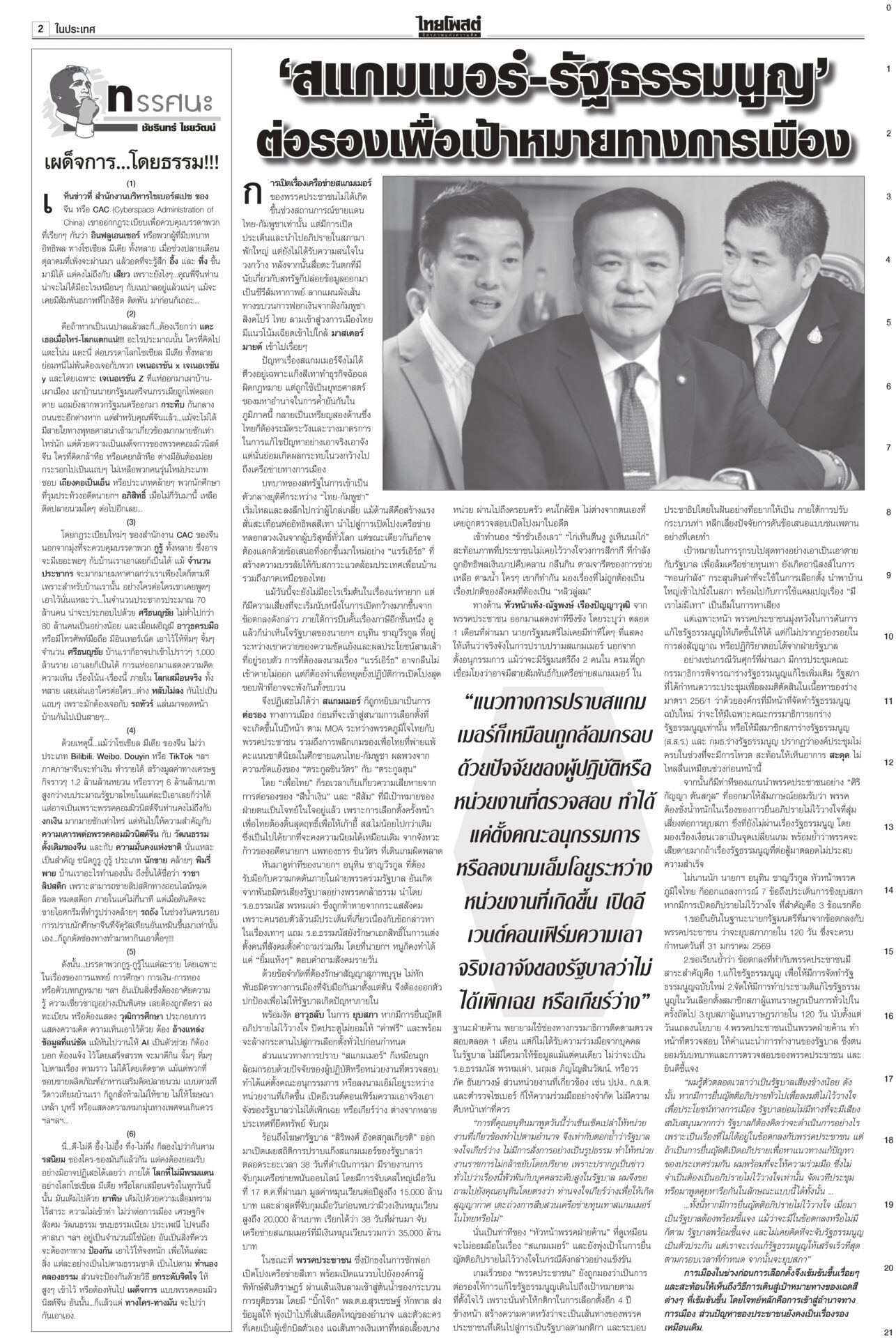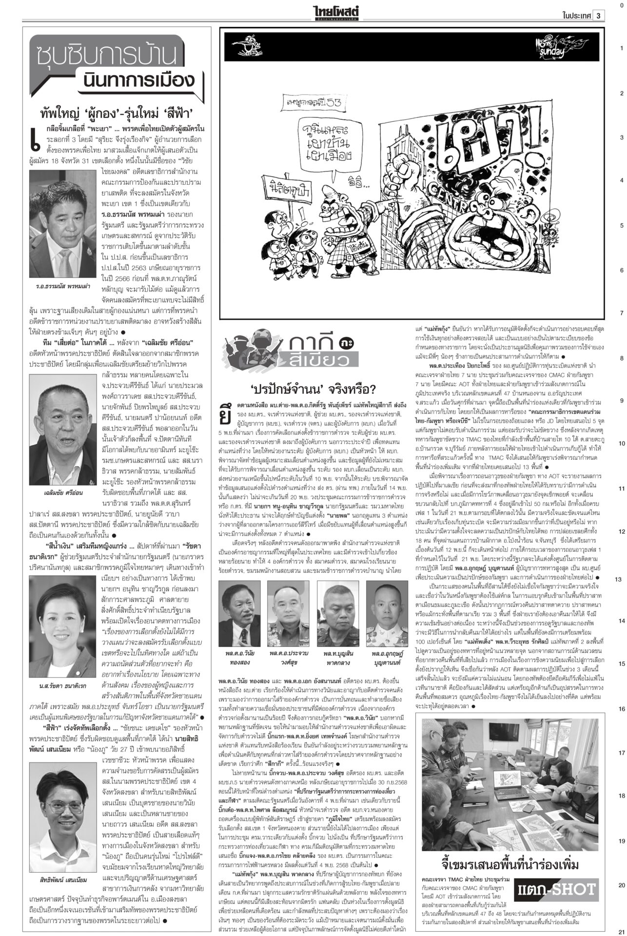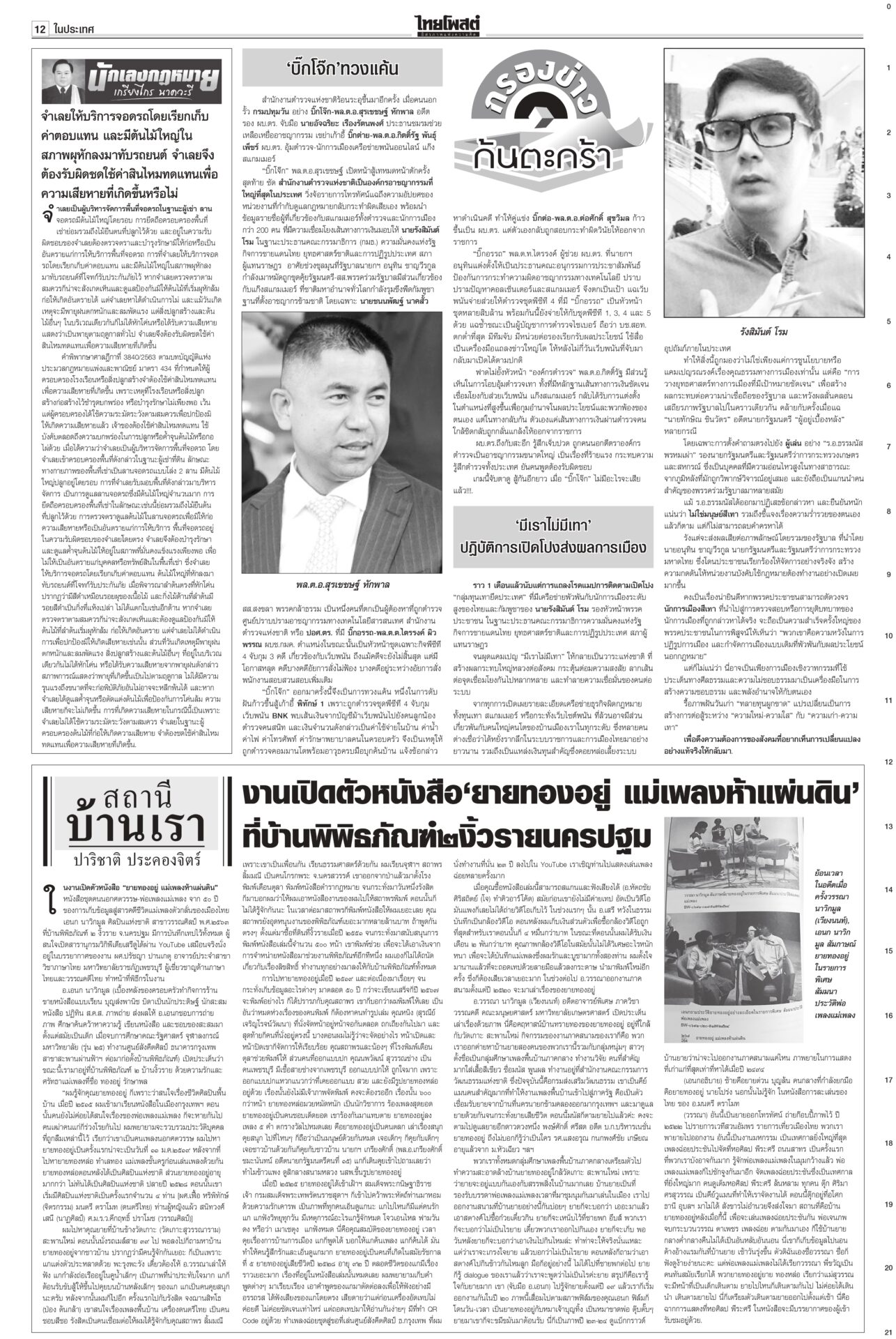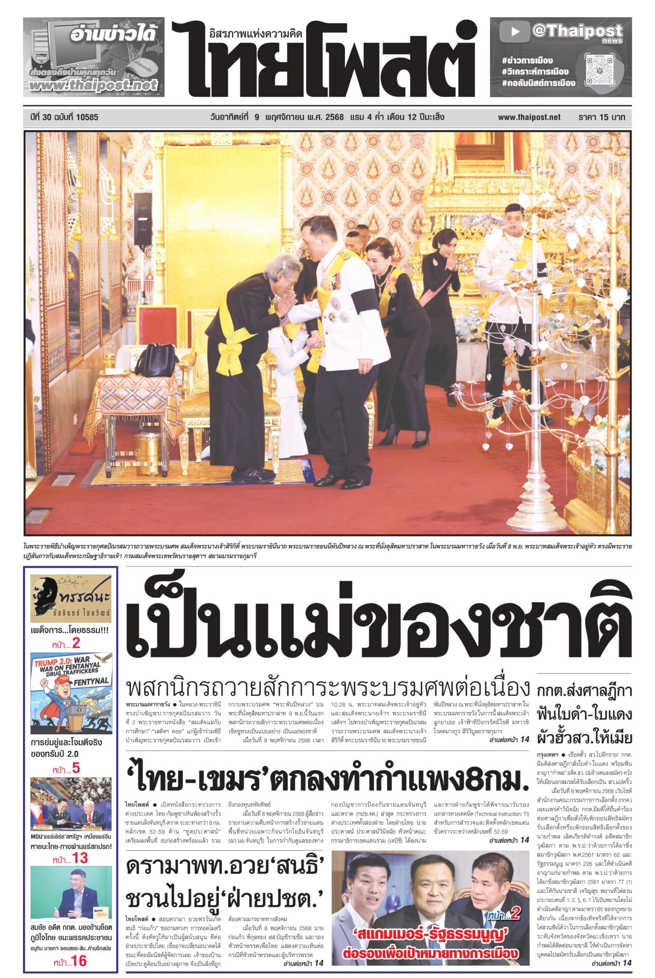 หนังสือพิมพ์ฉบับวันที่ 9 พฤศจิกายน 2568 ข่าวหน้าหนึ่งเป็นแม่ของชาติ พสกนิกรถวายสักการะพระบรมศพต่อเนื่องในหลวง-พระราชินี ทรงบำเพ็ญพระราชกุศลปัณรสมวาร วันที่ 2 พระราชทานหนังสือ “สมเด็จแม่กับการศึกษา”-“เสด็จฯ ดอย” แก่ผู้เข้าร่วมพิธีทรงบำเพ็ญพระราชกุศลปัณรสมวาร เปิดเข้ากราบพระบรมศพ “พระ กกต.ส่งศาลฎีกา ฟันใบดำ -ใบแดง ผัวฮั้วสว.ให้เมียเชือดฮั้ว สว.ไปอีกราย! กกต.มีมติส่งศาลฎีกาสั่งใบดำ-ใบแดง พร้อมฟันอาญา “กำพล” อดีต สว. ปมจ้างคนลงสมัคร หวังให้เมียนอกสมรสได้รับเลือกเป็น สว.แปดริ้ว ‘ไทย-เขมร’ตกลงทำกำแพง8กม.เปิดหนังสือกระทรวงการต่างประเทศ ไทย-กัมพูชาเห็นพ้องสร้างรั้วชายแดนฝั่งจันทบุรี-ตราด ระยะทางกว่า 8 กม. หลักเขต 52-59 ด้าน “ทูตประศาสน์” เตรียมลงพื้นที่ งบก่อสร้างพร้อมแล้ว ดรามาพท.อวย‘สนธิ’ ชวนไปอยู่‘ฝ่ายปชต.’สยบดรามา อวยพรวันเกิดสนธิ “ก่อแก้ว” ขอถามตรงๆ การทอดไมตรีครั้งนี้ ดึงศัตรูให้มาเป็นผู้สนับสนุน ดีต่อฝ่ายประชาธิปไตย เชื่ออาจเปลี่ยนอนาคตได้ ขณะที่คอลัมนิสต์ผู้จัดการเผย
