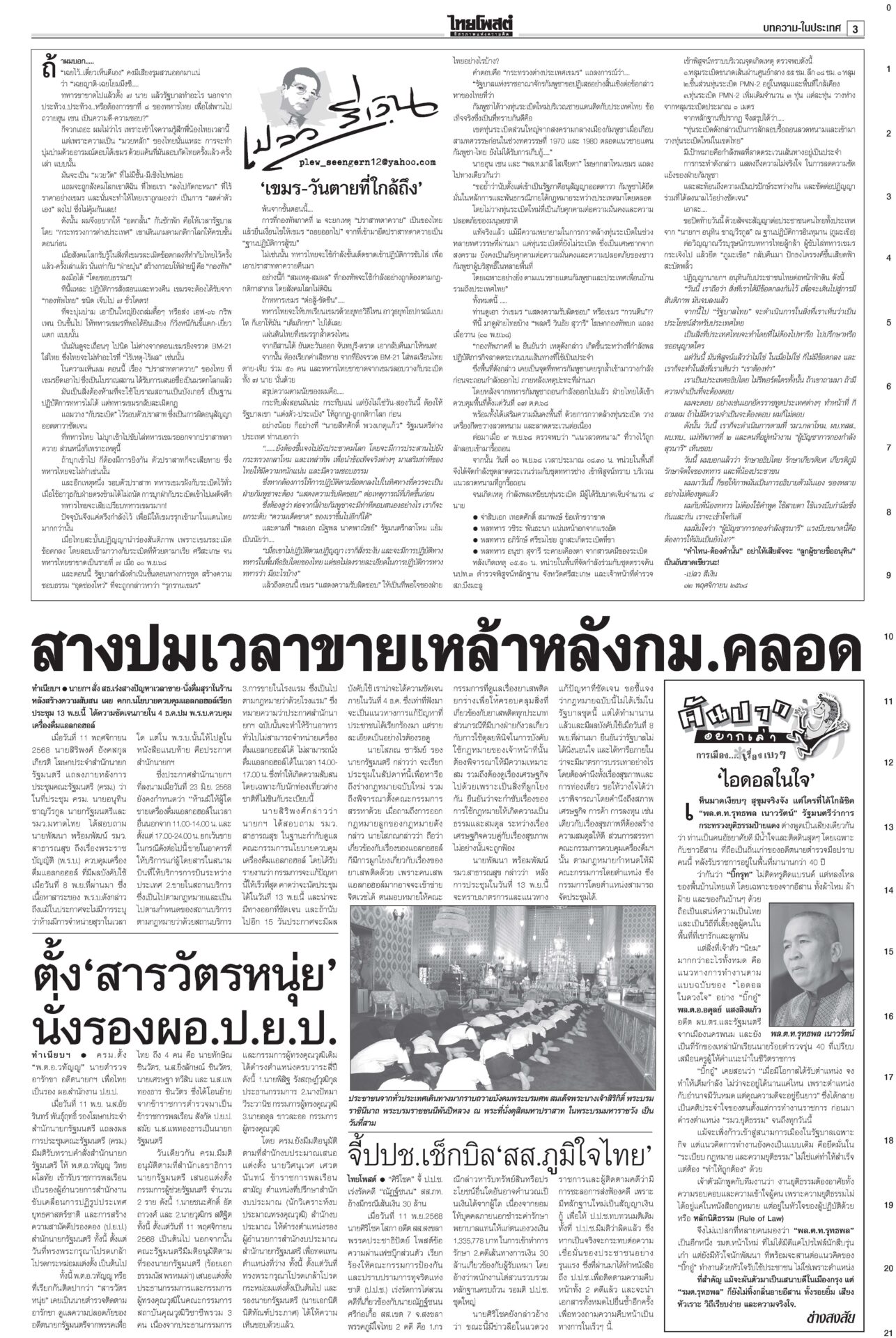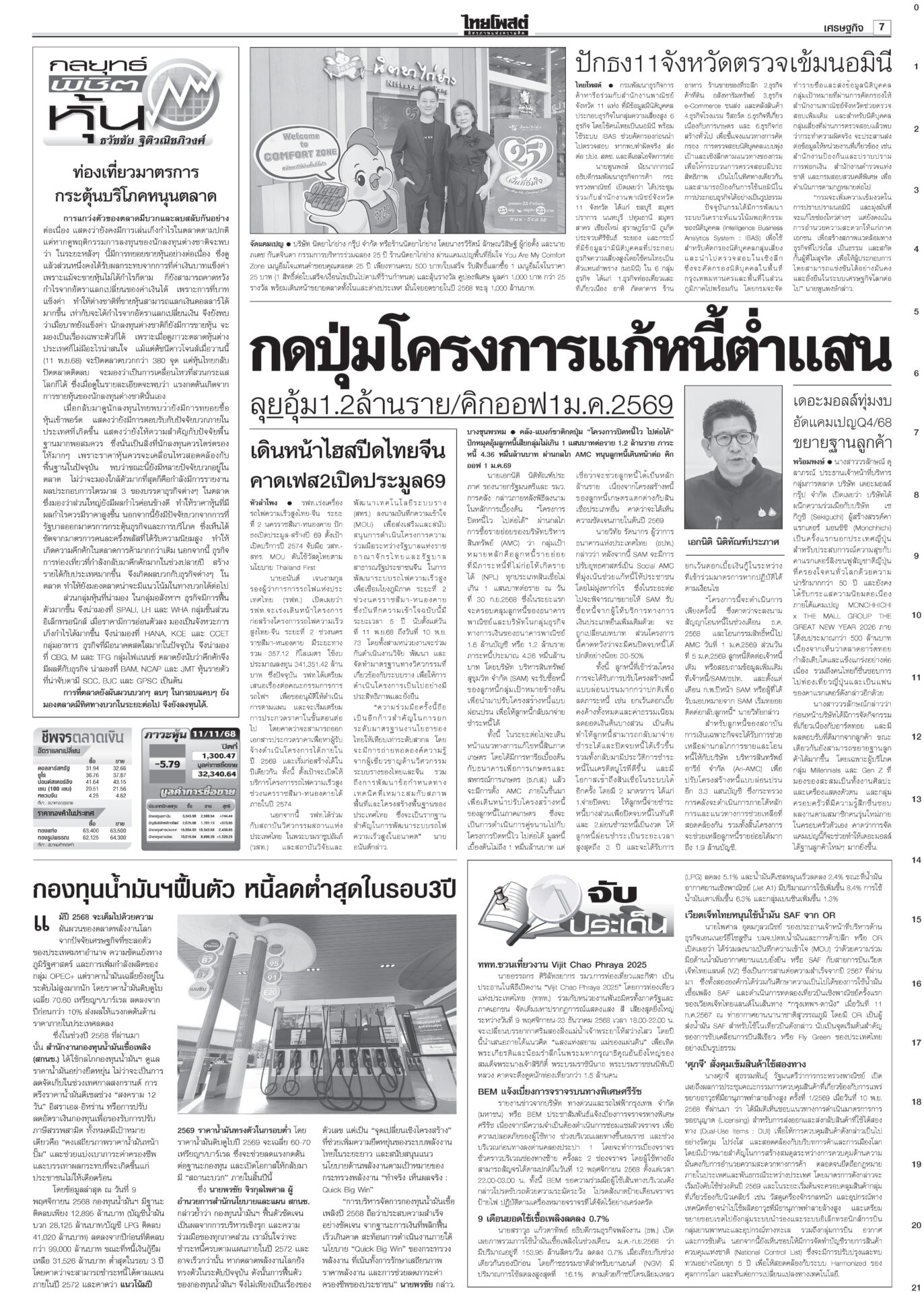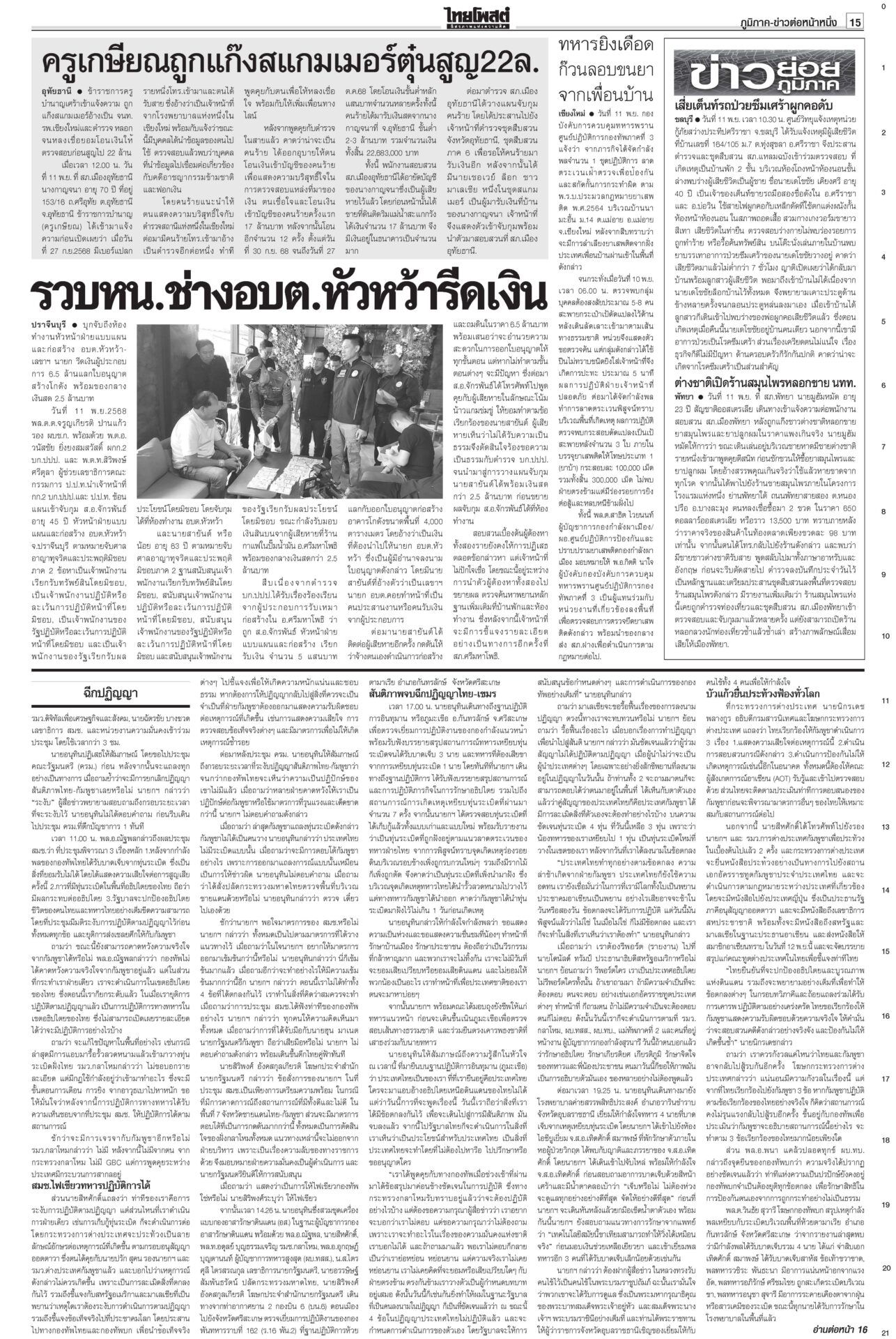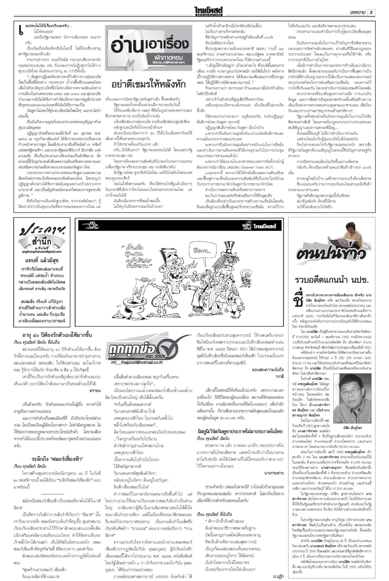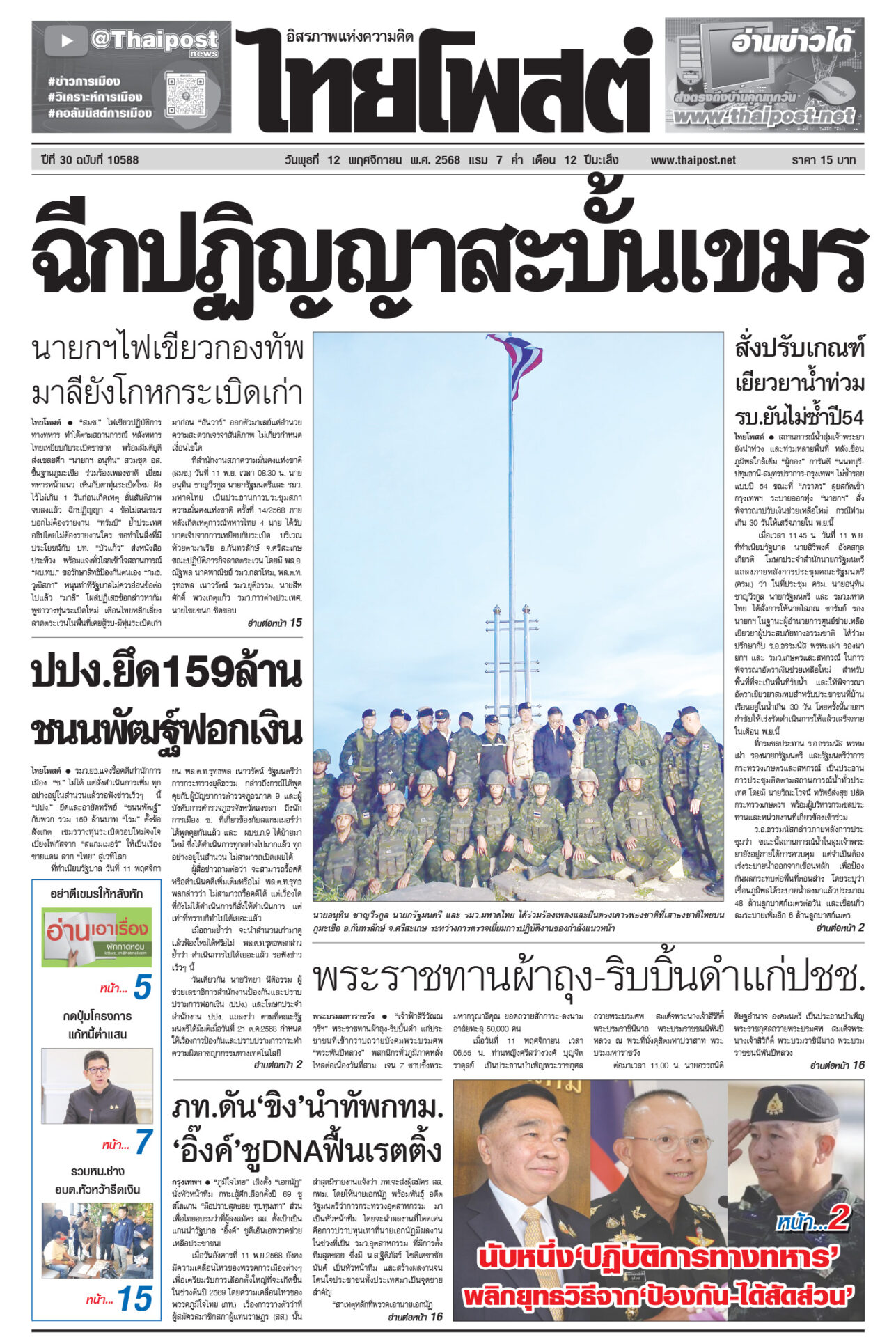 หนังสือพิมพ์ ฉบับวันที่ 12 พฤศจิกายน 2568ข่าวหน้าหนึ่งฉีกปฏิญญาสะบั้นเขมร นายกฯไฟเขียวกองทัพ มาลียังโกหกระเบิดเก่า“สมช.” ไฟเขียวปฏิบัติการทางทหาร ทำได้ตามสถานการณ์ หลังทหารไทยเหยียบกับระเบิดขาขาด พร้อมมีมติยุติส่งเชลยศึก ปปง.ยึด159ล้าน ชนนพัฒฐ์ฟอกเงินรมว.ยธ.แจงรื้อคดีเก่านักการเมือง “ช.” ไม่ได้ แต่สั่งดำเนินการเพิ่ม พระราชทานผ้าถุง-ริบบิ้นดำแก่ปชช.“เจ้าฟ้าสิริวัณณวรีฯ” พระราชทานผ้าถุง-ริบบิ้นดำ แก่ประชาชนที่เข้ากราบถวายบังคมพระบรมศพ “พระพันปีหลวง” ภท.ดัน‘ขิง’นำทัพกทม. ‘อิ๊งค์’ชูDNAฟื้นเรตติ้ง“ภูมิใจไทย” เล็งตั้ง “เอกนัฏ” นั่งหัวหน้าทีม กทม.สู้ศึกเลือกตั้งปี 69 ชูสโลแกน สั่งปรับเกณฑ์ เยียวยานํ้าท่วม รบ.ยันไม่ซ้ำปี54สถานการณ์น้ำลุ่มเจ้าพระยายังน่าห่วง และท่วมหลายพื้นที่