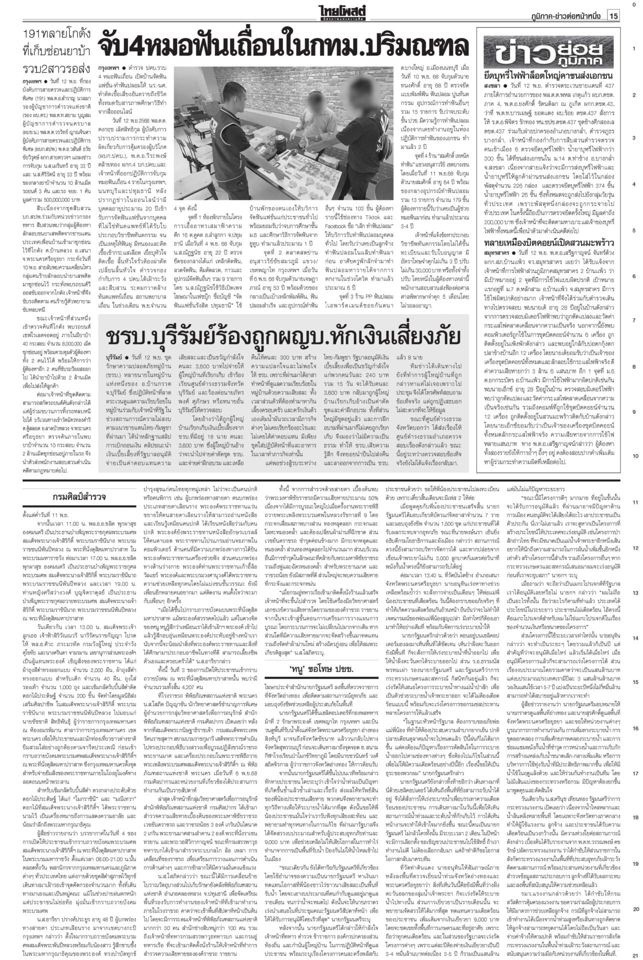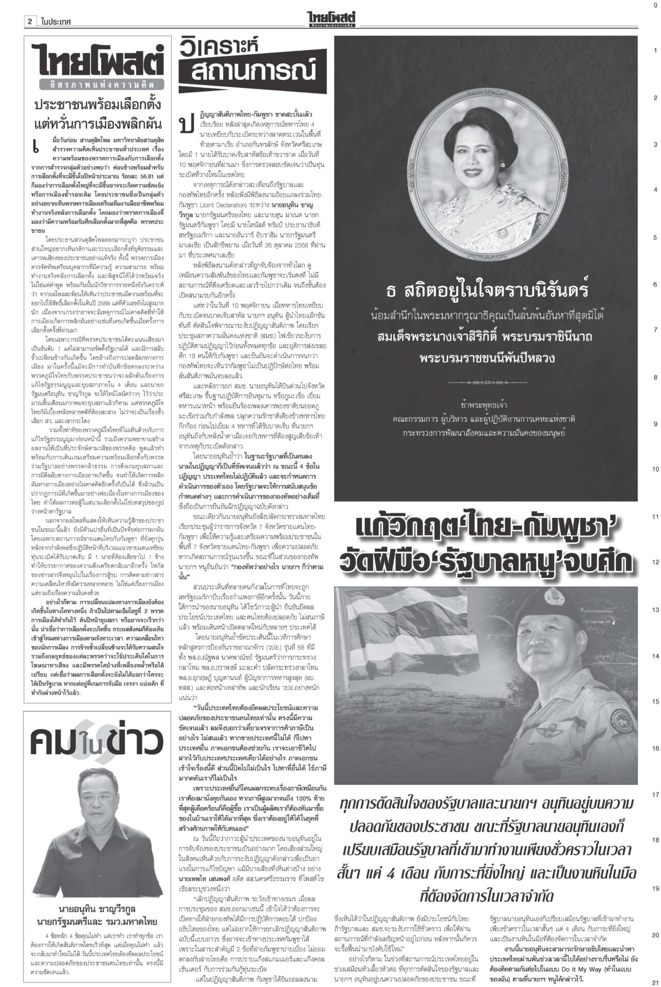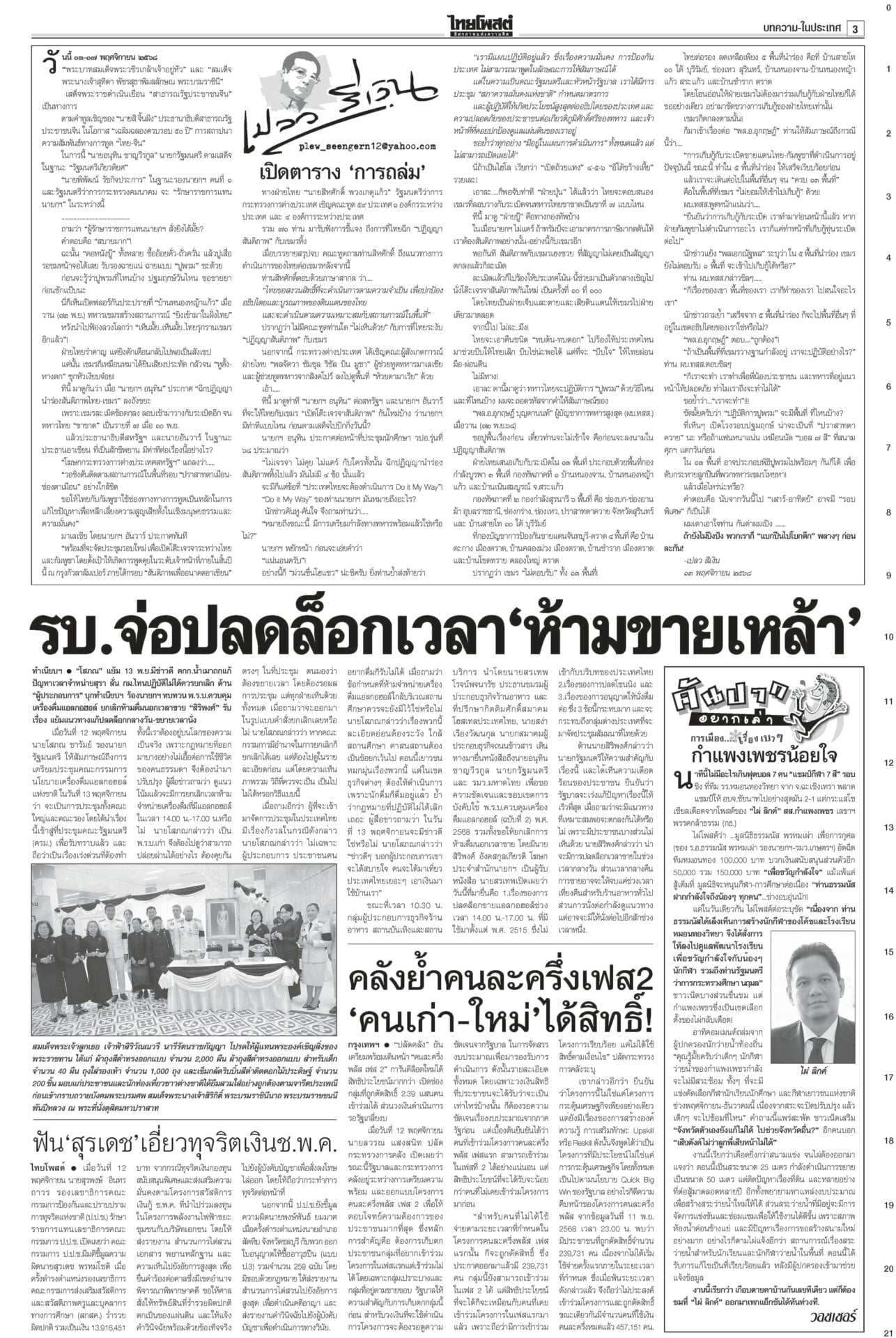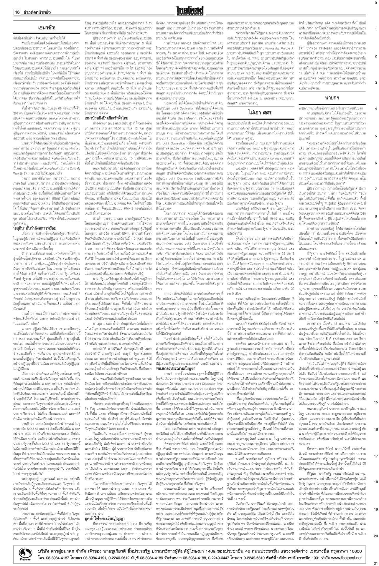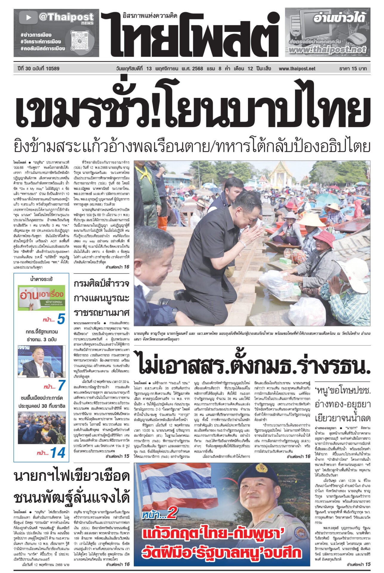 หนังสือพิมพ์ ฉบับวันที่ 13 พฤศจิกายน 2568ข่าวหน้าหนึ่งเขมรชั่ว!โยนบาปไทย ยิงข้ามสระแก้วอ้างพลเรือนตาย/ทหารโต้กลับป้องอธิปไตย“อนุทิน” ประกาศกลางเวที วปอ.68 “กัมพูชา” หมดโอกาสกลับโต๊ะเจรจา กร้าวเมินกระทบภาษีทรัมป์หลังฉีกปฏิญญาสันติภาพ ไม่เอาสสร.ตั้งกมธ.ร่างรธน.มติข้างมาก “กมธ.แก้ รธน.” ไม่เอา ส.ส.ร. เคาะตั้ง 35 อรหันต์ยกร่างรัฐธรรมนูญ-กก.ฟังความเห็น ให้รัฐสภาคัดเลือก ‘หนู’ขอโทษปชช. อ่างทอง-อยุธยา เยียวยาจนน้ำลด“นายกฯ” ติดตามน้ำท่วม ลุยหน้างานพื้นที่รับน้ำภาคกลาง อยุธยา-สุพรรณบุรี กรมศิลป์สำรวจ กางแผนบูรณะ ราชรถยานมาศกรมสมเด็จพระเทพฯ ทรงบำเพ็ญพระราชกุศลถวาย “พระพันปีหลวง” ปชช.ยืมผ้าถุงพระราชทานเข้ากราบพระบรมศพวันที่ 4 นายกฯไฟเขียวเชือด ชนนพัฒฐ์ลั่นแจงได้“อนุทิน” ไฟเขียวเชือด นักการเมืองเทา ลั่นดำเนินการเด็ดขาด