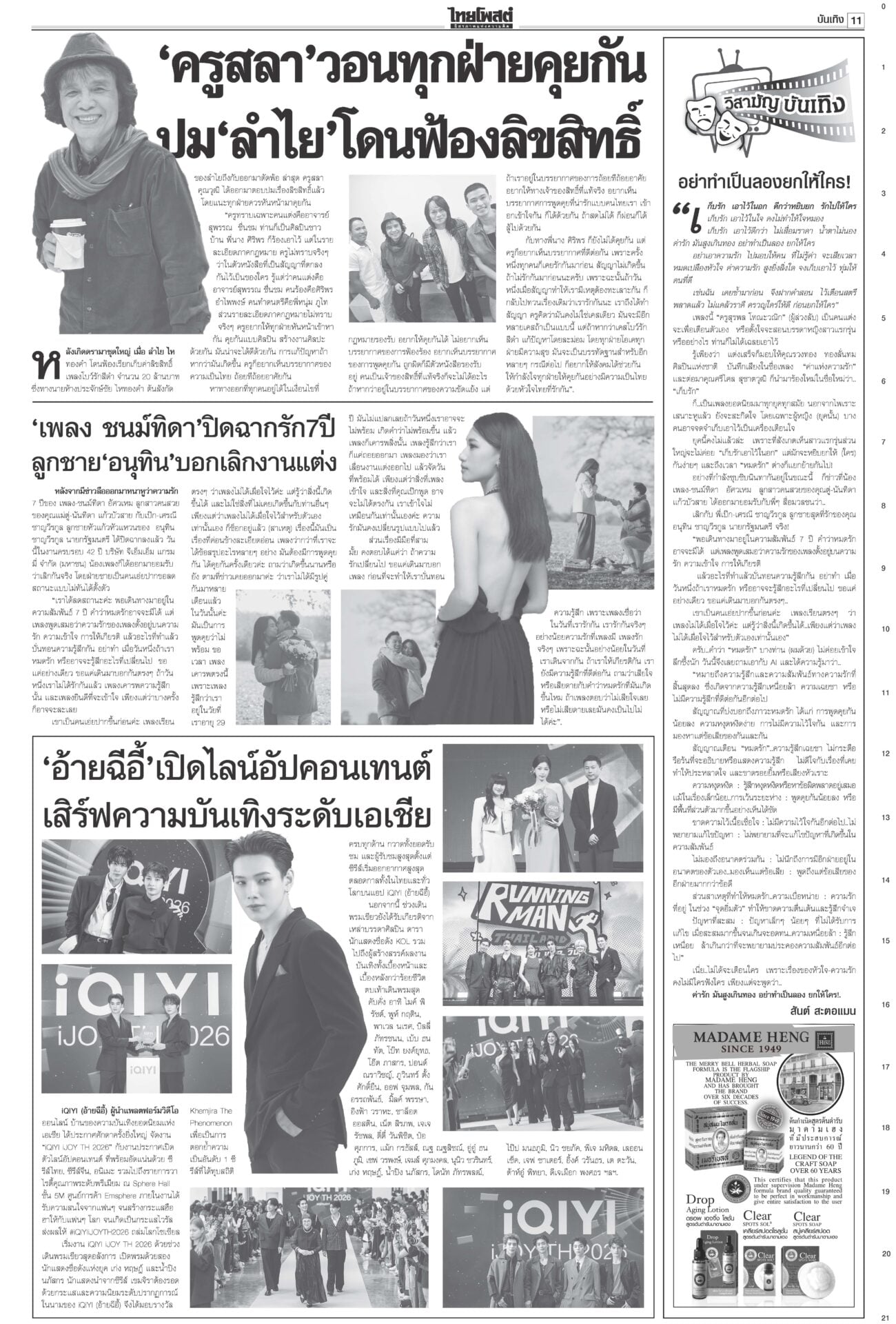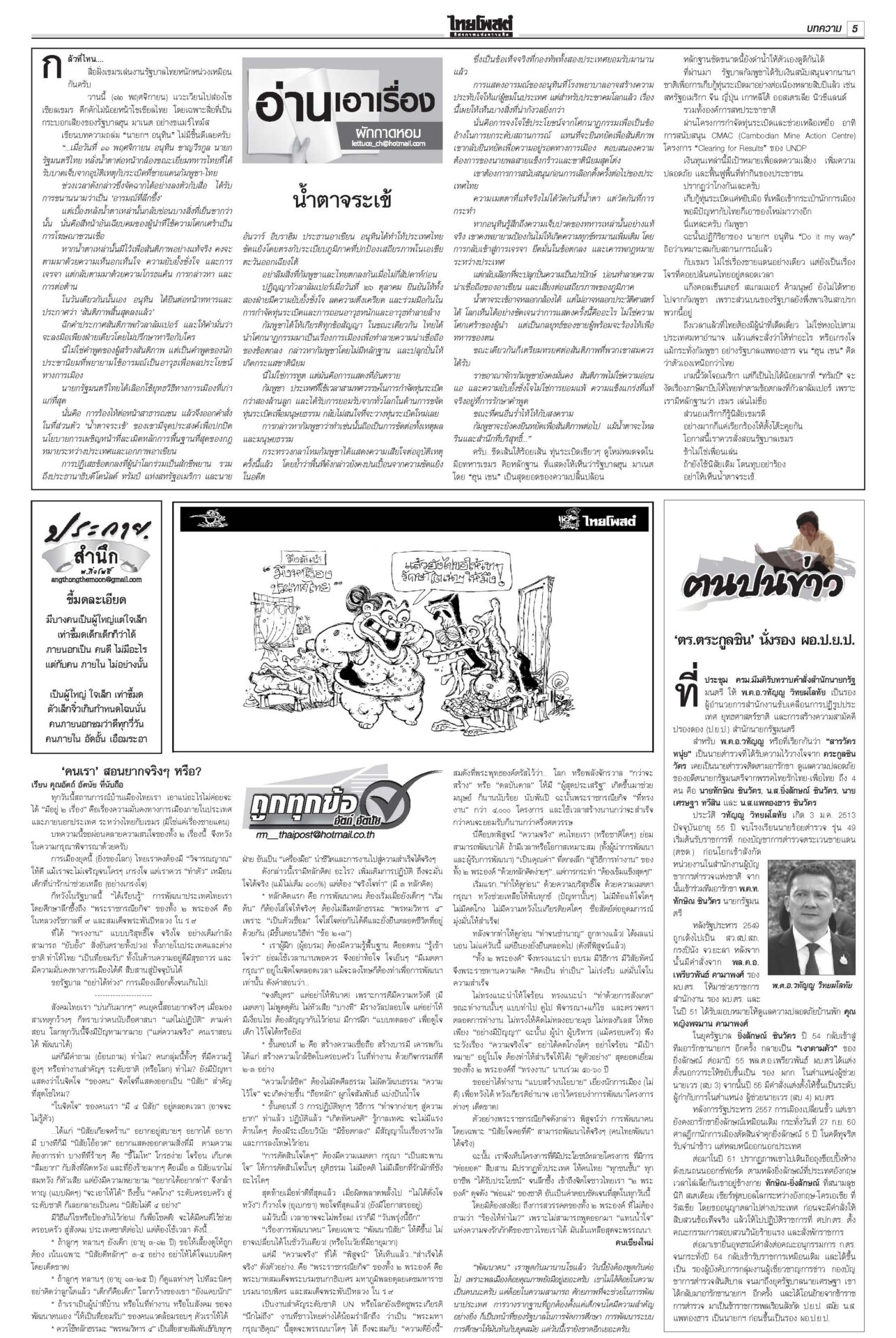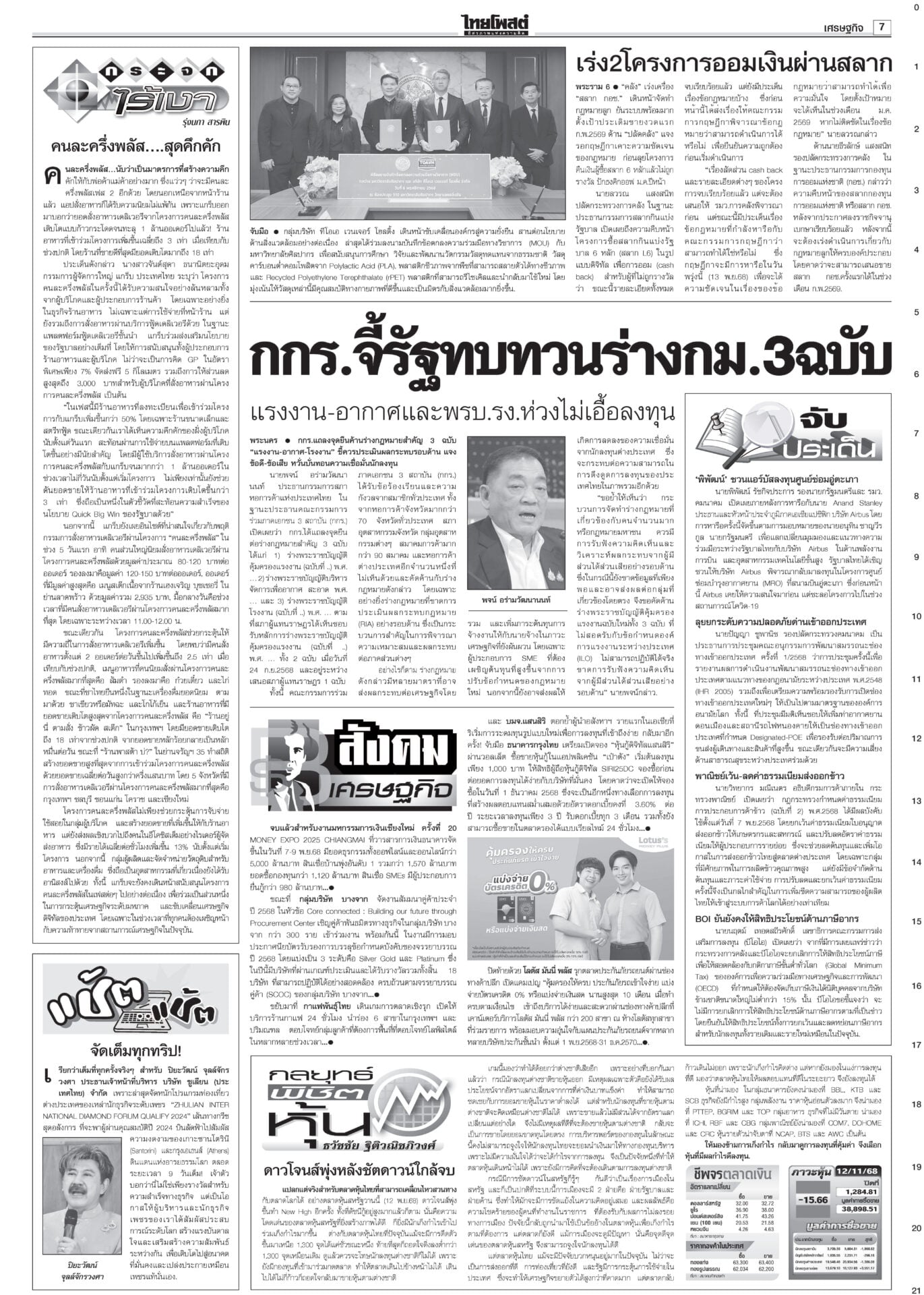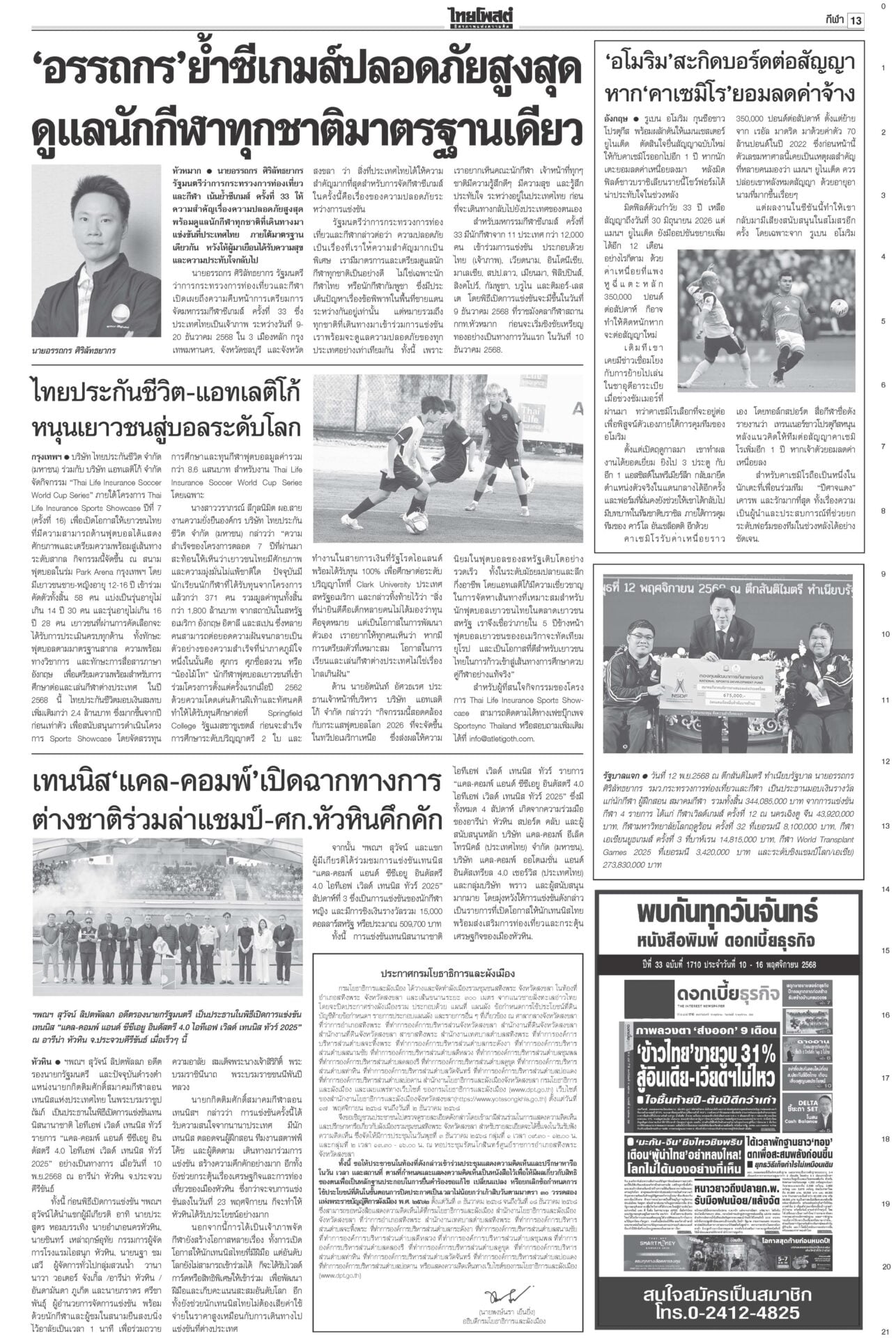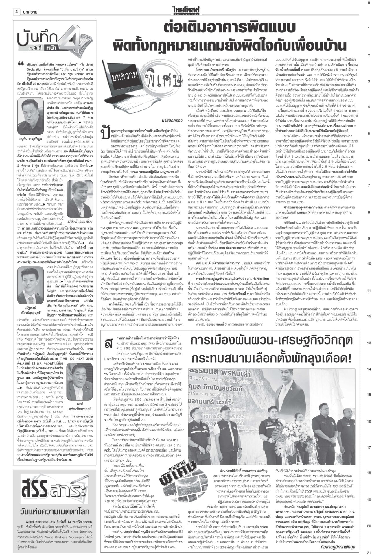 หนังสือพิมพ์ ฉบับวันที่ 13 พฤศจิกายน 2568ข่าวหน้าหนึ่งเขมรชั่ว!โยนบาปไทย ยิงข้ามสระแก้วอ้างพลเรือนตาย/ทหารโต้กลับป้องอธิปไตย“อนุทิน” ประกาศกลางเวที วปอ.68 “กัมพูชา” หมดโอกาสกลับโต๊ะเจรจา กร้าวเมินกระทบภาษีทรัมป์หลังฉีกปฏิญญาสันติภาพ ไม่เอาสสร.ตั้งกมธ.ร่างรธน.มติข้างมาก “กมธ.แก้ รธน.” ไม่เอา ส.ส.ร. เคาะตั้ง 35 อรหันต์ยกร่างรัฐธรรมนูญ-กก.ฟังความเห็น ให้รัฐสภาคัดเลือก ‘หนู’ขอโทษปชช. อ่างทอง-อยุธยา เยียวยาจนน้ำลด“นายกฯ” ติดตามน้ำท่วม ลุยหน้างานพื้นที่รับน้ำภาคกลาง อยุธยา-สุพรรณบุรี กรมศิลป์สำรวจ กางแผนบูรณะ ราชรถยานมาศกรมสมเด็จพระเทพฯ ทรงบำเพ็ญพระราชกุศลถวาย “พระพันปีหลวง” ปชช.ยืมผ้าถุงพระราชทานเข้ากราบพระบรมศพวันที่ 4 นายกฯไฟเขียวเชือด ชนนพัฒฐ์ลั่นแจงได้“อนุทิน” ไฟเขียวเชือด นักการเมืองเทา ลั่นดำเนินการเด็ดขาด