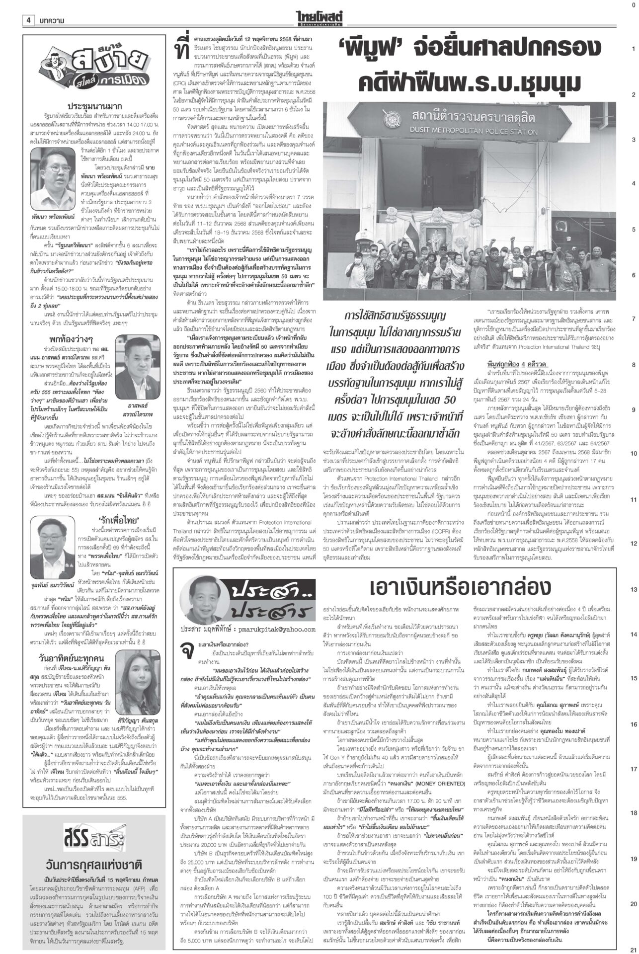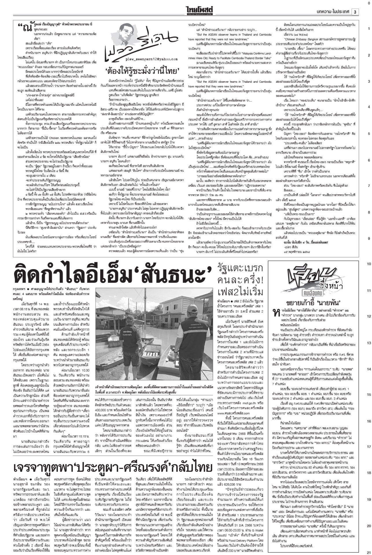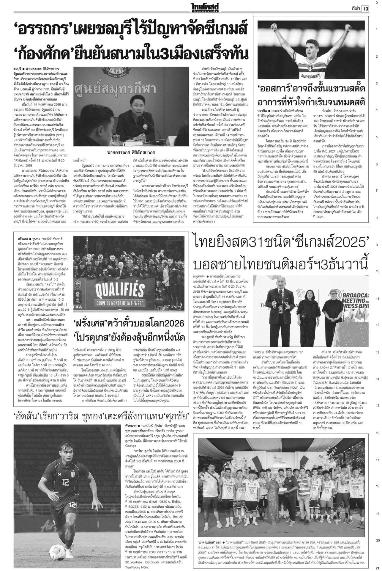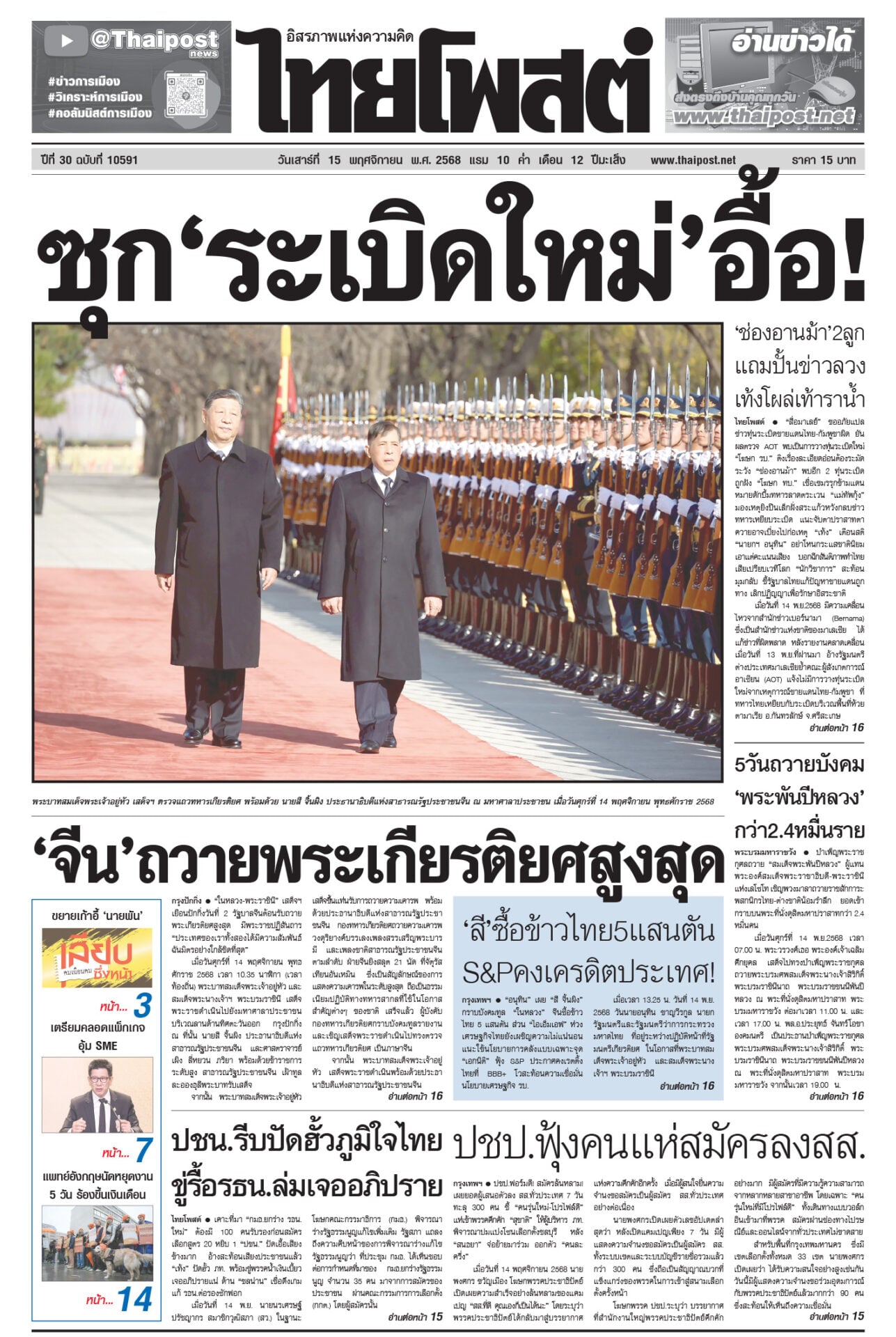 หนังสือพิมพ์ ฉบับวันที่ 15 พฤศจิกายน 2568ข่าวหน้าหนึ่งซุก‘ระเบิดใหม่’อื้อ! ‘ช่องอานม้า’2ลูก แถมปั้นข่าวลวง เท้งโผล่เท้าราน้า“สื่อมาเลย์” ขออภัยแปลข่าวทุ่นระเบิดชายแดนไทย-กัมพูชาผิด ‘จีน’ถวายพระเกียรติยศสูงสุด“ในหลวง-พระราชินี” เสด็จฯ เยือนปักกิ่งวันที่ 2 รัฐบาลจีนต้อนรับถวายพระเกียรติยศสูงสุด ปชป.ฟุ้งคนแห่สมัครลงสส.ปชป.ฟอร์มดี! สมัครล้นหลาม! เผยยอดผู้เสนอตัวลง สส.ทั่วประเทศ 7 วันทะลุ 300 คน ปชน.รีบปัดฮั้วภูมิใจไทย ขู่รื้อรธน.ล่มเจออภิปรายเคาะที่มา “กมธ.ยกร่าง รธน.ใหม่” ต้องมี 100 คนรับรองก่อนสมัคร เลือกสูตร 20 หยิบ 1 ‘สี’ซื้อข้าวไทย5แสนตัน S&Pคงเครดิตประเทศ!“อนุทิน” เผย “สี จิ้นผิง” กราบบังคมทูล “ในหลวง” จีนซื้อข้าวไทย 5 แสนตัน 5วันถวายบังคม ‘พระพันปีหลวง’ กว่า2.4หมื่นรายบำเพ็ญพระราชกุศลถวาย “สมเด็จพระพันปีหลวง” ผู้แทนพระองค์สมเด็จพระราชาธิบดี-พระราชินีแห่งเลโซโท