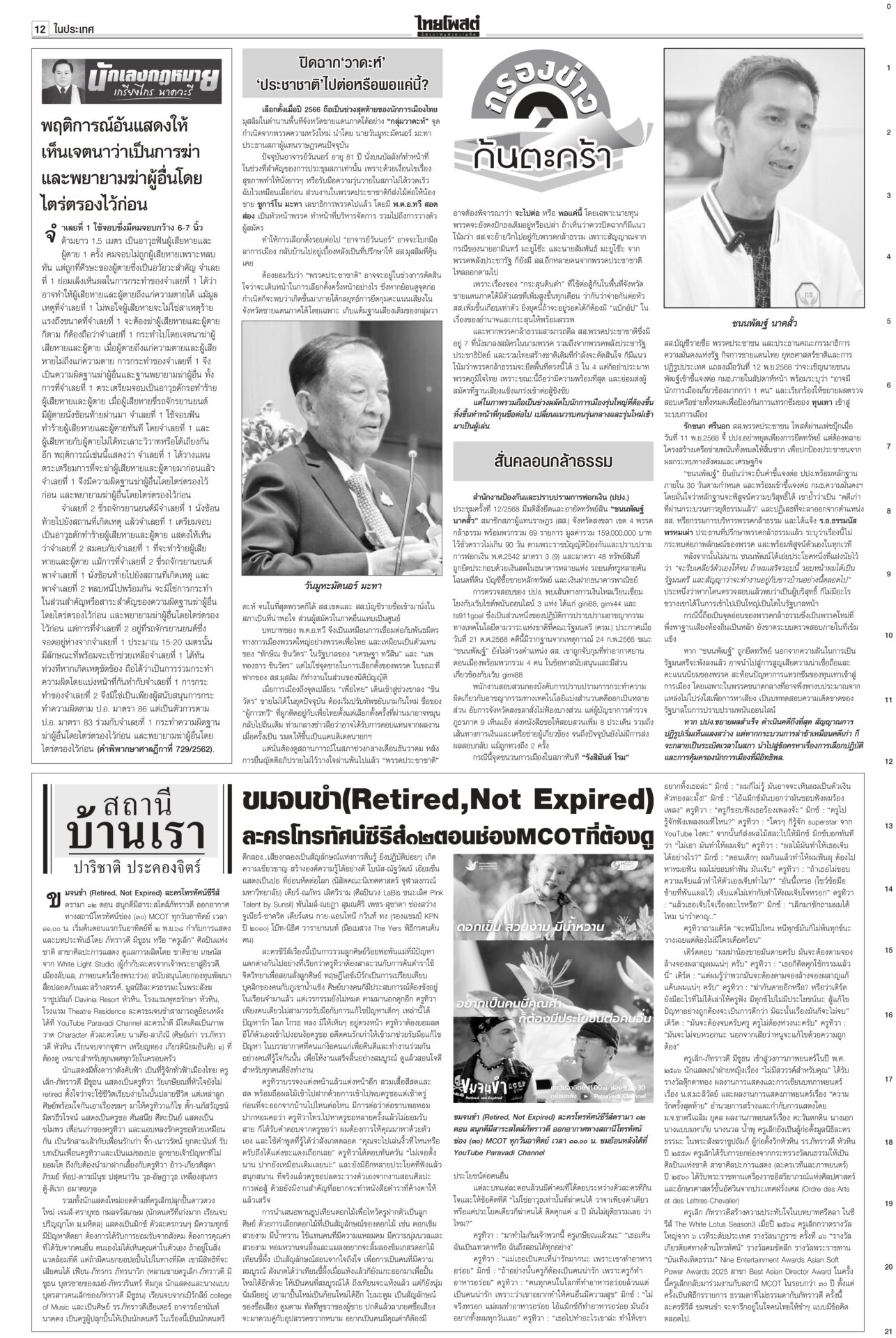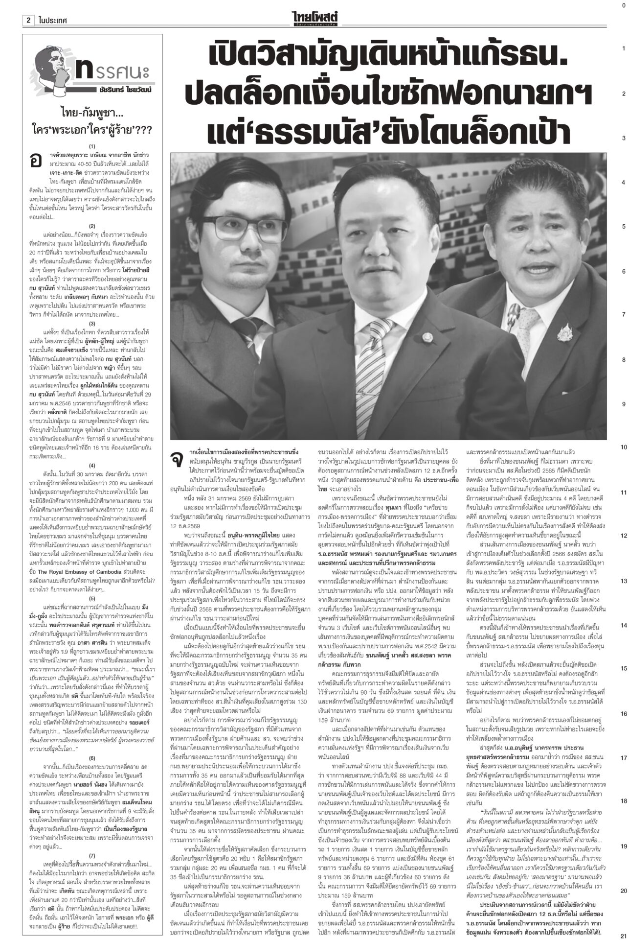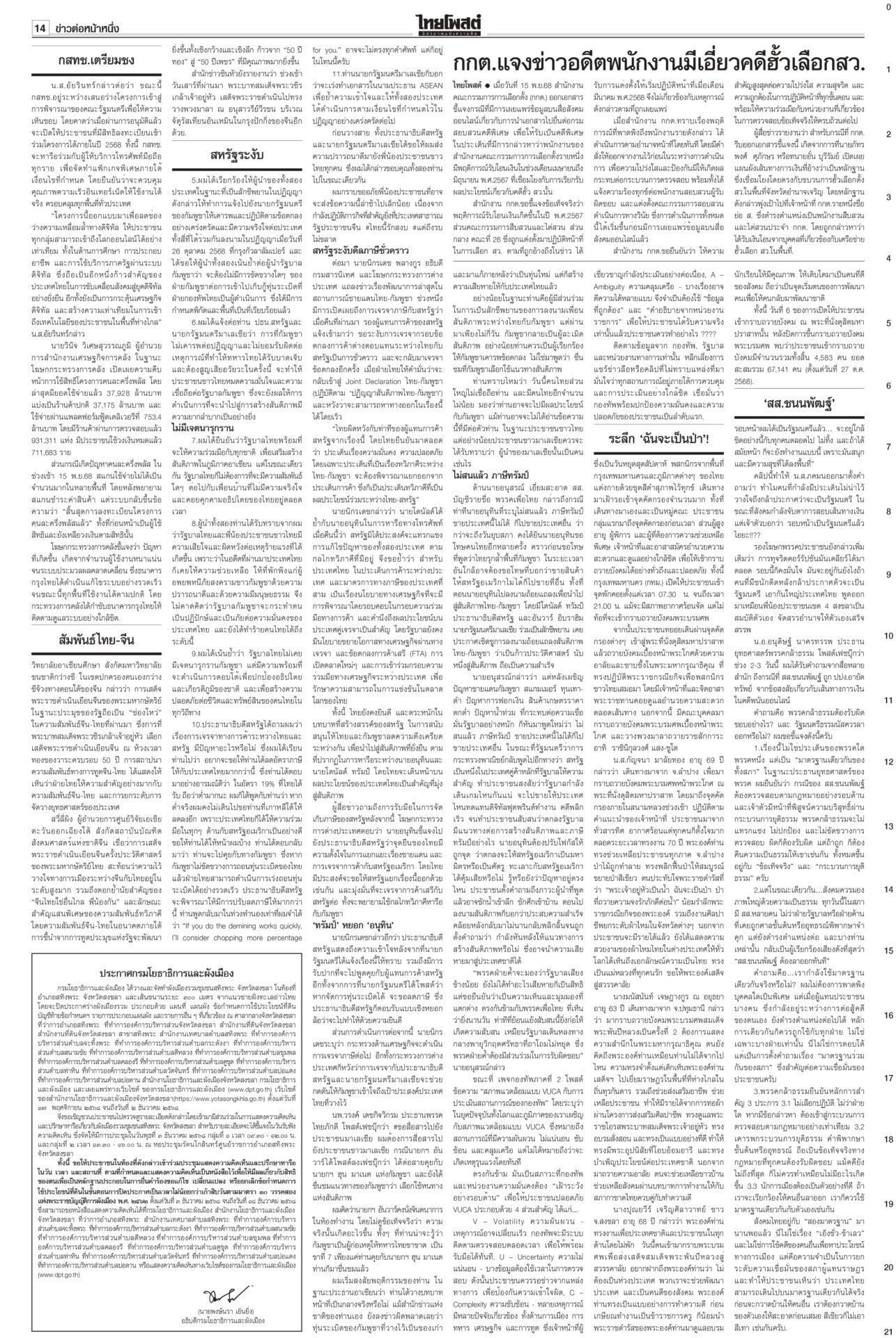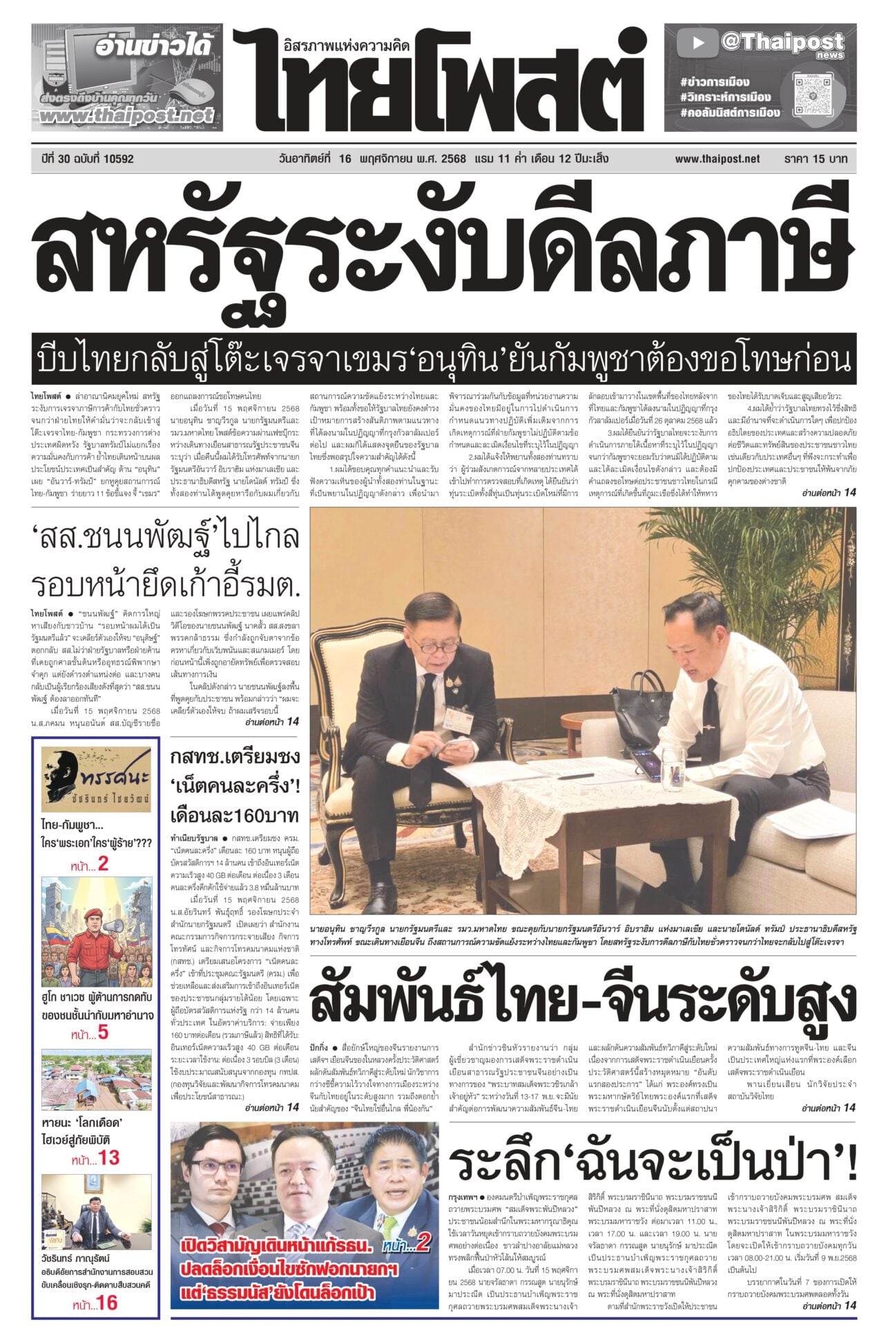 หนังสือพิมพ์ฉบับวันที่ 16 พฤศจิกายน 2568 ข่าวหน้าหนึ่งสหรัฐระงับดีลภาษี บีบไทยกลับสู่โต๊ะเจรจาเขมร‘อนุทิน’ยันกัมพูชาต้องขอโทษก่อนล่าอาณานิคมยุคใหม่ สหรัฐระงับการเจรจาภาษีการค้ากับไทยชั่วคราว จนกว่าฝ่ายไทยให้คำมั่นว่าจะกลับเข้าสู่โต๊ะเจรจาไทย-กัมพูชา กระทรวงการต่างประเทศผิดหวัง กสทช. เตรียมชง ‘เน็ตคนละครึ่ง’! เดือนละ 160 บาทกสทช.เตรียมชง ครม. “เน็ตคนละครึ่ง” เดือนละ 160 บาท หนุนผู้ถือบัตรสวัสดิการฯ 14 ล้านคน เข้าถึงอินเทอร์เน็ตความเร็วสูง 40 GB ต่อเดือน ต่อเนื่อง 3 เดือน คนละครึ่งคึกคักใช้จ่ายแล้ว 3.8 หมื่นล้านบาท สัมพันธ์ไทย-จีนระดับสูงสื่อยักษ์ใหญ่ของจีนรายงานการเสด็จฯ เยือนจีนของในหลวงครั้งประวัติศาสตร์ ผลักดันสัมพันธ์ทวิภาคีสู่ระดับใหม่ นักวิชาการกว่างซีชี้ความไว้วางใจทางการเมืองระหว่างจีนกับไทยอยู่ในระดับสูงมาก ‘สส.ชนนพัฒฐ์’ไปไกล รอบหน้ายึดเก้าอี้รมต.“ชนนพัฒฐ์” คิดการใหญ่ หาเสียงกับชาวบ้าน “รอบหน้าผมได้เป็นรัฐมนตรีแล้ว” จะเคลียร์ตัวเองให้จบ “อนุดิษฐ์” ตอกกลับ สส.ไม่ว่าฝ่ายรัฐบาลหรือฝ่ายค้าน ที่เคยถูกศาลชั้นต้นหรืออุทธรณ์พิพากษาจำคุก ระลึก ‘ฉันจะเป็นป่า’!องคมนตรีบำเพ็ญพระราชกุศลถวายพระบรมศพ “สมเด็จพระพันปีหลวง” ประชาชนน้อมสำนึกในพระมหากรุณาธิคุณ ใช้เวลาวันหยุดเข้ากราบถวายบังคมพระบรมศพอย่างต่อเนื่อง