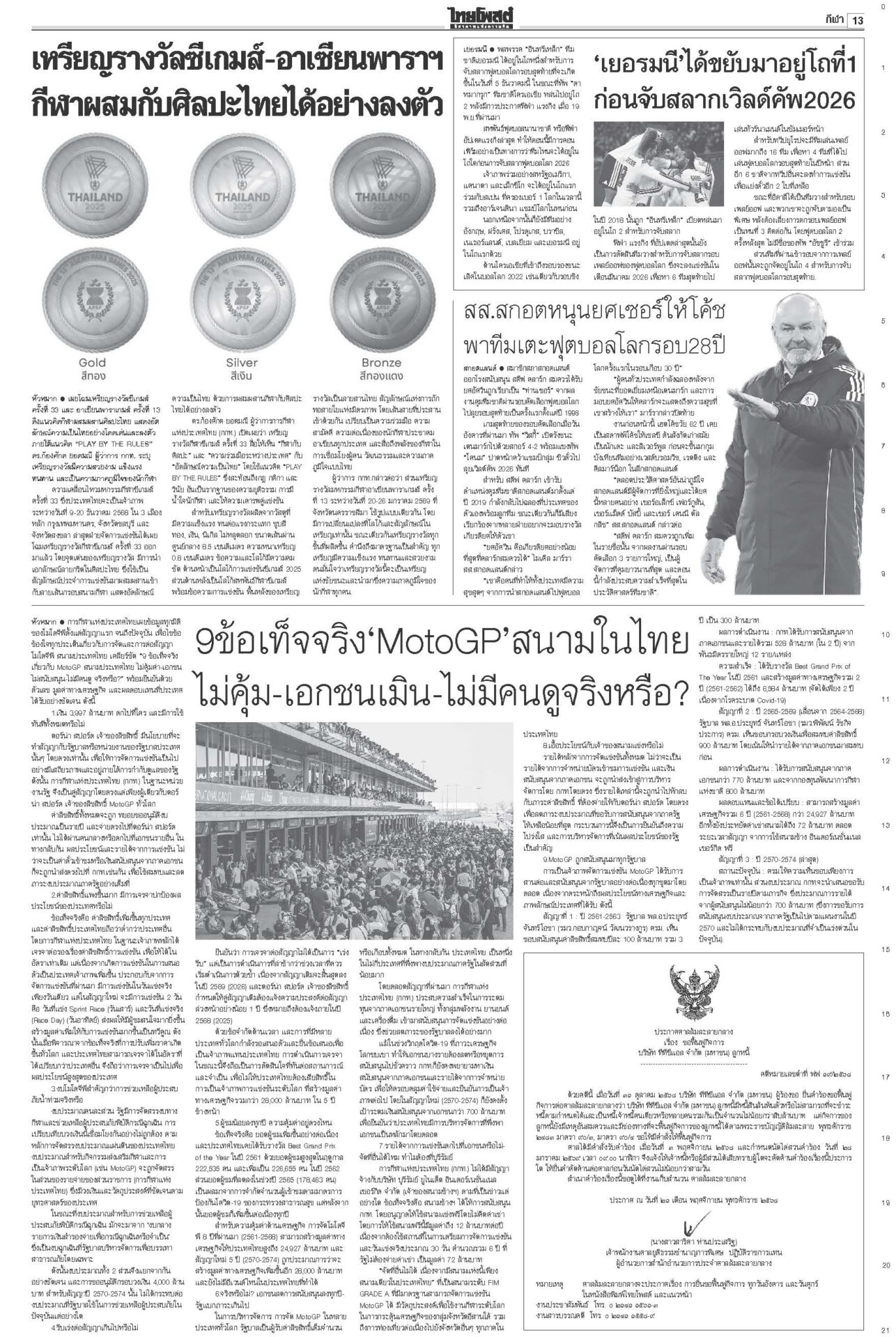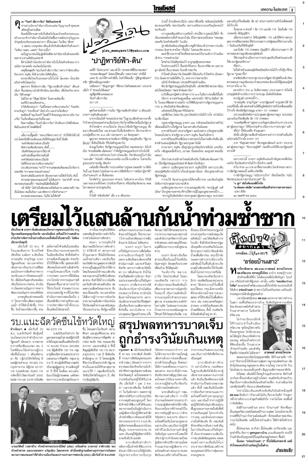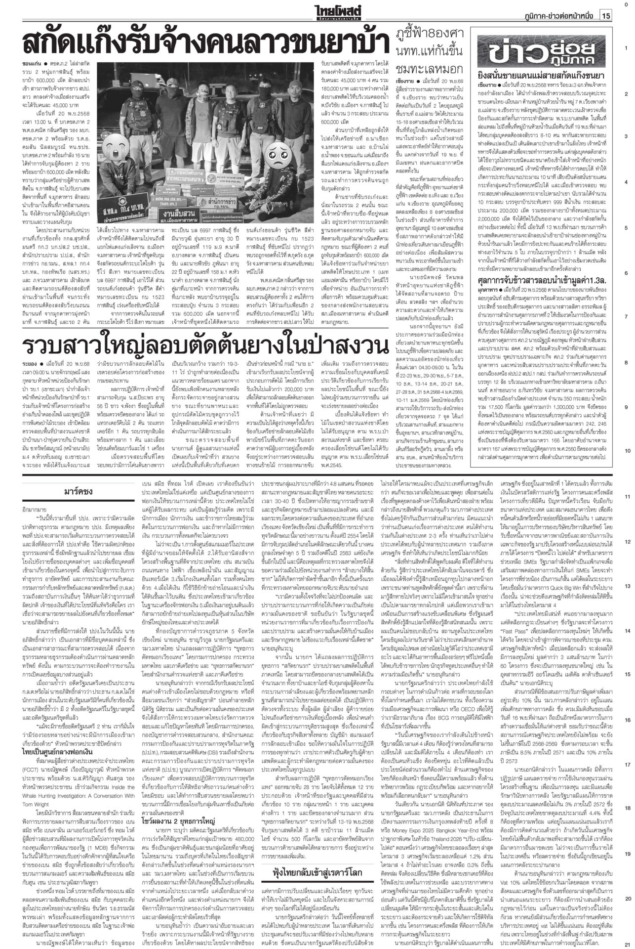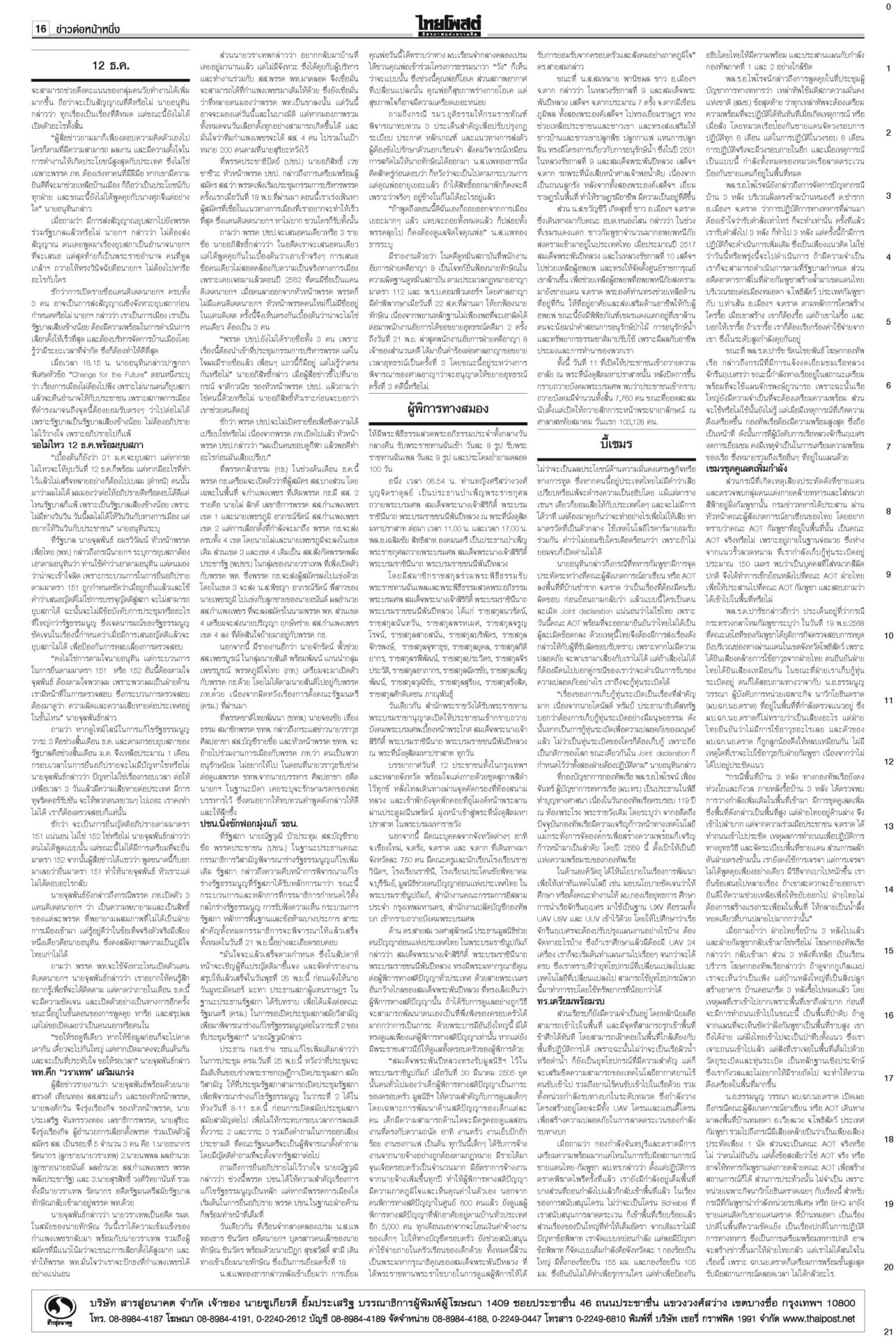 หนังสือพิมพ์ ฉบับวันที่ 21 พฤศจิกายน 2568ข่าวหน้าหนึ่ง12ธค.พร้อมยุบสภา นายกฯสารภาพเสียงข้างน้อยไปต่อไม่ได้/พท.ยังกั๊กยื่นซักฟอก“อนุทิน” รับสภาพการเมืองถึงจุดไปต่อไม่ได้ ชี้รัฐบาลเสียงข้างน้อยอภิปรายไม่ไว้วางใจอย่างไรก็แพ้ ลั่นหากรอไม่ไหว 12 ธ.ค. ผู้พิการทางสมอง สำนึกพระบารมี มีที่ให้ยืนในสังคม“ม.จ.ฑิฆัมพร ยุคล” ทรงบำเพ็ญพระราชกุศลถวาย “สมเด็จพระพันปีหลวง” ฟุ้งไทยกลับเข้าสู่เรดาร์โลก คลังเบรกขึ้นVATเป็น10%“อนุทิน” ปาฐกถาพิเศษ ฟุ้งไทยกลับเข้าสู่เรดาร์โลก หลังใช้โอกาสพบผู้นำหลายประเทศ บี้เขมรรับผิดชอบป่วนAOT“นายกฯ อนุทิน” ลั่นต้องมีคนรับผิดชอบ หลังทหารกัมพูชาจุดประทัดระหว่าง AOT มาร์คชงสอบ‘อดีตรมต.เทา’ หนูโชว์ผลงาน2ยุทธการใหญ่ปราบธุรกิจสีเทาคึกคัก! “อภิสิทธิ์” ยื่น ปปง.สอบ “2 อดีต รมต.” ในรัฐบาลชุดนี้-ชุดที่ผ่านมา