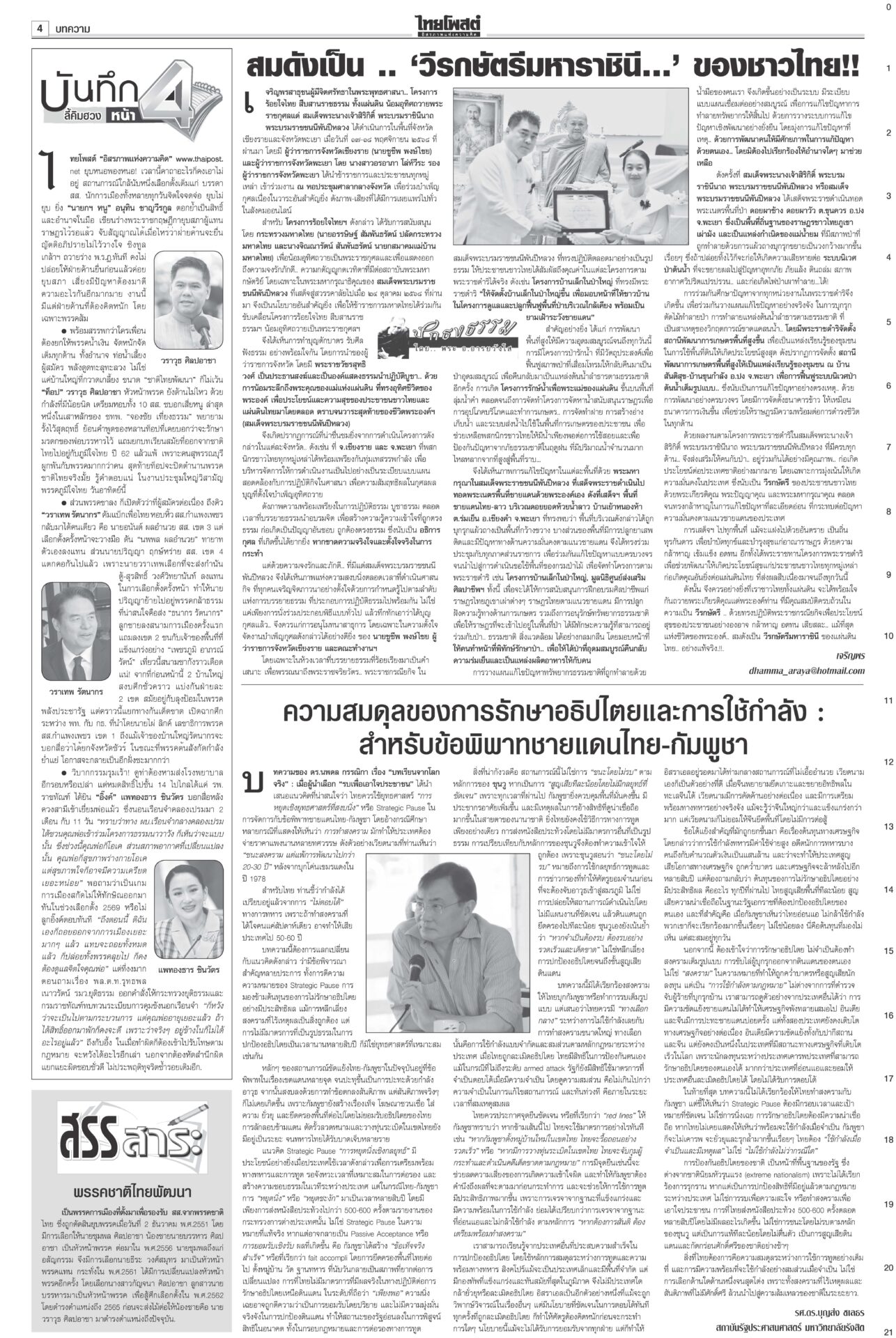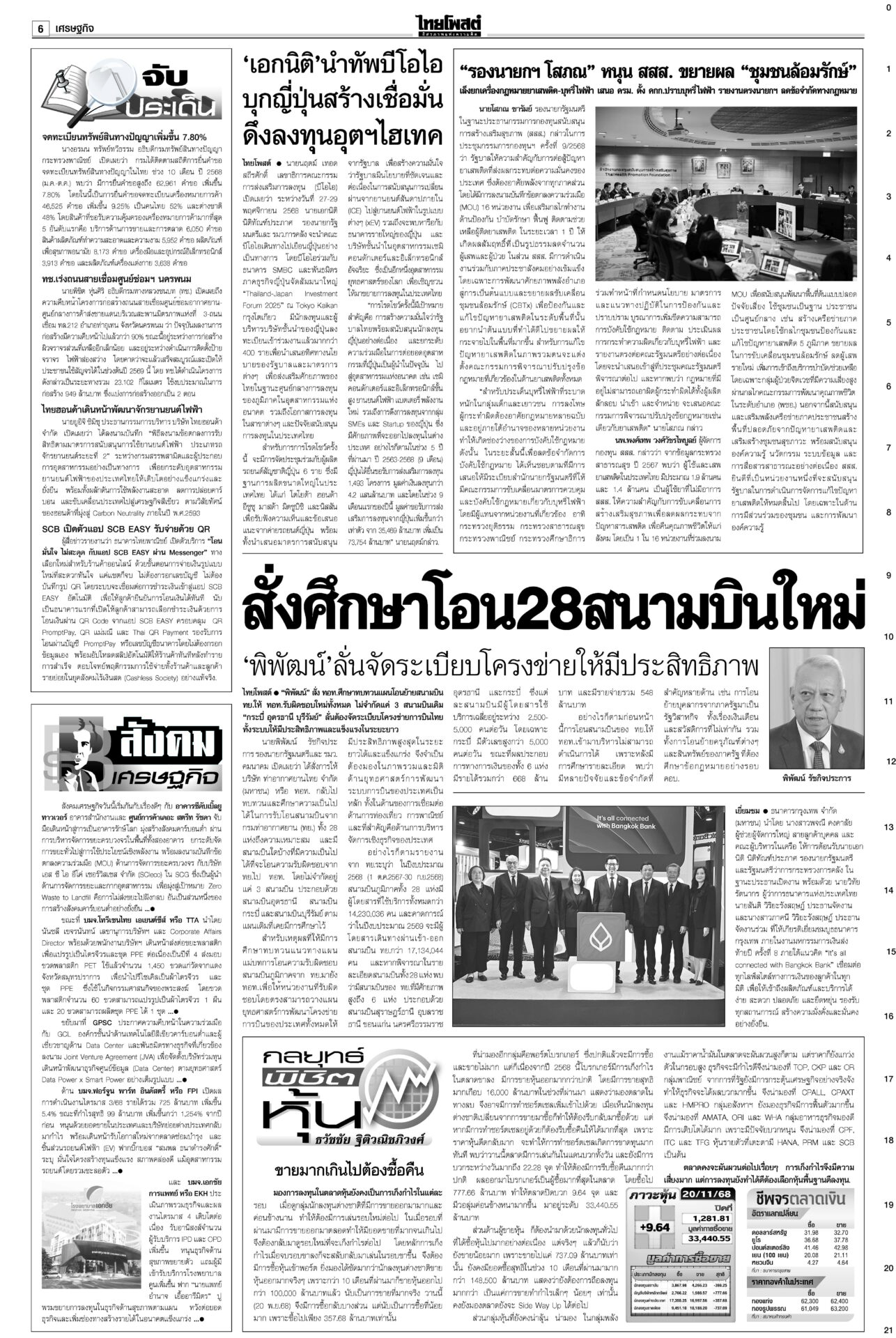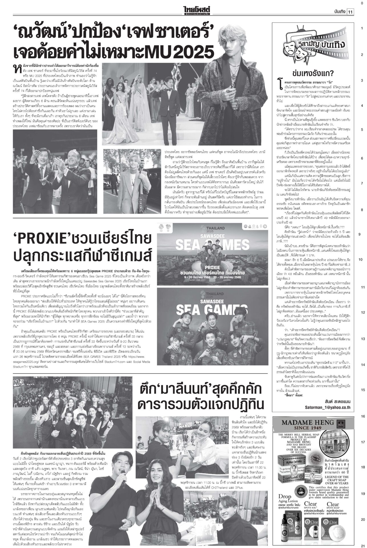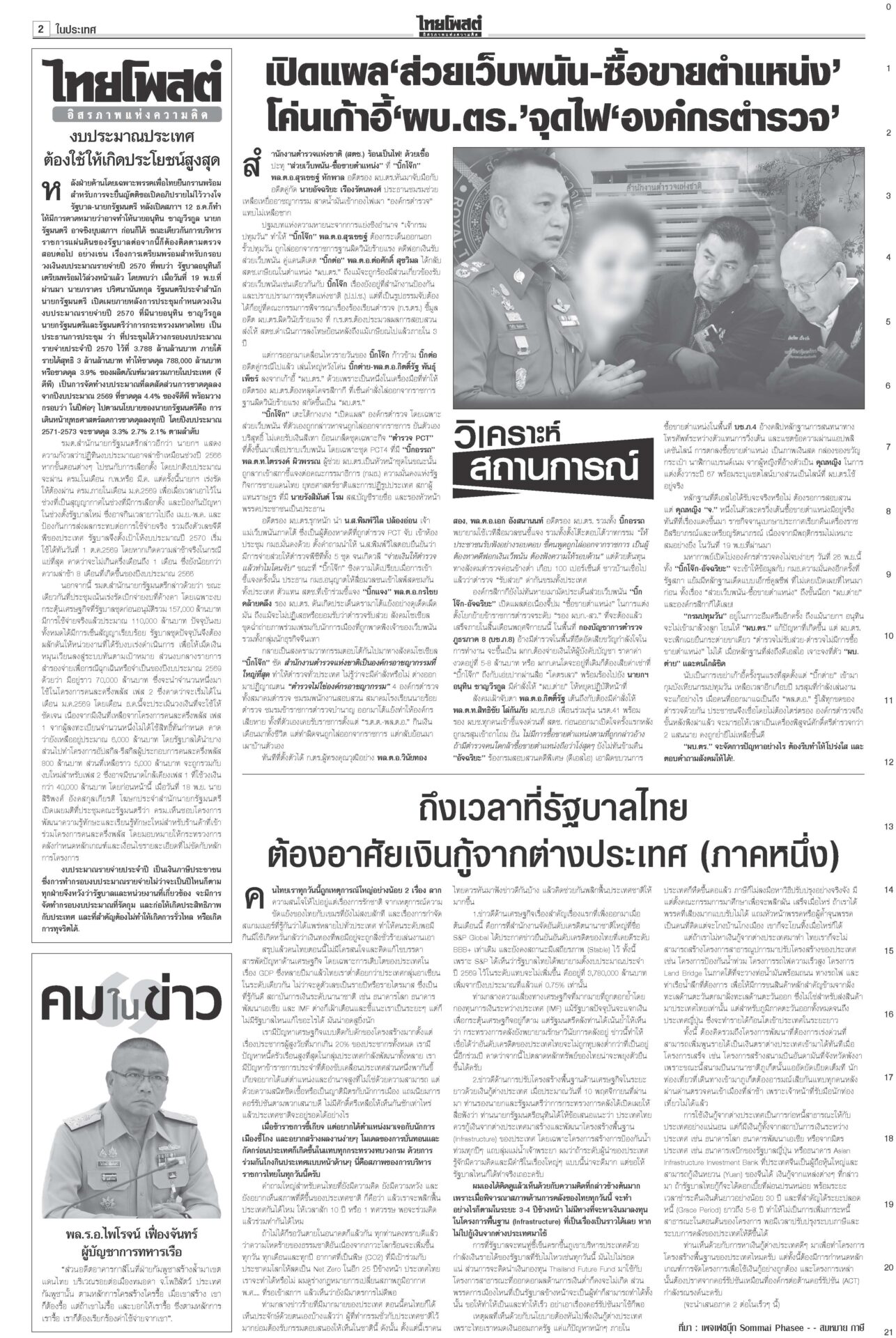 หนังสือพิมพ์ ฉบับวันที่ 21 พฤศจิกายน 2568ข่าวหน้าหนึ่ง12ธค.พร้อมยุบสภา นายกฯสารภาพเสียงข้างน้อยไปต่อไม่ได้/พท.ยังกั๊กยื่นซักฟอก“อนุทิน” รับสภาพการเมืองถึงจุดไปต่อไม่ได้ ชี้รัฐบาลเสียงข้างน้อยอภิปรายไม่ไว้วางใจอย่างไรก็แพ้ ลั่นหากรอไม่ไหว 12 ธ.ค. ผู้พิการทางสมอง สำนึกพระบารมี มีที่ให้ยืนในสังคม“ม.จ.ฑิฆัมพร ยุคล” ทรงบำเพ็ญพระราชกุศลถวาย “สมเด็จพระพันปีหลวง” ฟุ้งไทยกลับเข้าสู่เรดาร์โลก คลังเบรกขึ้นVATเป็น10%“อนุทิน” ปาฐกถาพิเศษ ฟุ้งไทยกลับเข้าสู่เรดาร์โลก หลังใช้โอกาสพบผู้นำหลายประเทศ บี้เขมรรับผิดชอบป่วนAOT“นายกฯ อนุทิน” ลั่นต้องมีคนรับผิดชอบ หลังทหารกัมพูชาจุดประทัดระหว่าง AOT มาร์คชงสอบ‘อดีตรมต.เทา’ หนูโชว์ผลงาน2ยุทธการใหญ่ปราบธุรกิจสีเทาคึกคัก! “อภิสิทธิ์” ยื่น ปปง.สอบ “2 อดีต รมต.” ในรัฐบาลชุดนี้-ชุดที่ผ่านมา