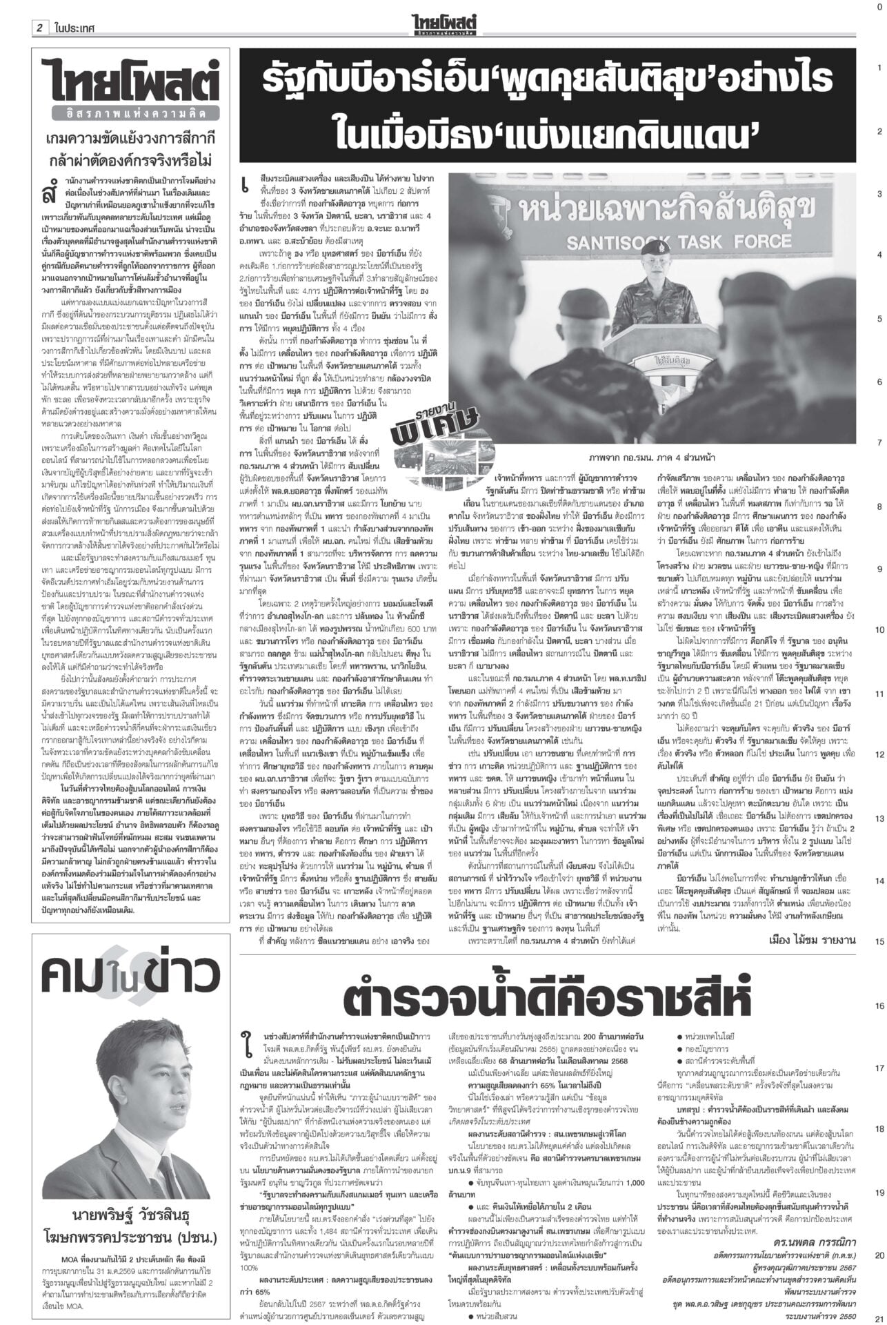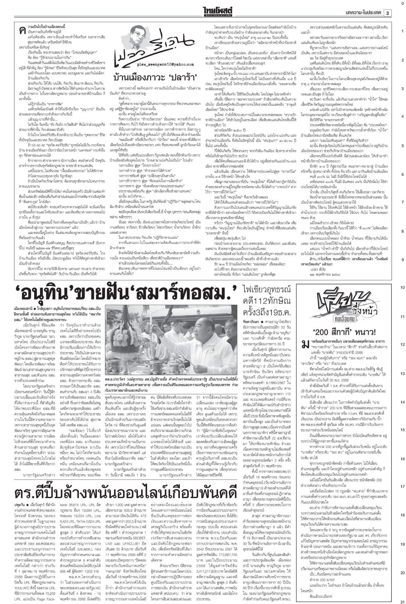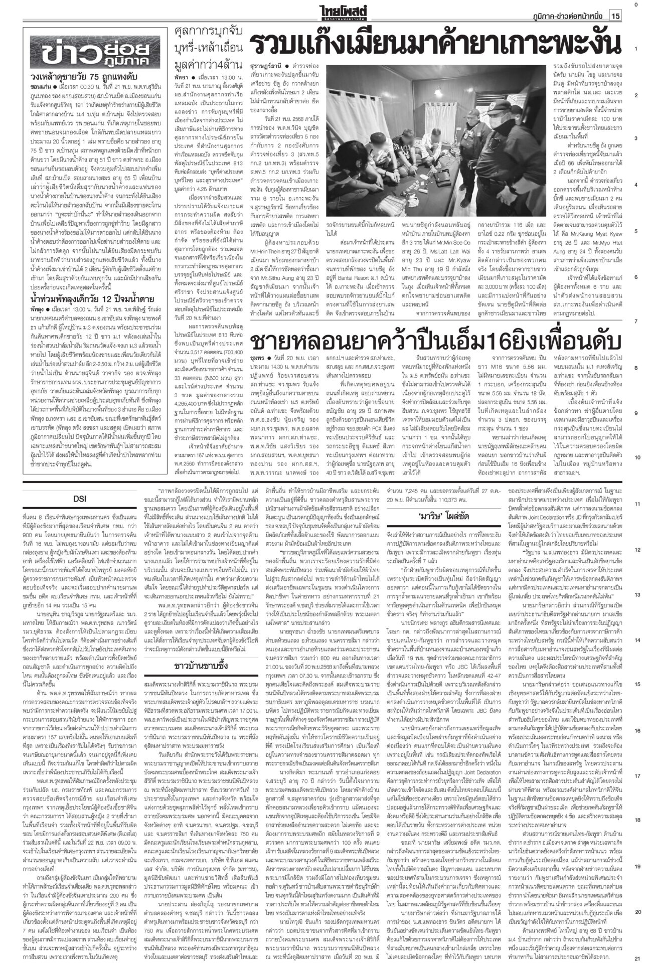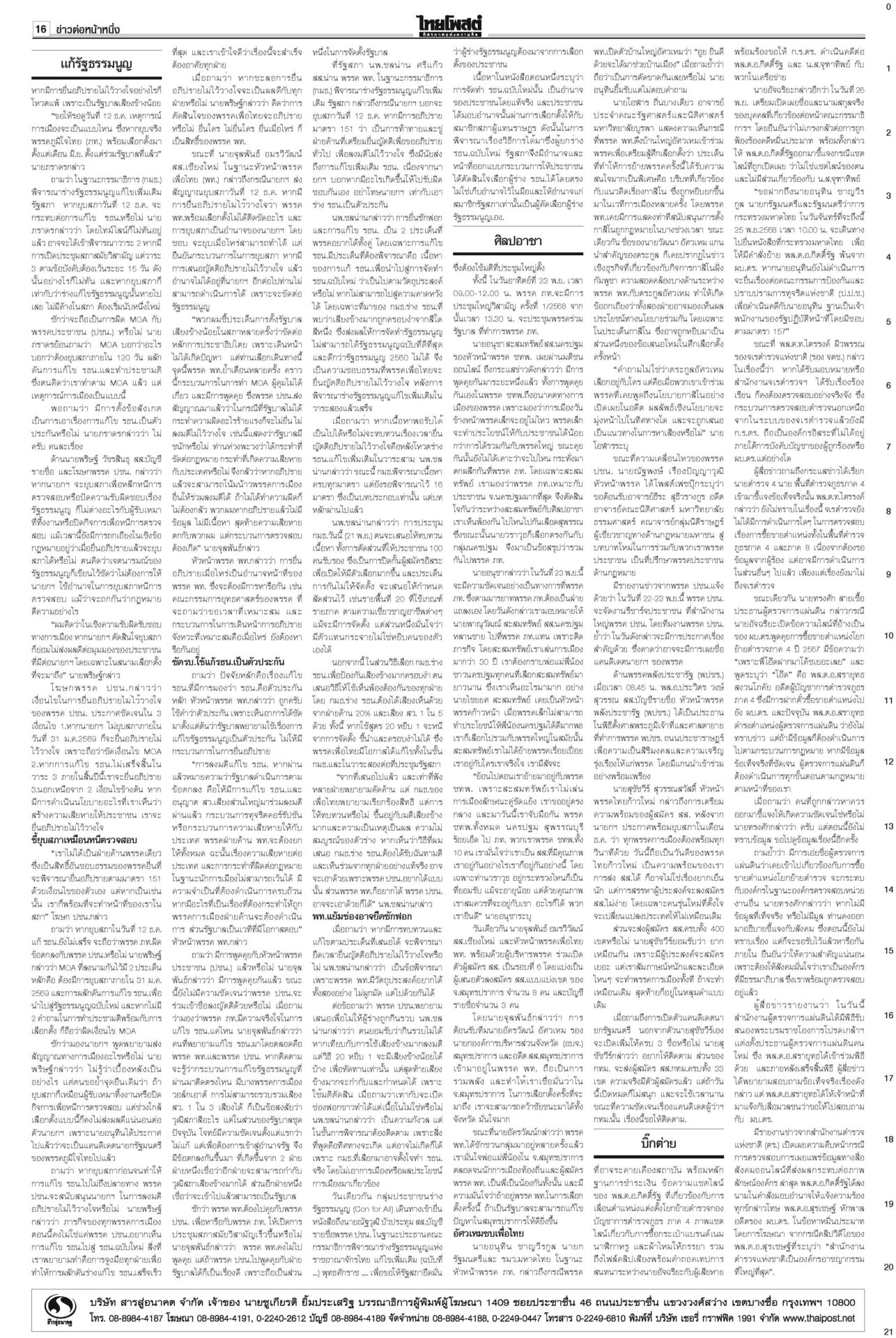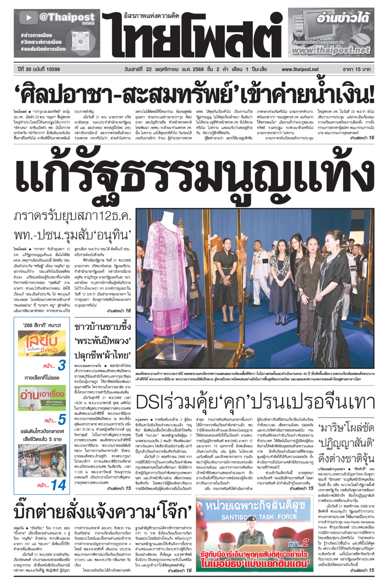 หนังสือพิมพ์ ฉบับวันที่ 22 พฤศจิกายน 2568ข่าวหน้าหนึ่งแก้รัฐธรรมนูญแท้ง ภราดรรับยุบสภา12ธ.ค. พท.-ปชน.รุมสับ‘อนุทิน’“ภราดร” รับถ้ายุบสภา 12 ธ.ค. แก้รัฐธรรมนูญแท้งแน่ ลั่นไม่ได้ผิด MOA 'ศิลปอาชา-สะสมทรัพย์' เข้าค่ายนํ้าเงิน!“วราวุธ-สะสมทรัพย์” ยกมุ้งซบ ภท. เปิดตัว 23 พ.ย. “อนุชา” อยู่พรรคใหญ่ บิ๊กต่ายสั่งแจ้งความ‘โจ๊ก’“อัจฉริยะ” ร้อง ก.ร.ตร. สอบ “บิ๊กต่าย” เอี่ยวซื้อขายตำแหน่งภาค 4 ‘มาริษ’โผล่ซัด ‘ปฏิญญาสันติ’ ดึงต่างชาติจุ้น“สีหศักดิ์” เผยหลายประเทศถามถึงปัญหาไทย-กัมพูชา DSIร่วมคุ้ย‘คุก’ปรนเปรอจีนเทาราชทัณฑ์แจงย้าย 2 ผู้ต้องขังจีนเทาไปยังเรือนจำเหมาะสมแล้ว ชาวบ้านซาบซึ้ง ‘พระพันปีหลวง’ ปลุกชีพ‘ผ้าไทย’พสกนิกรทั่วไทยเข้ากราบพระบรมศพสมเด็จพระพันปีหลวง