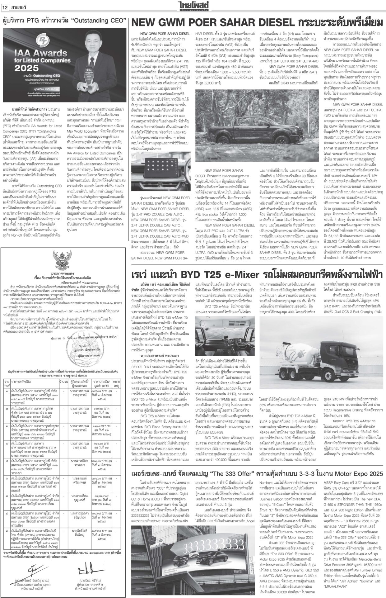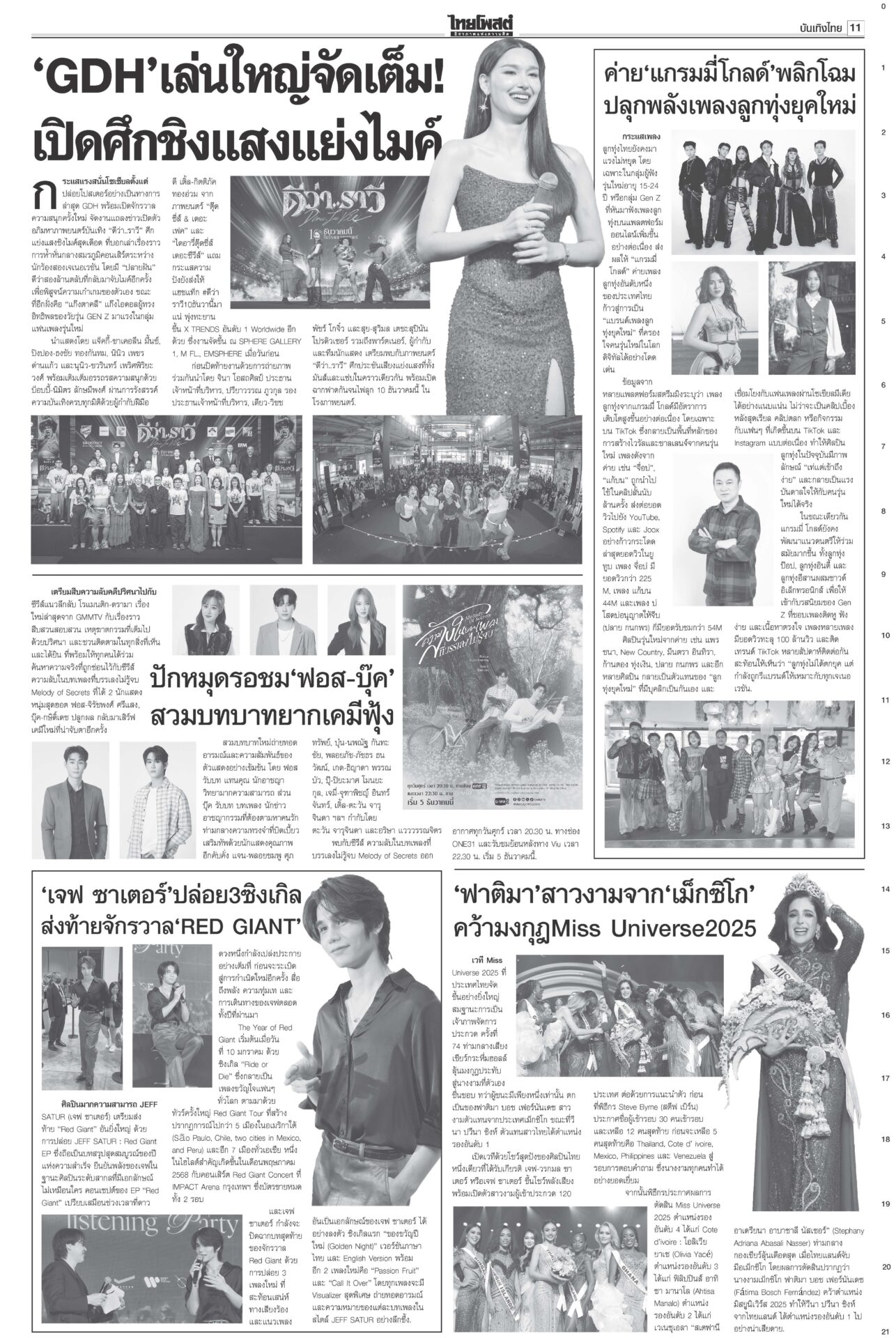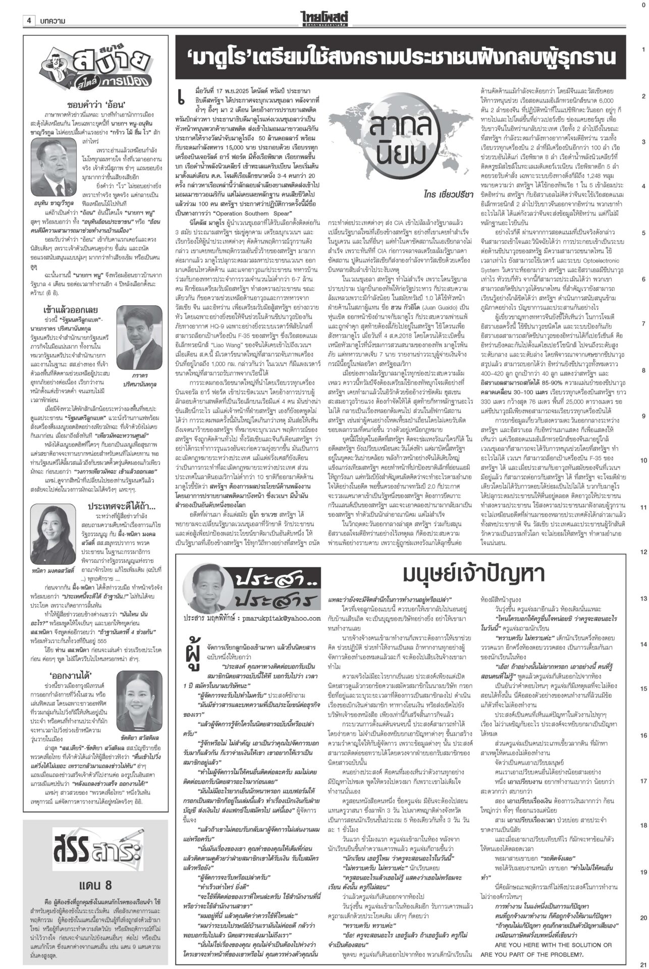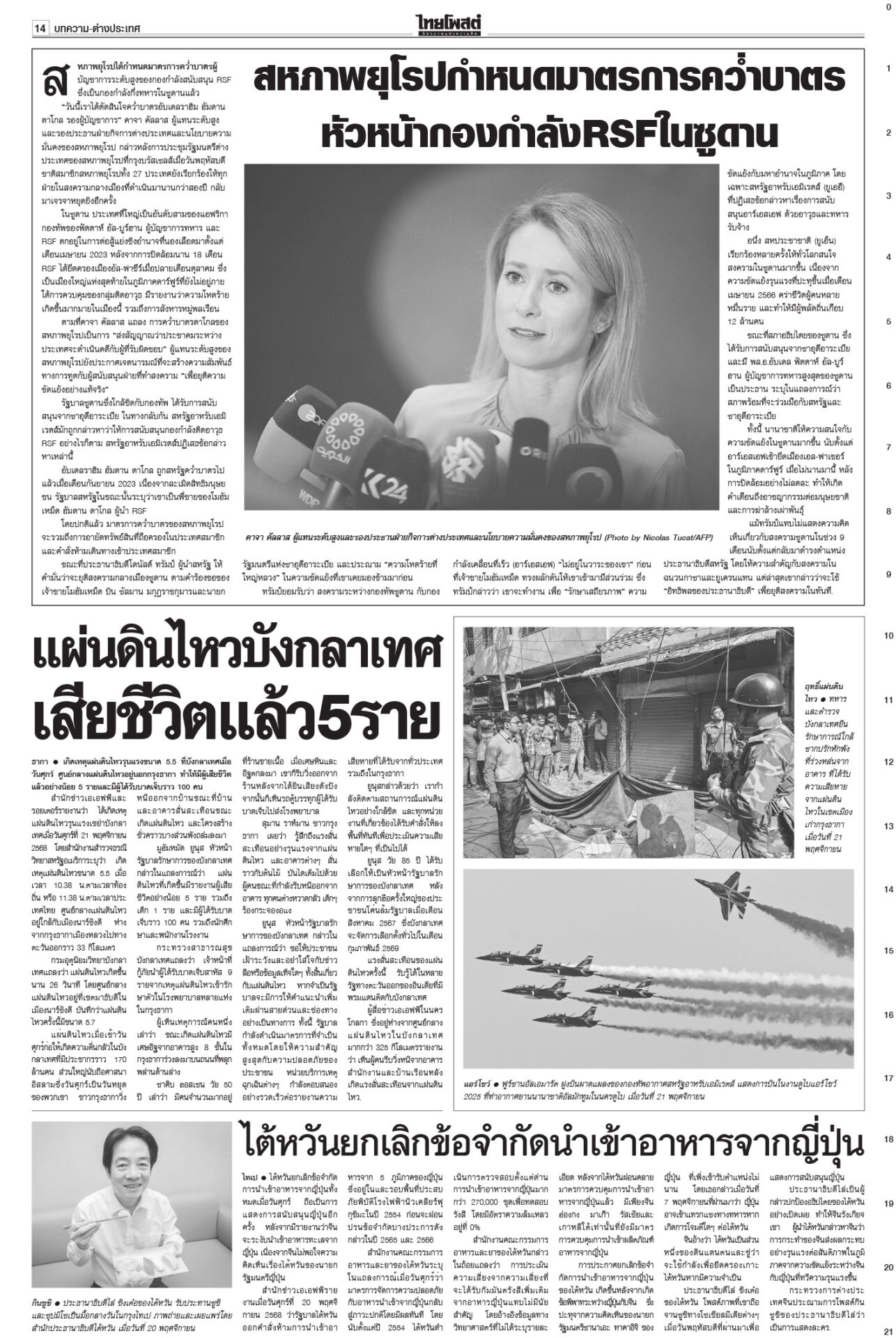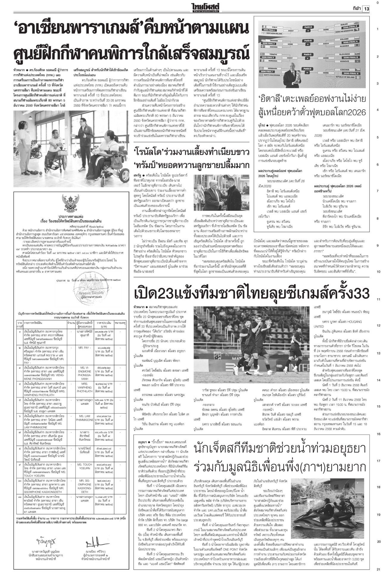 หนังสือพิมพ์ ฉบับวันที่ 22 พฤศจิกายน 2568ข่าวหน้าหนึ่งแก้รัฐธรรมนูญแท้ง ภราดรรับยุบสภา12ธ.ค. พท.-ปชน.รุมสับ‘อนุทิน’“ภราดร” รับถ้ายุบสภา 12 ธ.ค. แก้รัฐธรรมนูญแท้งแน่ ลั่นไม่ได้ผิด MOA 'ศิลปอาชา-สะสมทรัพย์' เข้าค่ายนํ้าเงิน!“วราวุธ-สะสมทรัพย์” ยกมุ้งซบ ภท. เปิดตัว 23 พ.ย. “อนุชา” อยู่พรรคใหญ่ บิ๊กต่ายสั่งแจ้งความ‘โจ๊ก’“อัจฉริยะ” ร้อง ก.ร.ตร. สอบ “บิ๊กต่าย” เอี่ยวซื้อขายตำแหน่งภาค 4 ‘มาริษ’โผล่ซัด ‘ปฏิญญาสันติ’ ดึงต่างชาติจุ้น“สีหศักดิ์” เผยหลายประเทศถามถึงปัญหาไทย-กัมพูชา DSIร่วมคุ้ย‘คุก’ปรนเปรอจีนเทาราชทัณฑ์แจงย้าย 2 ผู้ต้องขังจีนเทาไปยังเรือนจำเหมาะสมแล้ว ชาวบ้านซาบซึ้ง ‘พระพันปีหลวง’ ปลุกชีพ‘ผ้าไทย’พสกนิกรทั่วไทยเข้ากราบพระบรมศพสมเด็จพระพันปีหลวง