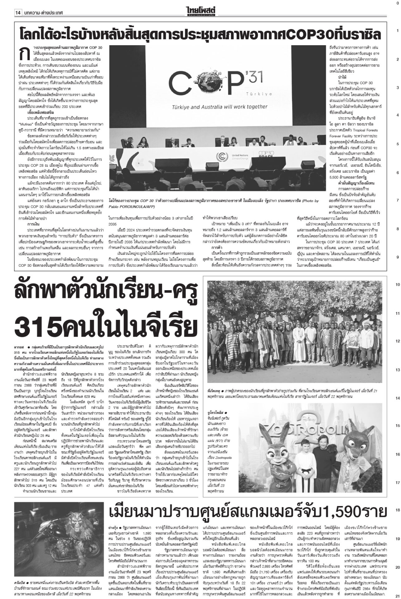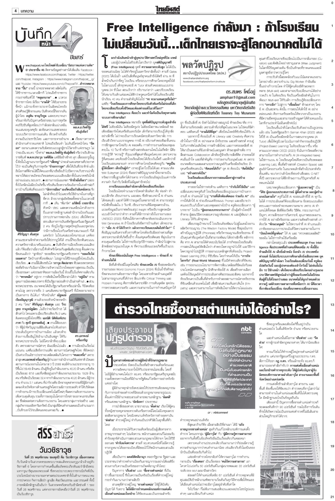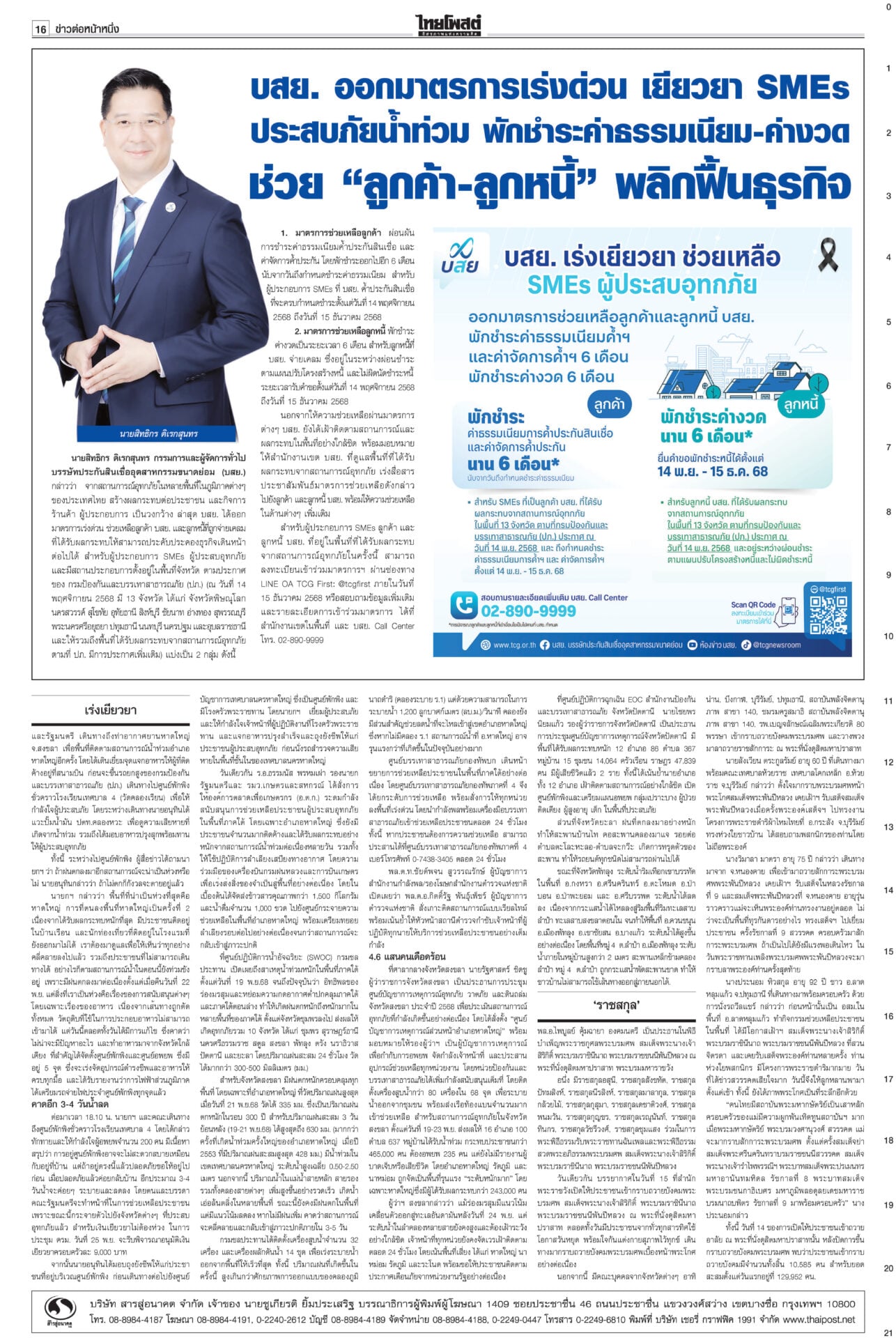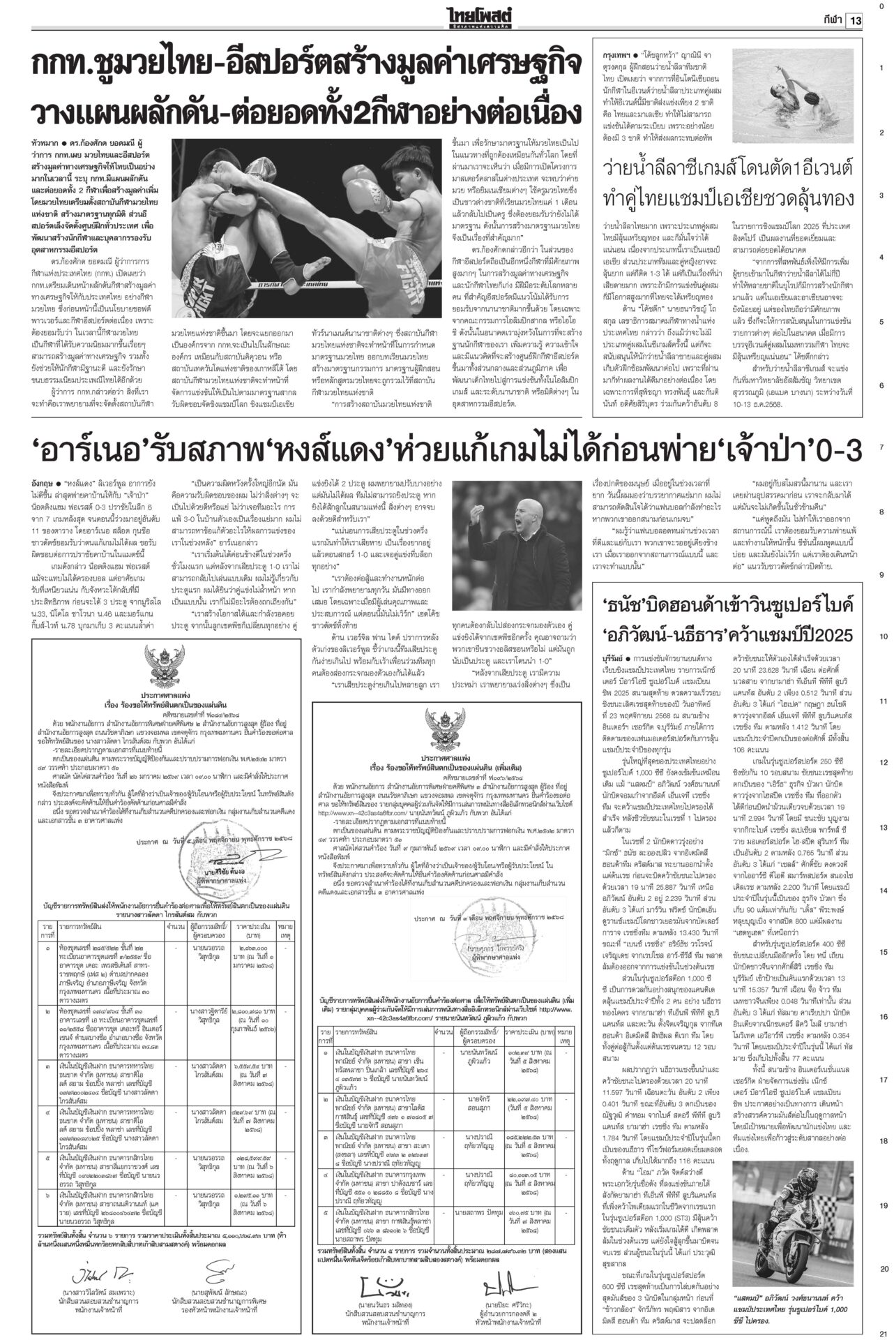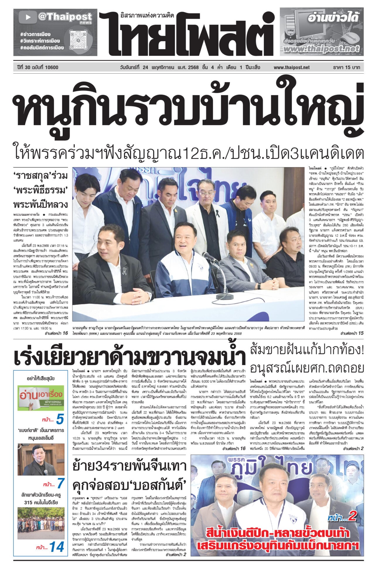 หนังสือพิมพ์ ฉบับวันที่ 24 พฤศจิกายน 2568ข่าวหน้าหนึ่งหนูกินรวบบ้านใหญ่ ให้พรรคร่วมฯฟังสัญญาณ12ธ.ค./ปชน.เปิด3แคนดิเดต“ภูมิใจไทย” คึกคักเปิดตัว “ชทพ.-บ้านใหญ่ชลบุรี-บ้านใหญ่ระยอง” เข้าซบ “อนุทิน” ฟุ้งวันประวัติศาสตร์ เร่งเยียวยาด้ามขวานจมนํ้านายกฯ ลงหาดใหญ่ซ้ำ ซับน้ำตาผู้ประสบภัย 4.6 แสนคน เปิดศูนย์พักพิง 5 จุด ส้มขายฝันแก้ปากท้อง! อนุสรณ์เผยศก.ถดถอยพรรคประชาชนชำแหละประเทศไทยแทบไม่มีชิ้นดี ซัดรัฐราชการแข็งทำให้ไทยไม่รู้อยู่ตรงไหนในเวทีโลก ‘ราชสกุล’ร่วม ‘พระพิธีธรรม’ พระพันปีหลวงกรมสมเด็จพระเทพฯ ทรงบำเพ็ญพระราชกุศลถวาย “พระพันปีหลวง” ย้าย34รายพันจีนเทา คุกจ่อสอบ‘บอสกันต์’“ยุทธนา” เตรียมถาม “บอสกันต์” หลังมีข่าวโผล่ปมห้องลับจีนเทา