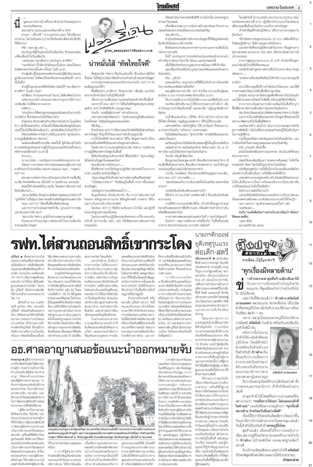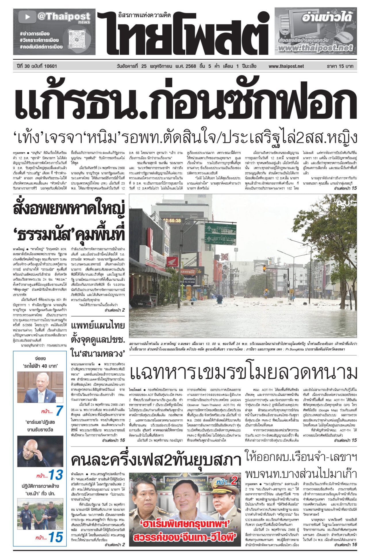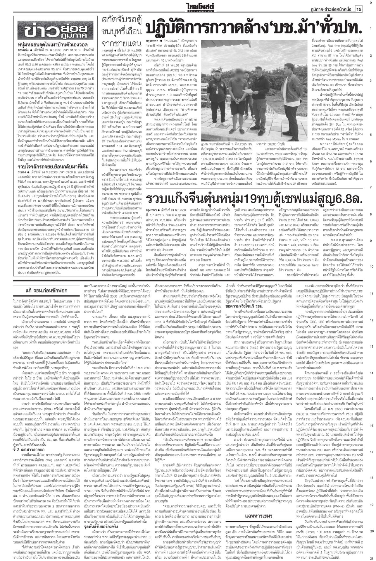 หนังสือพิมพ์ ฉบับวันที่ 25 พฤศจิกายน 2568ข่าวหน้าหนึ่งแก้รธน.ก่อนซักฟอก ‘เท้ง’เจรจา‘หนิม’รอพท.ตัดสินใจ/ประเสริฐไล่2สส.หญิง“อนุทิน” ตีมึนเรื่องให้เตรียมตัว 12 ธ.ค. “สุชาติ” ปัดนายกฯ สั่งอพยพหาดใหญ่ ‘ธรรมนัส’คุมพื้นที่“หาดใหญ่” วิกฤตหนัก ผวจ.สงขลาสั่งปิดเมืองอพยพประชาชน แพทย์แผนไทย ตั้งจุดดูแลปชช. ใน‘สนามหลวง’พระราชวงศ์ทรงบำเพ็ญพระราชกุศลถวาย “สมเด็จพระพันปีหลวง” แฉทหารเขมรขโมยลวดหนามกองทัพไทยเปิดรายงาน ผลตรวจสอบของ AOT ยืนยันทุ่นระเบิด PMN-2 ให้ออกผบ.เรือนจำ-เลขาฯ พบจนท.บางส่วนไปมาเก๊า“รมว.ยุติธรรม” ลงดาบแล้ว 2 ราย “ผบ.เรือนจำ-เลขานุการ ผบ.” ให้ออกจากราชการไว้ก่อน เซ่นคุกวีไอพี “ราชทัณฑ์” คนละครึ่งเฟส2ทันยุบสภาครม.เศรษฐกิจปลดล็อกร้านค้า “คนละครึ่งพลัส” ขายสินค้าให้ผู้ถือบัตรสวัสดิการแห่งรัฐได้