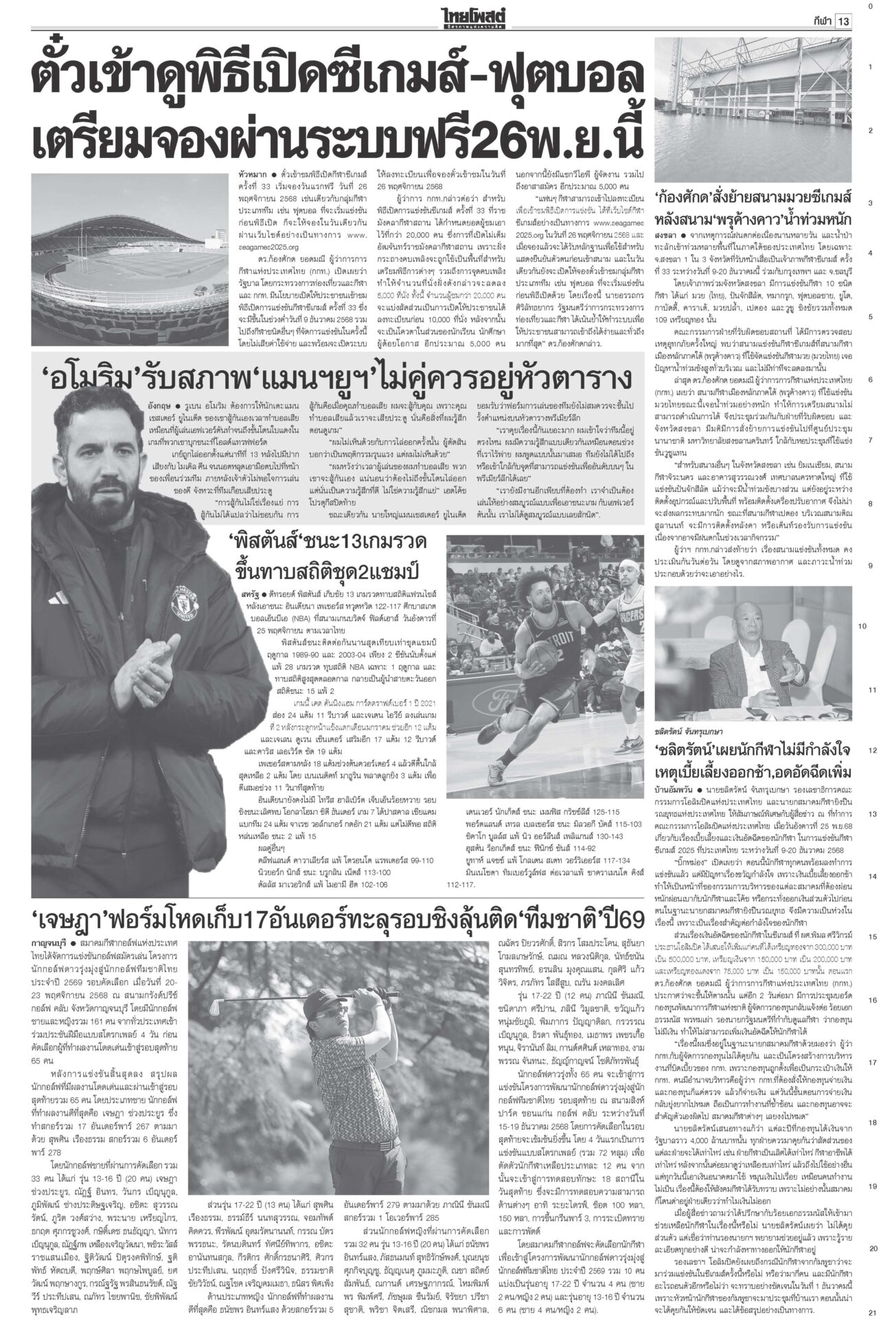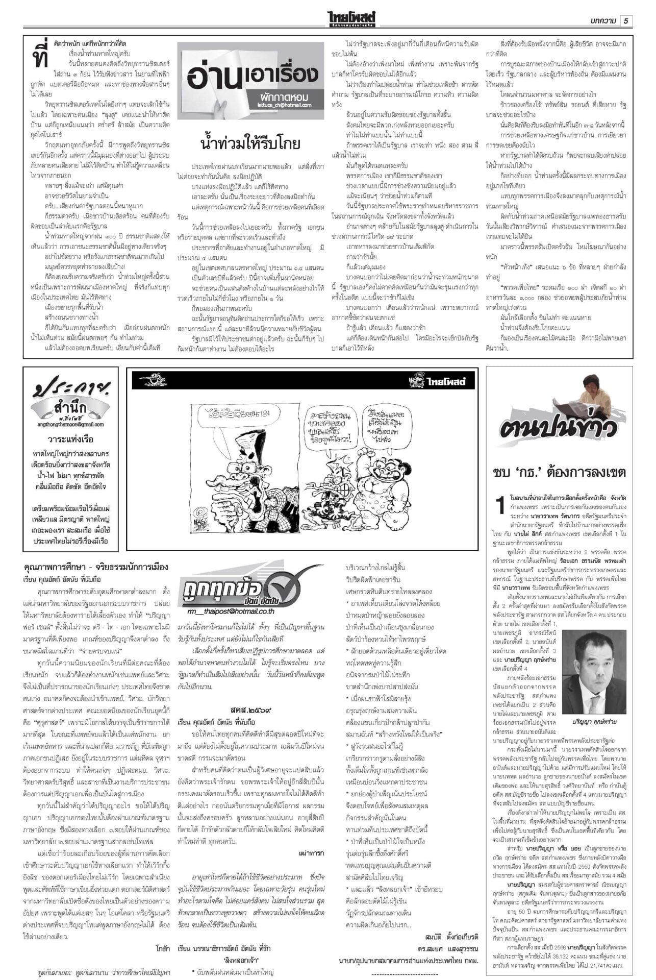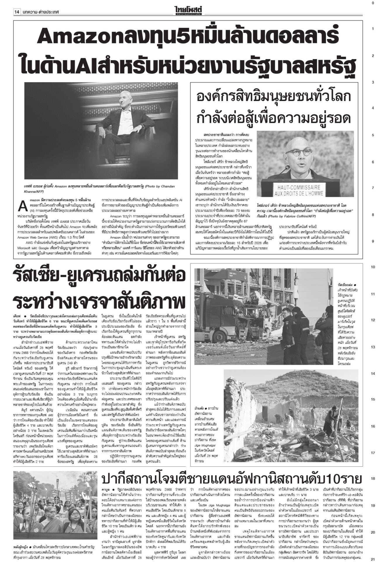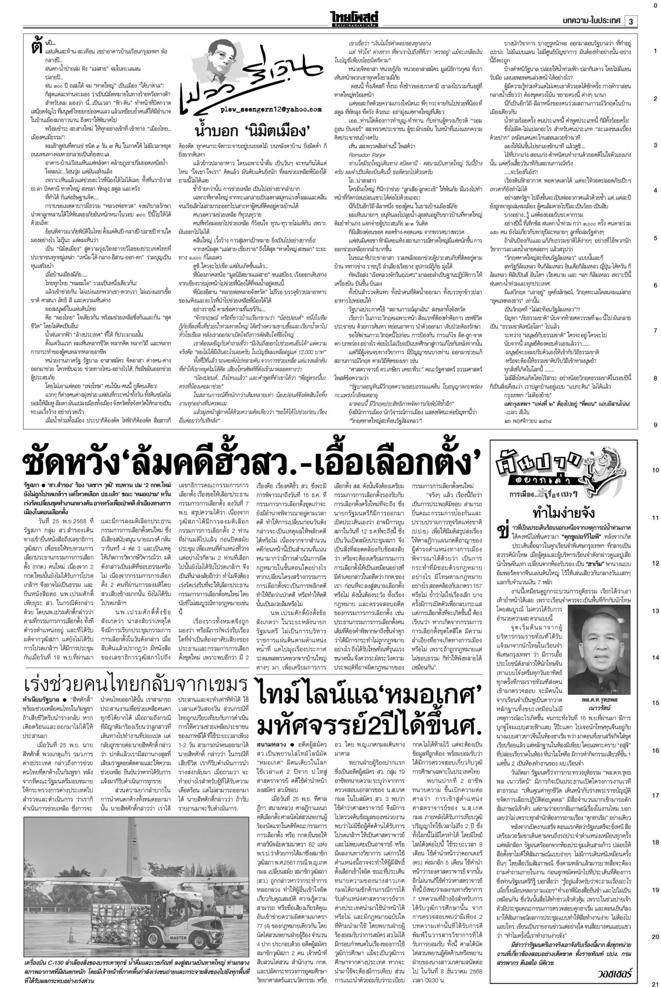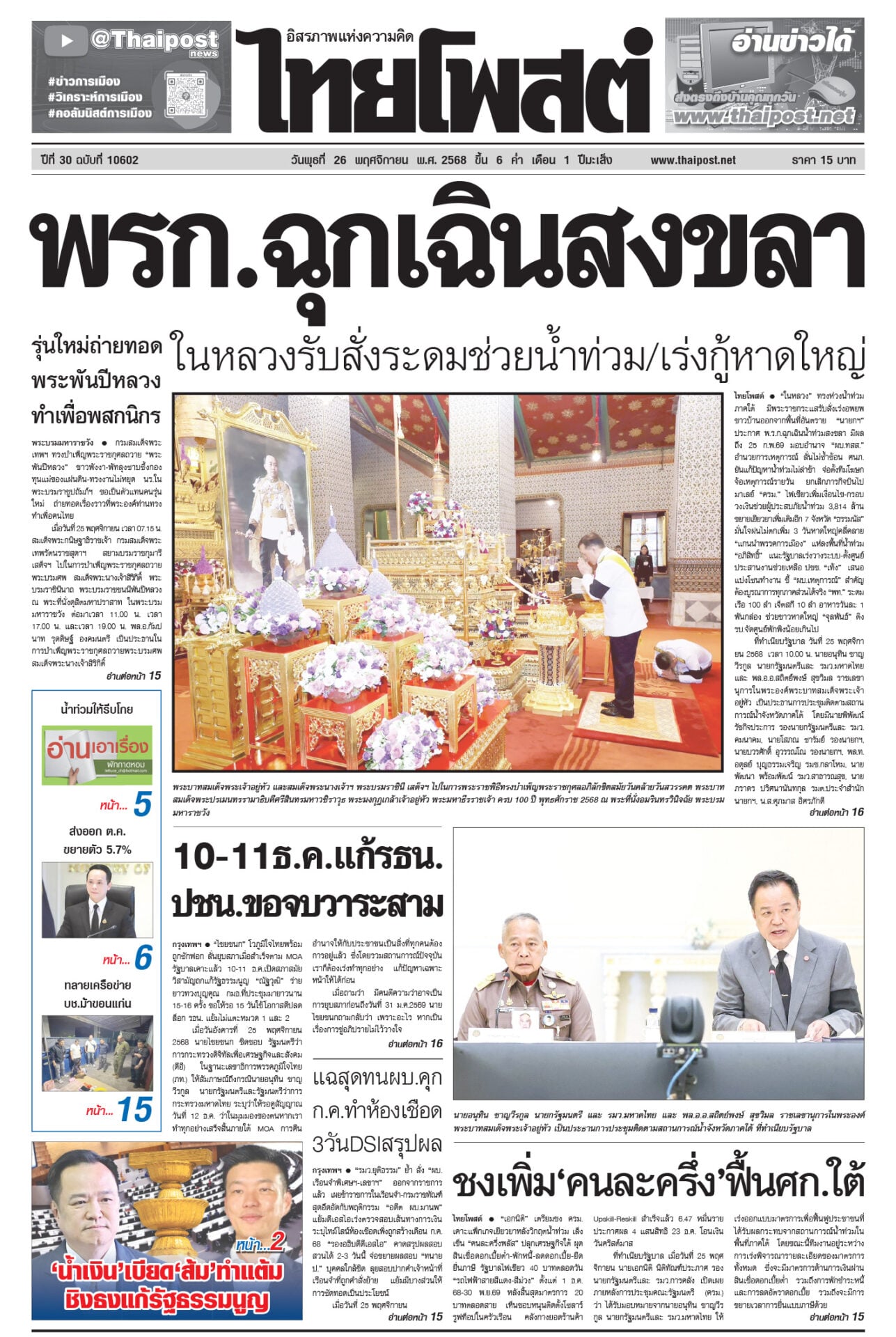 หนังสือพิมพ์ ฉบับวันที่ 26 พฤศจิกายน 2568ข่าวหน้าหนึ่งพรก.ฉุกเฉินสงขลา ในหลวงรับสั่งระดมช่วยน้ำท่วม/เร่งกู้หาดใหญ่“ในหลวง” ทรงห่วงน้ำท่วมภาคใต้ มีพระราชกระแสรับสั่งเร่งอพยพชาวบ้านออกจากพื้นที่อันตราย 10-11ธ.ค.แก้รธน. ปชน.ขอจบวาระสาม“ไชยชนก” โวภูมิใจไทยพร้อมถูกซักฟอก ลั่นยุบสภาเมื่อสำเร็จตาม MOA รัฐบาลเคาะแล้ว 10-11 ธ.ค. ชงเพิ่ม‘คนละครึ่ง’ฟื้นศก.ใต้“เอกนิติ” เตรียมชง ครม.เคาะแพ็กเกจเยียวยาหลังวิกฤตน้ำท่วม แฉสุดทนผบ.คุก ก.ค.ทำห้องเชือด 3วันDSIสรุปผล“รมว.ยุติธรรม” ย้ำ สั่ง “ผบ.เรือนจำพิเศษฯ-เลขาฯ” ออกจากราชการแล้ว รุ่นใหม่ถ่ายทอด พระพันปีหลวง ทำเพื่อพสกนิกรกรมสมเด็จพระเทพฯ ทรงบำเพ็ญพระราชกุศลถวาย “พระพันปีหลวง”