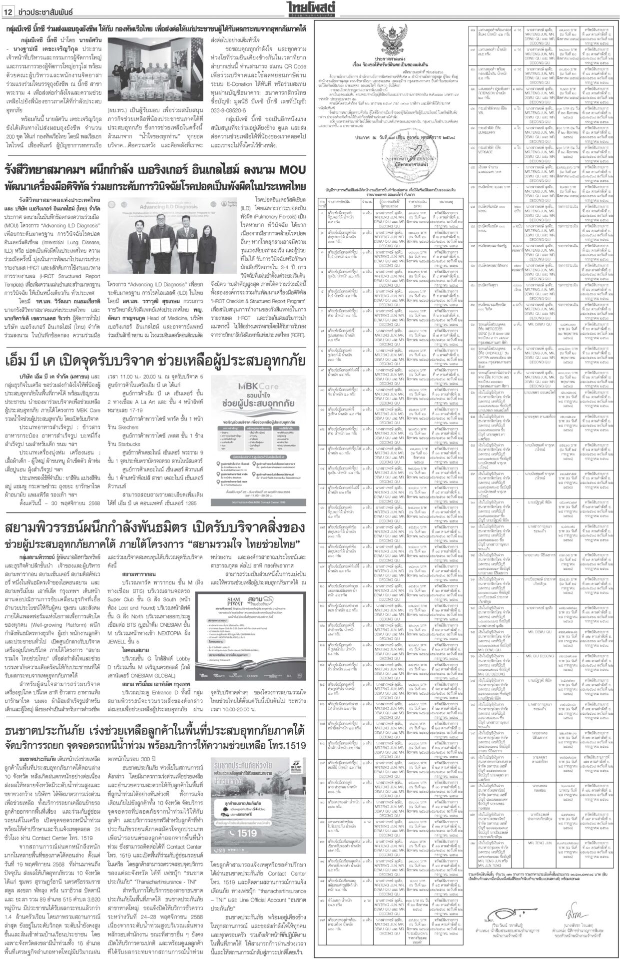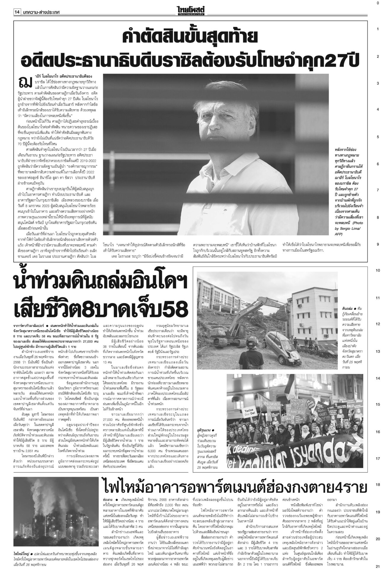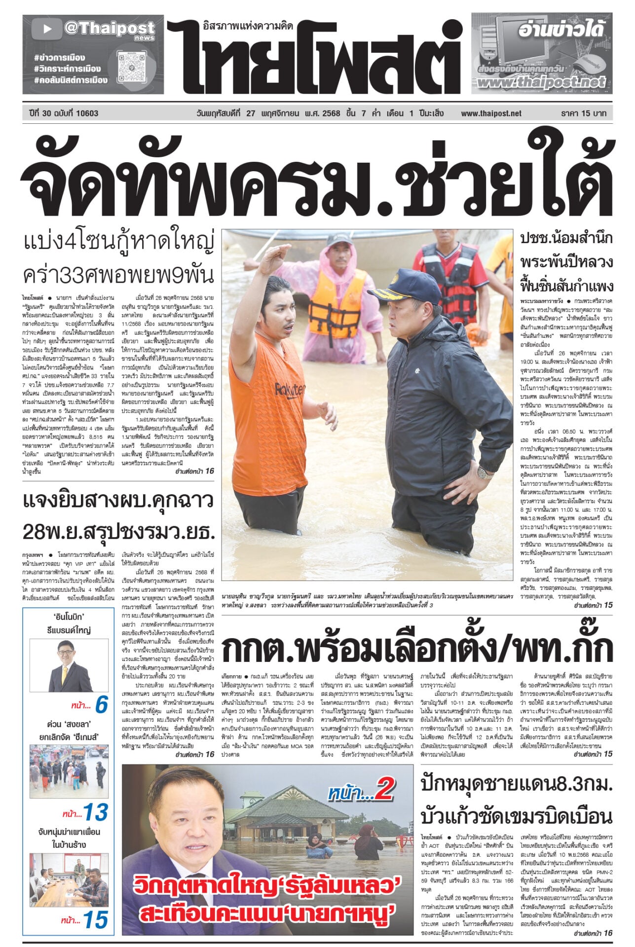 หนังสือพิมพ์ ฉบับวันที่ 27 พฤศจิกายน 2568ข่าวหน้าหนึ่งจัดทัพครม.ช่วยใต้ แบ่ง4โซนกู้หาดใหญ่ คร่า33ศพอพยพ9พันนายกฯ เซ็นคำสั่งแบ่งงาน “รัฐมนตรี” คุมเยียวยาน้ำท่วมใต้รายจังหวัด กกต.พร้อมเลือกตั้ง/พท.กั๊กกมธ.แก้ รธน.เครื่องร้อน เผยได้ข้อสรุปทุกมาตรา รอเข้าวาระ 2 ปักหมุดชายแดน8.3กม. บัวแก้วซัดเขมรบิดเบือนบัวแก้วซัดเขมรยังบิดเบือน ย้ำ AOT ยันทุ่นระเบิดใหม่ “สีหศักดิ์” บินแจงภาคีออตตาวาต้น ธ.ค. แจงวางแนวหมุดชั่วคราว แจงยิบสางผบ.คุกฉาว 28พ.ย.สรุปชงรมว.ยธ.โฆษกกรมราชทัณฑ์เผยคืบหน้าปมตรวจสอบ “คุก VIP เทา” แย้มไล่กวดเอกสารลาพักร้อน “มานพ” อดีต ผบ.คุก-เอกสารการเงินปรับปรุงห้องลับใต้บันได ปชช.น้อมสำนึก พระพันปีหลวง ฟื้นซิ่นสันกำแพงกรมพระศรีสวางควัฒนฯ ทรงบำเพ็ญพระราชกุศลถวาย “สมเด็จพระพันปีหลวง”