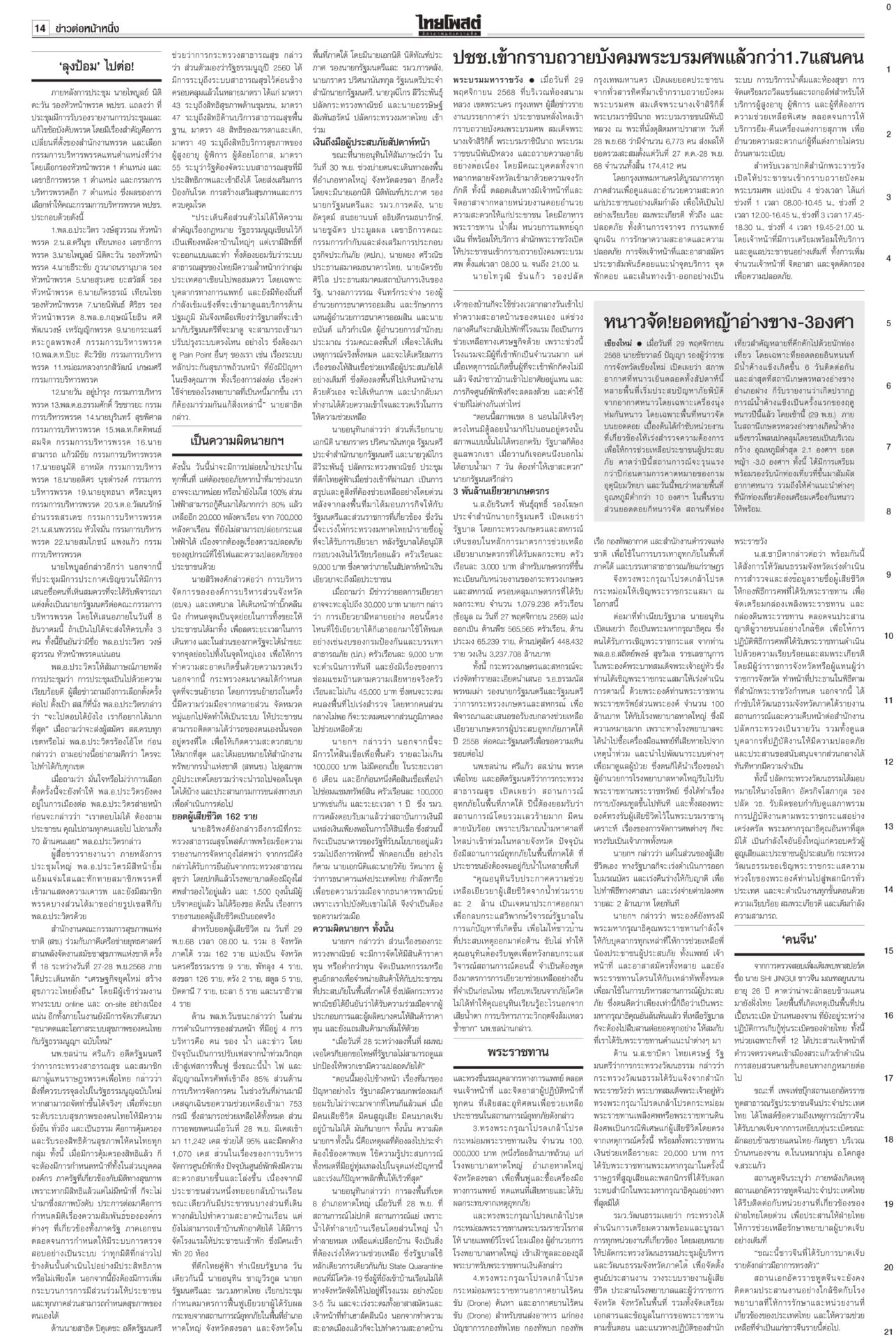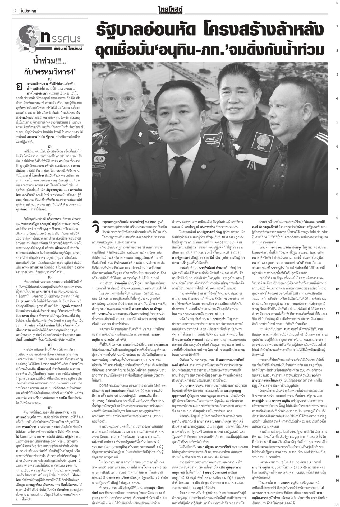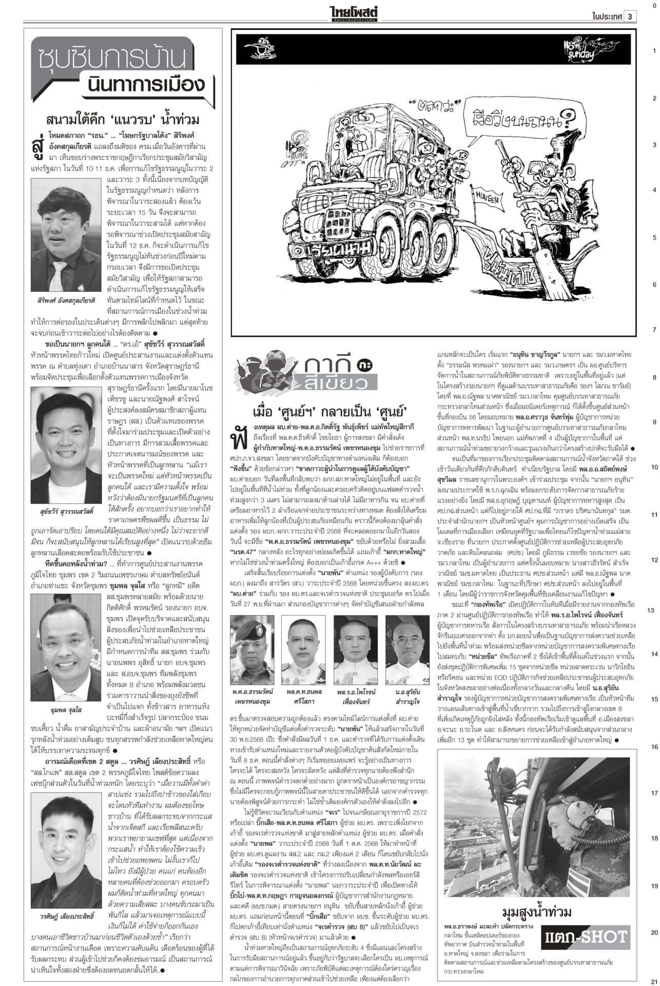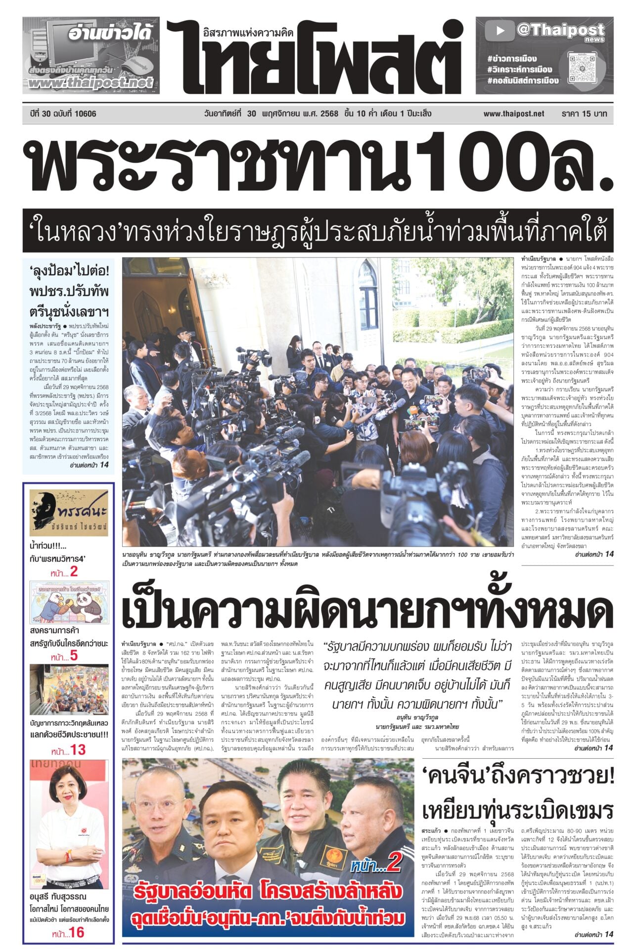 หนังสือพิมพ์ฉบับวันที่ 30 พฤศจิกายน 2568ข่าวหน้าหนึ่งพระราชทาน100ล. ‘ในหลวง’ทรงห่วงใยราษฎรผู้ประสบภัยนํ้าท่วมพื้นที่ภาคใต้นายกฯ โพสต์หนังสือหน่วยราชการในพระองค์ 904 แจ้ง 4 พระราชกระแส ทั้งรับศพผู้เสียชีวิตฯ พระราชทานกำลังใจแพทย์ พระราชทานเงิน ‘คนจีน’ถึงคราวซวย! เหยียบทุ่นระเบิดเขมรกองทัพภาคที่ 1 เผยชาวจีนเหยียบทุ่นระเบิดเขมรที่ชายแดนจังหวัดสระแก้ว หลังลักลอบเข้าเมือง ด้านสถานทูตจีนติดตามสถานการณ์ใกล้ชิด ระบุชายชาวจีนอาการทรงตัว ‘ลุงป้อม’ไปต่อ! พปชร.ปรับทัพ ตรีนุชนั่งเลขาฯพปชร.ปรับทัพใหม่สู้เลือกตั้ง ดัน “ตรีนุช” นั่งเลขาธิการพรรค เสนอชื่อแคนดิเดตนายกฯ 3 เป็นความผิดนายกฯทั้งหมด“ศป.กฉ.” เปิดตัวเลขเสียชีวิต 8 จังหวัดใต้ รวม 162 ราย ไฟฟ้าใช้ได้แล้ว 80% ด้าน “อนุทิน” ยอมรับบกพร่อง ย้ำขอโทษ มีคนเสียชีวิต มีคนสูญเสีย