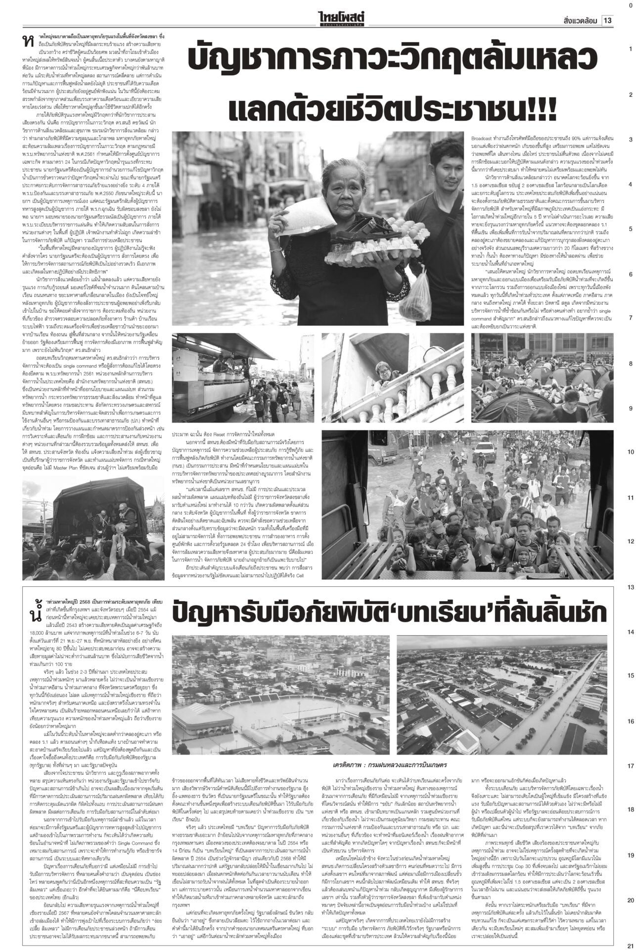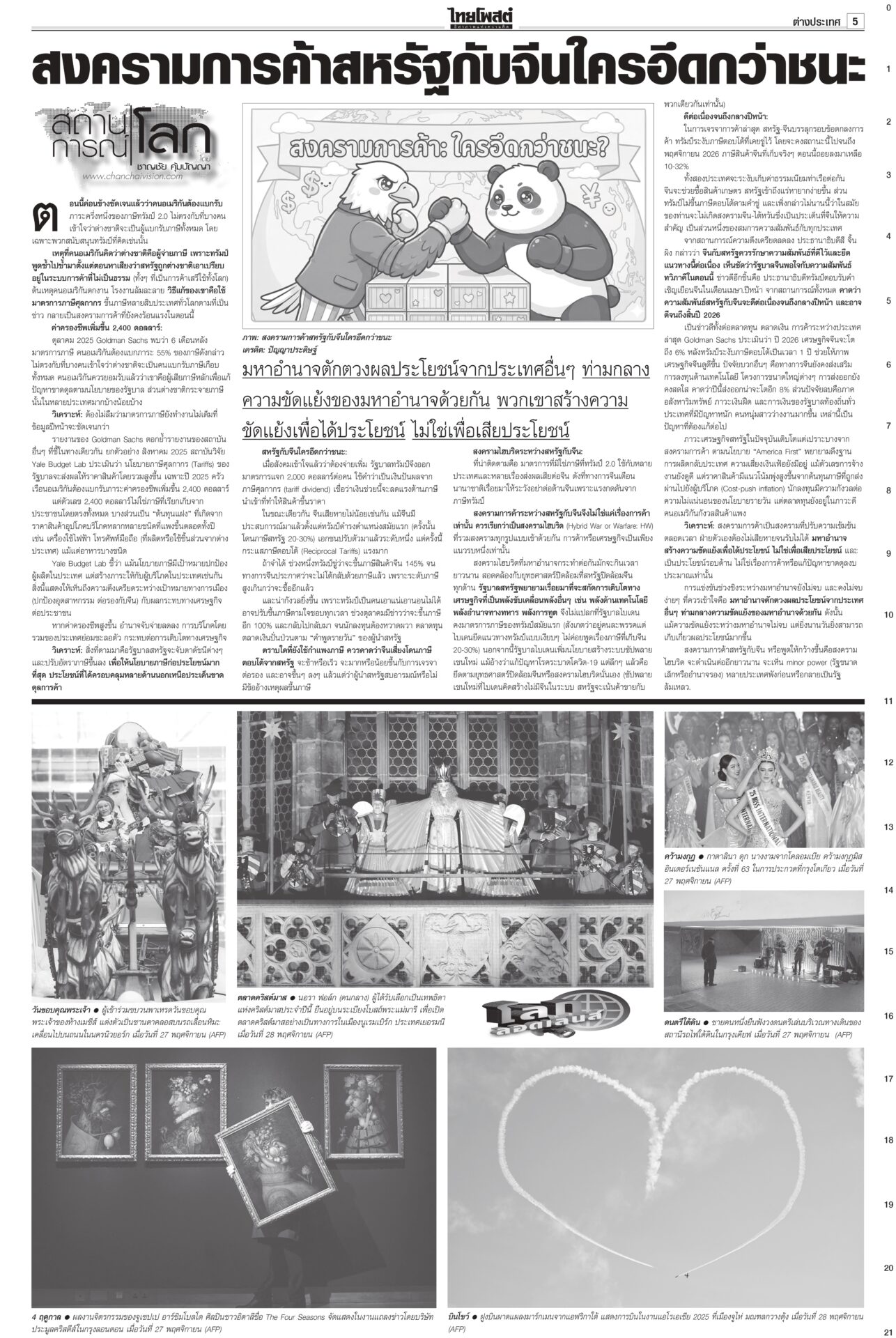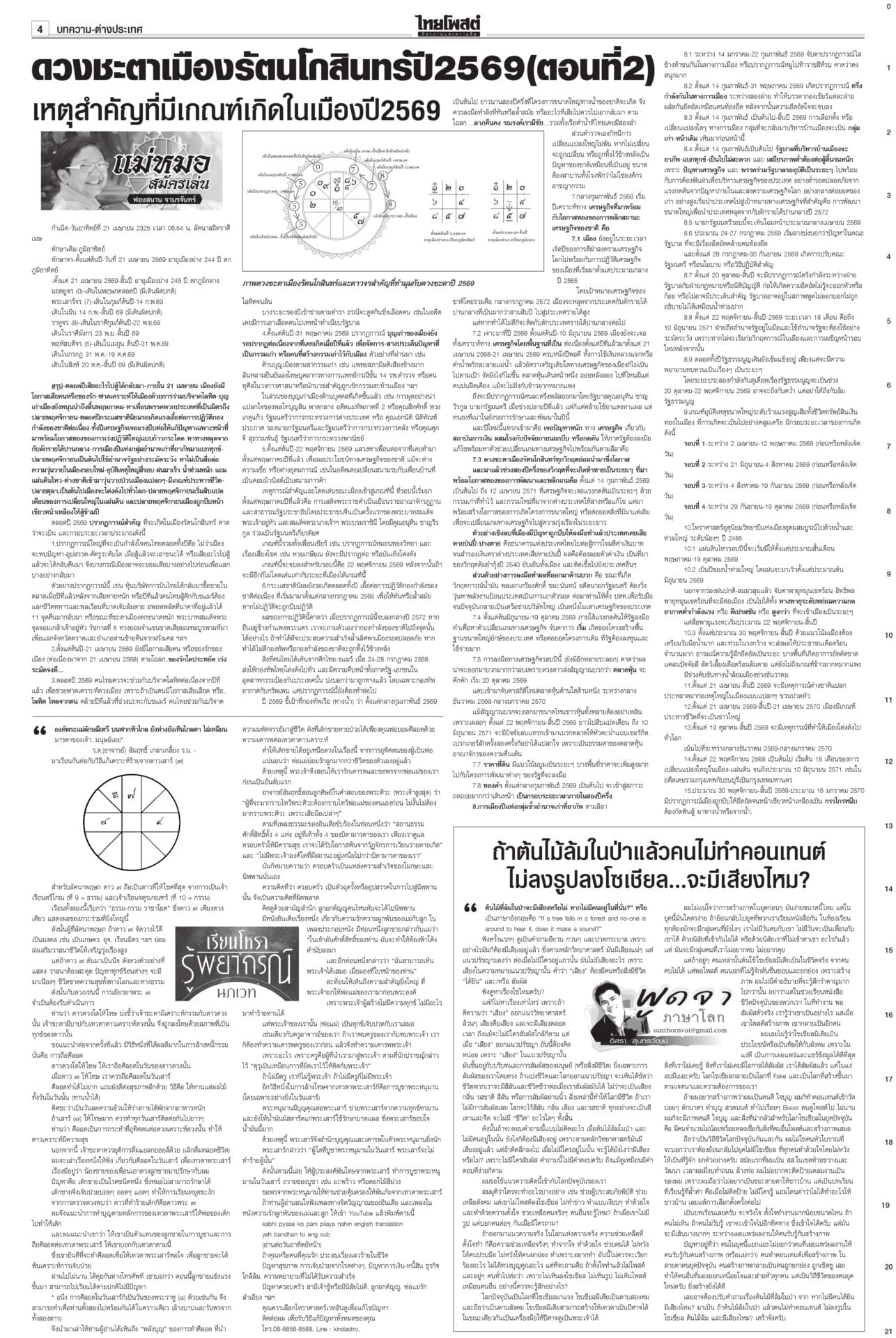 ฉบับวันที่ 30 พฤศจิกายน 2568 30 พฤศจิกายน 2568 เวลา 0:01 น. หนังสือพิมพ์ฉบับวันที่ 30 พฤศจิกายน 2568ข่าวหน้าหนึ่งพระราชทาน100ล. ‘ในหลวง’ทรงห่วงใยราษฎรผู้ประสบภัยนํ้าท่วมพื้นที่ภาคใต้นายกฯ โพสต์หนังสือหน่วยราชการในพระองค์ 904 แจ้ง 4 พระราชกระแส ทั้งรับศพผู้เสียชีวิตฯ พระราชทานกำลังใจแพทย์ พระราชทานเงิน ‘คนจีน’ถึงคราวซวย! เหยียบทุ่นระเบิดเขมรกองทัพภาคที่ 1 เผยชาวจีนเหยียบทุ่นระเบิดเขมรที่ชายแดนจังหวัดสระแก้ว หลังลักลอบเข้าเมือง ด้านสถานทูตจีนติดตามสถานการณ์ใกล้ชิด ระบุชายชาวจีนอาการทรงตัว ‘ลุงป้อม’ไปต่อ! พปชร.ปรับทัพ ตรีนุชนั่งเลขาฯพปชร.ปรับทัพใหม่สู้เลือกตั้ง ดัน “ตรีนุช” นั่งเลขาธิการพรรค เสนอชื่อแคนดิเดตนายกฯ 3 เป็นความผิดนายกฯทั้งหมด“ศป.กฉ.” เปิดตัวเลขเสียชีวิต 8 จังหวัดใต้ รวม 162 ราย ไฟฟ้าใช้ได้แล้ว 80% ด้าน “อนุทิน” ยอมรับบกพร่อง ย้ำขอโทษ มีคนเสียชีวิต มีคนสูญเสีย Tagsรายวันหนังสือพิมพ์ ข่าวที่เกี่ยวข้อง ฉบับวันที่ 5 ธันวาคม 2568 ฉบับวันที่ 4 ธันวาคม 2568 ฉบับวันที่ 3 ธันวาคม 2568 ฉบับวันที่ 2 ธันวาคม 2568 ฉบับวันที่ 1 ธันวาคม 2568 ฉบับวันที่ 29 พฤศจิกายน 2568 NEWS UPDATE 10:46 น. 'อดีตผู้พิพากษา' อธิบาย 'ปิดงานงดจ้าง' กับ 'หยุดกิจการ' เหตุข้อพิพาทแรงงาน 'ไดกิ้น ' 10:36 น. 'อนุทิน' สวน พท. ใครทำงานห่วย ยุครัฐบาลนิด-อิ๊งค์ ติดโพลอันดับ 2 10:06 น. ใครกล้าทำ นายกฯ โวทำงาน2เดือนปราบสแกมเมอร์ ยึดเงินหมื่นล้าน คนบอกไม่ดำเนินคดีไม่รู้เรื่อง 9:59 น. บึ้มสนั่น! หนุ่มโรงงานลอบทำพลุขายปีใหม่ พลาดเจ็บสาหัส 9:46 น. แห่กันโชว์ภูมิ! จี้เลิกหลักสูตรผู้บริหารระดับสูง ‘คอนเนคชัน=คอร์รัปชัน’
