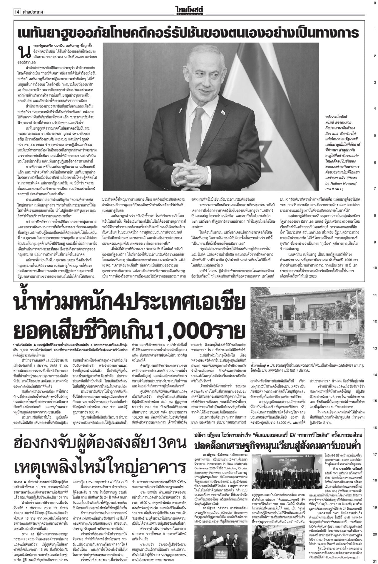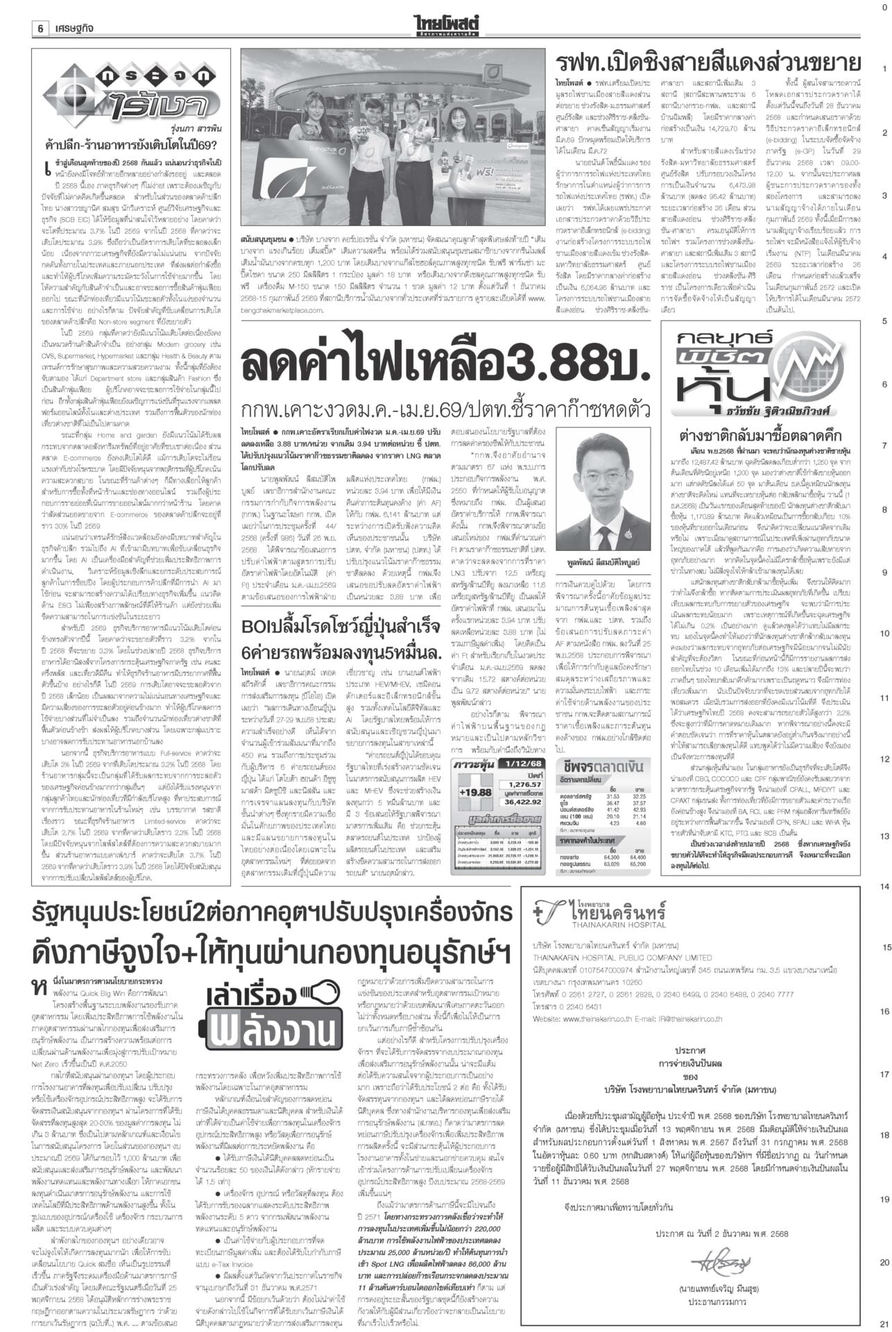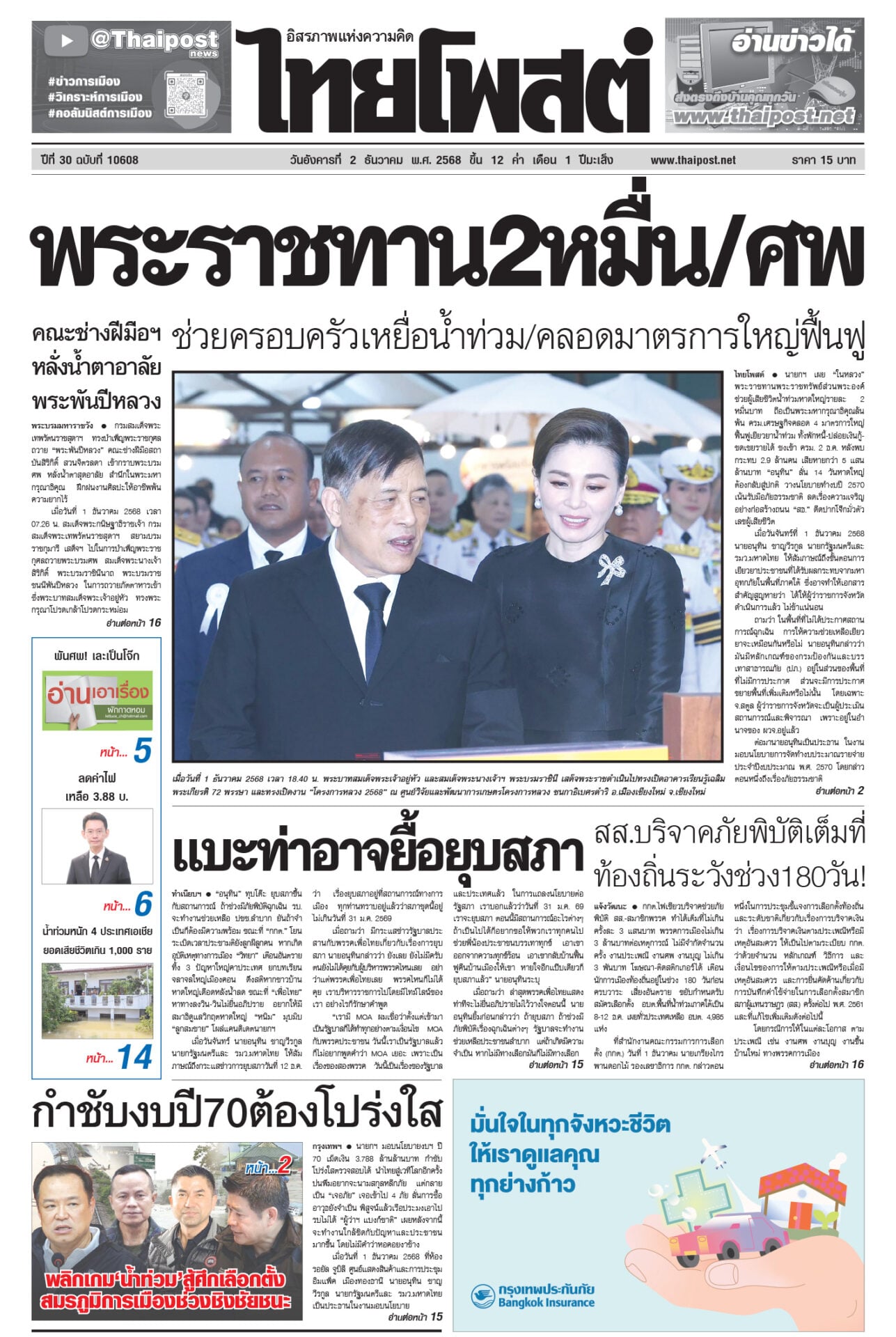 หนังสือพิมพ์ ฉบับวันที่ 2 ธันวาคม 2568ข่าวหน้าหนึ่งพระราชทาน2หมื่น/ศพ ช่วยครอบครัวเหยื่อน้ำท่วม/คลอดมาตรการใหญ่ฟื้นฟูนายกฯ เผย “ในหลวง” พระราชทานพระราชทรัพย์ส่วนพระองค์ แบะท่าอาจยื้อยุบสภา“อนุทิน” ทุบโต๊ะ ยุบสภาขึ้นกับสถานการณ์ ถ้าช่วงมีภัยพิบัติฉุกเฉิน กำชับงบปี70ต้องโปร่งใสนายกฯ มอบนโยบายงบฯ ปี 70 เม็ดเงิน 3.788 ล้านล้านบาท กำชับโปร่งใสตรวจสอบได้ สส.บริจาคภัยพิบัติเต็มที่ ท้องถิ่นระวังช่วง180วัน!กกต.ไฟเขียวบริจาคช่วยภัยพิบัติ สส.-สมาชิกพรรค ทำได้เต็มที่ไม่เกินครั้งละ 3 แสนบาท คณะช่างฝีมือฯ หลั่งน้ำตาอาลัย พระพันปีหลวงกรมสมเด็จพระเทพรัตนราชสุดาฯ ทรงบำเพ็ญพระราชกุศลถวาย “พระพันปีหลวง”