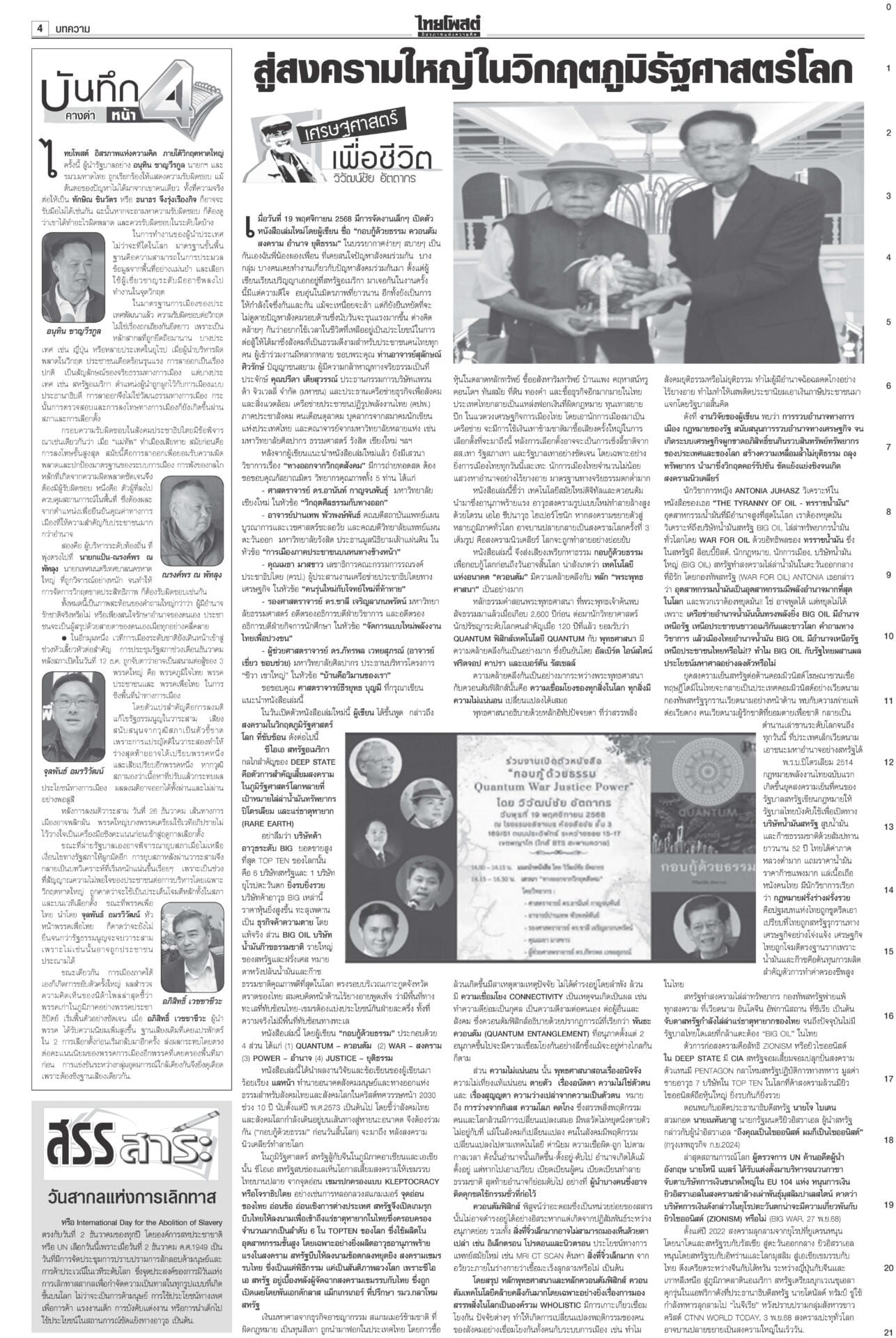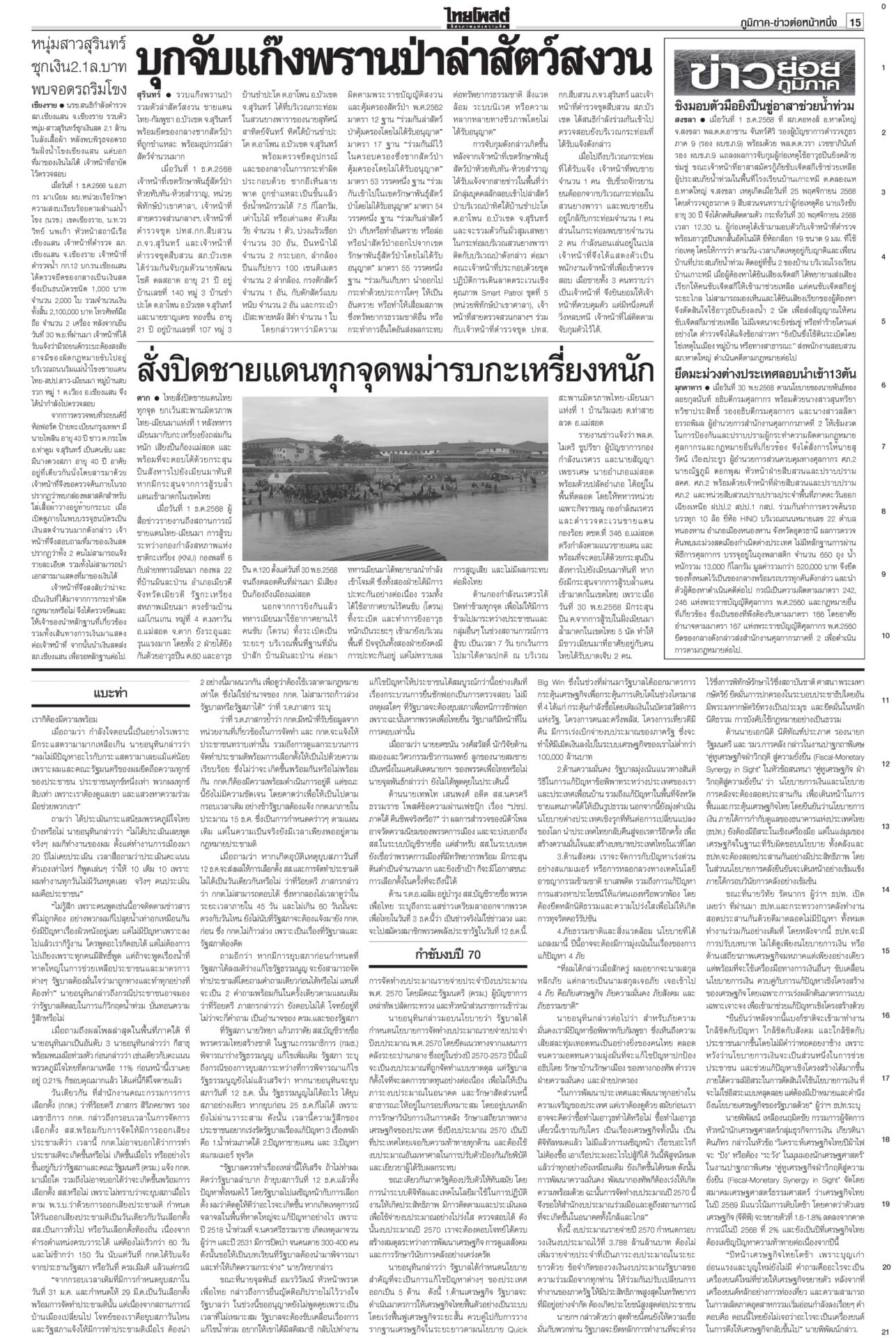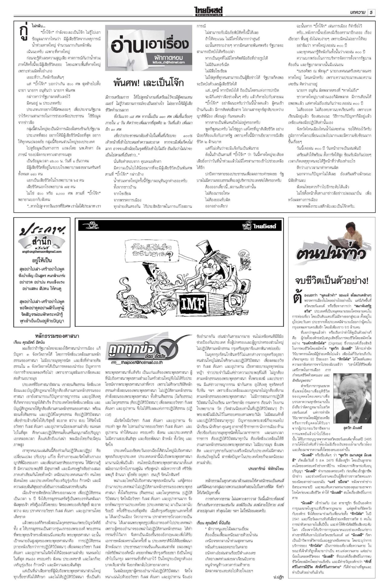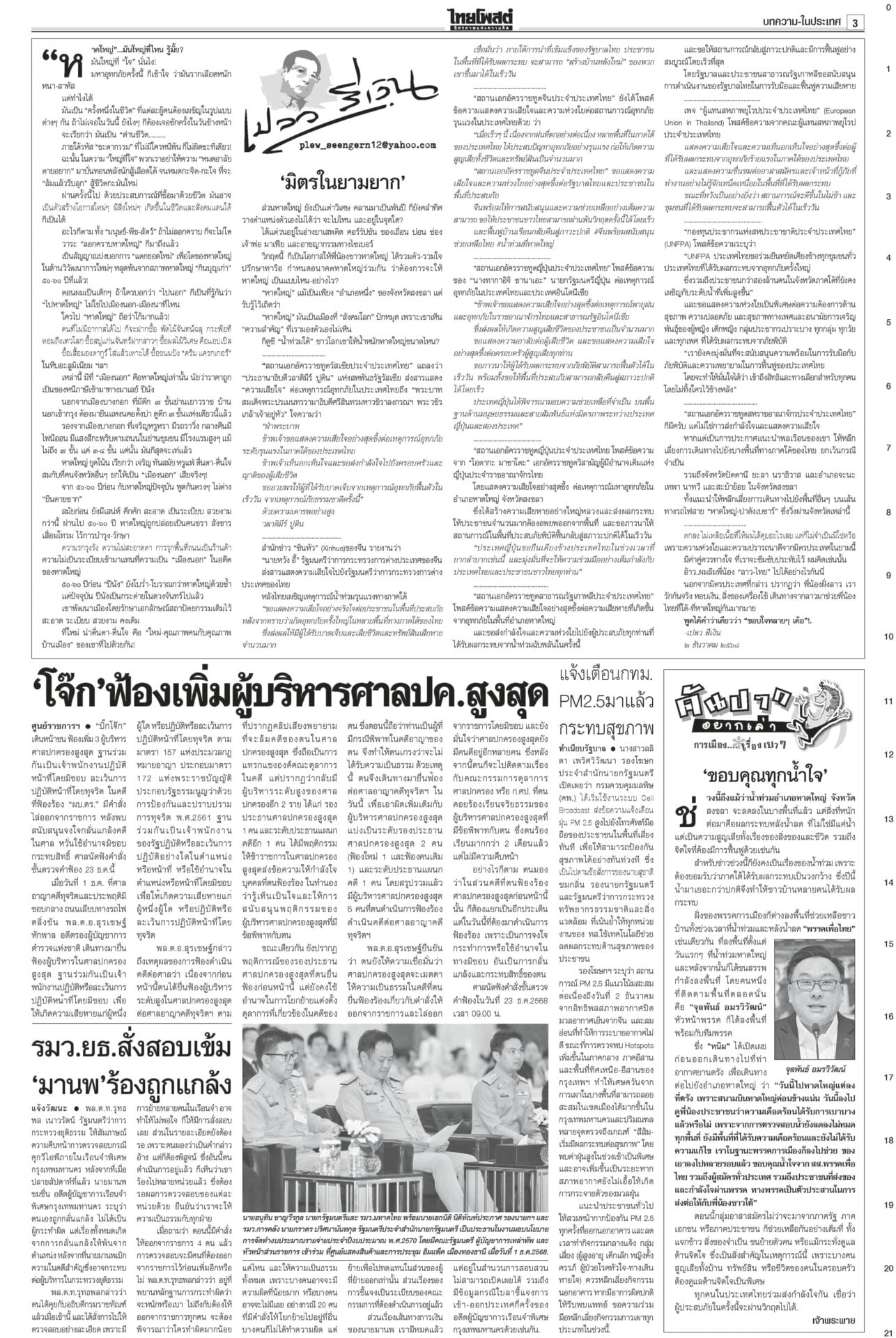 ฉบับวันที่ 2 ธันวาคม 2568 2 ธันวาคม 2568 เวลา 0:01 น. หนังสือพิมพ์ ฉบับวันที่ 2 ธันวาคม 2568ข่าวหน้าหนึ่งพระราชทาน2หมื่น/ศพ ช่วยครอบครัวเหยื่อน้ำท่วม/คลอดมาตรการใหญ่ฟื้นฟูนายกฯ เผย “ในหลวง” พระราชทานพระราชทรัพย์ส่วนพระองค์ แบะท่าอาจยื้อยุบสภา“อนุทิน” ทุบโต๊ะ ยุบสภาขึ้นกับสถานการณ์ ถ้าช่วงมีภัยพิบัติฉุกเฉิน กำชับงบปี70ต้องโปร่งใสนายกฯ มอบนโยบายงบฯ ปี 70 เม็ดเงิน 3.788 ล้านล้านบาท กำชับโปร่งใสตรวจสอบได้ สส.บริจาคภัยพิบัติเต็มที่ ท้องถิ่นระวังช่วง180วัน!กกต.ไฟเขียวบริจาคช่วยภัยพิบัติ สส.-สมาชิกพรรค ทำได้เต็มที่ไม่เกินครั้งละ 3 แสนบาท คณะช่างฝีมือฯ หลั่งน้ำตาอาลัย พระพันปีหลวงกรมสมเด็จพระเทพรัตนราชสุดาฯ ทรงบำเพ็ญพระราชกุศลถวาย “พระพันปีหลวง” Tagsรายวันหนังสือพิมพ์ ข่าวที่เกี่ยวข้อง ฉบับวันที่ 5 ธันวาคม 2568 ฉบับวันที่ 4 ธันวาคม 2568 ฉบับวันที่ 3 ธันวาคม 2568 ฉบับวันที่ 1 ธันวาคม 2568 ฉบับวันที่ 30 พฤศจิกายน 2568 ฉบับวันที่ 29 พฤศจิกายน 2568 NEWS UPDATE 10:46 น. 'อดีตผู้พิพากษา' อธิบาย 'ปิดงานงดจ้าง' กับ 'หยุดกิจการ' เหตุข้อพิพาทแรงงาน 'ไดกิ้น ' 10:36 น. 'อนุทิน' สวน พท. ใครทำงานห่วย ยุครัฐบาลนิด-อิ๊งค์ ติดโพลอันดับ 2 10:06 น. ใครกล้าทำ นายกฯ โวทำงาน2เดือนปราบสแกมเมอร์ ยึดเงินหมื่นล้าน คนบอกไม่ดำเนินคดีไม่รู้เรื่อง 9:59 น. บึ้มสนั่น! หนุ่มโรงงานลอบทำพลุขายปีใหม่ พลาดเจ็บสาหัส 9:46 น. แห่กันโชว์ภูมิ! จี้เลิกหลักสูตรผู้บริหารระดับสูง ‘คอนเนคชัน=คอร์รัปชัน’