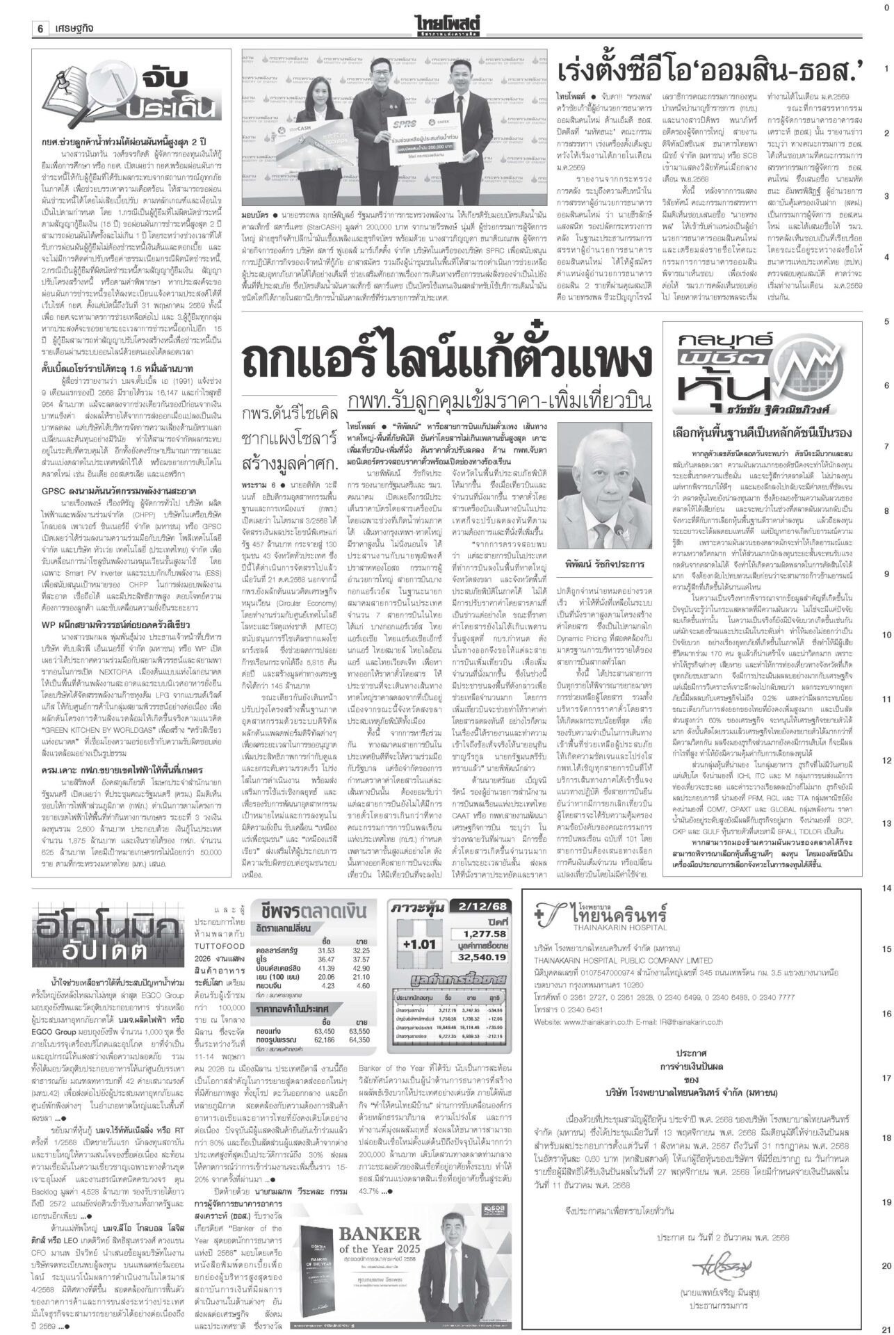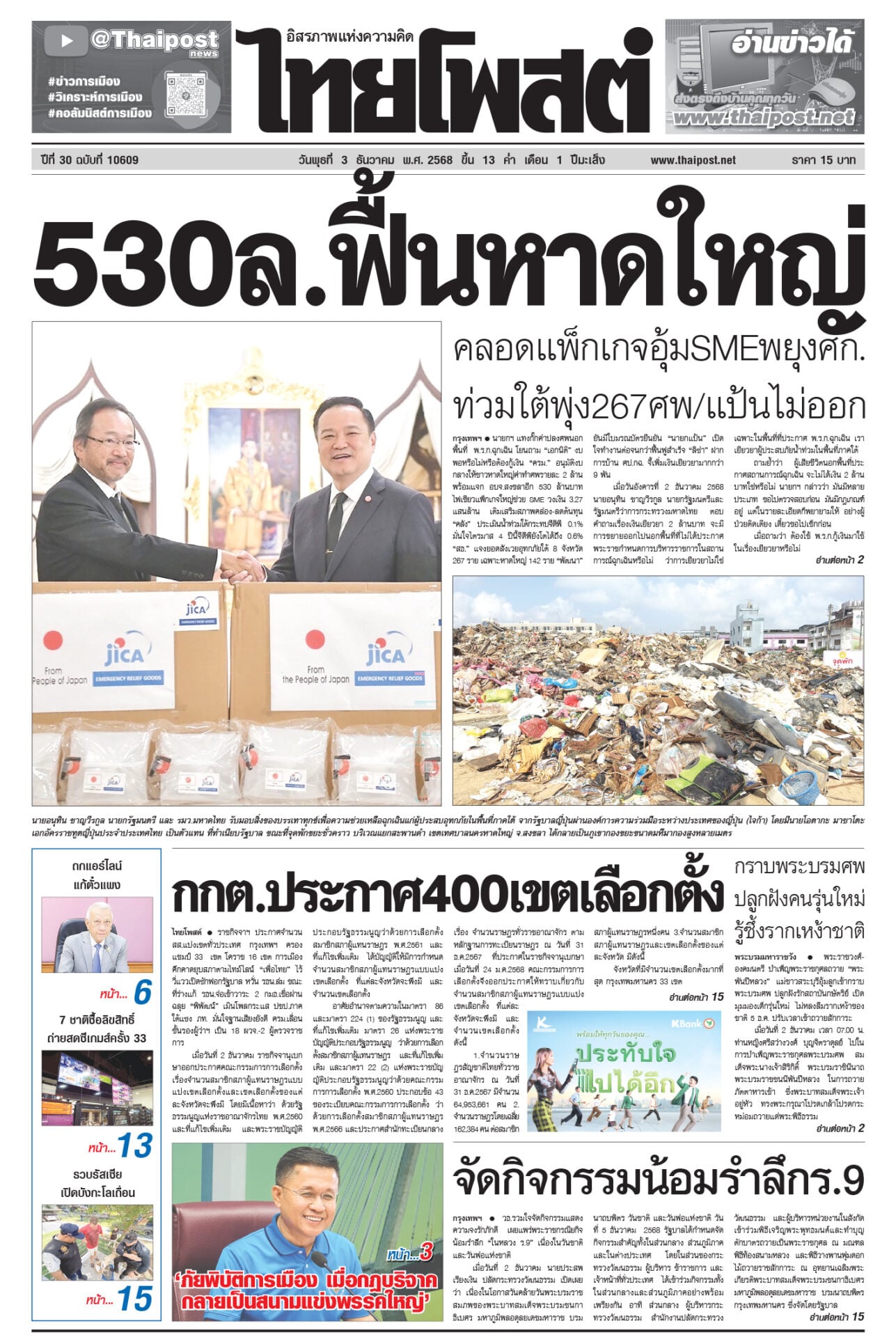 หนังสือพิมพ์ ฉบับวันที่ 3 ธันวาคม 2568ข่าวหน้าหนึ่ง530ล.ฟื้นหาดใหญ่ คลอดแพ็กเกจอุ้มSMEพยุงศก. ท่วมใต้พุ่ง267ศพ/แป้นไม่ออกนายกฯ แทงกั๊กค่าปลงศพนอกพื้นที่ พ.ร.ก.ฉุกเฉิน โยนถาม “เอกนิติ” งบพอหรือไม่หรือต้องกู้เงิน “ครม.” อนุมัติงบกลางให้ชาวหาดใหญ่ค่าทำศพรายละ 2 ล้าน กกต.ประกาศ400เขตเลือกตั้งราชกิจจาฯ ประกาศจำนวน สส.แบ่งเขตทั่วประเทศ กรุงเทพฯ ครอ… กราบพระบรมศพ ปลูกฝังคนรุ่นใหม่ รู้ซึ้งรากเหง้าชาติพระราชวงศ์-องคมนตรี บำเพ็ญพระราชกุศลถวาย “พระพันปีหลวง” แม่ชาวสระบุรีอุ้มลูกเข้ากราบพระบรมศพ จัดกิจกรรมน้อมรำลึกร.9วธ.รวมใจจัดกิจกรรมแสดงความจงรักภักดี เผยแพร่พระราชกรณียกิจ