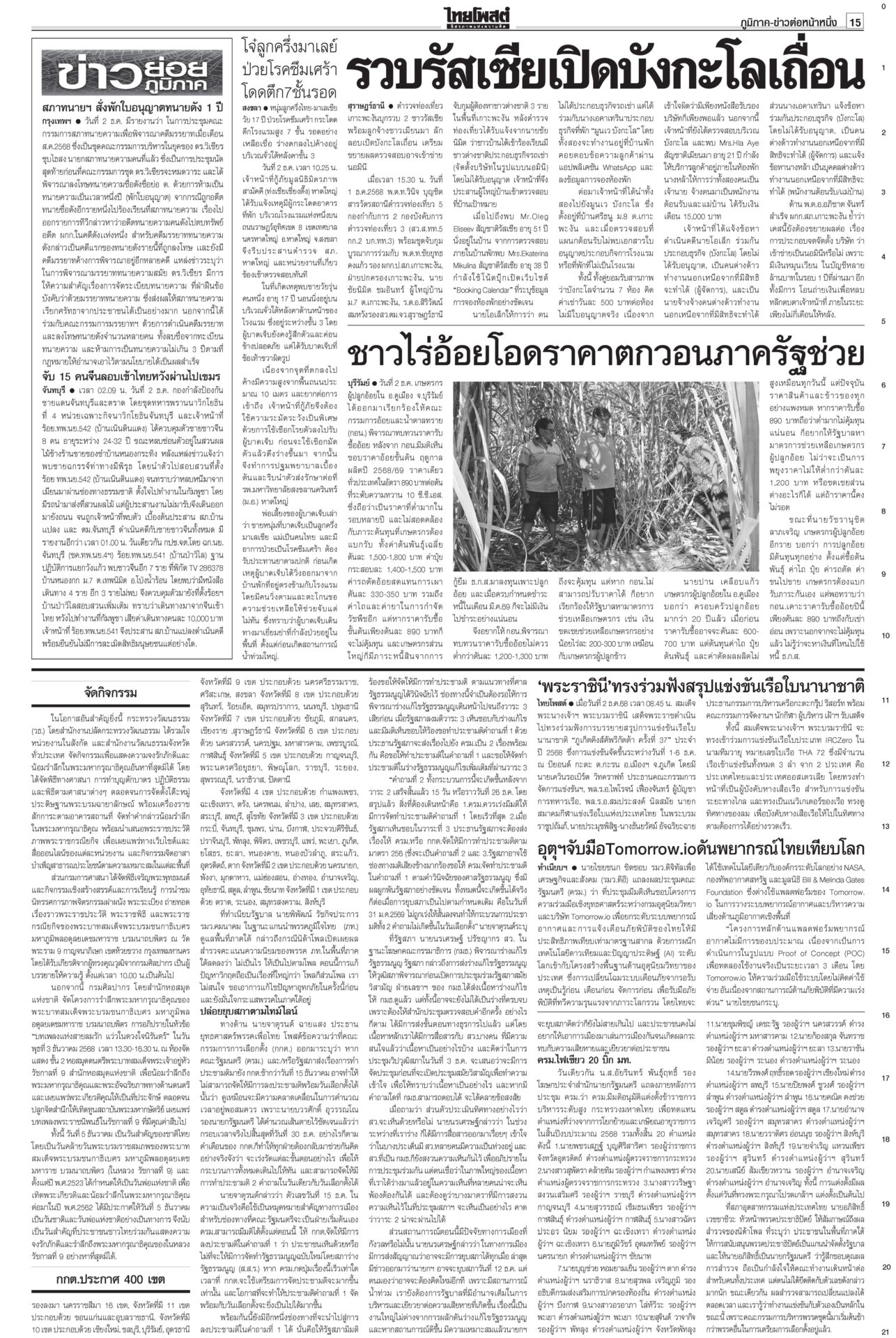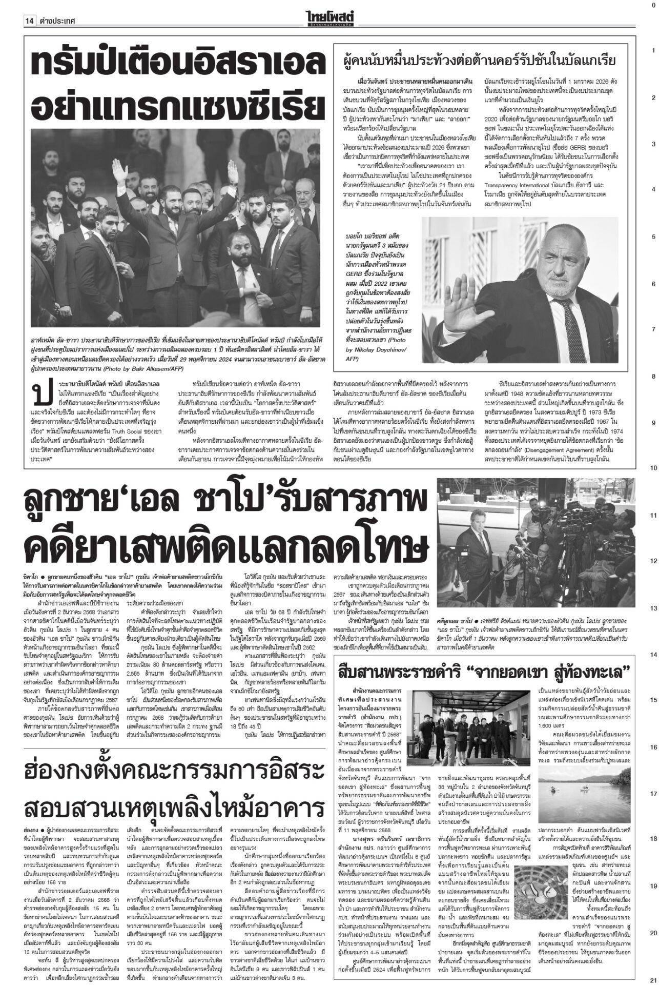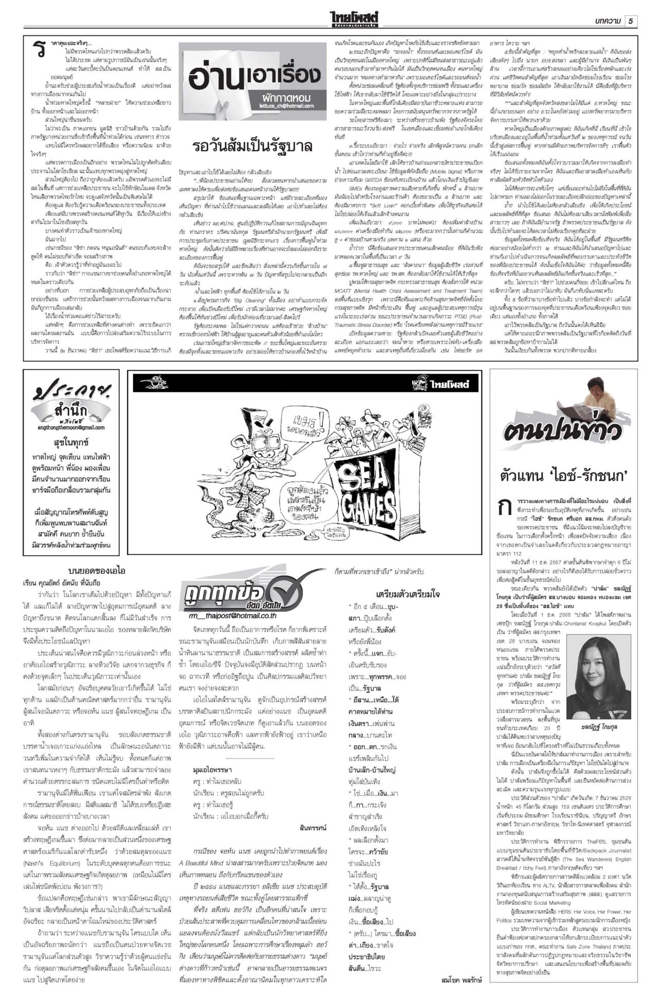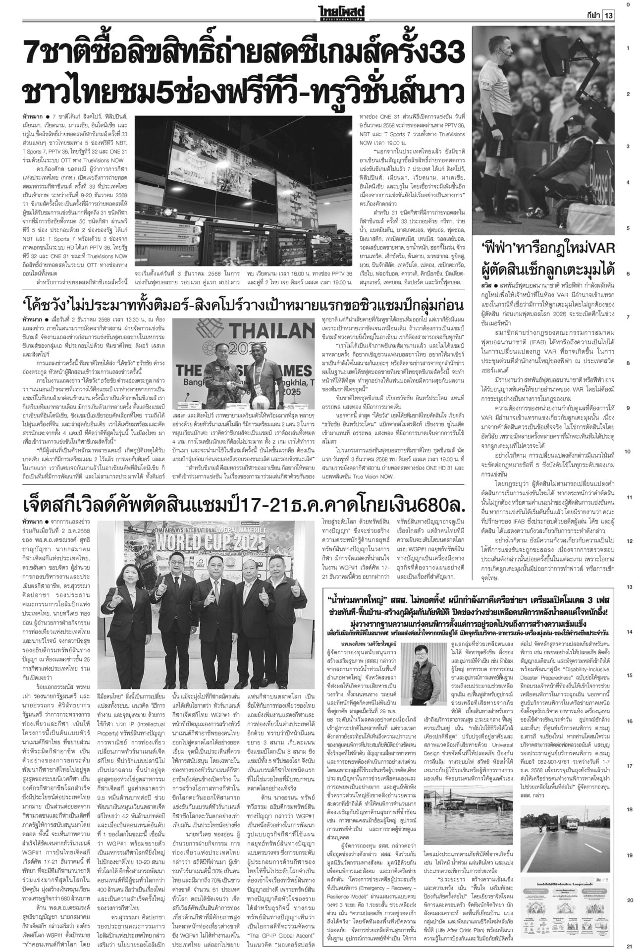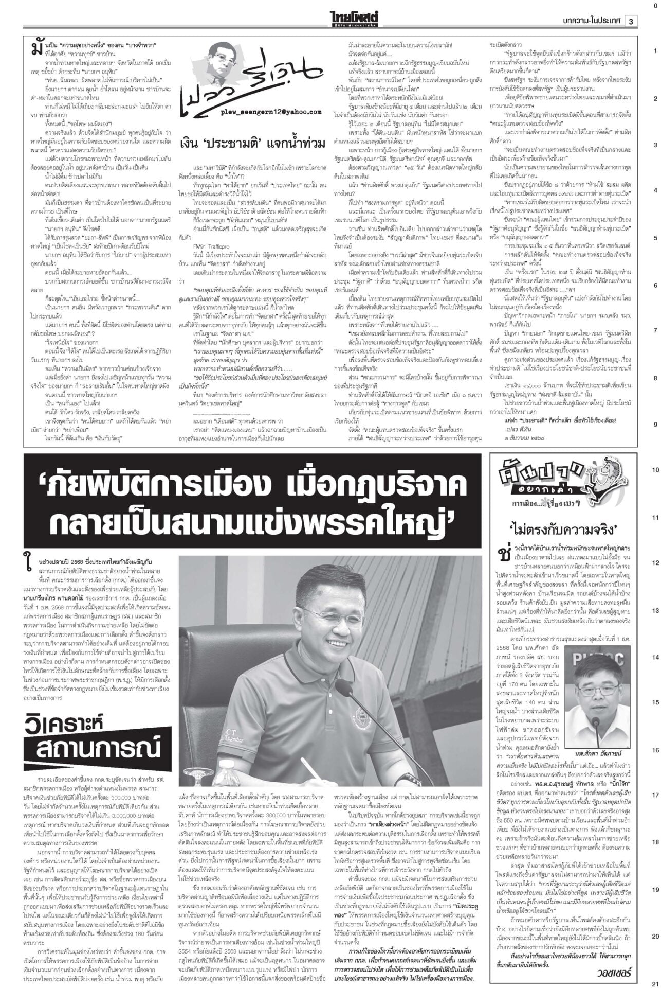 ฉบับวันที่ 3 ธันวาคม 2568 3 ธันวาคม 2568 เวลา 0:01 น. หนังสือพิมพ์ ฉบับวันที่ 3 ธันวาคม 2568ข่าวหน้าหนึ่ง530ล.ฟื้นหาดใหญ่ คลอดแพ็กเกจอุ้มSMEพยุงศก. ท่วมใต้พุ่ง267ศพ/แป้นไม่ออกนายกฯ แทงกั๊กค่าปลงศพนอกพื้นที่ พ.ร.ก.ฉุกเฉิน โยนถาม “เอกนิติ” งบพอหรือไม่หรือต้องกู้เงิน “ครม.” อนุมัติงบกลางให้ชาวหาดใหญ่ค่าทำศพรายละ 2 ล้าน กกต.ประกาศ400เขตเลือกตั้งราชกิจจาฯ ประกาศจำนวน สส.แบ่งเขตทั่วประเทศ กรุงเทพฯ ครอ… กราบพระบรมศพ ปลูกฝังคนรุ่นใหม่ รู้ซึ้งรากเหง้าชาติพระราชวงศ์-องคมนตรี บำเพ็ญพระราชกุศลถวาย “พระพันปีหลวง” แม่ชาวสระบุรีอุ้มลูกเข้ากราบพระบรมศพ จัดกิจกรรมน้อมรำลึกร.9วธ.รวมใจจัดกิจกรรมแสดงความจงรักภักดี เผยแพร่พระราชกรณียกิจ Tagsรายวันหนังสือพิมพ์ ข่าวที่เกี่ยวข้อง ฉบับวันที่ 5 ธันวาคม 2568 ฉบับวันที่ 4 ธันวาคม 2568 ฉบับวันที่ 2 ธันวาคม 2568 ฉบับวันที่ 1 ธันวาคม 2568 ฉบับวันที่ 30 พฤศจิกายน 2568 ฉบับวันที่ 29 พฤศจิกายน 2568 NEWS UPDATE 10:46 น. 'อดีตผู้พิพากษา' อธิบาย 'ปิดงานงดจ้าง' กับ 'หยุดกิจการ' เหตุข้อพิพาทแรงงาน 'ไดกิ้น ' 10:36 น. 'อนุทิน' สวน พท. ใครทำงานห่วย ยุครัฐบาลนิด-อิ๊งค์ ติดโพลอันดับ 2 10:06 น. ใครกล้าทำ นายกฯ โวทำงาน2เดือนปราบสแกมเมอร์ ยึดเงินหมื่นล้าน คนบอกไม่ดำเนินคดีไม่รู้เรื่อง 9:59 น. บึ้มสนั่น! หนุ่มโรงงานลอบทำพลุขายปีใหม่ พลาดเจ็บสาหัส 9:46 น. แห่กันโชว์ภูมิ! จี้เลิกหลักสูตรผู้บริหารระดับสูง ‘คอนเนคชัน=คอร์รัปชัน’