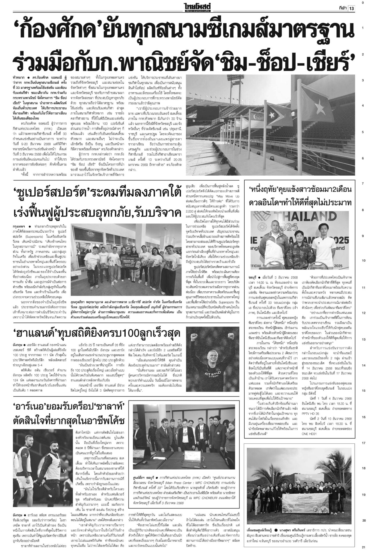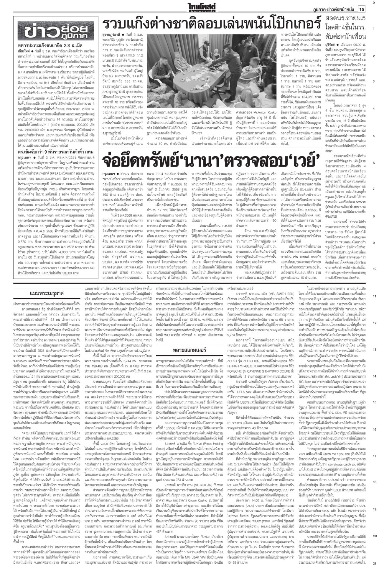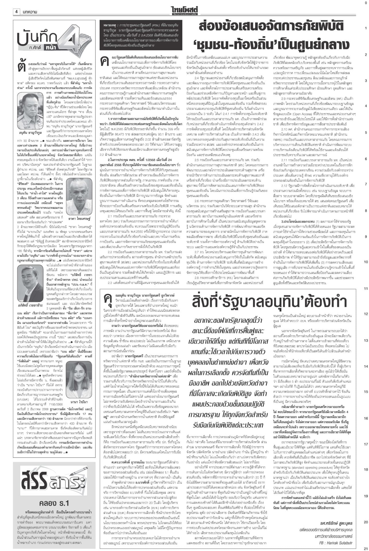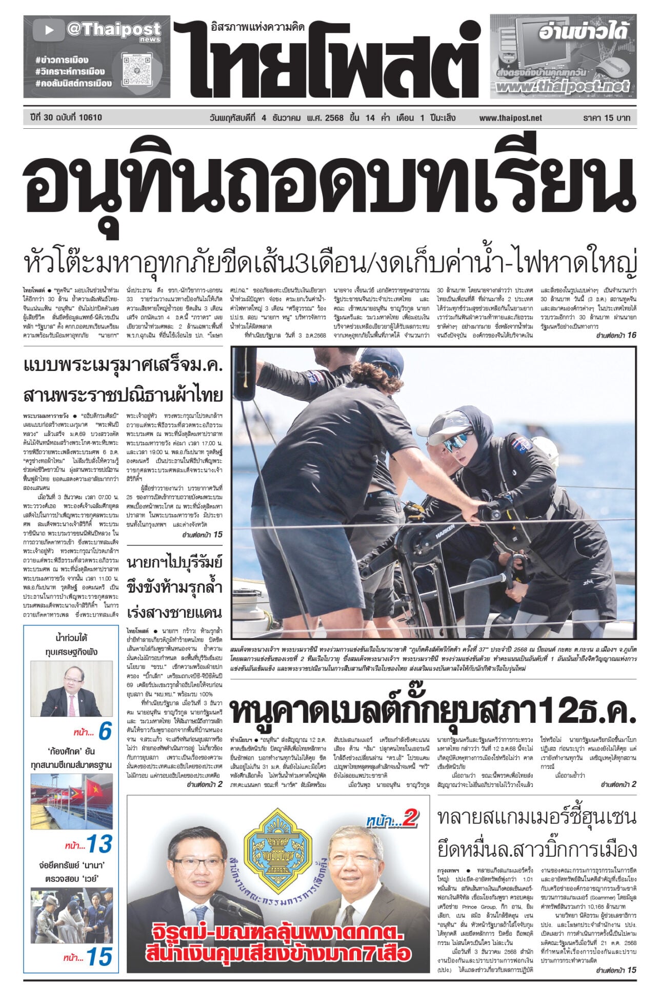 หนังสือพิมพ์ ฉบับวันที่ 4 ธันวาคม 2568ข่าวหน้าหนึ่งอนุทินถอดบทเรียน หัวโต๊ะมหาอุทกภัยขีดเส้น3เดือน/งดเก็บค่าน้ำ-ไฟหาดใหญ่“ทูตจีน” มอบเงินช่วยน้ำท่วมใต้อีกกว่า 30 ล้าน ย้ำความสัมพันธ์ไทย-จีนแน่นแฟ้น ทลายสแกมเมอร์ซี้ฮุนเซน ยึดหมื่นล.สาวบิ๊กการเมืองทลายแก๊งสแกมเมอร์ครั้งใหญ่! ปปง.ยึด-อายัดทรัพย์พุ่งกว่า 1.01 หมื่นล้าน นายกฯไปบุรีรัมย์ ขึงขังห้ามรุกลํ้า เร่งสางชายแดนนายกฯ กร้าว! ห้ามรุกล้ำย่ำยีทำลายเกียรติภูมิทำร้ายคนไทย แบบพระเมรุมาศเสร็จม.ค. สานพระราชปณิธานผ้าไทย“อธิบดีกรมศิลป์” เผยแบบก่อสร้างพระเมรุมาศ “พระพันปีหลวง” แล้วเสร็จ ม.ค.69 หนูคาดเบลต์กั๊กยุบสภา12ธ.ค.“อนุทิน” ส่งสัญญาณ 12 ธ.ค. คาดเข็มขัดนิรภัย ปัดญาติดีเพื่อไทยหลีกทางยื่นซักฟอก บอกทำงานทุกวันไม่ได้คุย ขีดเส้นอยู่ไม่เกิน 31 ม.ค.