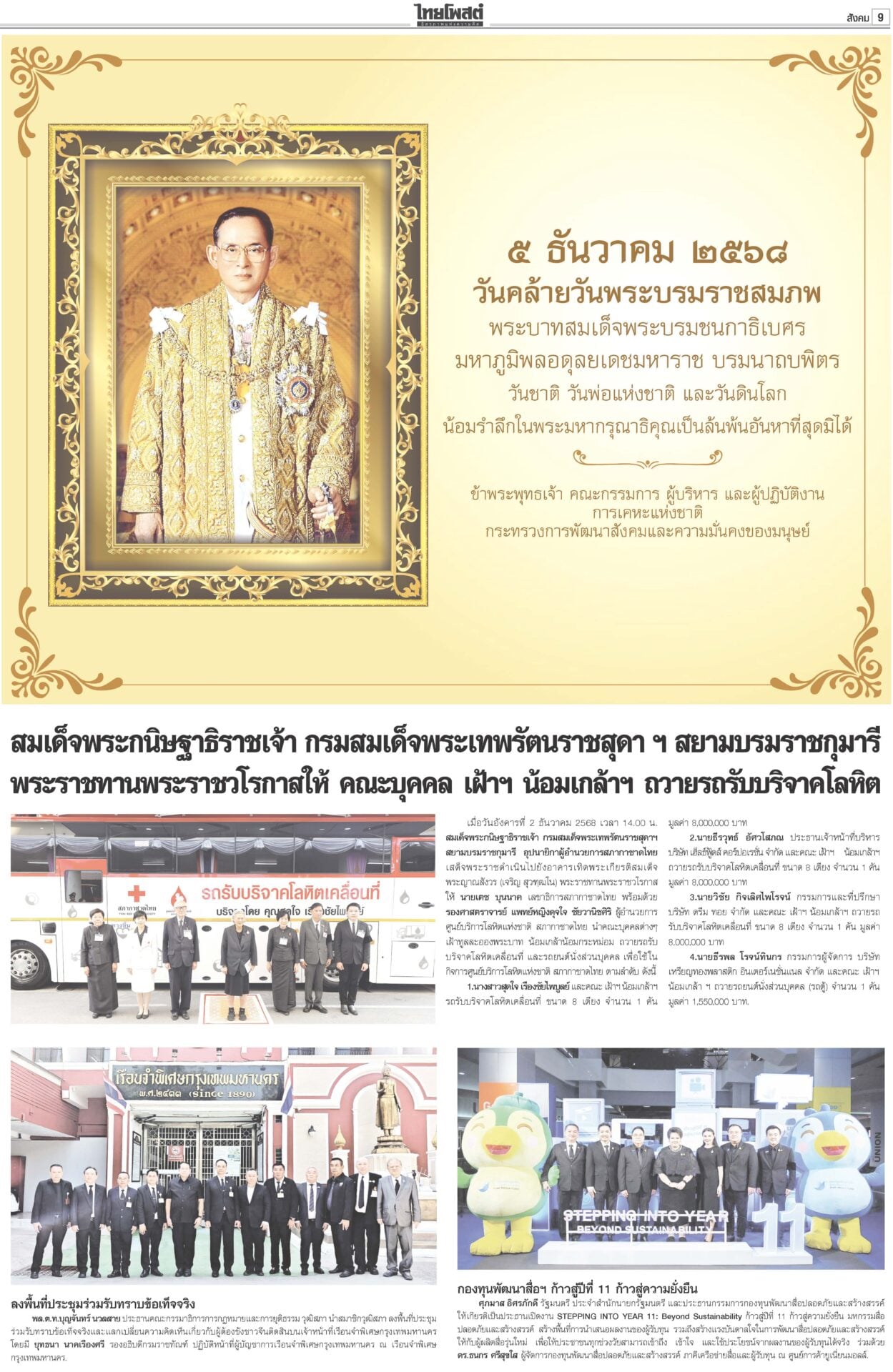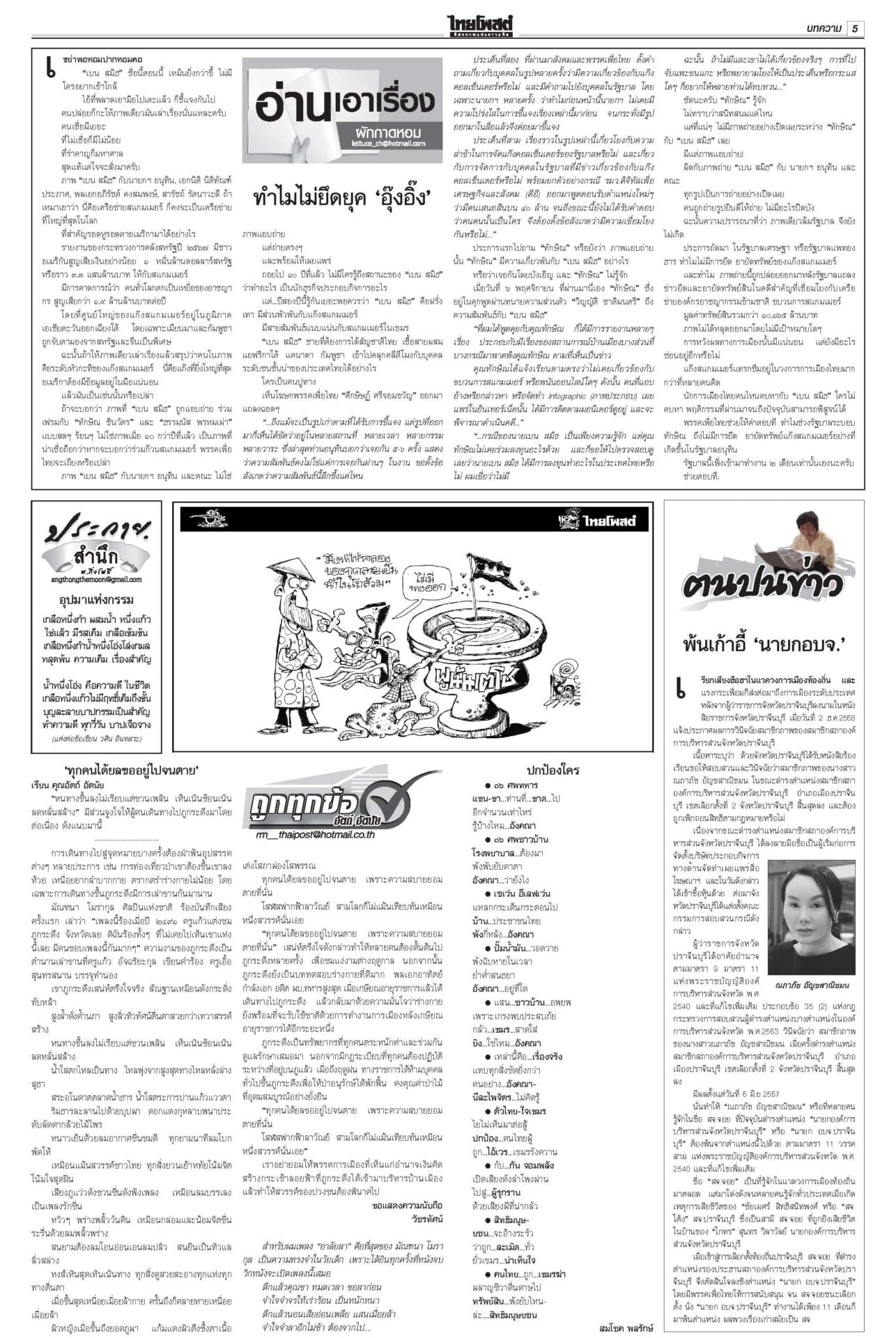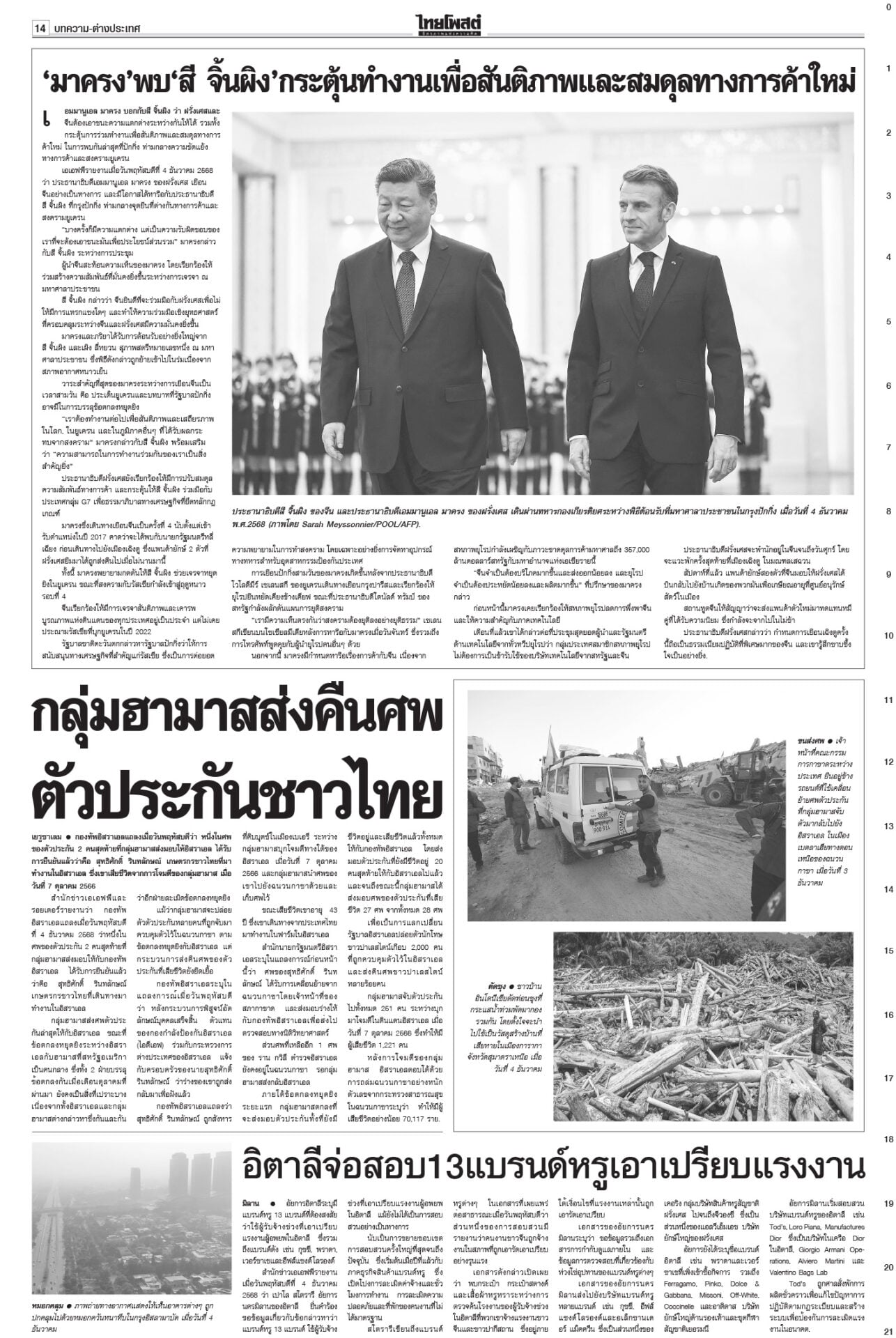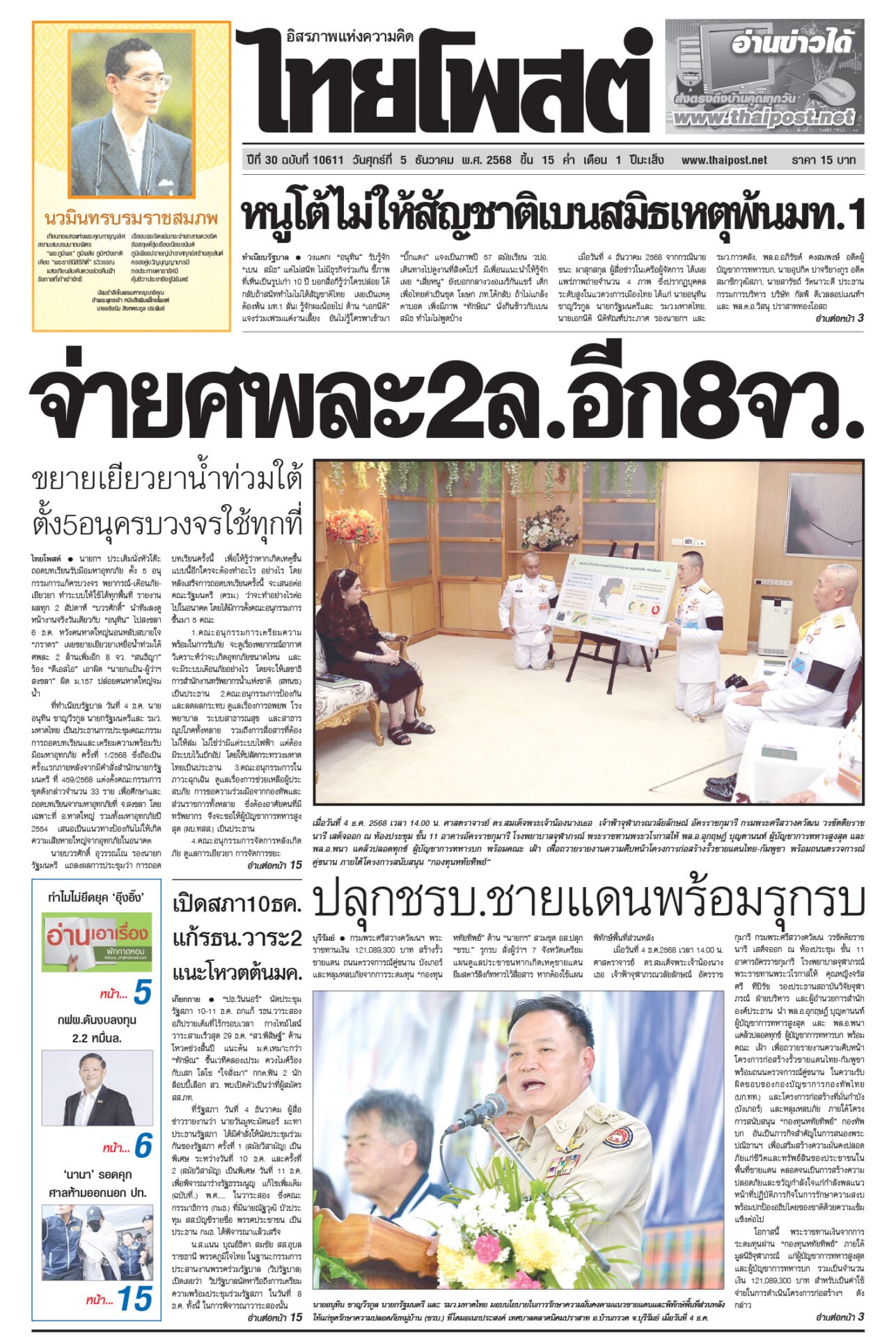 หนังสือพิมพ์ ฉบับวันที่ 5 ธันวาคม 2568ข่าวหน้าหนึ่งจ่ายศพละ2ล.อีก8จว. ขยายเยียวยานํ้าท่วมใต้ ตั้ง5อนุครบวงจรใช้ทุกที่นายกฯ ประเดิมนั่งหัวโต๊ะถอดบทเรียนรับมือมหาอุทกภัย ตั้ง 5 อนุกรรมการแก้ครบวงจร พยากรณ์-เตือนภัย-เยียวยา หนูโต้ไม่ให้สัญชาติเบนสมิธเหตุพ้นมท.1วงแตก! “อนุทิน” รับรู้จัก “เบน สมิธ” แต่ไม่สนิท ไม่มีธุรกิจร่วมกัน ปลุกชรบ.ชายแดนพร้อมรุกรบกรมพระศรีสวางควัฒนฯ พระราชทานเงิน 121,089,300 บาท เปิดสภา10ธค. แก้รธน.วาระ2 แนะโหวตต้นมค.“ปธ.วันนอร์” นัดประชุมรัฐสภา 10-11 ธ.ค. ถกแก้ รธน.วาระสอง