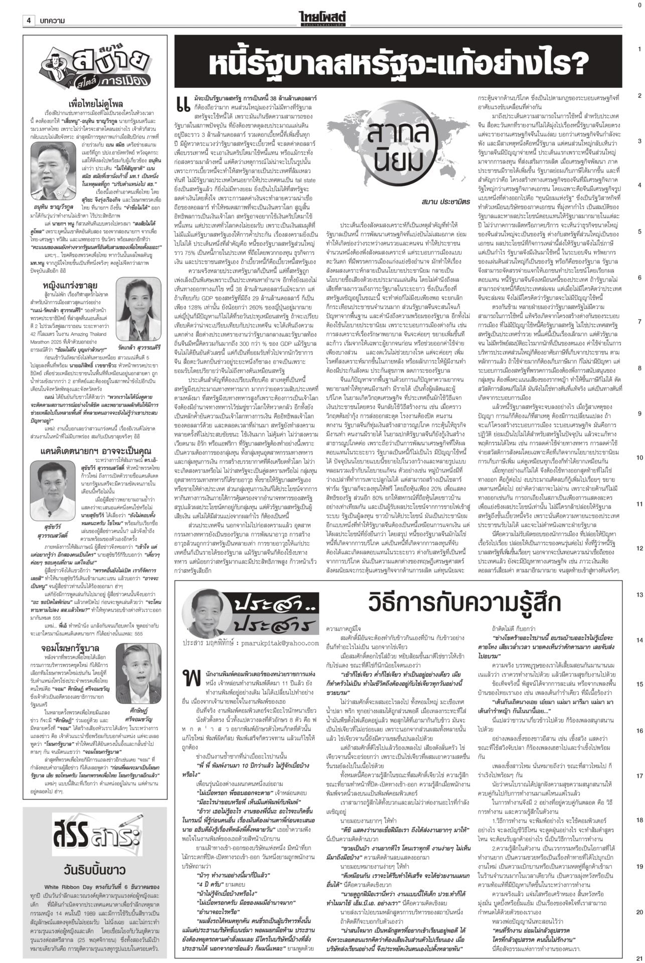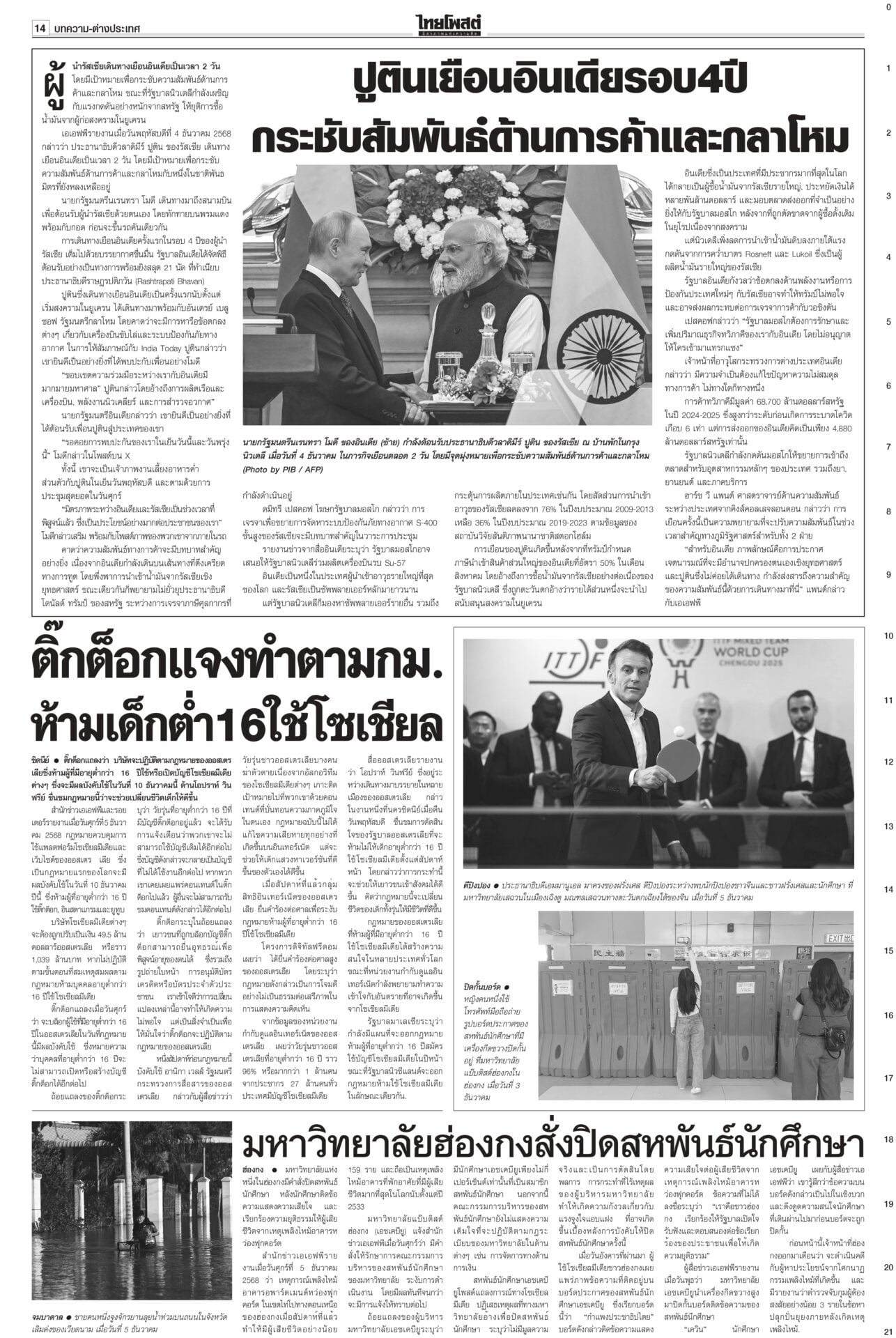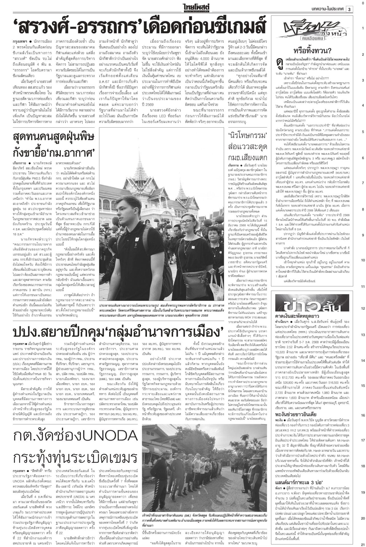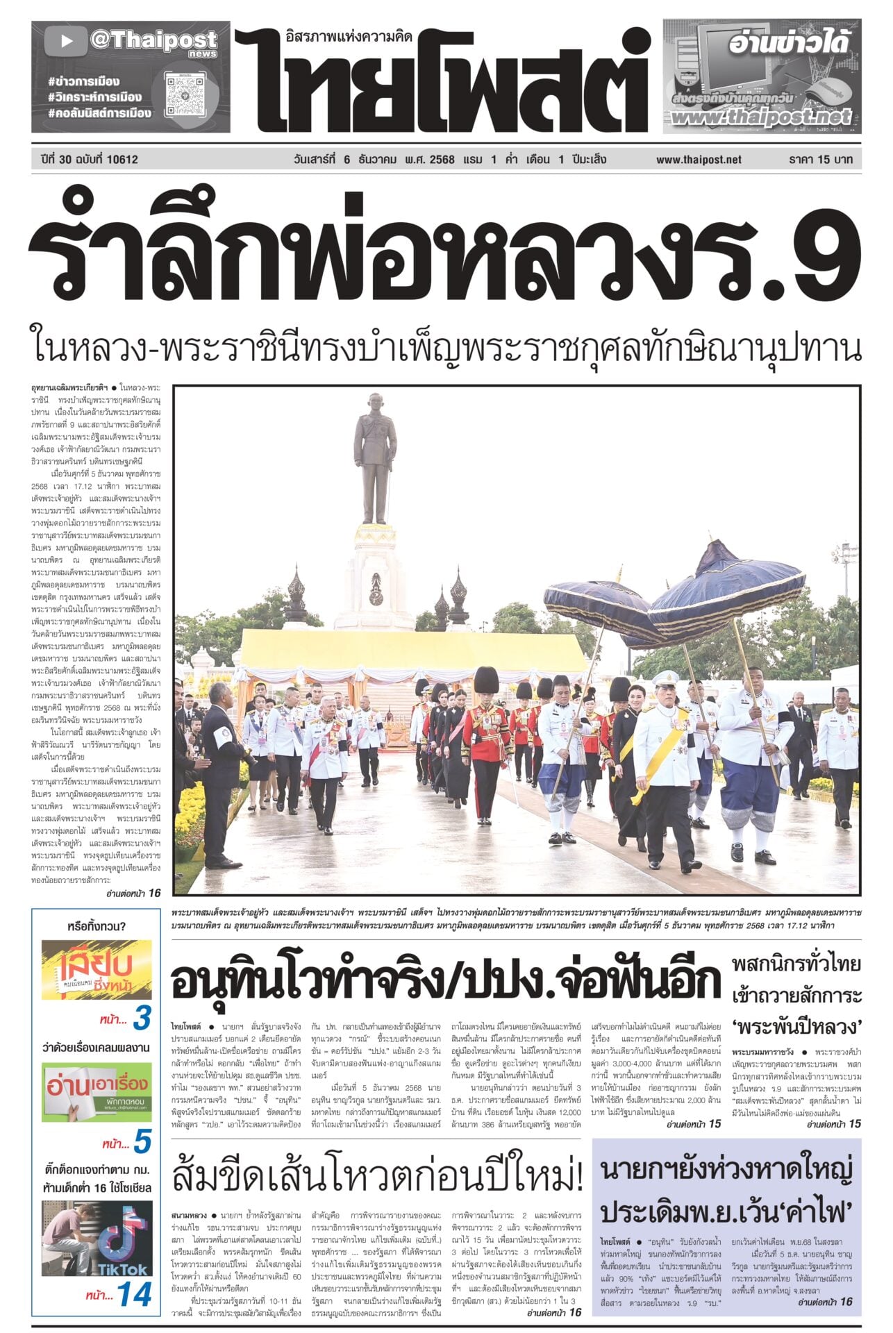 หนังสือพิมพ์ฉบับวันที่ 6 ธันวาคม 2568ข่าวหน้าหนึ่งรำลึกพ่อหลวงร.9 ในหลวง-พระราชินีทรงบำ เพ็ญพระราชกุศลทักษิณานุปทานในหลวง-พระราชินี ทรงบำเพ็ญพระราชกุศลทักษิณานุปทาน เนื่องในวันคล้ายวันพระบรมราชสมภพรัชกาลที่ 9 และสถาปนาพระอิสริยศักดิ์เฉลิมพระนามพระอัฐิสมเด็จพระเจ้าบรมวงศ์เธอ เจ้าฟ้ากัลยาณิวัฒนา กรมพระนราธิวาสราชนครินทร์ บดินทรเชษฐภคินี นายกฯยังห่วงหาดใหญ่ ประเดิมพ.ย.เว้น‘ค่าไฟ’“อนุทิน” รับยังกังวลน้ำท่วมหาดใหญ่ ขนกองทัพนักวิชาการลงพื้นที่ถอดบทเรียน นำประชาชนกลับบ้านแล้ว 90% “เท้ง” แซะบอร์ดมีไว้แค่ให้พาดหัว อนุทินโวทำจริง/ปปง.จ่อฟันอีกนายกฯ ลั่นรัฐบาลจริงจังปราบสแกมเมอร์ บอกแค่ 2 เดือนยึดอายัดทรัพย์หมื่นล้าน-เปิดชื่อเครือข่าย ถามมีใครกล้าทําหรือไม่ ตอกกลับ “เพื่อไทย” ถ้าทำงานห่วยจะให้ย้ายไปคุม พสกนิกรทั่วไทย เข้าถวายสักการะ ‘พระพันปีหลวง’พระราชวงศ์บำเพ็ญพระราชกุศลถวายพระบรมศพ พสกนิกรทุกสารทิศหลั่งไหลเข้ากราบพระบรมรูปในหลวง ร.9 และสักการะพระบรมศพ ส้มขีดเส้นโหวตก่อนปีใหม่!‘อนุทิน’ สวนเพื่อไทย ถ้าทำงานห่วย คนตั้งก็แย่สิ ยุครัฐบาล ‘อิ๊งค์ – เศรษฐา’ ผลโพลชี้ชัดนั่งแท่นอันดับ 2 ทิ้งห่าง พท. หัวเราะให้คะแนนตัวเอง ‘เดี๋ยวจะหาว่าคุย’