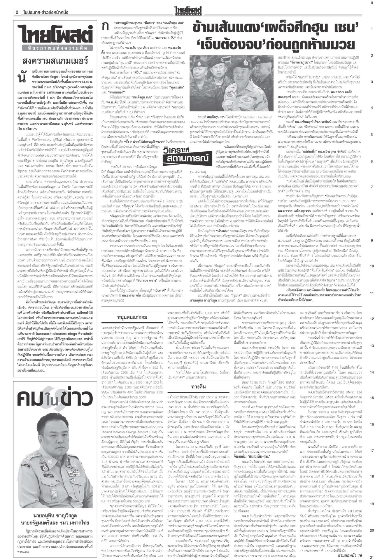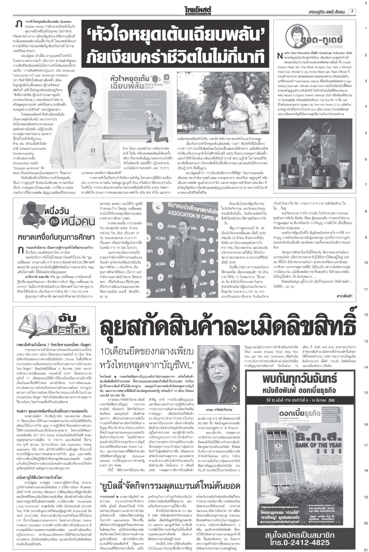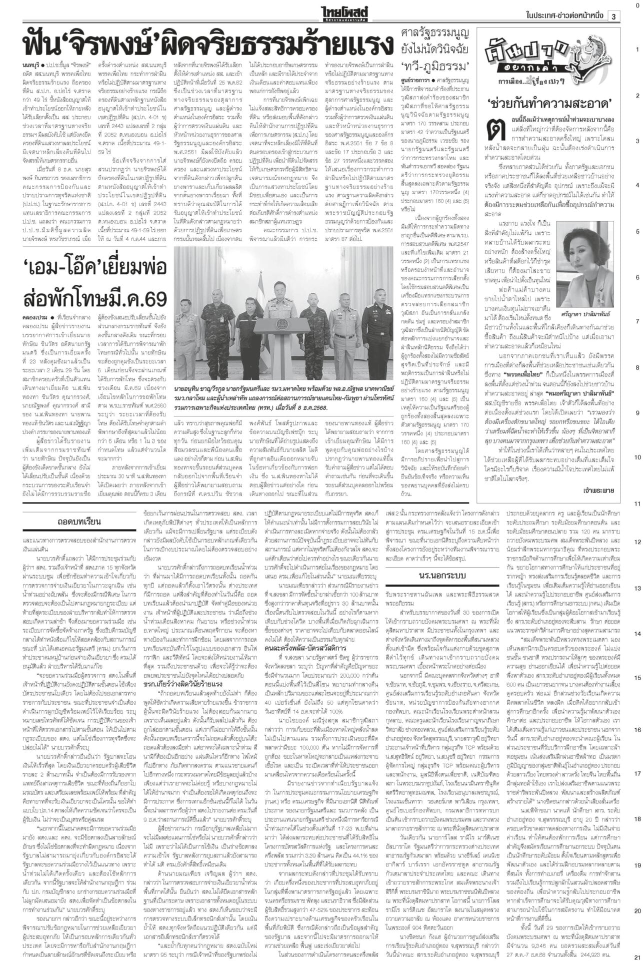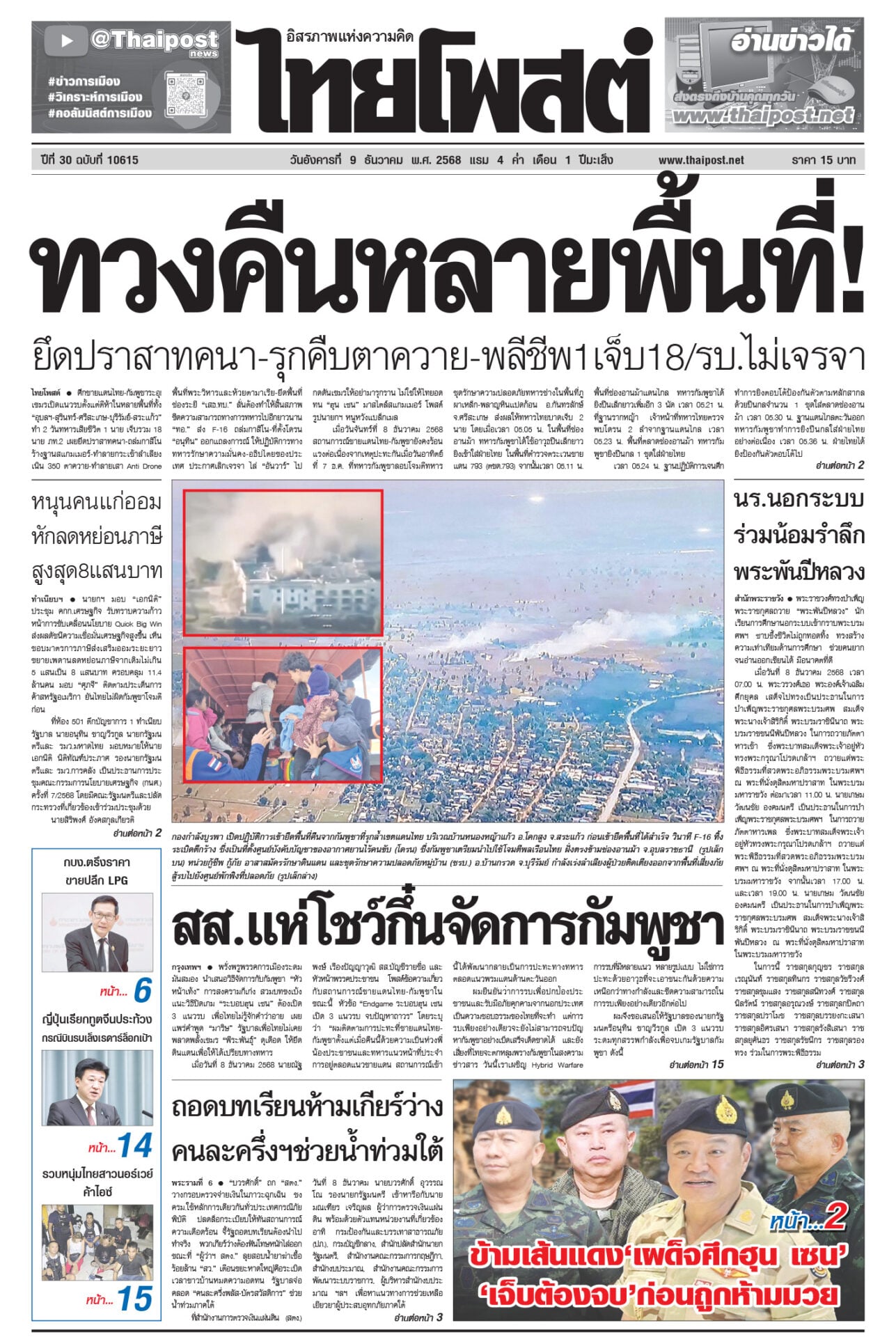 หนังสือพิมพ์ ฉบับวันที่ 9 ธันวาคม 2568ข่าวหน้าหนึ่งทวงคืนหลายพื้นที่! ยึดปราสาทคนา-รุกคืบตาควาย-พลีชีพ1เจ็บ18/รบ.ไม่เจรจาศึกชายแดนไทย-กัมพูชาระอุ! เขมรเปิดแนวรบตั้งแต่ตีห้าในหลายพื้นที่ทั้ง “อุบลฯ-สุรินทร์-ศรีสะเกษ-บุรีรัมย์-สระแก้ว” สส.แห่โชว์กึ๋นจัดการกัมพูชาพรั่งพรูพรรคการเมืองระดมมันสมอง นำเสนอวิธีจัดการกับกัมพูชา “หัวหน้าเท้ง” การสงครามก็เก่ง สวมบทขงเบ้งแนะวิธีปิดเกม นร.นอกระบบ ร่วมน้อมรำลึก พระพันปีหลวงพระราชวงศ์ทรงบำเพ็ญพระราชกุศลถวาย “พระพันปีหลวง” นักเรียนการศึกษานอกระบบเข้ากราบพระบรมศพฯ หนุนคนแก่ออม หักลดหย่อนภาษี สูงสุด8แสนบาทนายกฯ มอบ “เอกนิติ” ประชุม คกก.เศรษฐกิจ รับทราบความก้าวหน้าการขับเคลื่อนนโยบาย Quick Big Win ถอดบทเรียนห้ามเกียร์ว่าง คนละครึ่งฯช่วยน้ำท่วมใต้“บวรศักดิ์” ถก “สตง.” วางกรอบตรวจจ่ายเงินในภาวะฉุกเฉิน ชง ครม.ใช้หลักการเดียวกันทั่วประเทศกรณีภัยพิบัติ