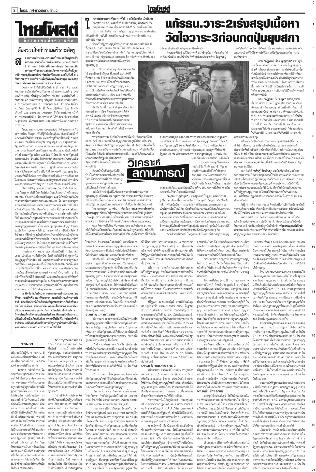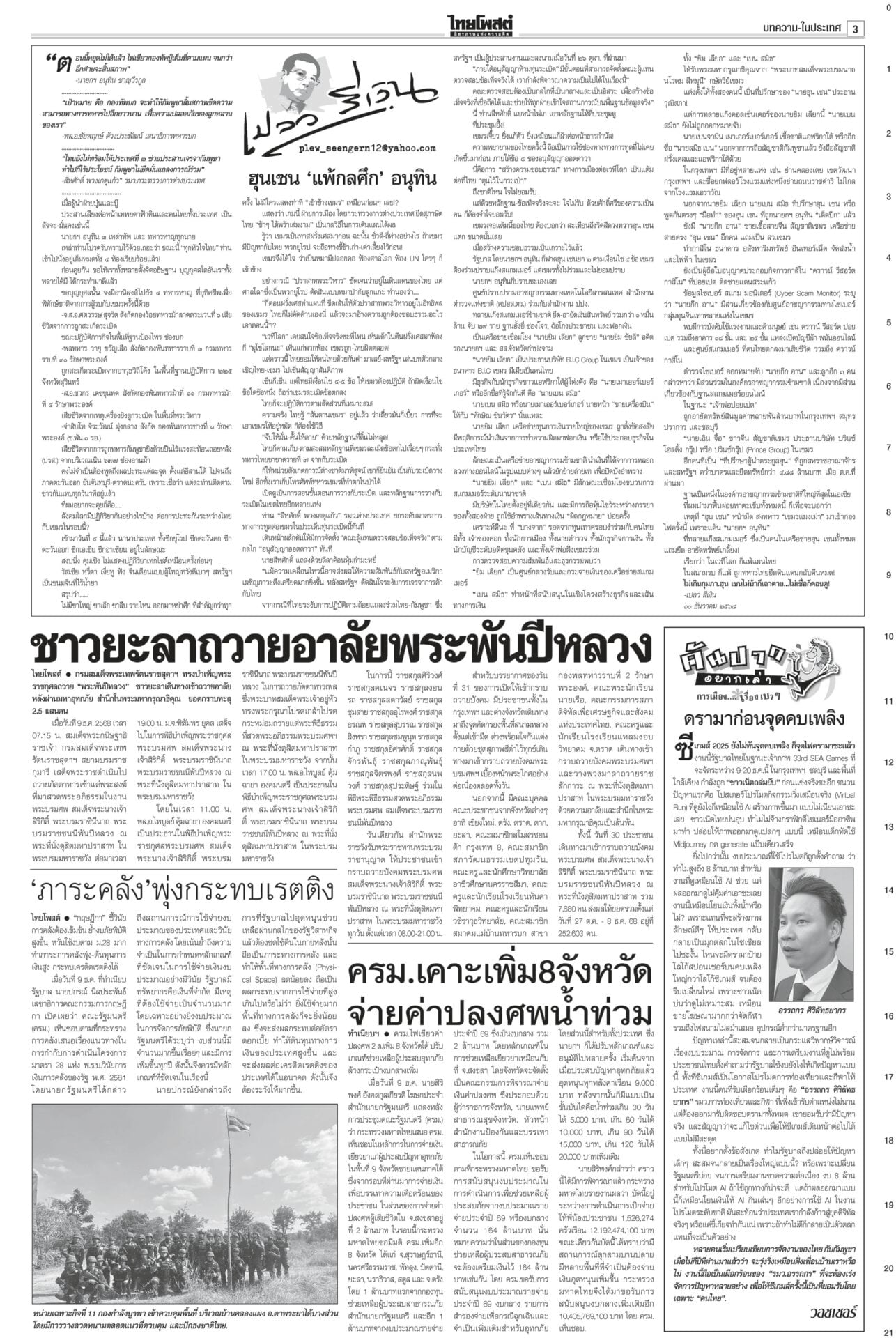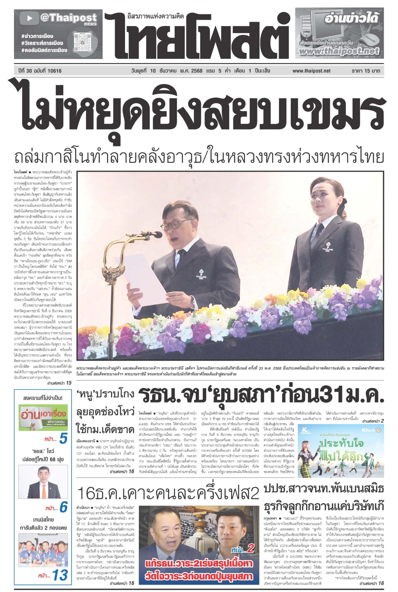 หนังสือพิมพ์ ฉบับวันที่ 10 ธันวาคม 2568ข่าวหน้าหนึ่งไม่หยุดยิงสยบเขมร ถล่มกาสิโนทำลายคลังอาวุธ/ในหลวงทรงห่วงทหารไทยพระบาทสมเด็จพระเจ้าอยู่หัว ทรงห่วงใยติดตามอาการทหารที่ได้รับบาดเจ็บจากเหตุสู้รบชายแดนไทย-กัมพูชา “นายกฯ” ชูกำปั้นบอก “สู้ๆ” หลังสื่อถามสถานการณ์ชายแดนไทย-กัมพูชา รธน.จบ‘ยุบสภา’ก่อน31ม.ค.“อนุทิน” แจ้งที่ประชุมหัวหน้าส่วนราชการนับถอยหลังยุบสภาเร็วกว่า 31 ม.ค.69 ปปช.สาวจนท.พันเบนสมิธ ธุรกิจลูกก๊กอานแค่บริษัทเก๊“เสธ.แมว” ชี้วิกฤตชายแดน ปมหนึ่งมาจากไทยฟันเครือข่ายสแกมเมอร์ “ดีเอสไอ” เผยผลสอบ 5 บริษัท “ลูกก๊ก อาน” ส่วนใหญ่เป็นเพียงบริษัทกระดาษ ‘หนู’ปราบโกง ลุยอุดช่องโหว่ ใช้กม.เด็ดขาดนายกฯ อนุทินนำปฏิญาณต่อต้านทุจริต หลัง CPI ไทยรั้งท้าย อันดับ 107 ของโลก 16ธ.ค.เคาะคนละครึ่งเฟส2“อนุทิน” ย้ำ “คนละครึ่งพลัส” เฟสสองทำแน่ ตราบใดยังมีอำนาจเต็ม “โฆษกรัฐบาล” เผยชงเข้า ครม.สัปดาห์หน้า คาดให้ 10 ล้านสิทธิ์