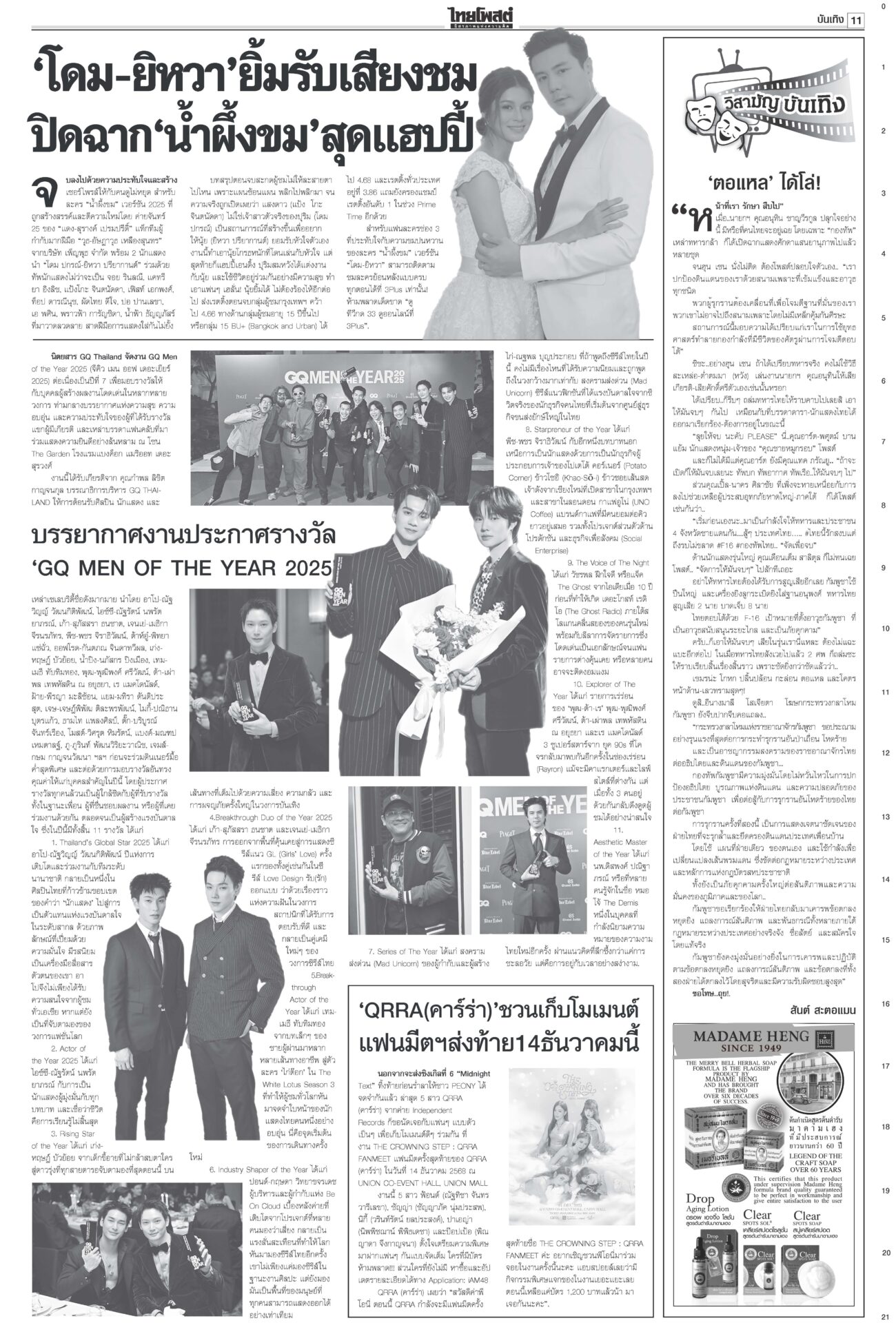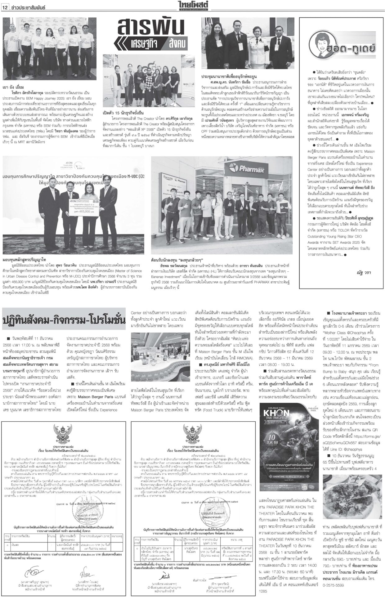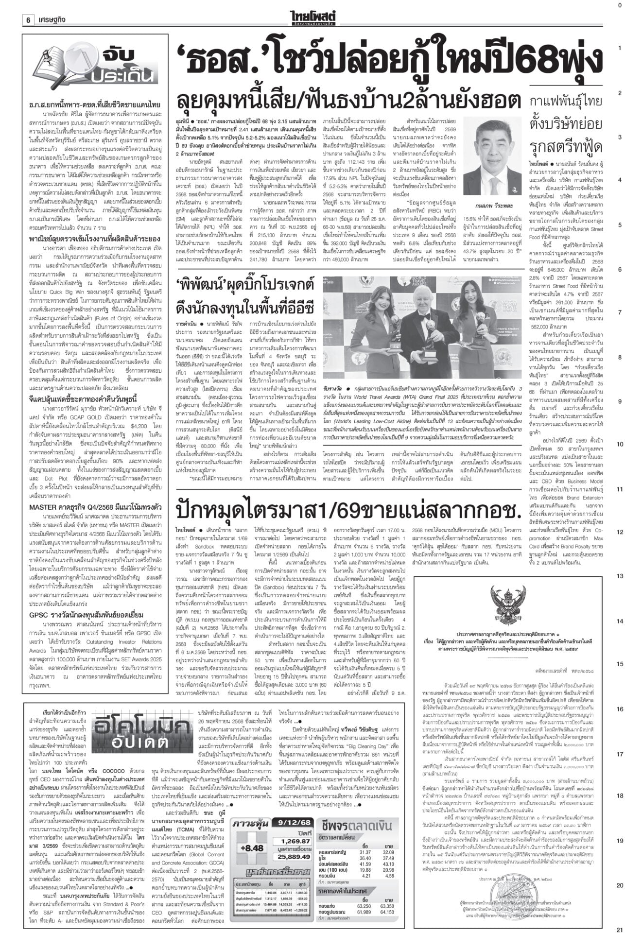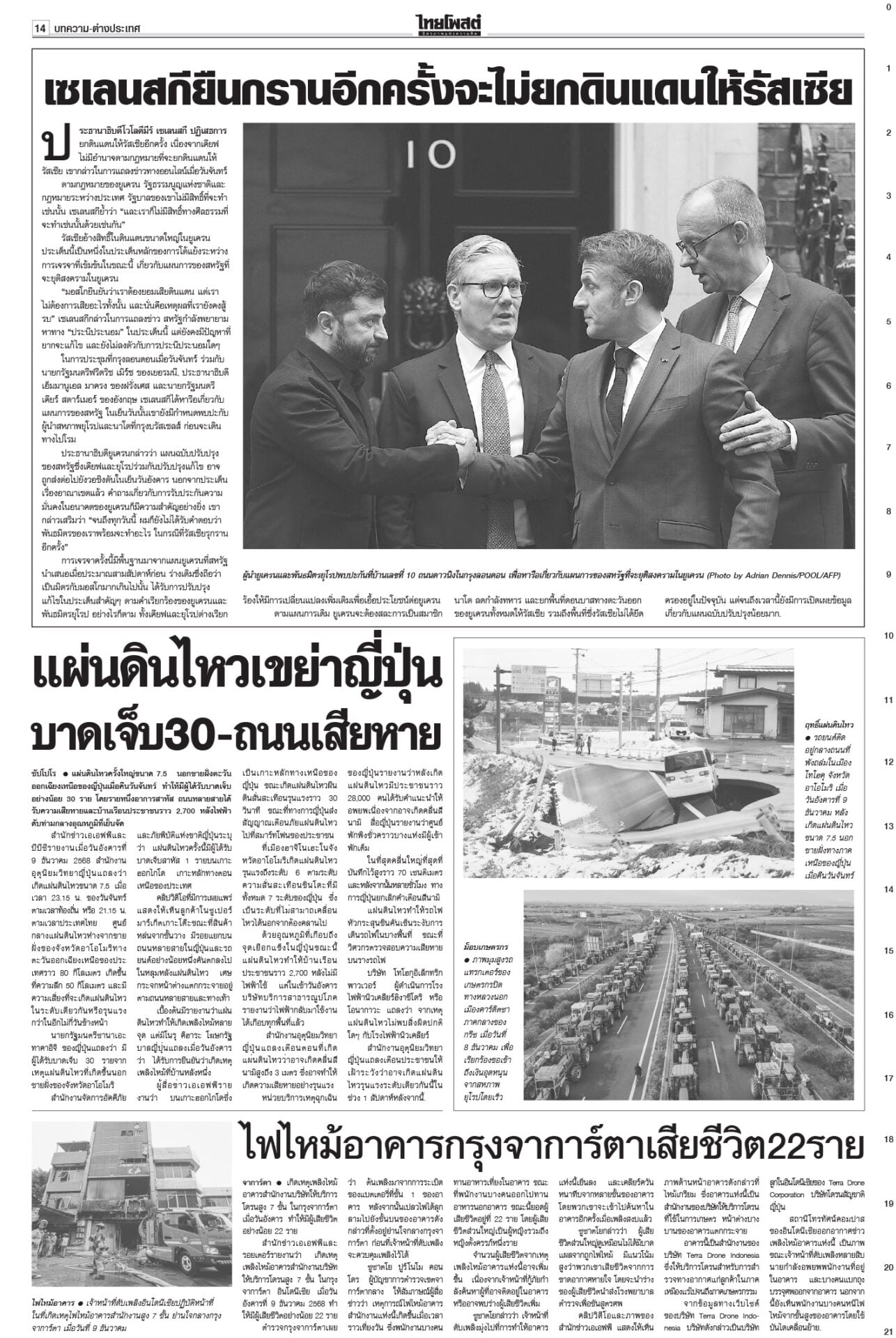 หนังสือพิมพ์ ฉบับวันที่ 10 ธันวาคม 2568ข่าวหน้าหนึ่งไม่หยุดยิงสยบเขมร ถล่มกาสิโนทำลายคลังอาวุธ/ในหลวงทรงห่วงทหารไทยพระบาทสมเด็จพระเจ้าอยู่หัว ทรงห่วงใยติดตามอาการทหารที่ได้รับบาดเจ็บจากเหตุสู้รบชายแดนไทย-กัมพูชา “นายกฯ” ชูกำปั้นบอก “สู้ๆ” หลังสื่อถามสถานการณ์ชายแดนไทย-กัมพูชา รธน.จบ‘ยุบสภา’ก่อน31ม.ค.“อนุทิน” แจ้งที่ประชุมหัวหน้าส่วนราชการนับถอยหลังยุบสภาเร็วกว่า 31 ม.ค.69 ปปช.สาวจนท.พันเบนสมิธ ธุรกิจลูกก๊กอานแค่บริษัทเก๊“เสธ.แมว” ชี้วิกฤตชายแดน ปมหนึ่งมาจากไทยฟันเครือข่ายสแกมเมอร์ “ดีเอสไอ” เผยผลสอบ 5 บริษัท “ลูกก๊ก อาน” ส่วนใหญ่เป็นเพียงบริษัทกระดาษ ‘หนู’ปราบโกง ลุยอุดช่องโหว่ ใช้กม.เด็ดขาดนายกฯ อนุทินนำปฏิญาณต่อต้านทุจริต หลัง CPI ไทยรั้งท้าย อันดับ 107 ของโลก 16ธ.ค.เคาะคนละครึ่งเฟส2“อนุทิน” ย้ำ “คนละครึ่งพลัส” เฟสสองทำแน่ ตราบใดยังมีอำนาจเต็ม “โฆษกรัฐบาล” เผยชงเข้า ครม.สัปดาห์หน้า คาดให้ 10 ล้านสิทธิ์