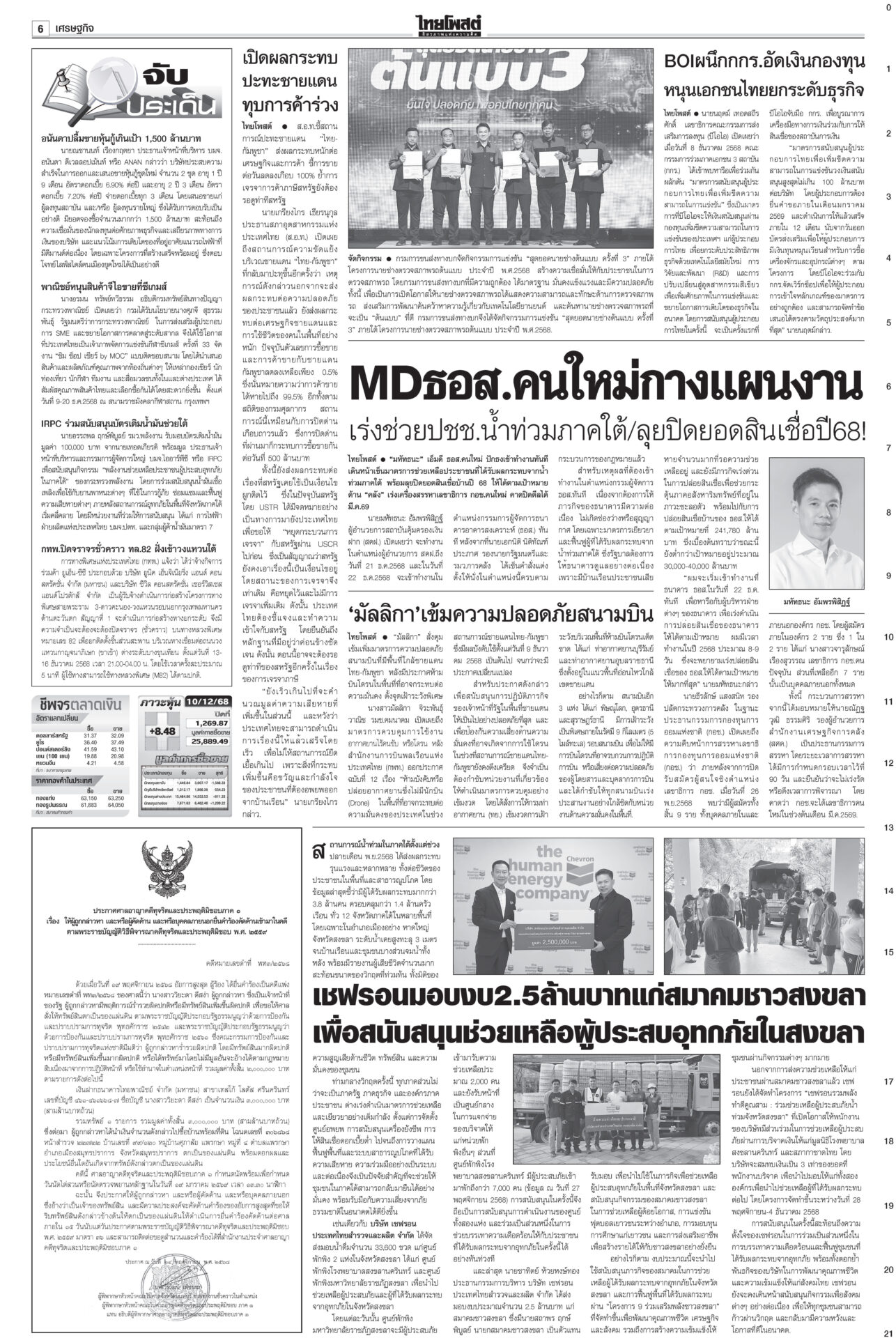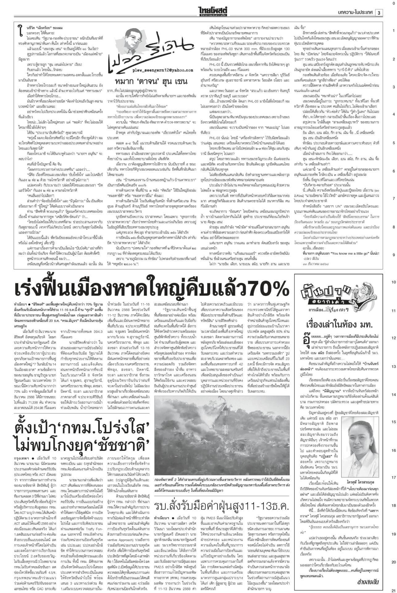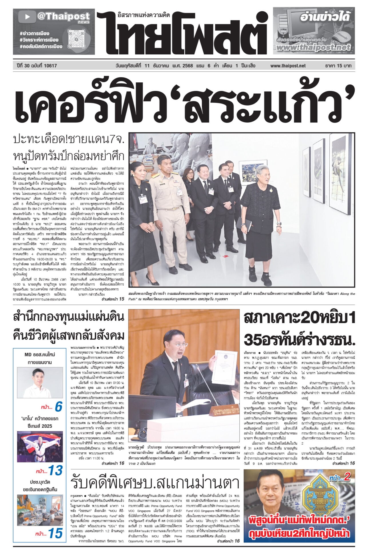 หนังสือพิมพ์ ฉบับวันที่ 11 ธันวาคม 2568ข่าวหน้าหนึ่งเคอร์ฟิว‘สระแก้ว’ ปะทะเดือด!ชายแดน7จ. หนูปัดทรัมป์กล่อมหย่าศึก“นายกฯ” เผย “ทรัมป์” ยังไม่ประสานคุยหยุดยิง ชี้การเจรจาระดับผู้นำมีขั้นตอนอยู่ ยันพร้อมแจงข้อมูลสถานการณ์ให้ ปธน.สหรัฐเข้าใจ ย้ำไทยอยู่บนพื้นฐานรักษาอธิปไตย-ดินแดน-ความปลอดภัยประชาชน สภาเคาะ20หยิบ1 35อรหันต์ร่างรธน.นับถอยหลัง “อนุทิน” จ่อดาบ พ.ร.ฎ.ยุบสภา ขณะที่สภาถก รนธ.วาระ 2 เคาะ “กมธ.ร่าง รธน.-กมธ.รับฟังความเห็น” สูตร 20 หยิบ 1 รับคดีพิเศษบ.สแกนม่านตา“ดีเอสไอ” รับคดีบริษัทสแกนม่านตาแลกเหรียญดิจิทัลเป็นคดีพิเศษแล้ว สำนึกกองทุนแม่แผ่นดิน คืนชีวิตผู้เสพกลับสังคมพระราชวงศ์บำเพ็ญพระราชกุศลถวาย “สมเด็จพระพันปีหลวง”