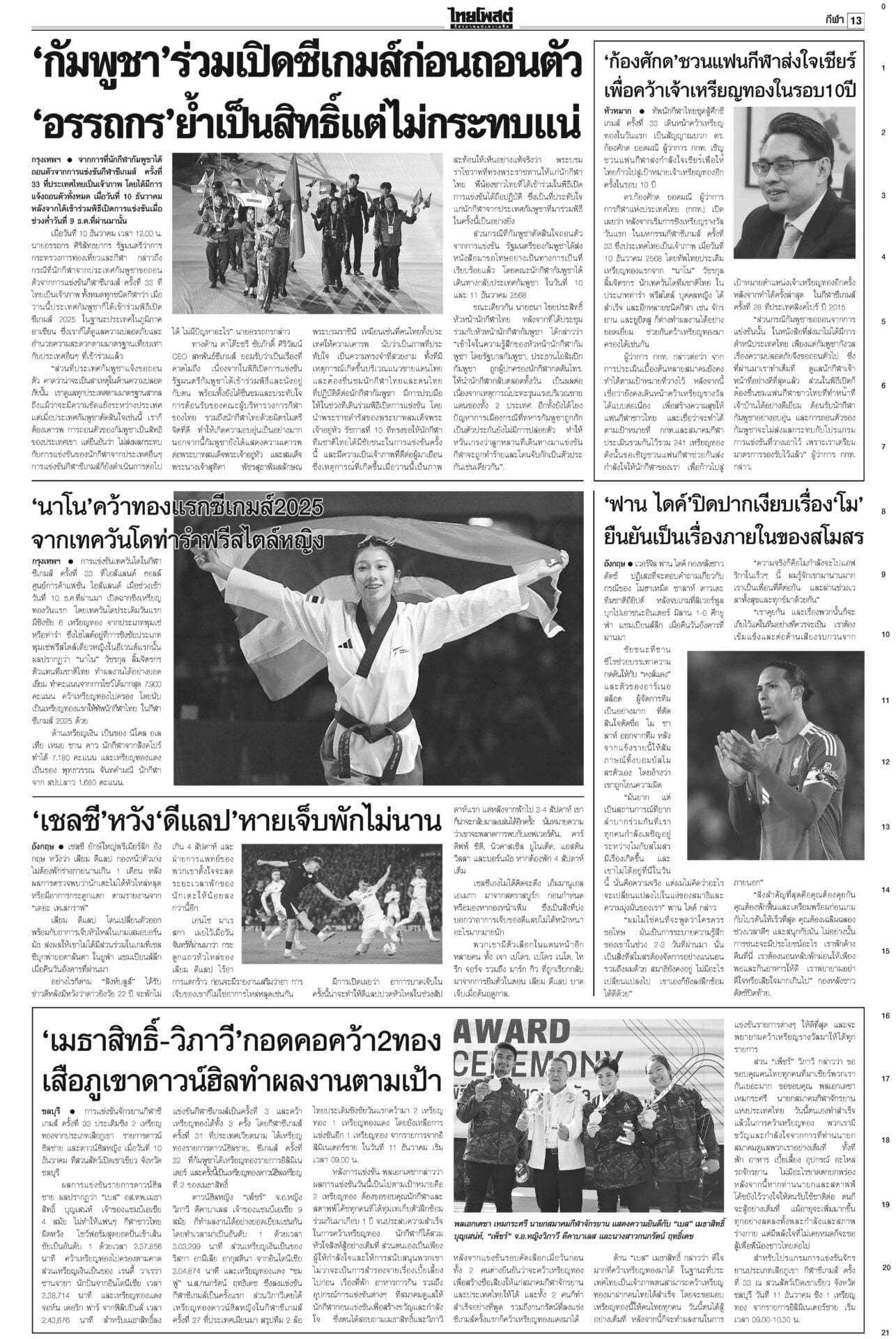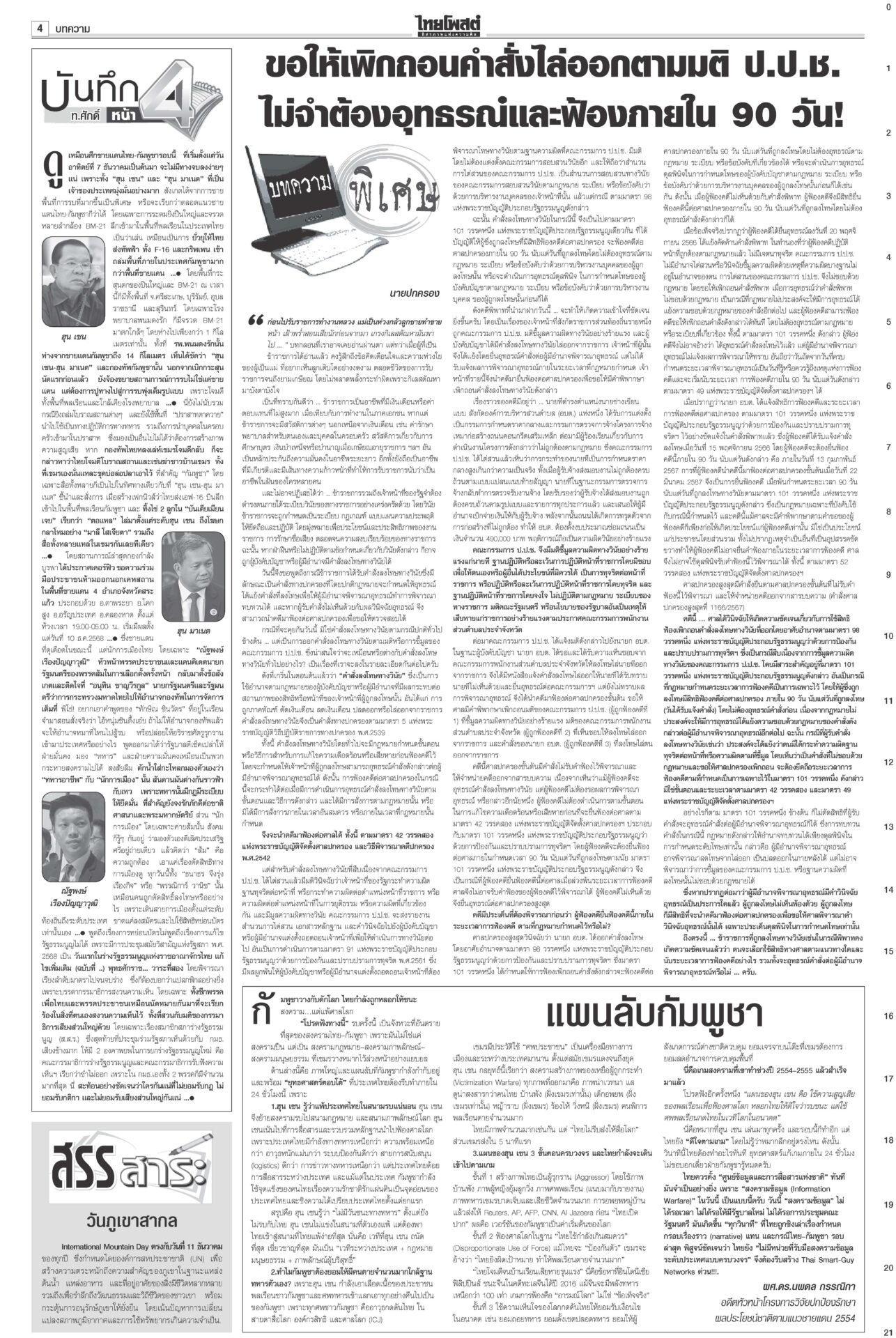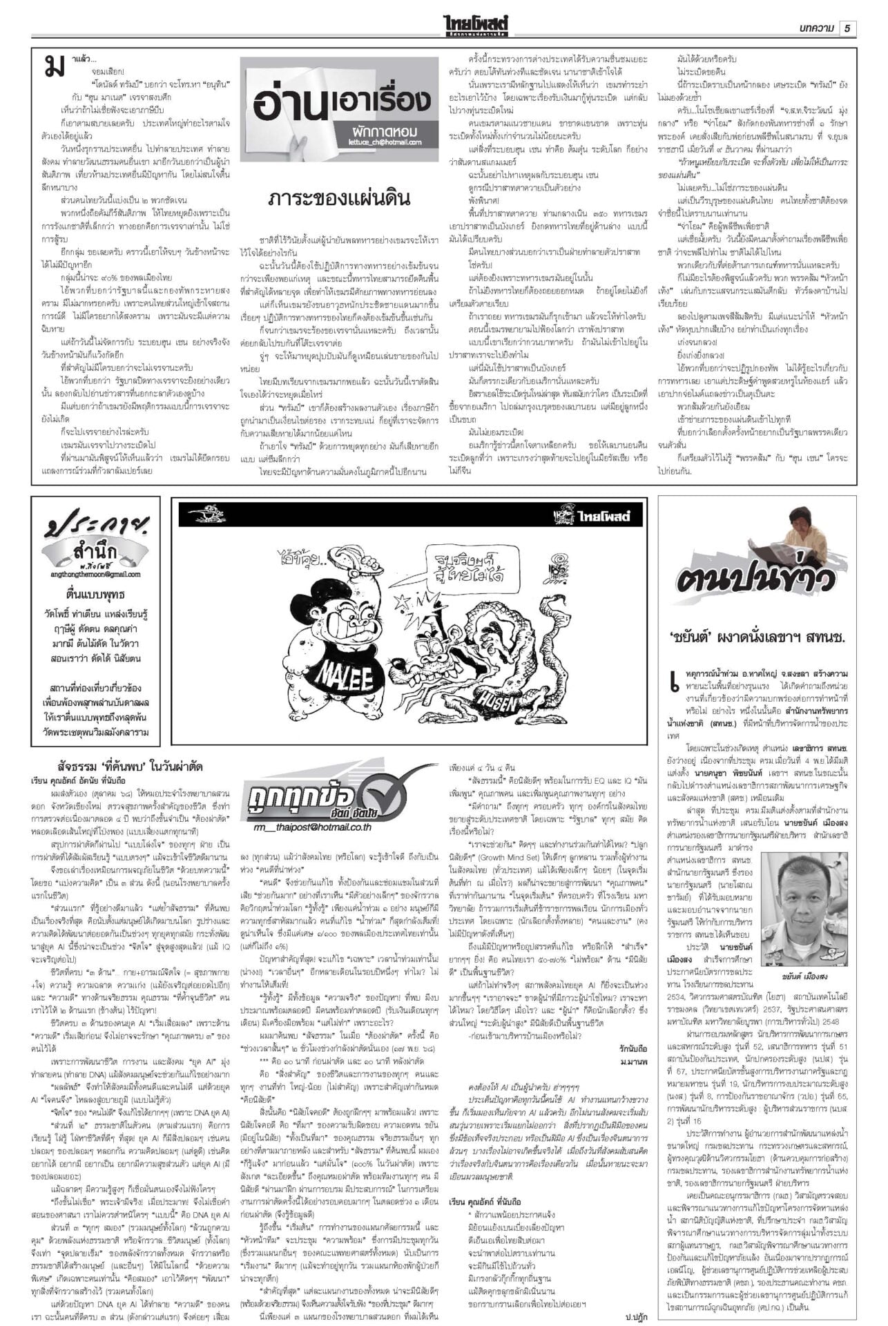 ฉบับวันที่ 11 ธันวาคม 2568 11 ธันวาคม 2568 เวลา 0:01 น. หนังสือพิมพ์ ฉบับวันที่ 11 ธันวาคม 2568ข่าวหน้าหนึ่งเคอร์ฟิว‘สระแก้ว’ ปะทะเดือด!ชายแดน7จ. หนูปัดทรัมป์กล่อมหย่าศึก“นายกฯ” เผย “ทรัมป์” ยังไม่ประสานคุยหยุดยิง ชี้การเจรจาระดับผู้นำมีขั้นตอนอยู่ ยันพร้อมแจงข้อมูลสถานการณ์ให้ ปธน.สหรัฐเข้าใจ ย้ำไทยอยู่บนพื้นฐานรักษาอธิปไตย-ดินแดน-ความปลอดภัยประชาชน สภาเคาะ20หยิบ1 35อรหันต์ร่างรธน.นับถอยหลัง “อนุทิน” จ่อดาบ พ.ร.ฎ.ยุบสภา ขณะที่สภาถก รนธ.วาระ 2 เคาะ “กมธ.ร่าง รธน.-กมธ.รับฟังความเห็น” สูตร 20 หยิบ 1 รับคดีพิเศษบ.สแกนม่านตา“ดีเอสไอ” รับคดีบริษัทสแกนม่านตาแลกเหรียญดิจิทัลเป็นคดีพิเศษแล้ว สำนึกกองทุนแม่แผ่นดิน คืนชีวิตผู้เสพกลับสังคมพระราชวงศ์บำเพ็ญพระราชกุศลถวาย “สมเด็จพระพันปีหลวง” Tagsรายวันหนังสือพิมพ์ ข่าวที่เกี่ยวข้อง ฉบับวันที่ 14 ธันวาคม 2568 ฉบับวันที่ 14 ธันวาคม 2568 ฉบับวันที่ 13 ธันวาคม 2568 ฉบับวันที่ 12 ธันวาคม 2568 ฉบับวันที่ 10 ธันวาคม 2568 ฉบับวันที่ 9 ธันวาคม 2568 ฉบับวันที่ 8 ธันวาคม 2568 NEWS UPDATE 0:01 น. เร่งเกม'เลือกตั้ง-จบศึกชายแดน' เมื่อทุกแนวรบกำลังได้เปรียบ 23:09 น. 'ฟิกเกอร์ฯ'สร้างประวัติศาสตร์ คว้า1เหรียญทอง1เงิน1ทองแดง 'ฟิกเกอร์สเก็ต'ซีเกมส์2025 22:38 น. สอยคิวไทยเชือดนิ่มลาว 3-1 เฟรม คว้าทองสนุกเกอร์ 15 แดง ทีมชาย ศึกซีเกมส์ 22:33 น. 'กรวิชญ์'ซิวเหรียญเงิน สเก็ตบอร์ดพาร์ค 'เฟรย่า'วัย12ปีได้ทองแดงหญิง 22:30 น. 'เก่ง หฤษฎ์' เข้าถึงอินเนอร์ รับบทศิลปินเกาหลี ตัวซีเคร็ต!