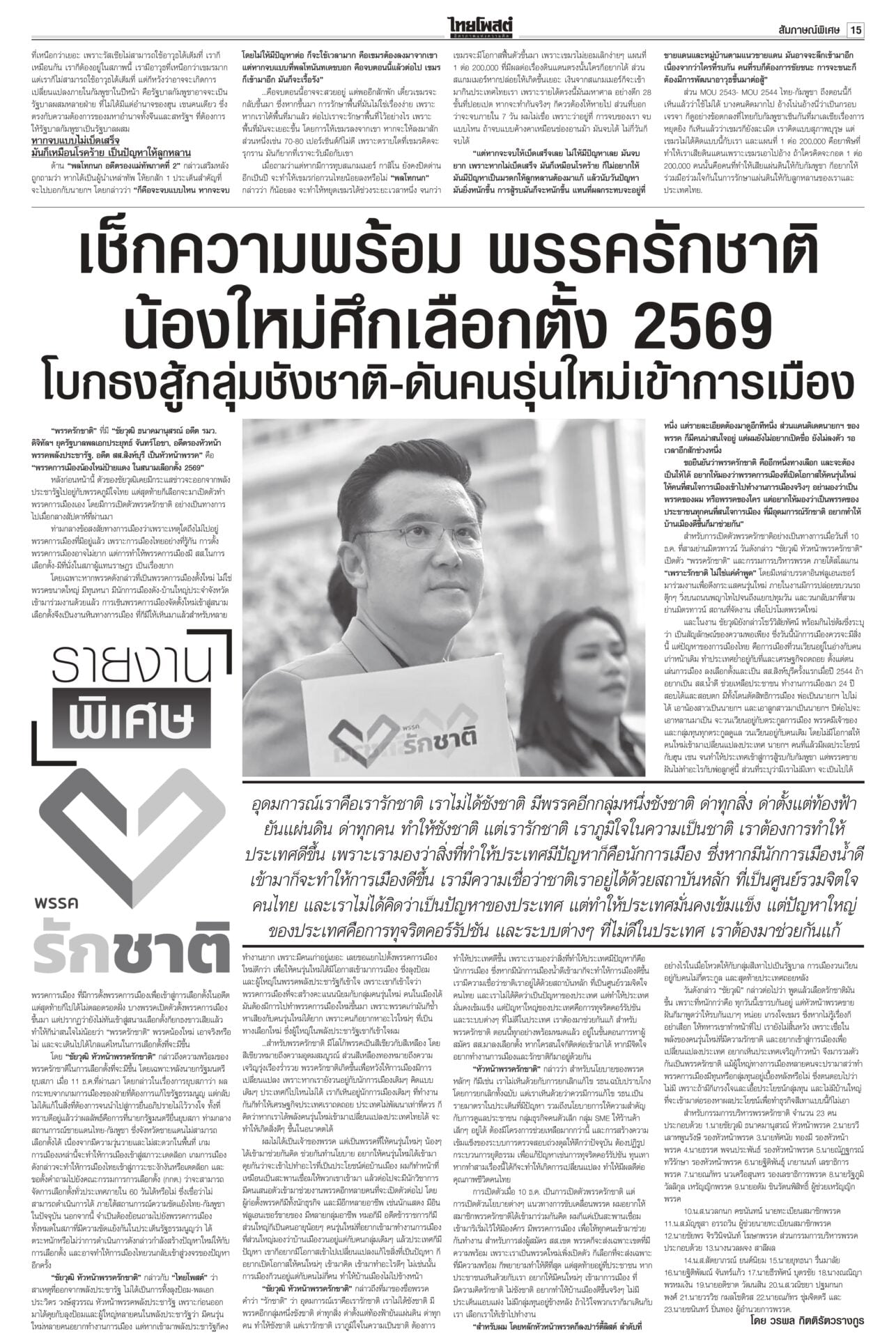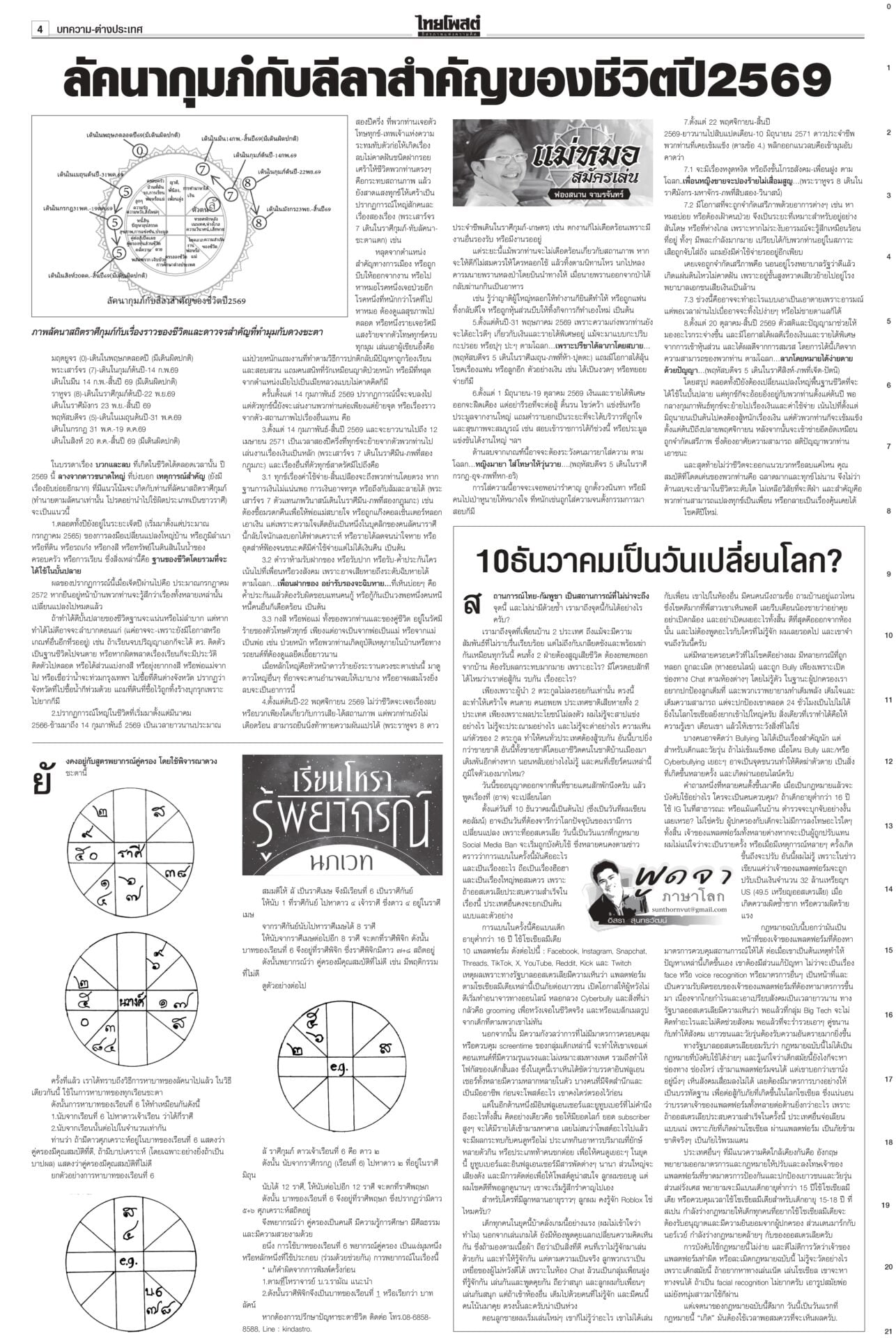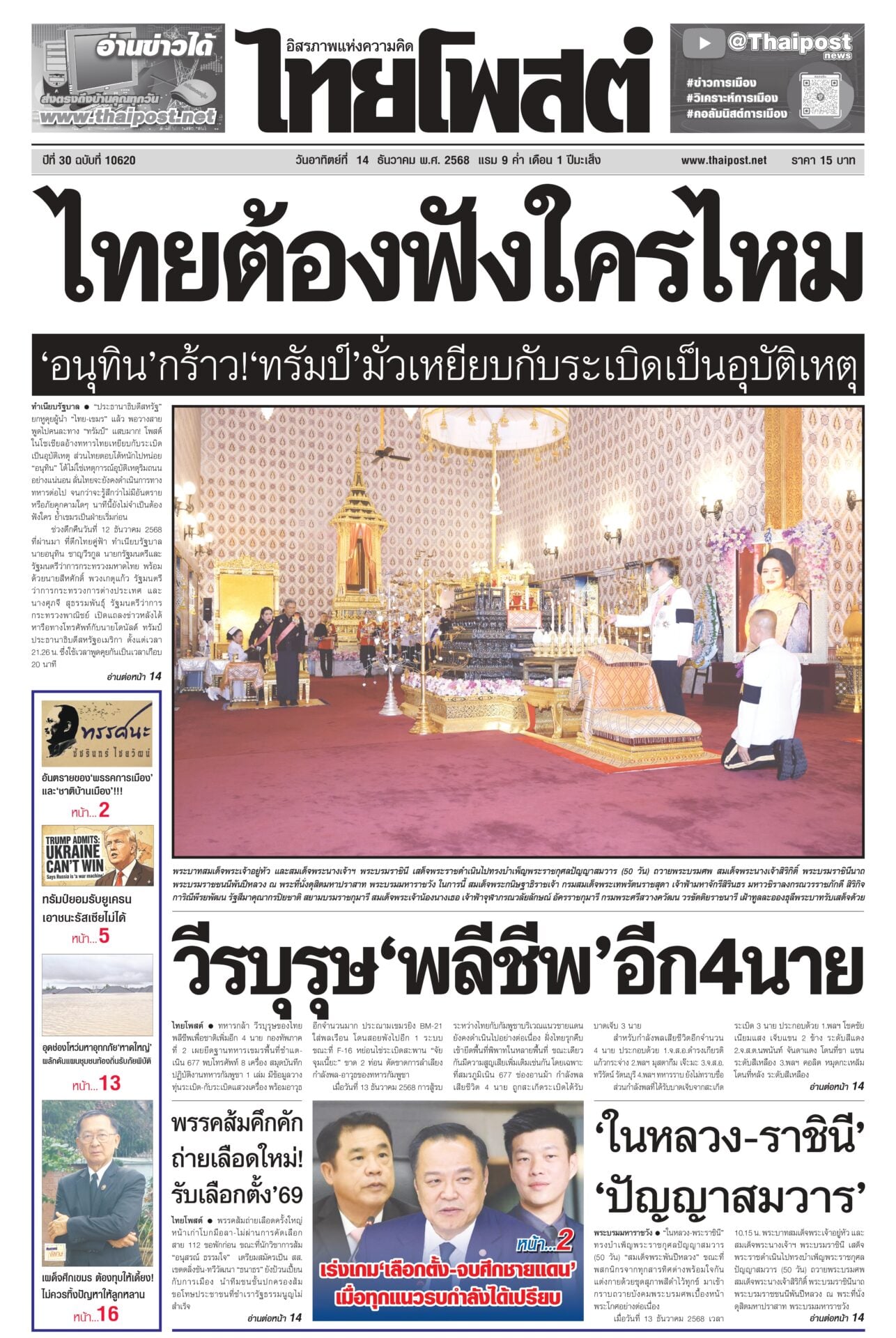 หนังสือพิมพ์ฉบับวันที่ 14 ธันวาคม 2568ข่าวหน้าหนึ่ง‘ในหลวง-ราชินี’ ‘ปัญญาสมวาร’“ในหลวง-พระราชินี” ทรงบำเพ็ญพระราชกุศลปัญญาสมวาร (50 วัน) “สมเด็จพระพันปีหลวง” ขณะที่พสกนิกรจากทุกสารทิศต่างพร้อมใจกันแต่งกายด้วยชุดสุภาพสีดำไว้ทุกข์ ไทยต้องฟังใครไหม ‘อนุทิน’กร้าว! ‘ทรัมป์’ มั่วเหยียบกับระเบิดเป็นอุบัติเหต“ประธานาธิบดีสหรัฐ” ยกหูคุยผู้นำ “ไทย-เขมร” แล้ว พอวางสายพูดไปคนละทาง “ทรัมป์” แสบมาก! โพสต์ในโซเชียลอ้างทหารไทยเหยียบกับระเบิดเป็นอุบัติเหตุ วีรบุรุษ‘พลีชีพ’อีก4นายทหารกล้า วีรบุรุษของไทย พลีชีพเพื่อชาติเพิ่มอีก 4 นาย กองทัพภาคที่ 2 เผยยึดฐานทหารเขมรพื้นที่ซำแต-เนิน 677 พบโทรศัพท์ 8 เครื่อง สมุดบันทึกปฏิบัติงานทหารกัมพูชา 1 พรรคส้มคึกคัก ถ่ายเลือดใหม่! รับเลือกตั้ง’69พรรคส้มถ่ายเลือดครั้งใหญ่ หน้าเก่าโบกมือลา-ไม่ผ่านการคัดเลือก สาย 112 ขอพักก่อน ขณะที่นักวิชาการส้ม “อนุสรณ์ ธรรมใจ” เตรียมสมัครเป็น สส.เขตตลิ่งชัน-ทวีวัฒนา “ธนาธร”